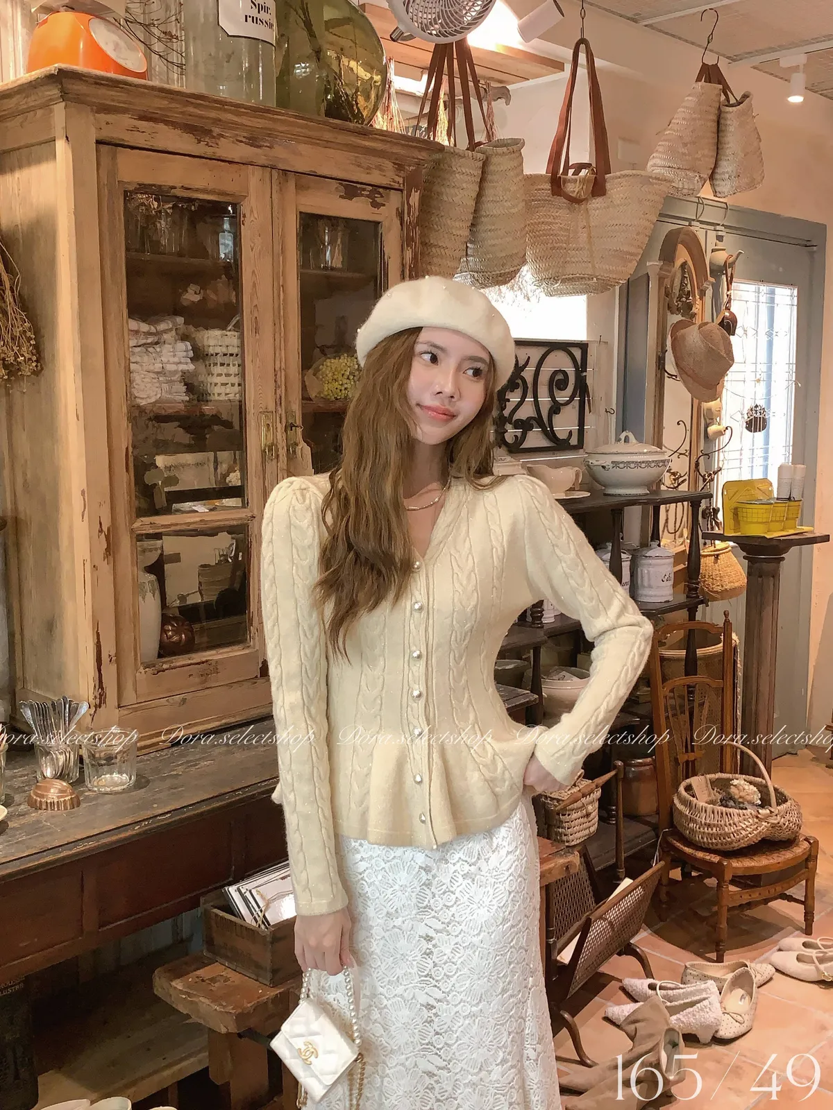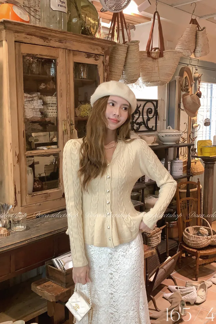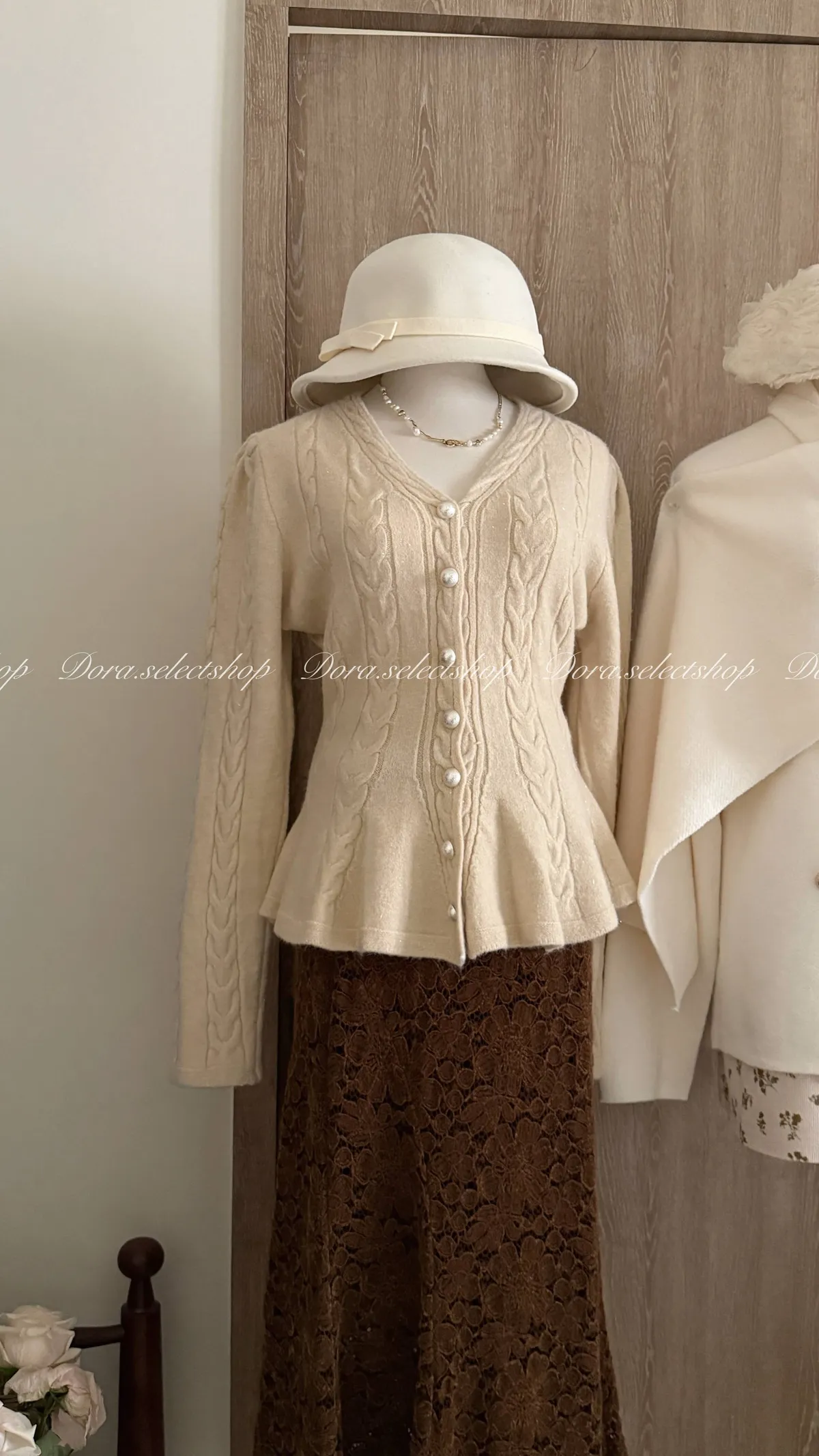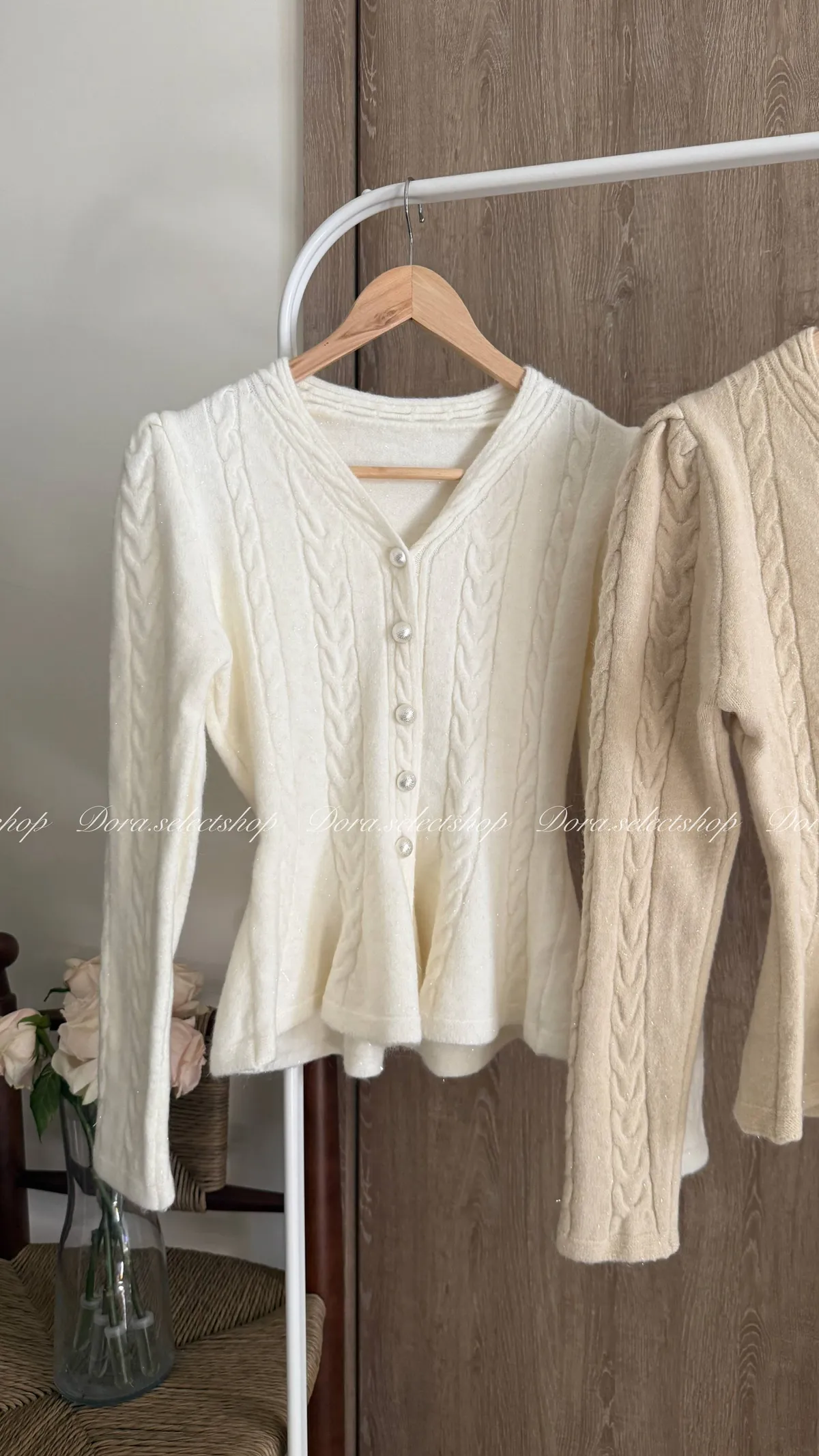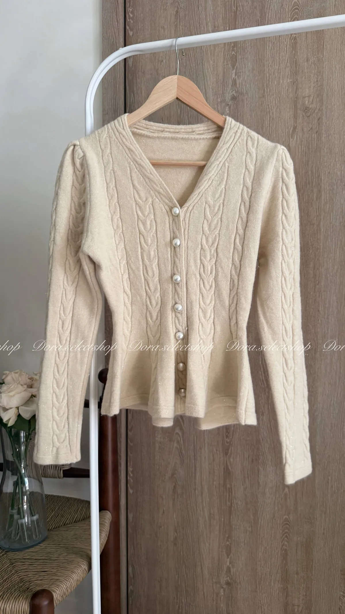 典雅珍珠釦縮腰傘襬麻花針織衣---米