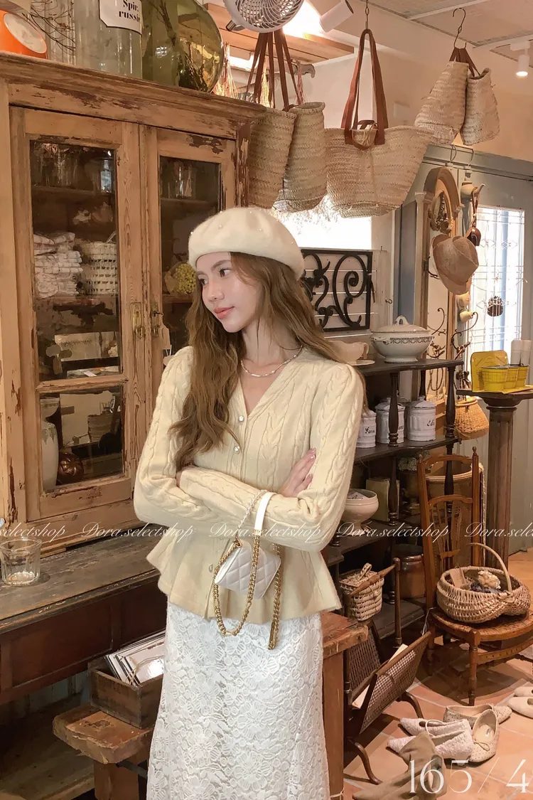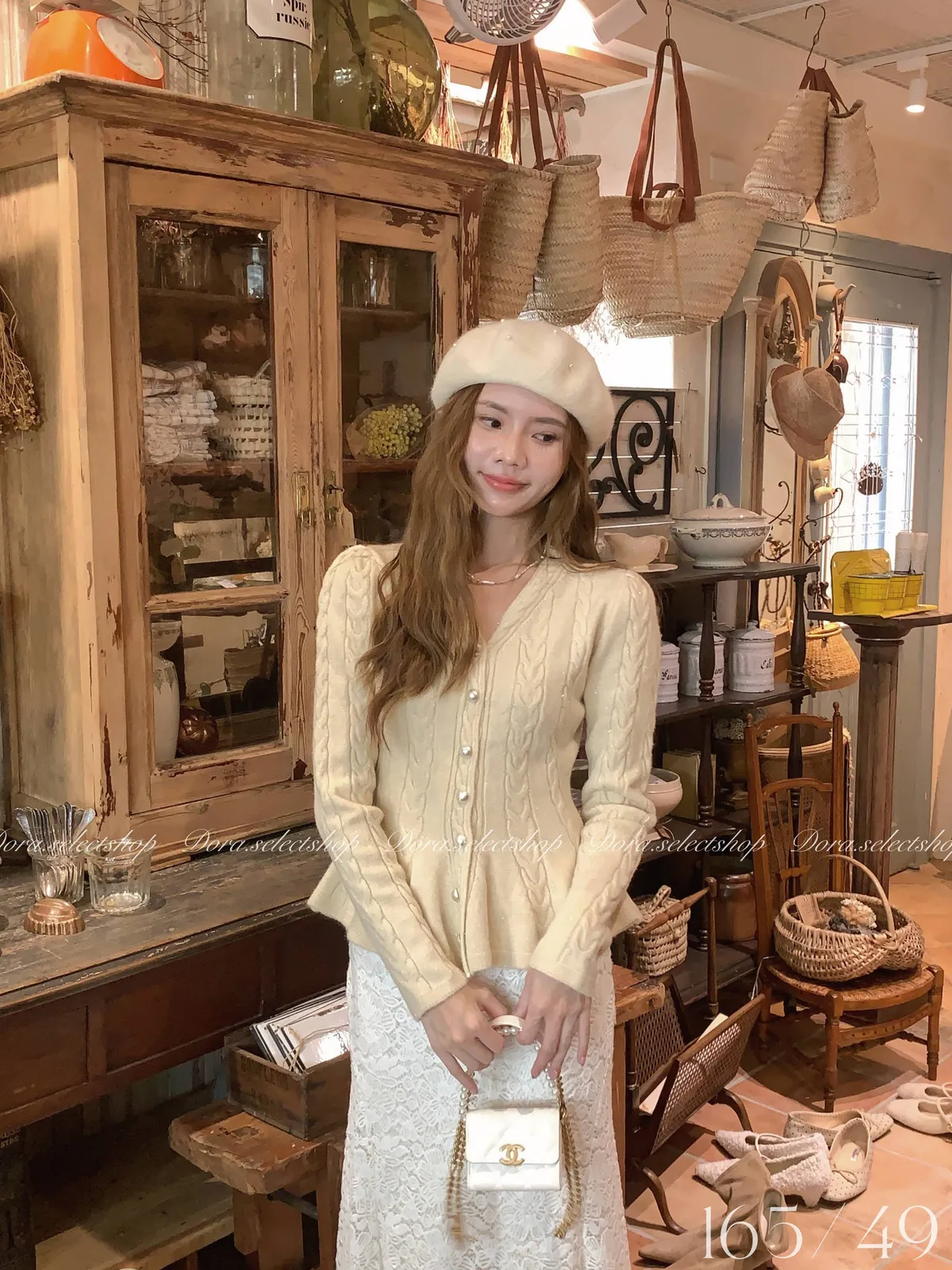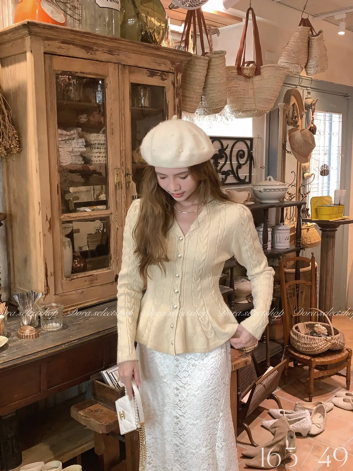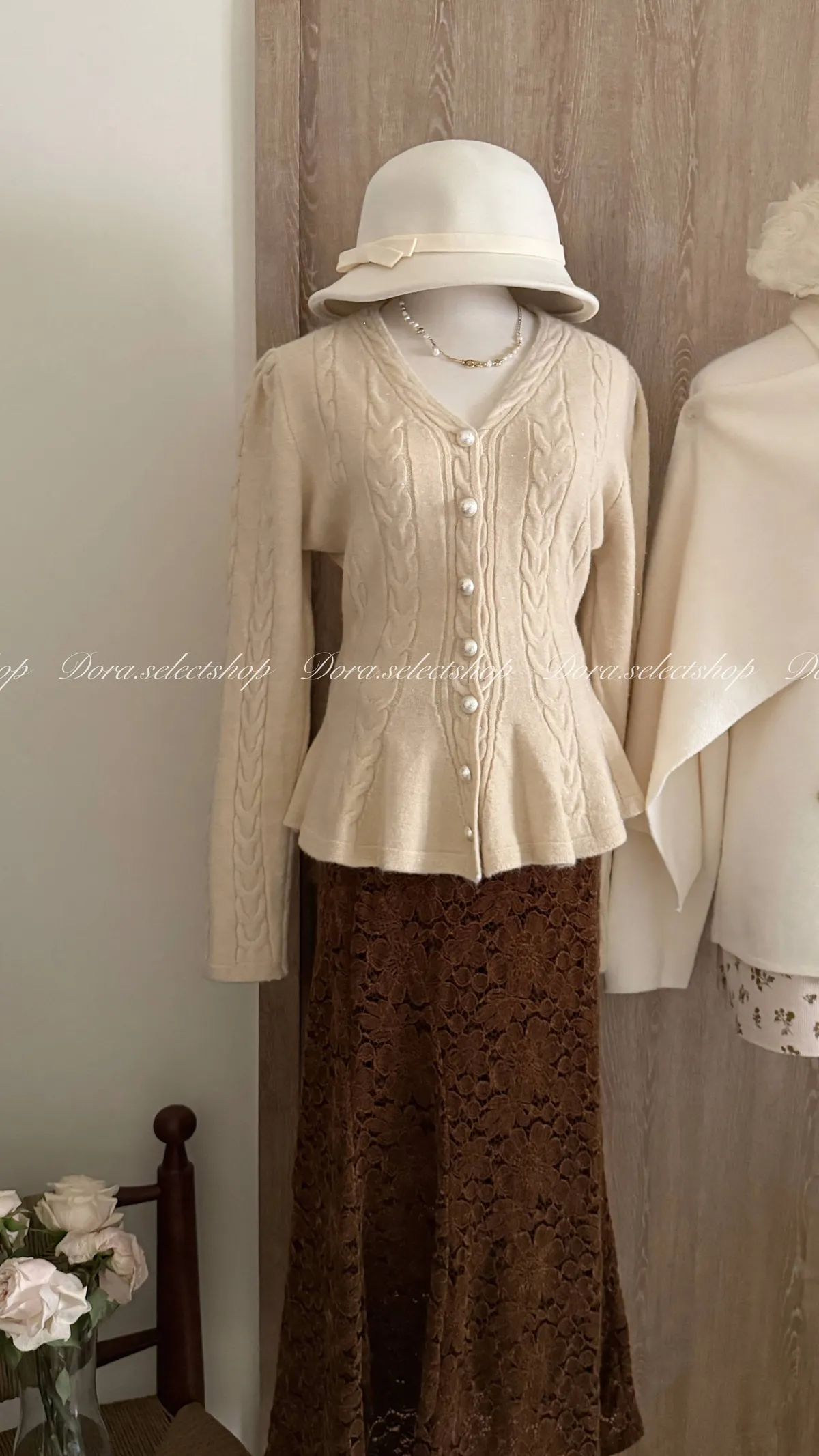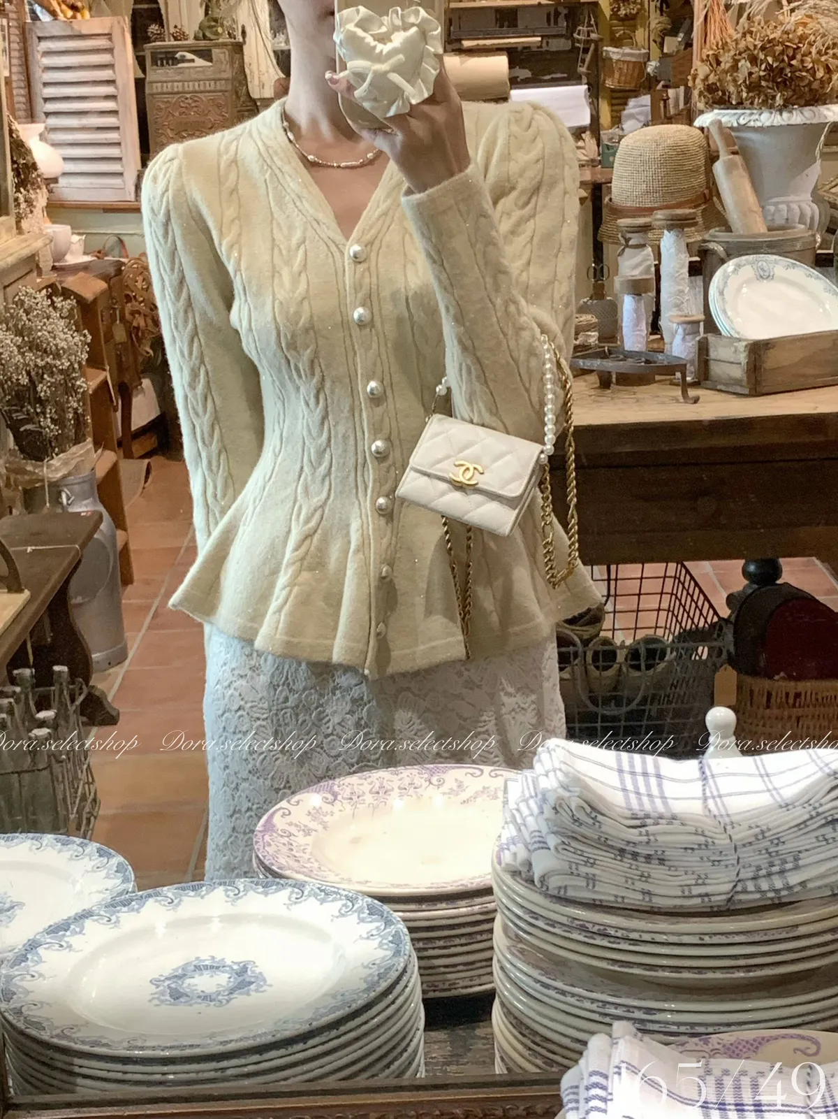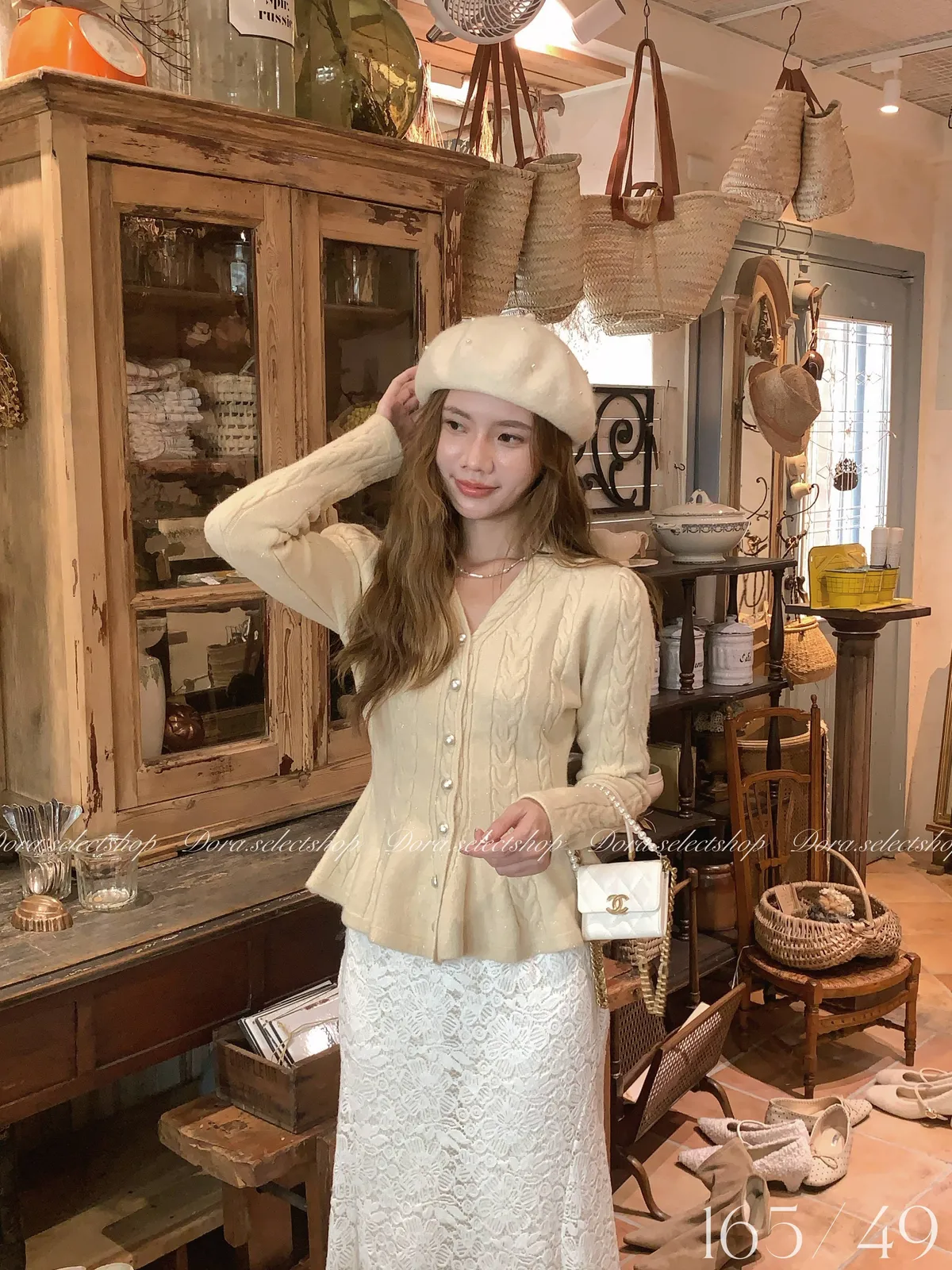 典雅珍珠釦縮腰傘襬麻花針織衣---米