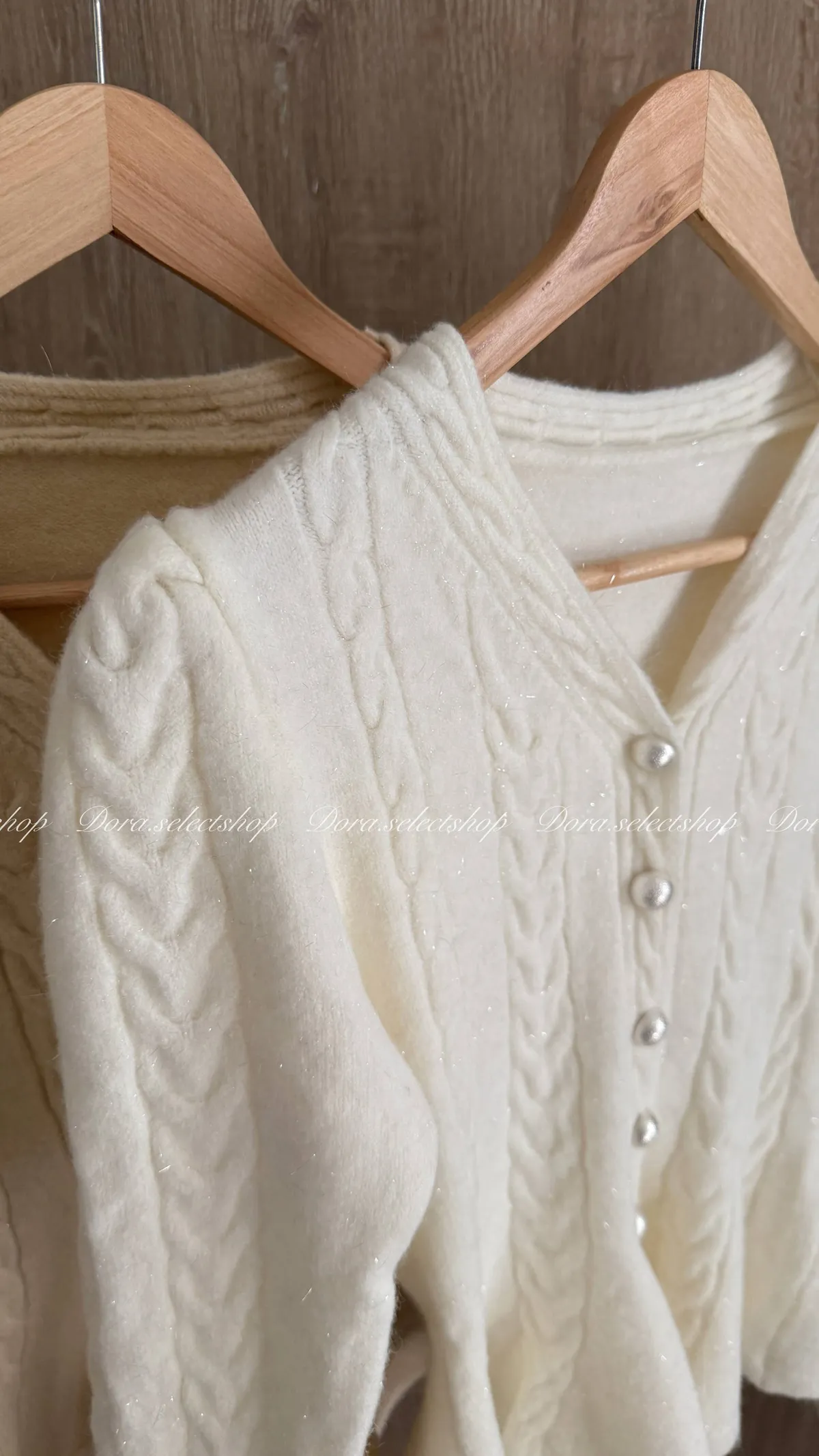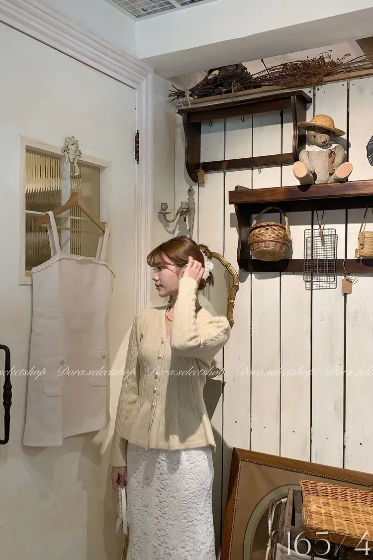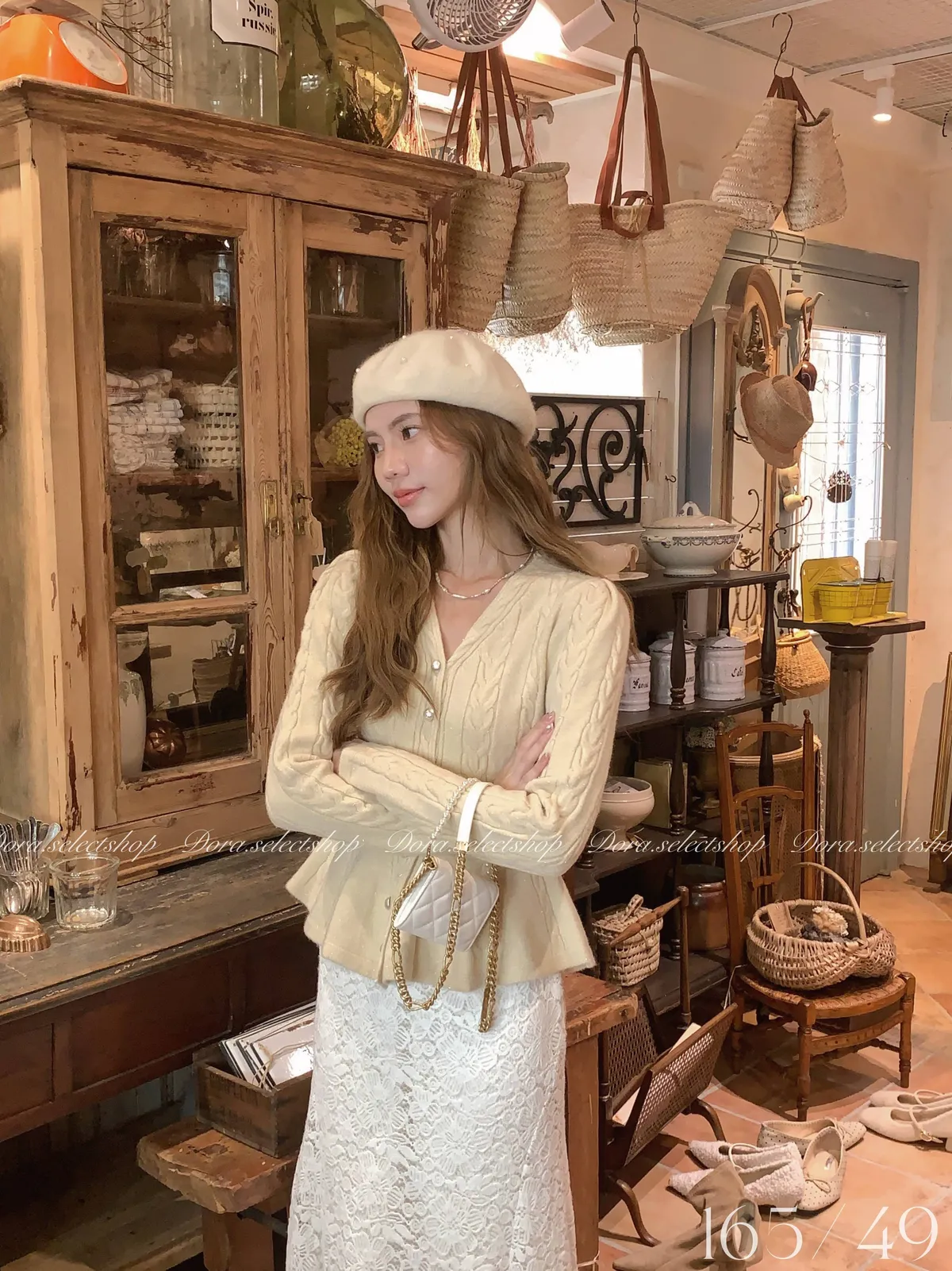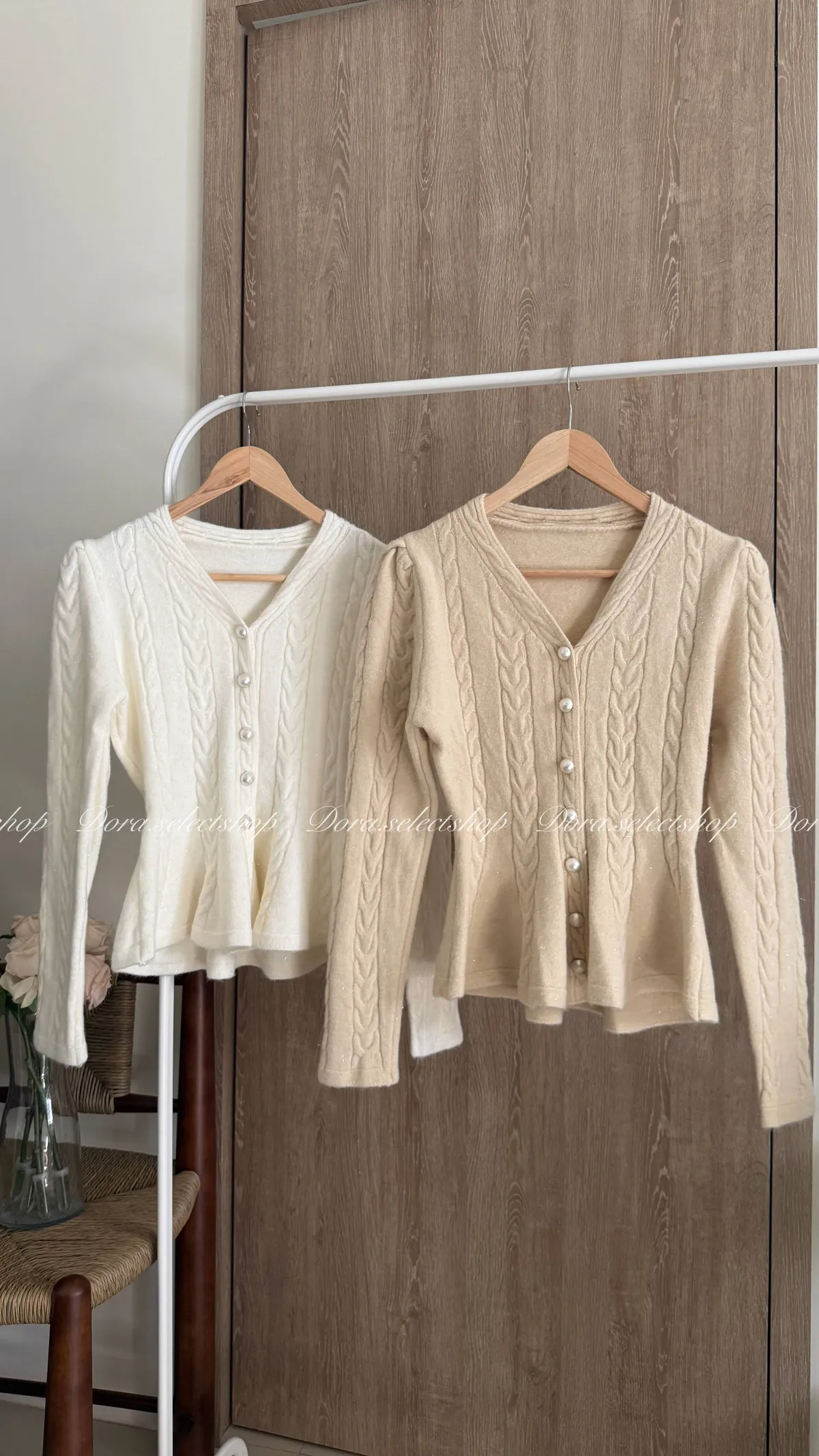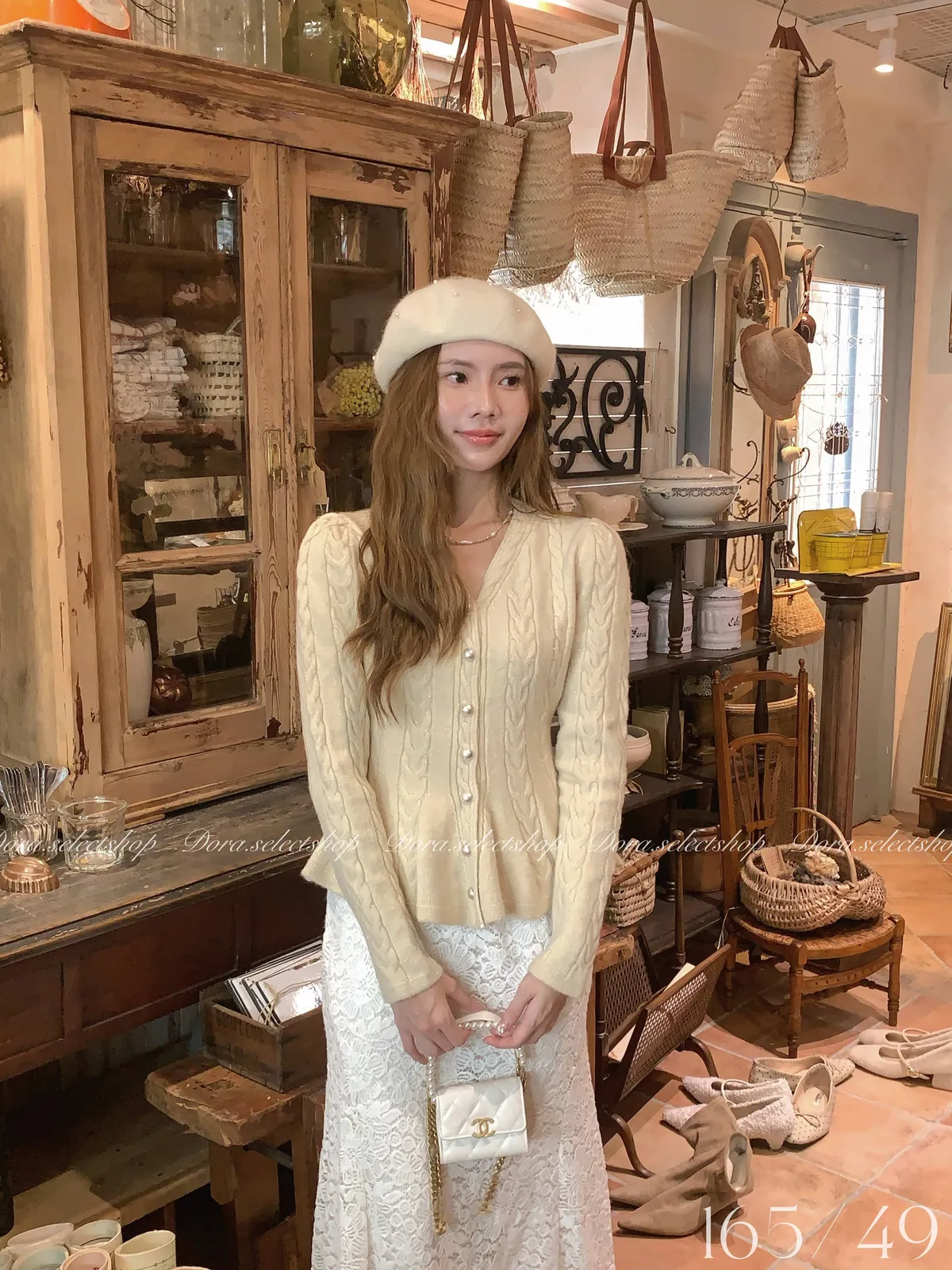 典雅珍珠釦縮腰傘襬麻花針織衣---米