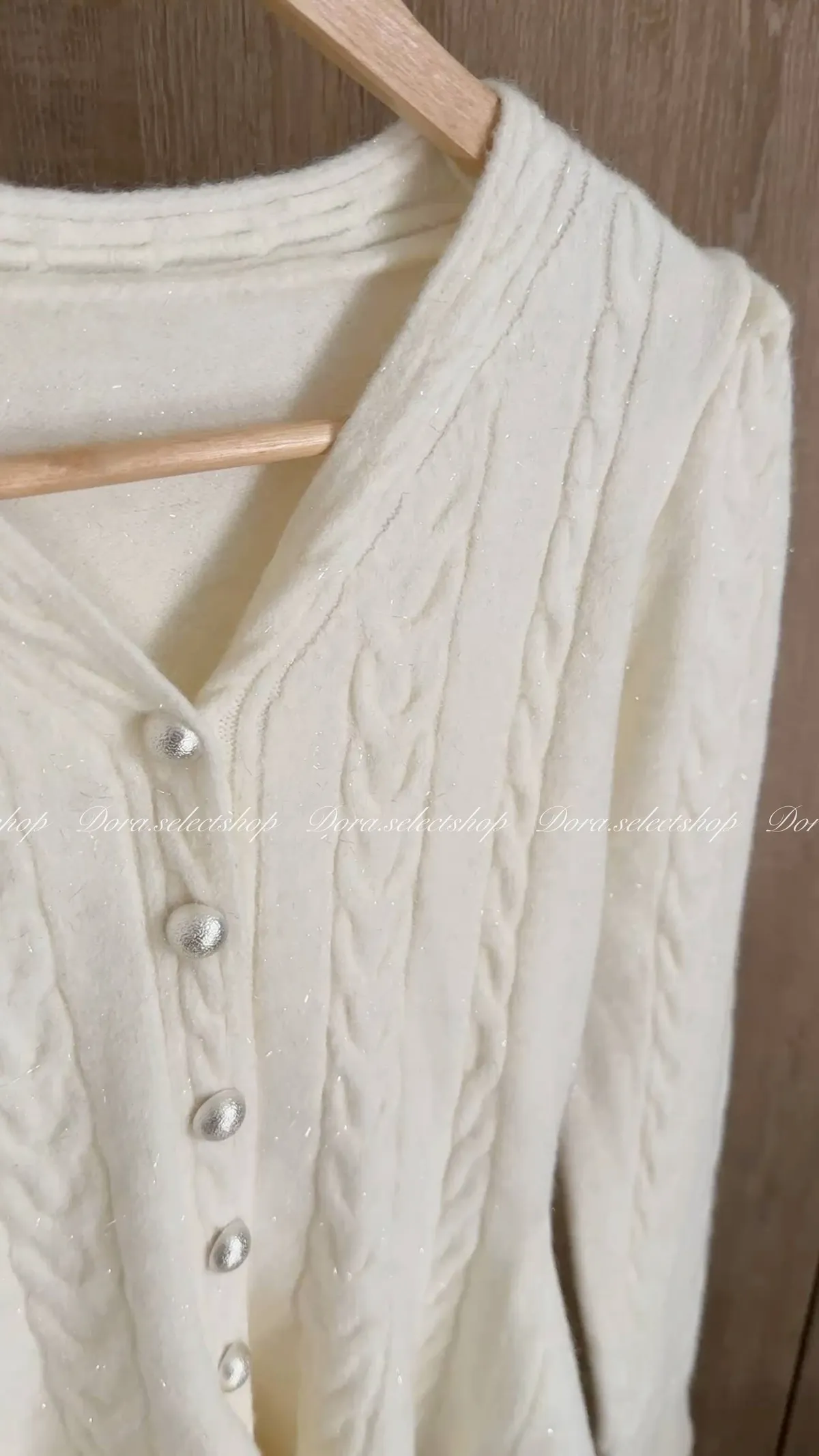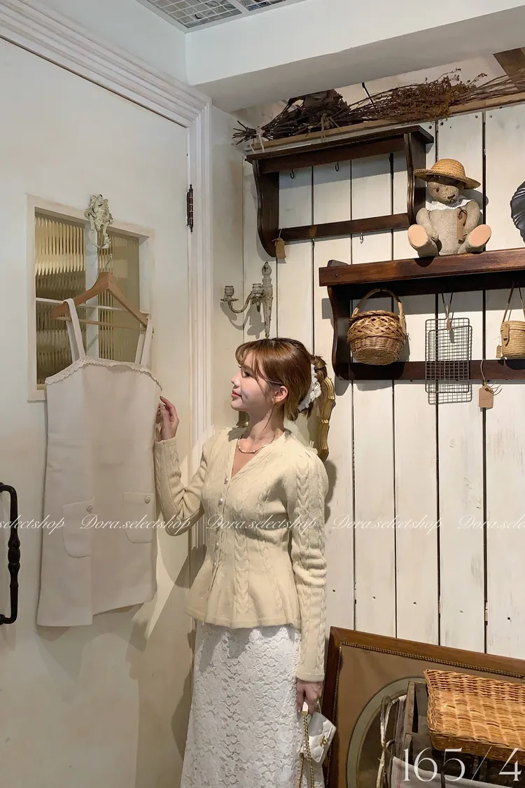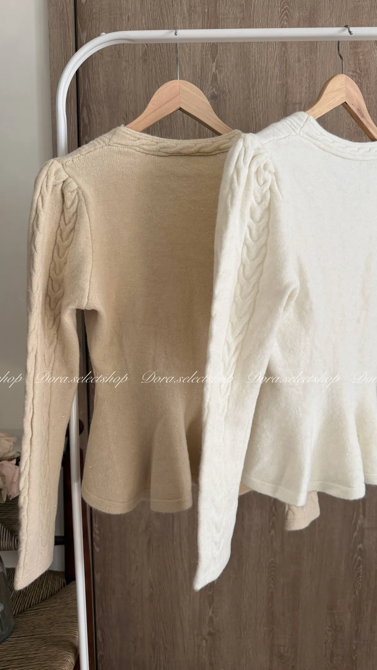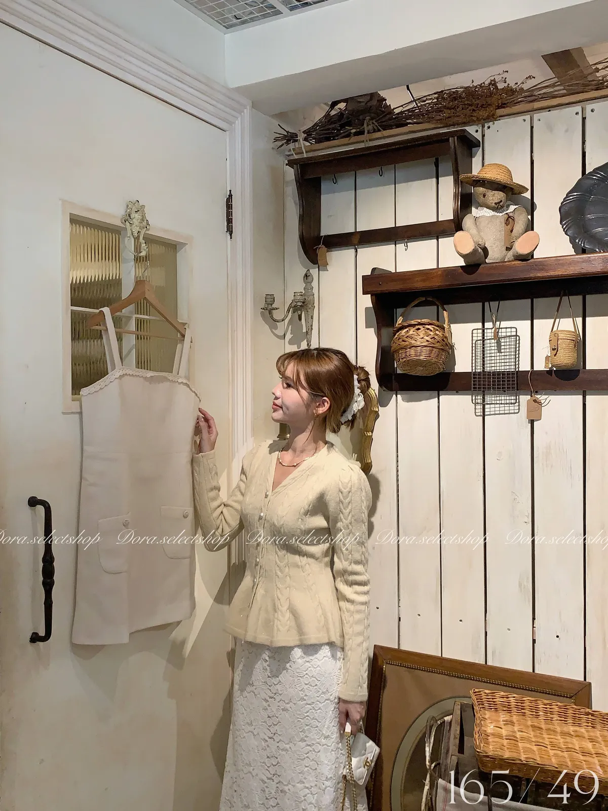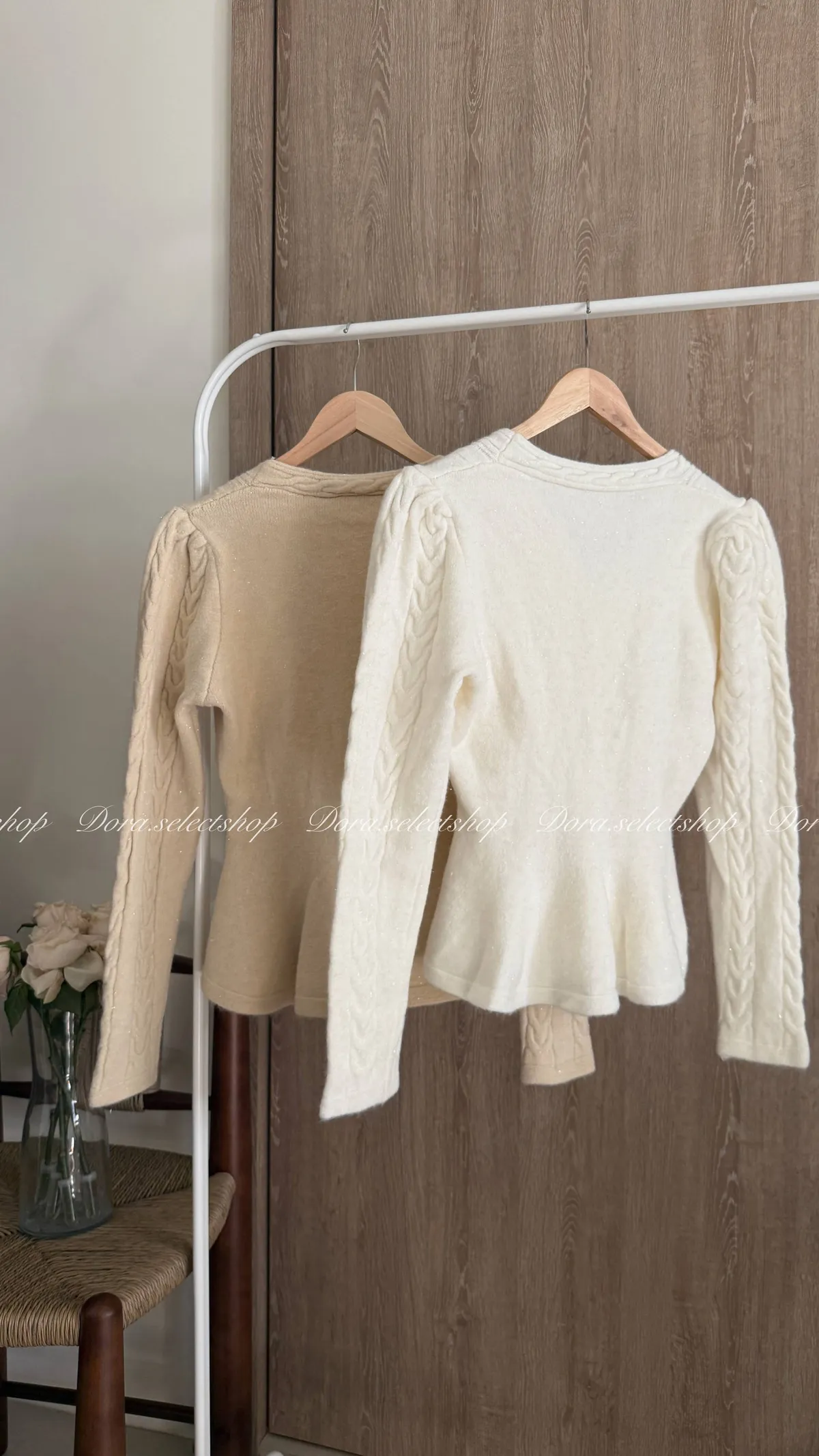 典雅珍珠釦縮腰傘襬麻花針織衣---米