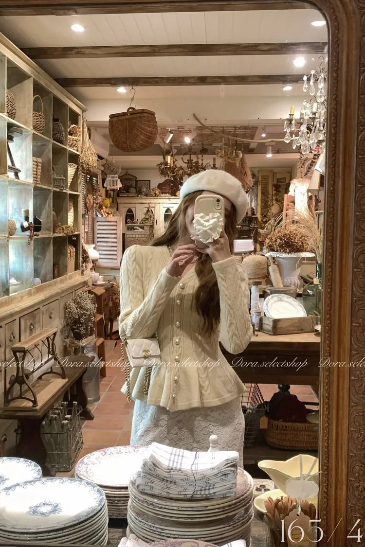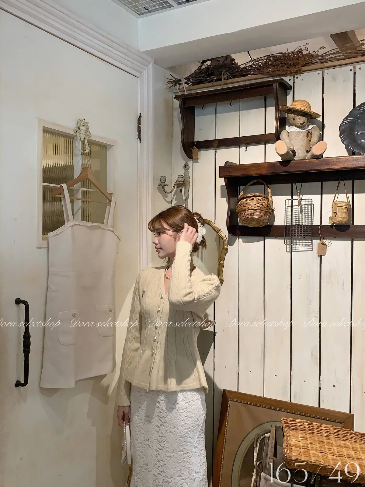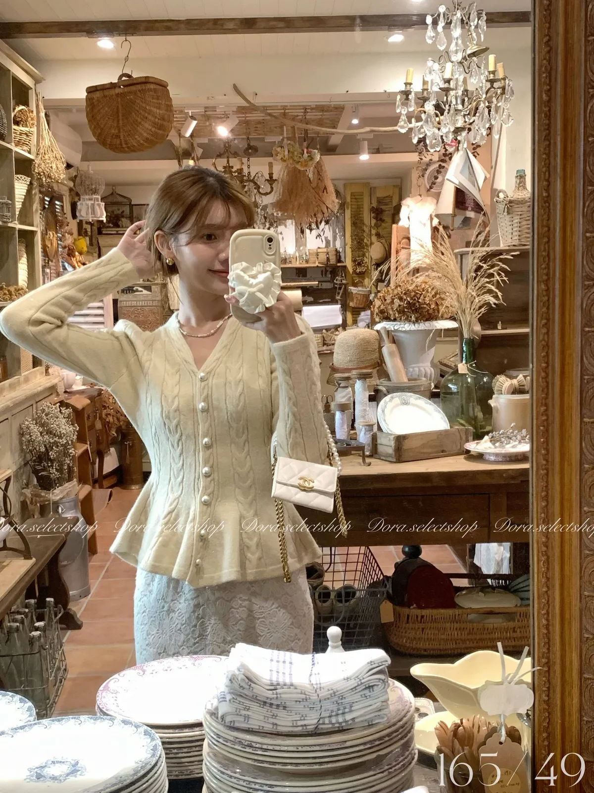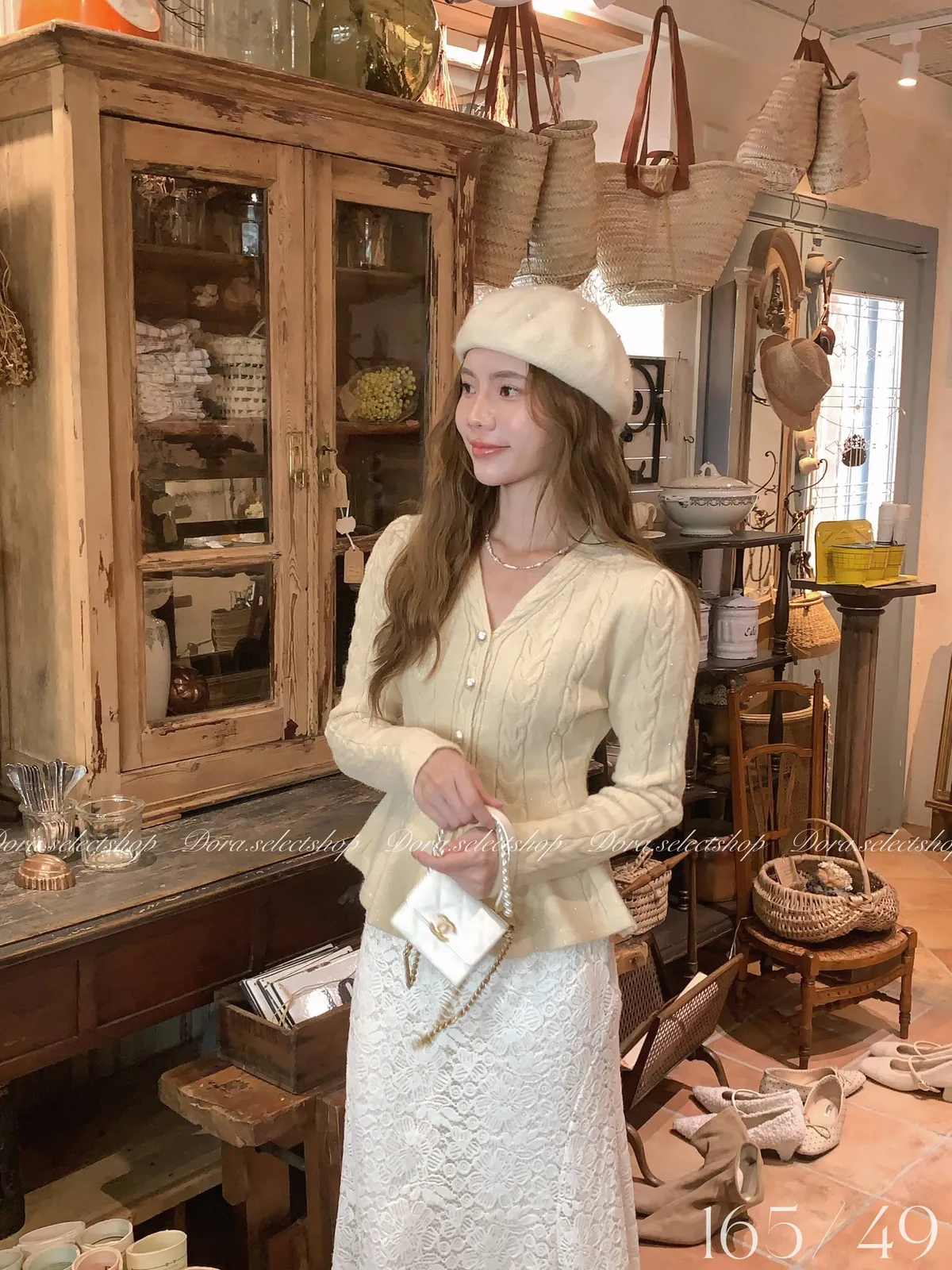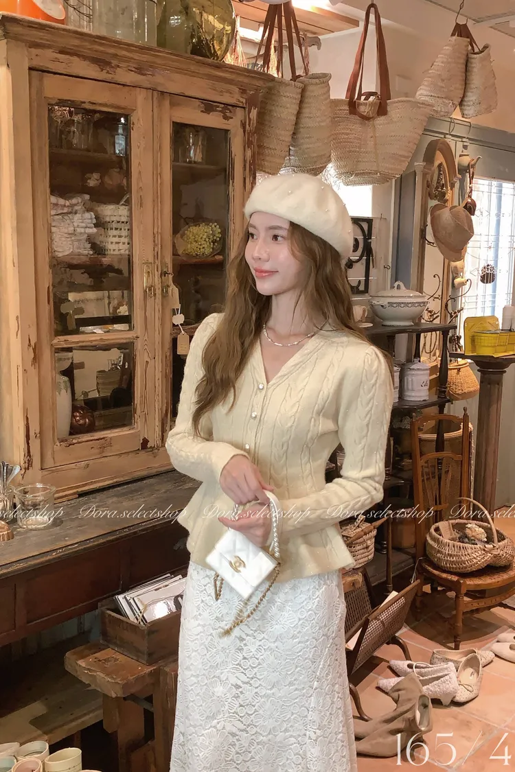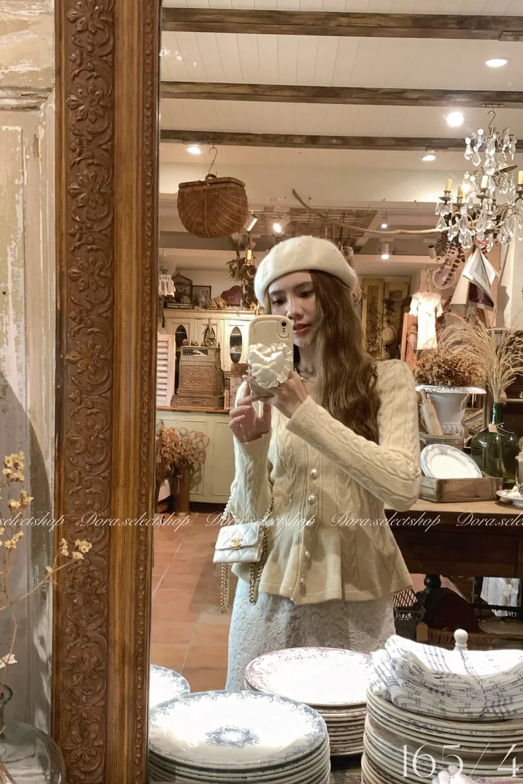 典雅珍珠釦縮腰傘襬麻花針織衣---米