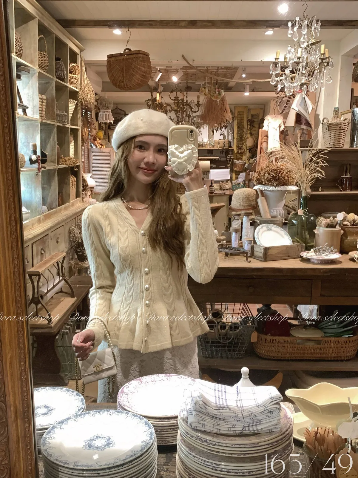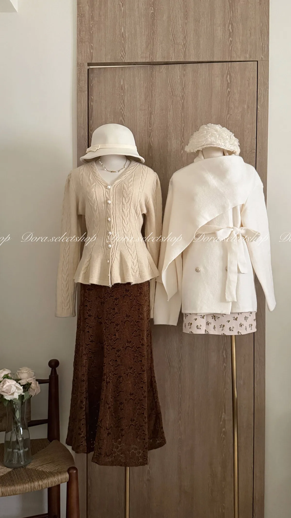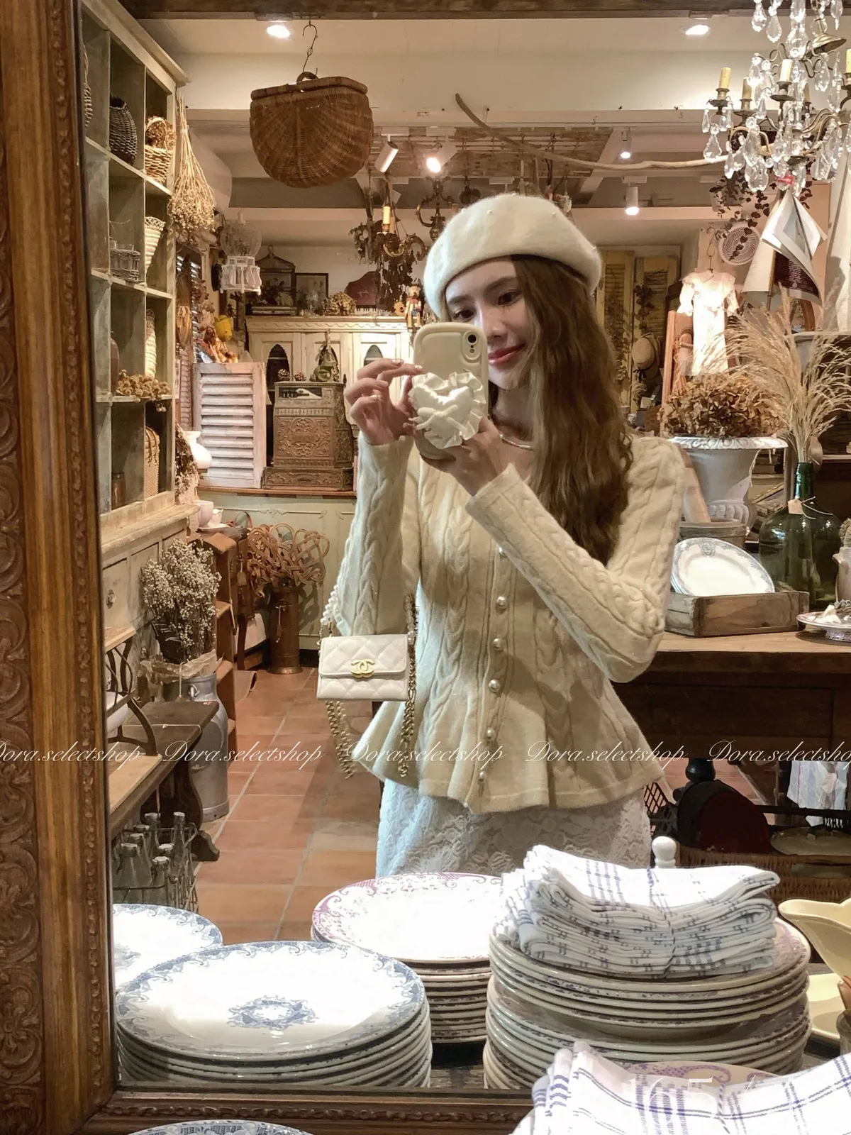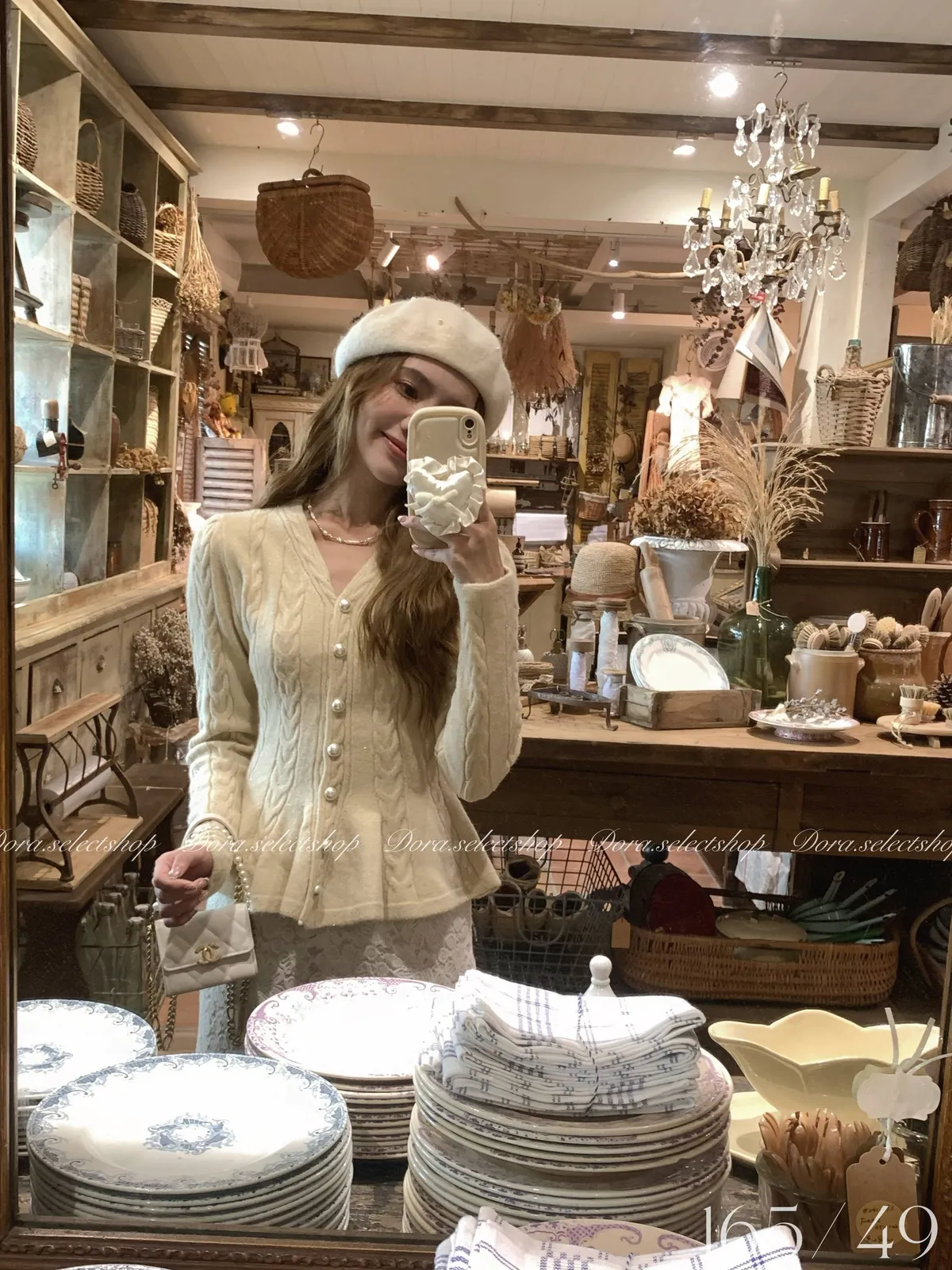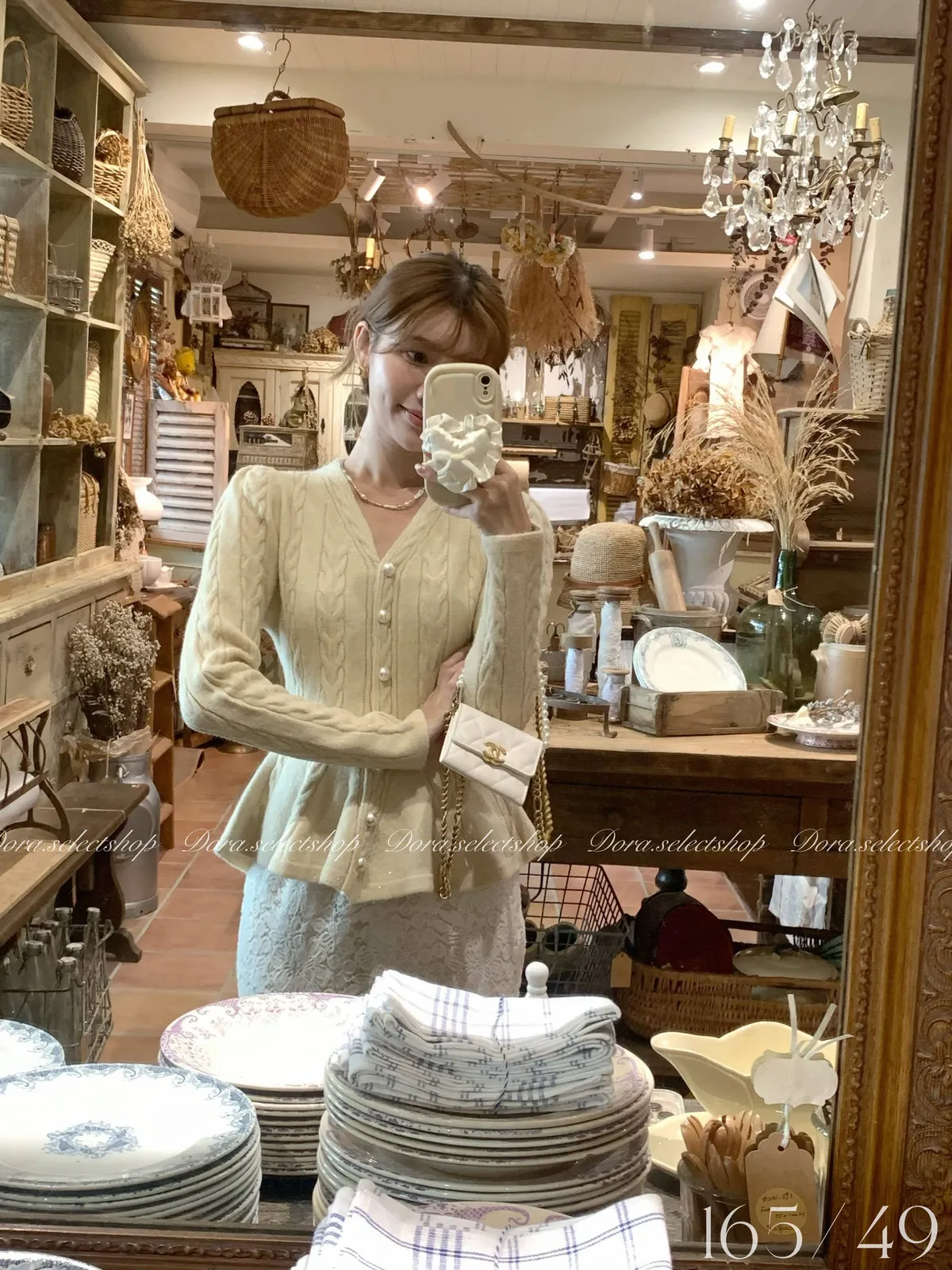 典雅珍珠釦縮腰傘襬麻花針織衣---米