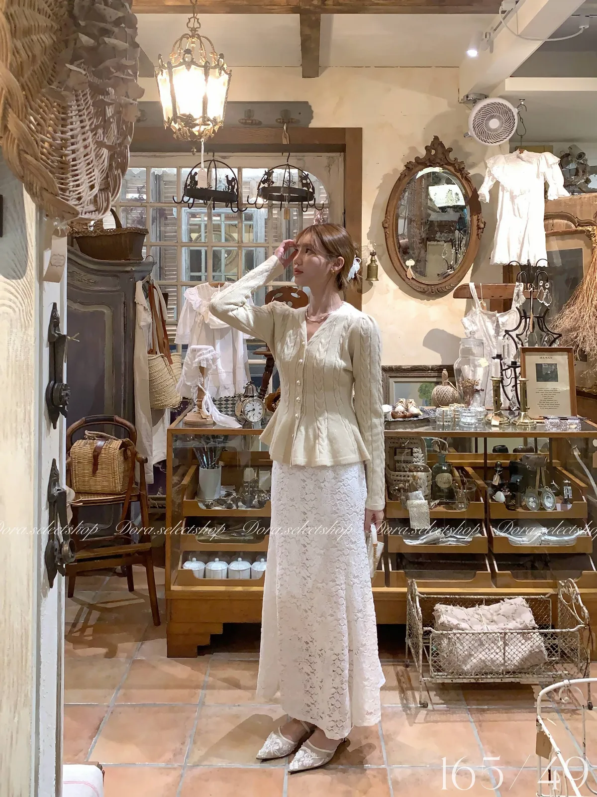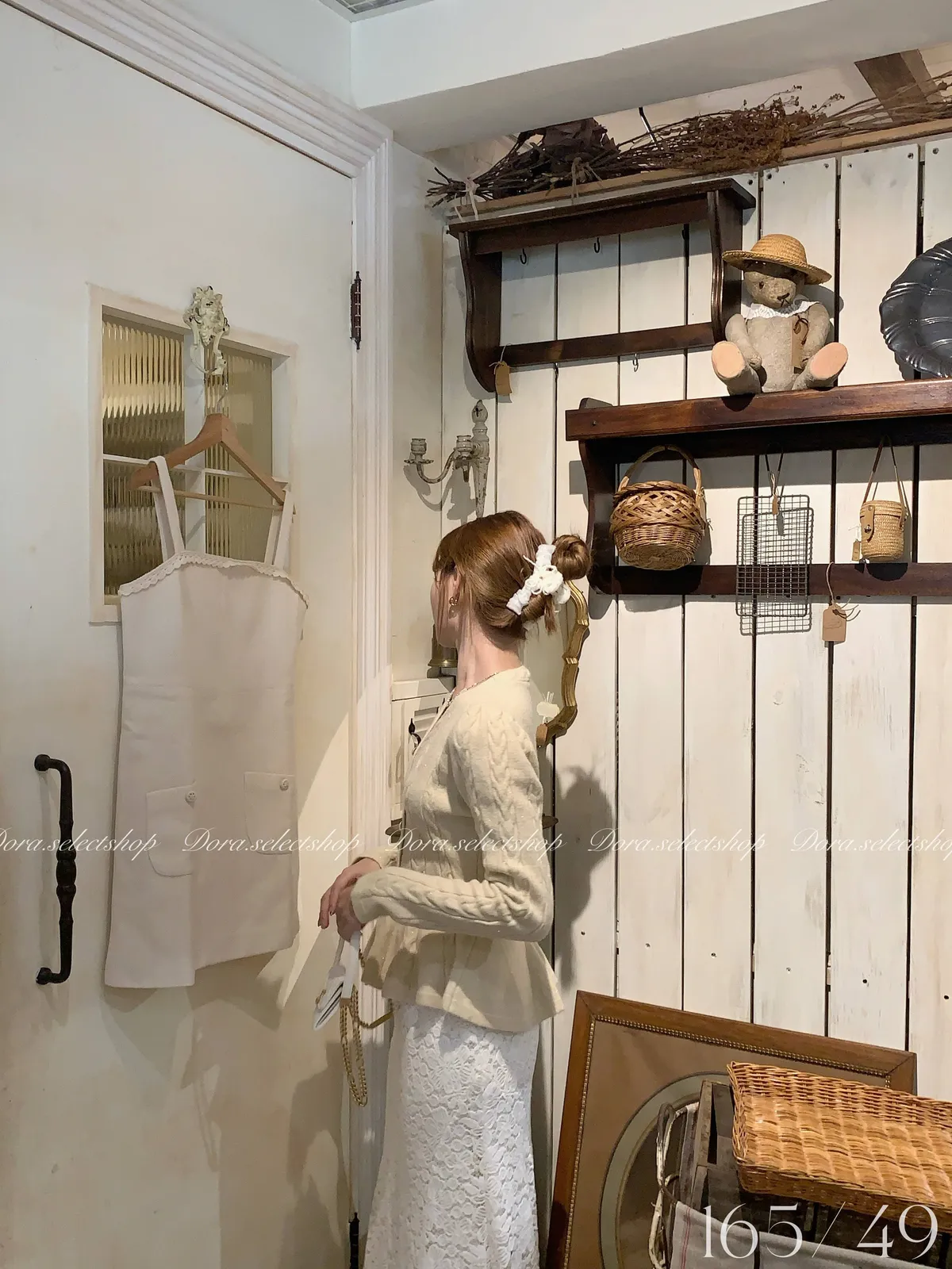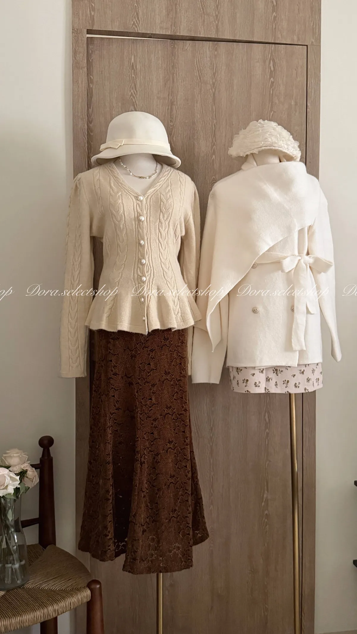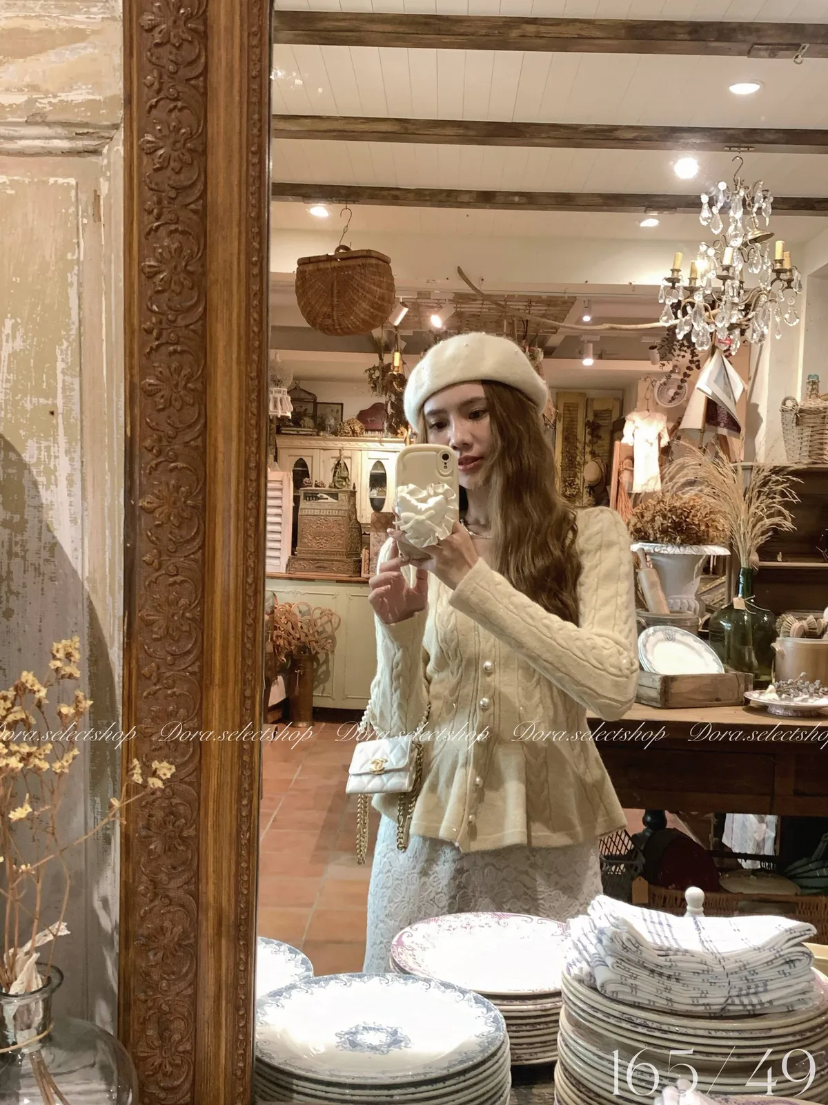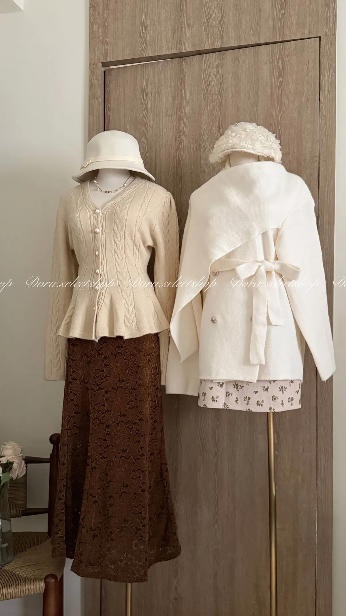 典雅珍珠釦縮腰傘襬麻花針織衣---米
