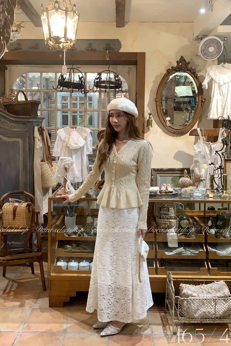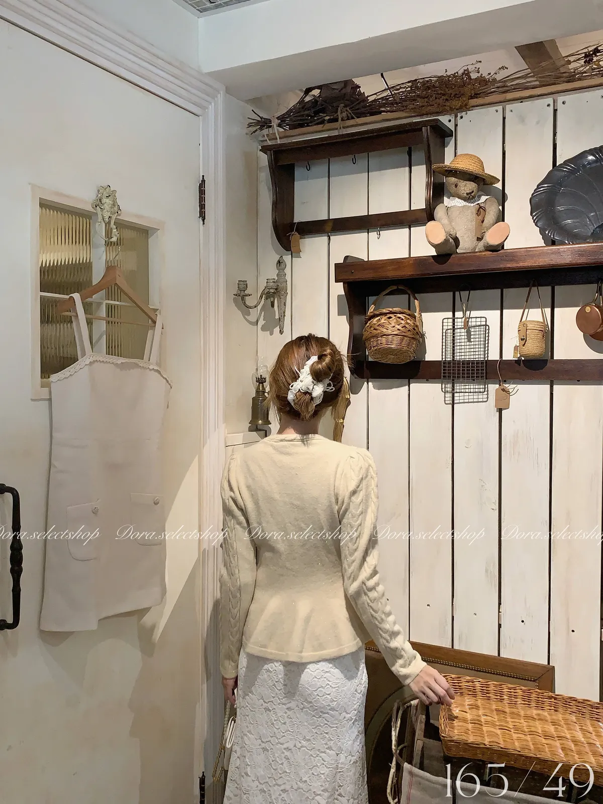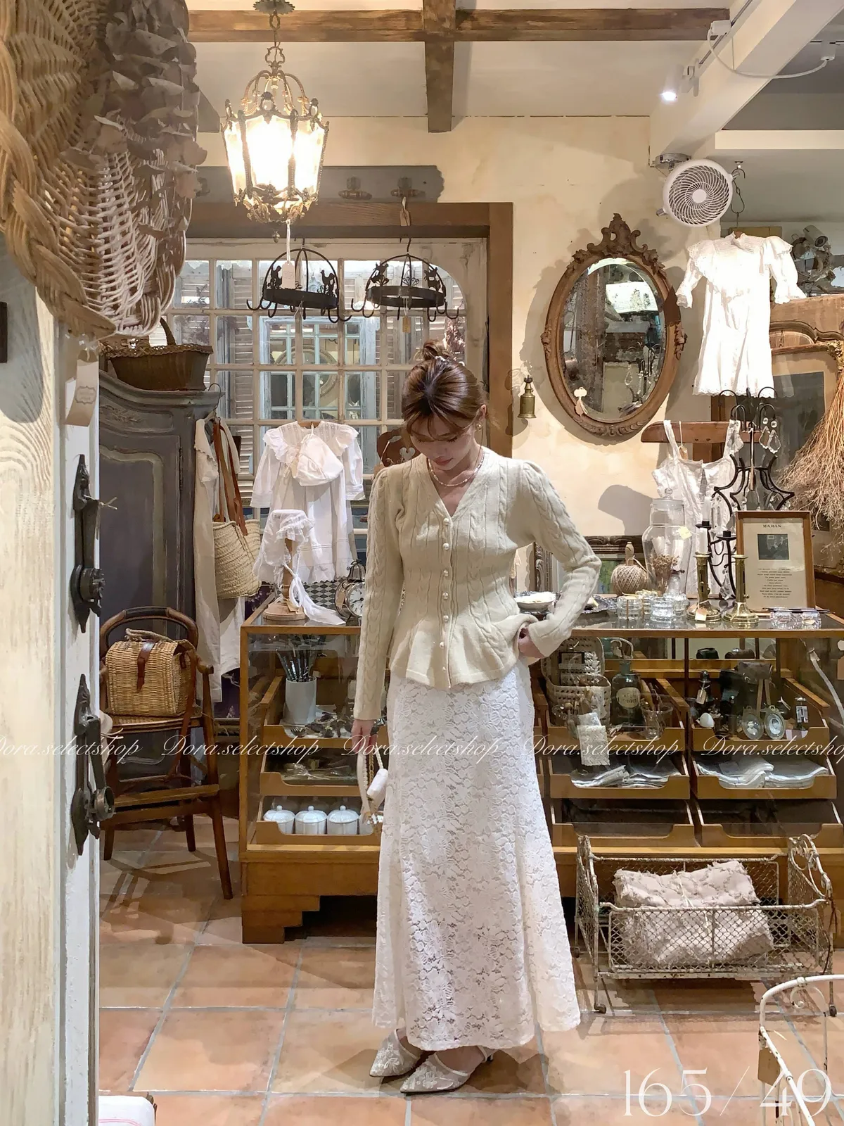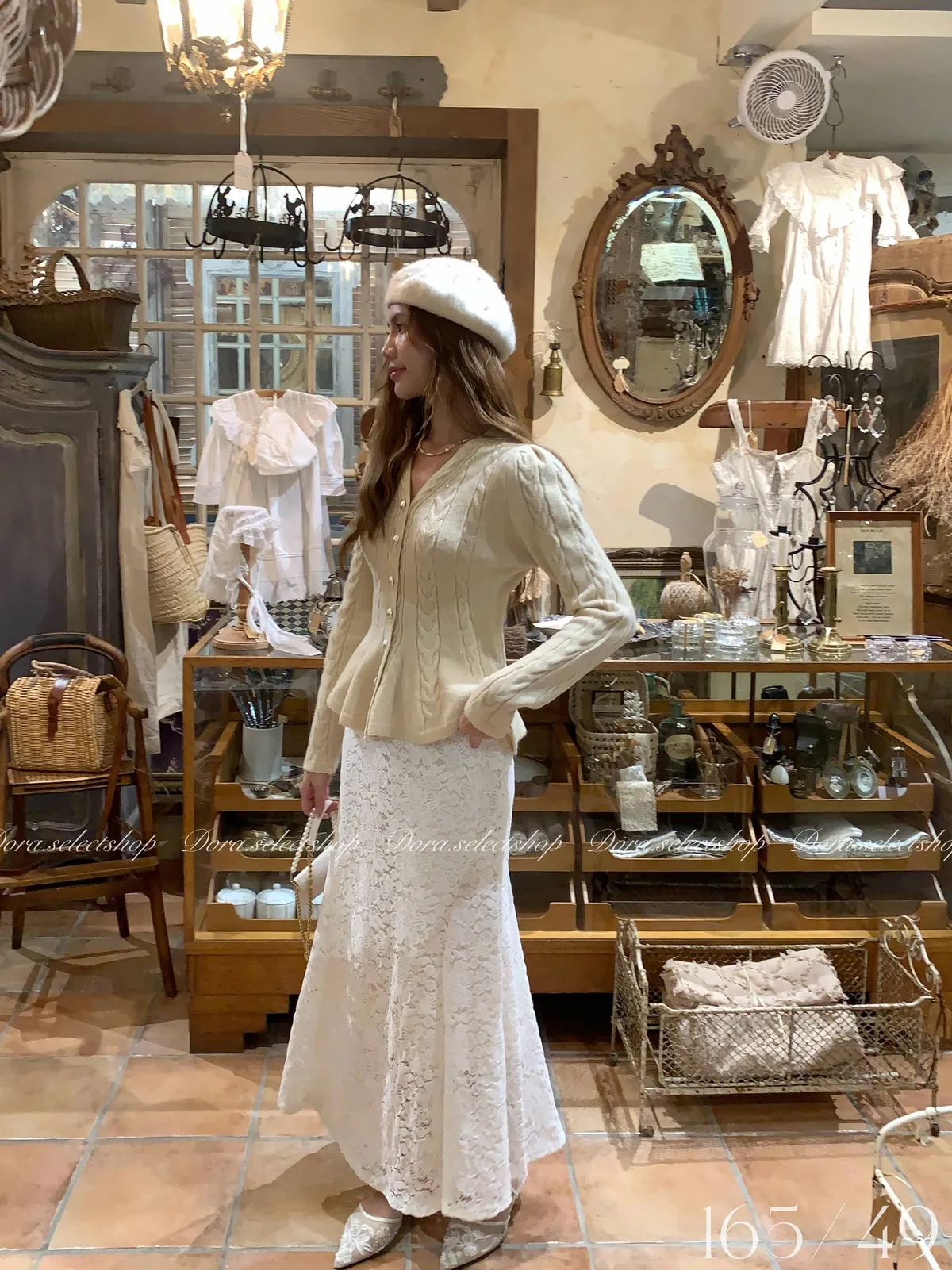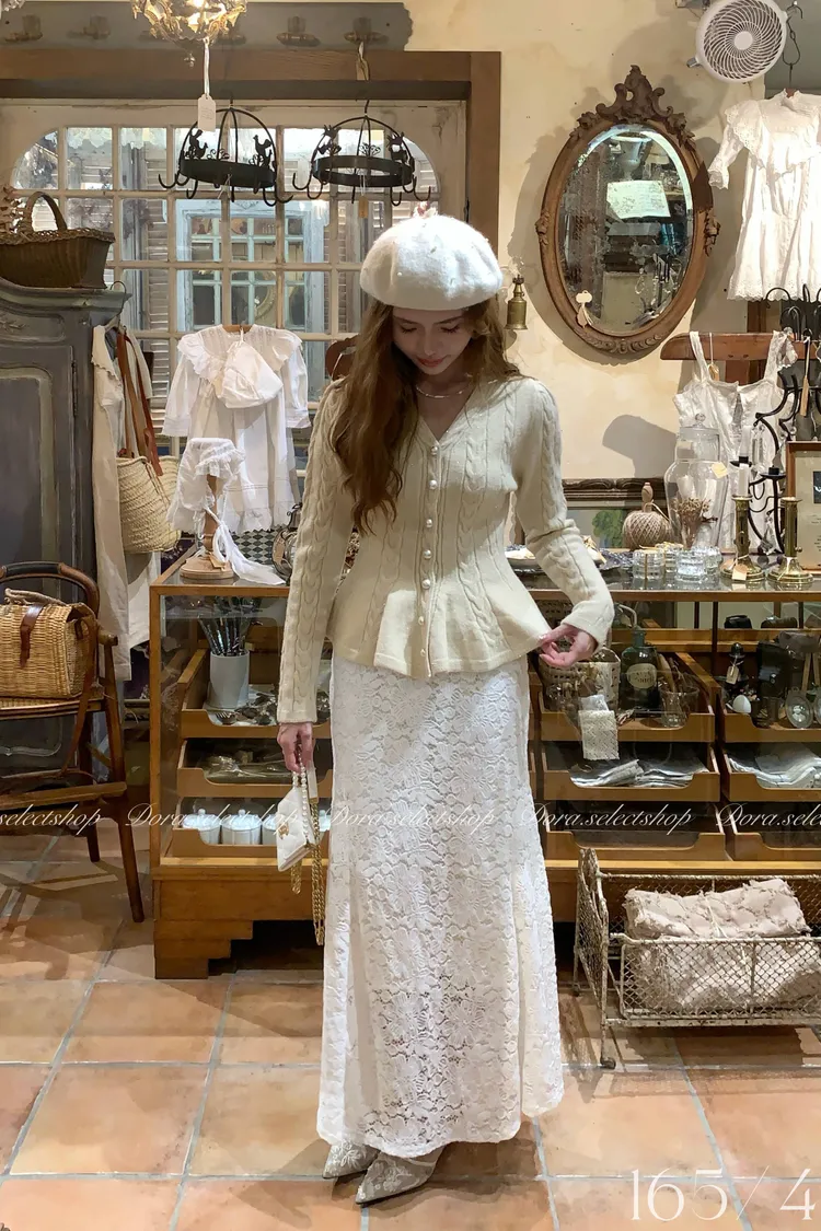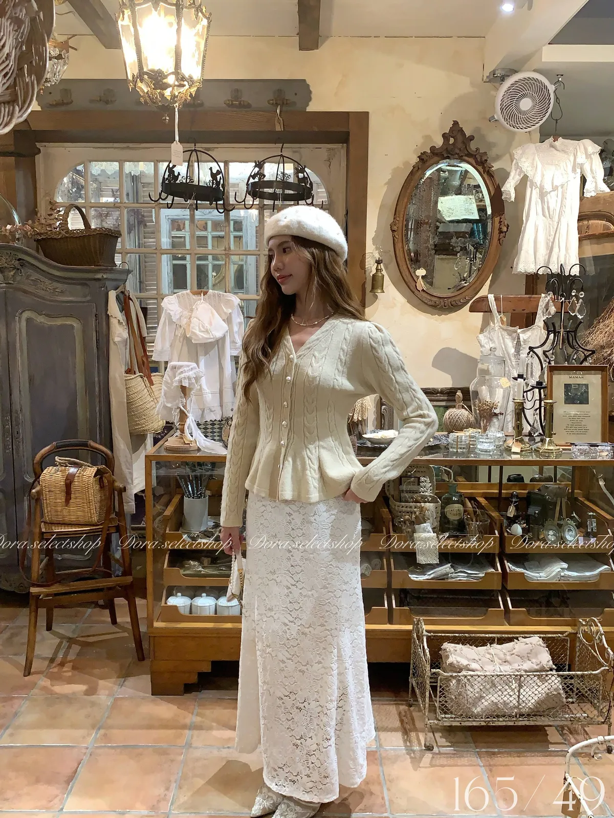 典雅珍珠釦縮腰傘襬麻花針織衣---米