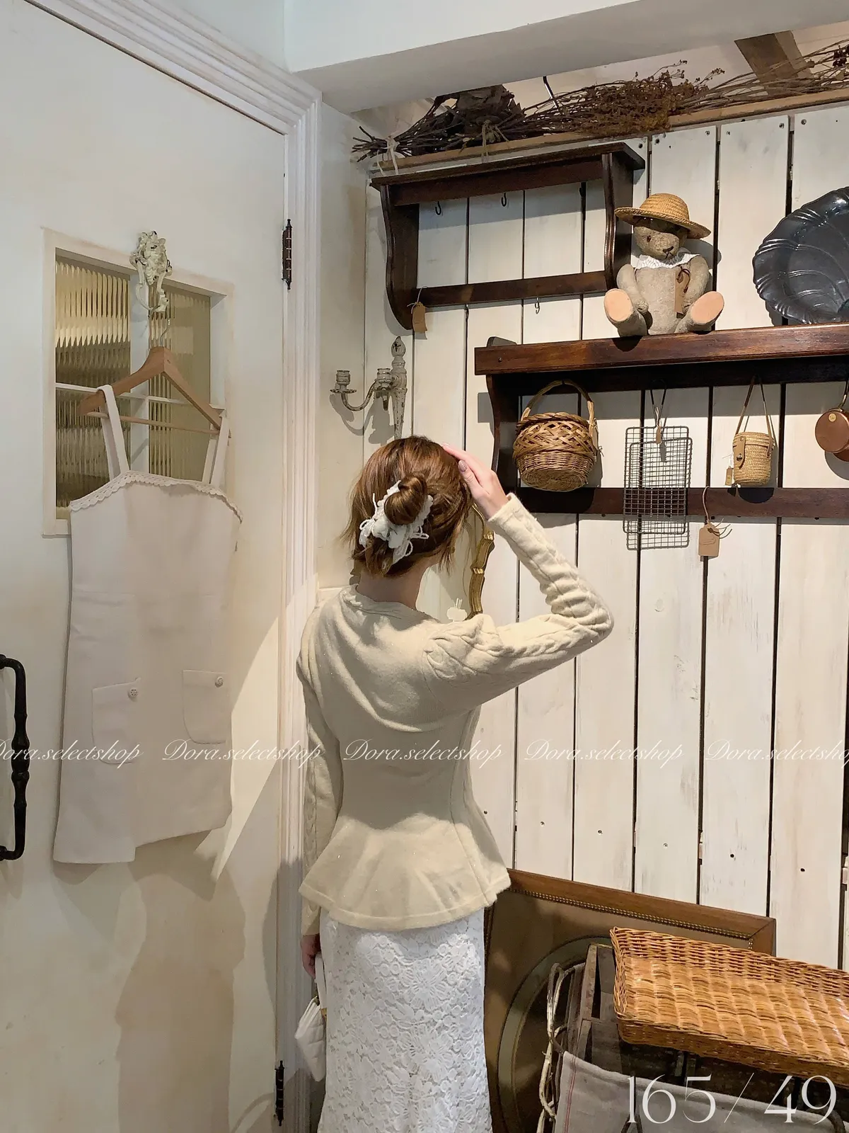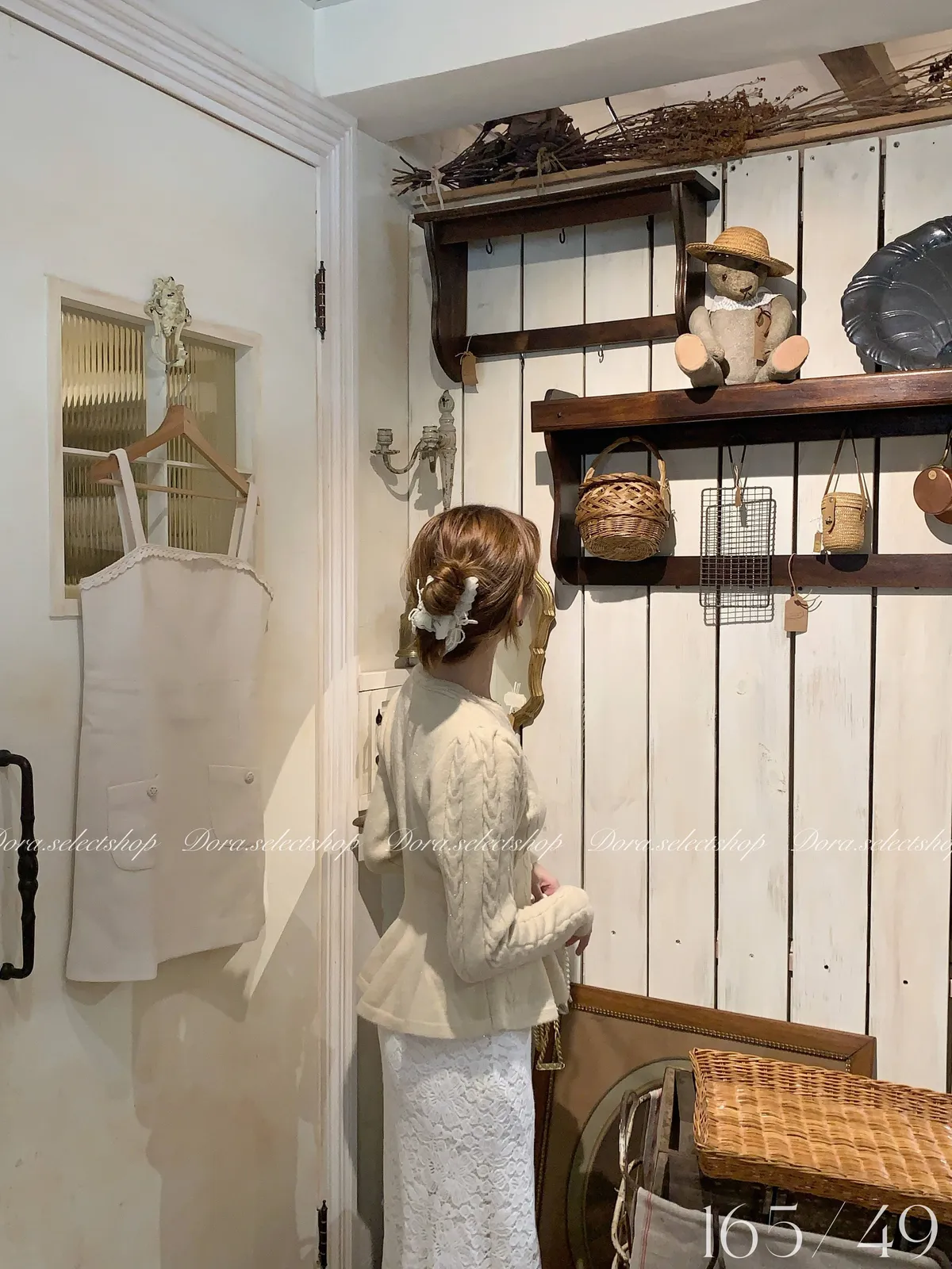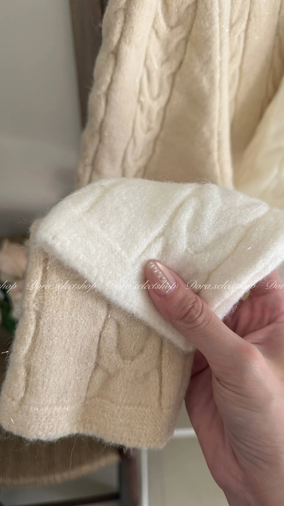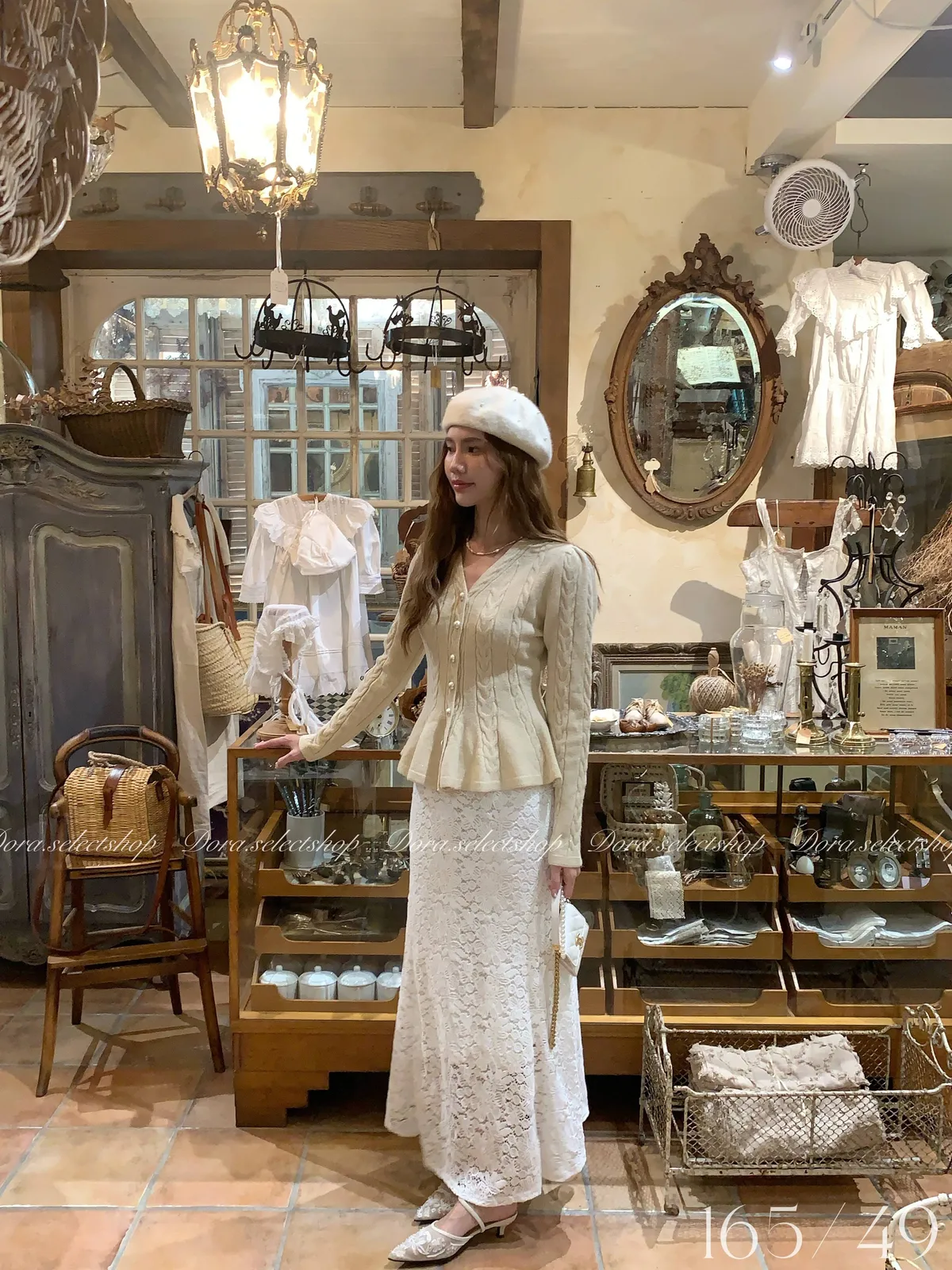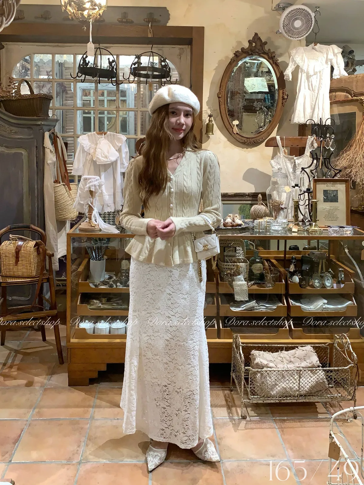 典雅珍珠釦縮腰傘襬麻花針織衣---米