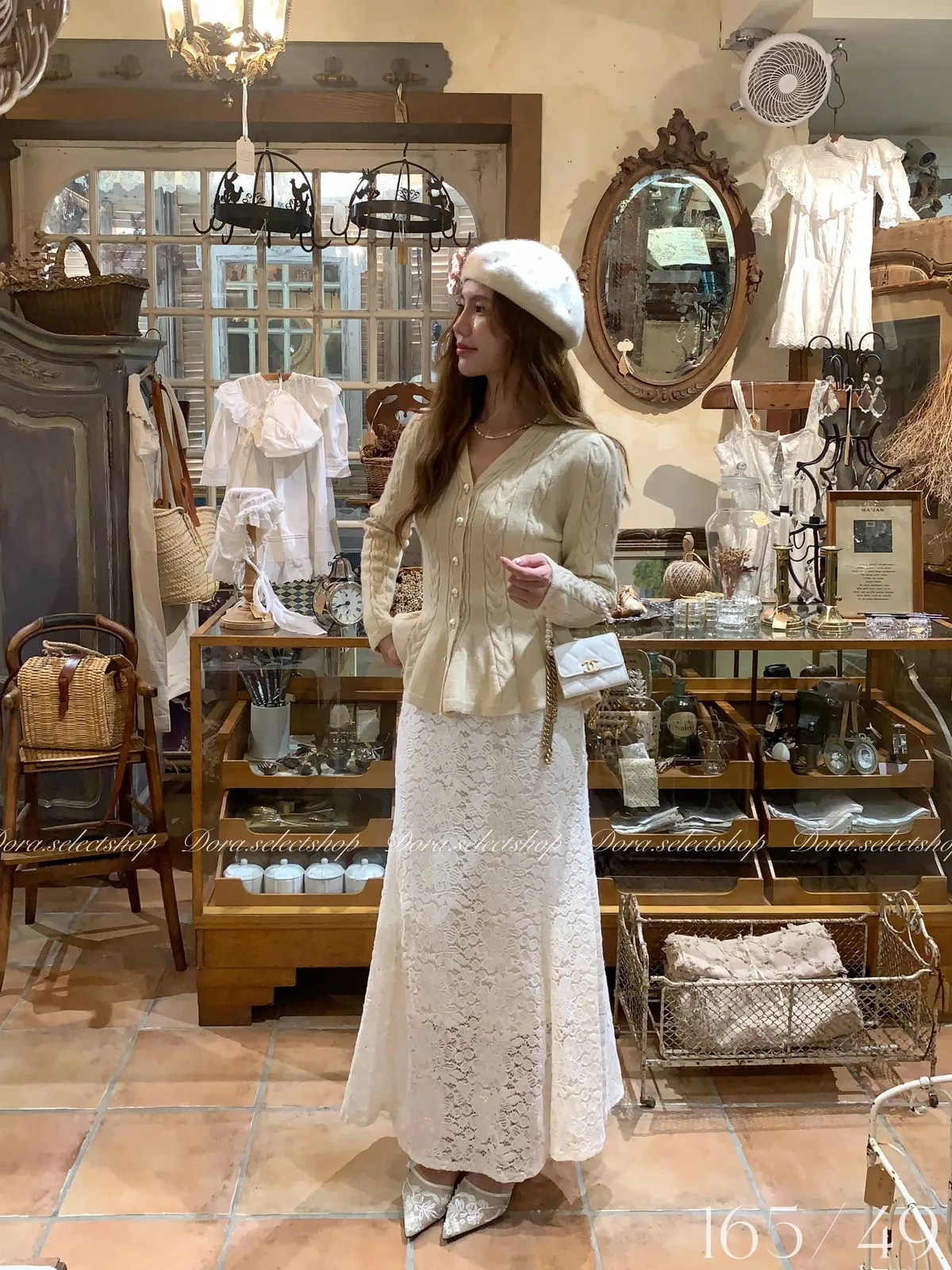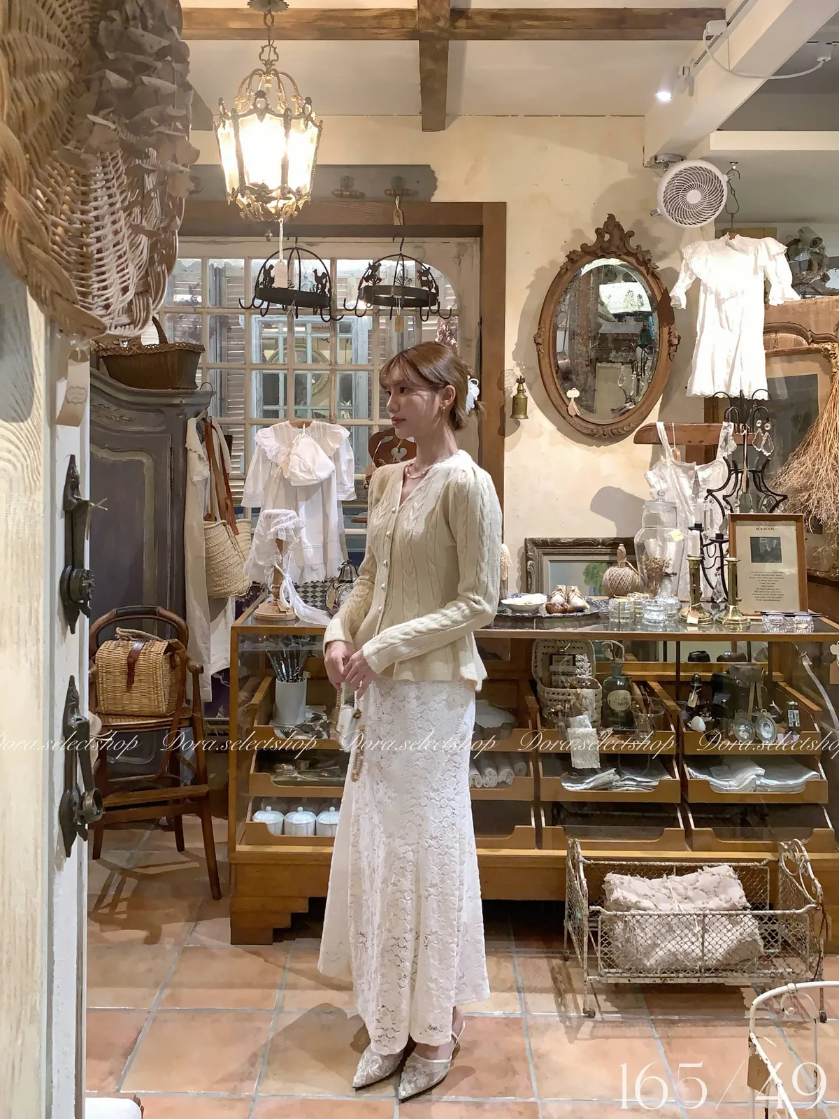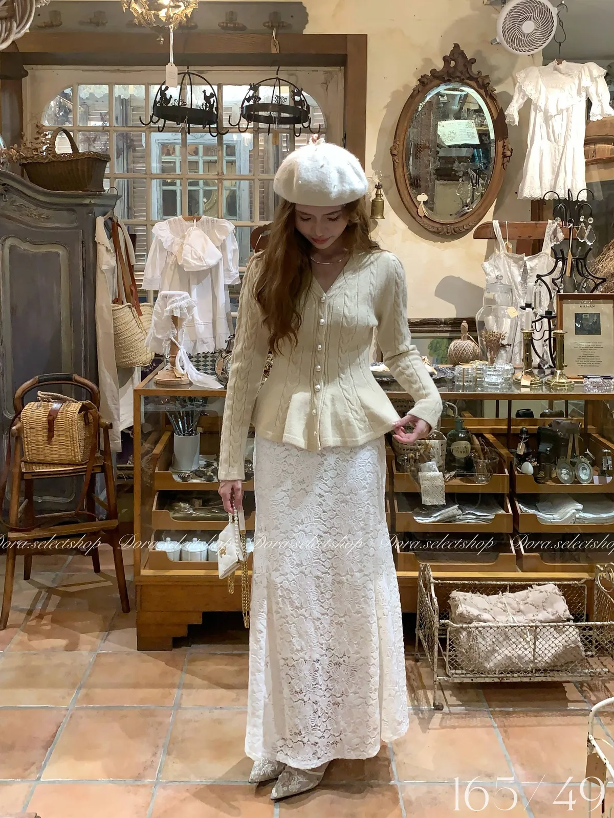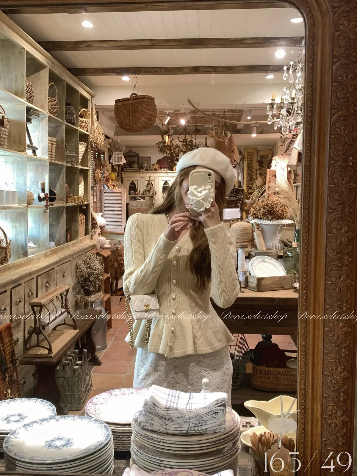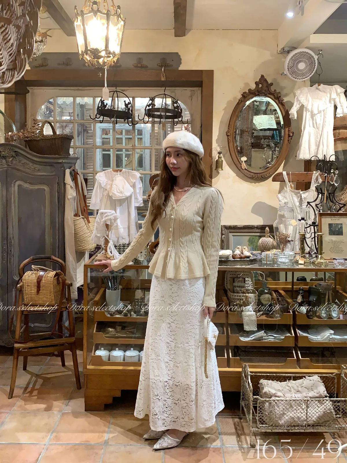 典雅珍珠釦縮腰傘襬麻花針織衣---米