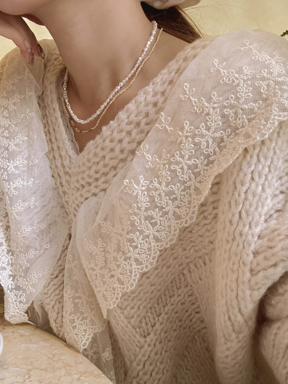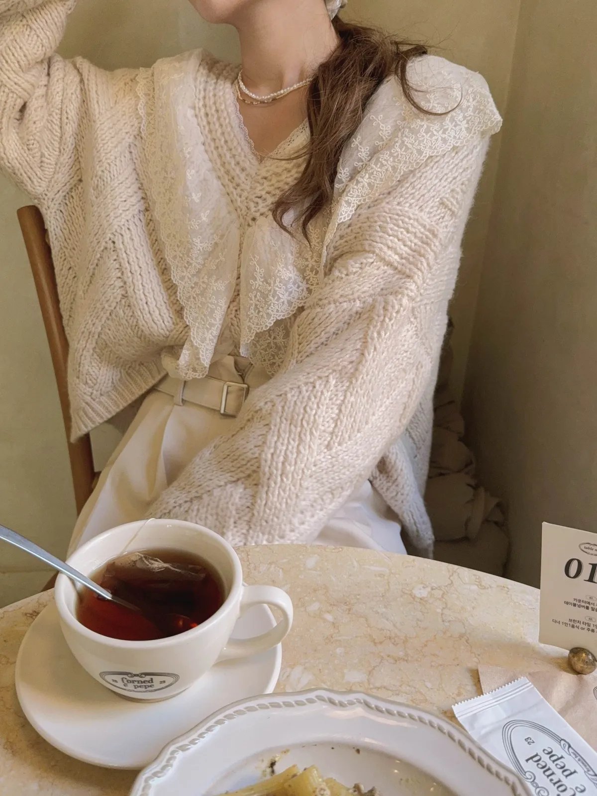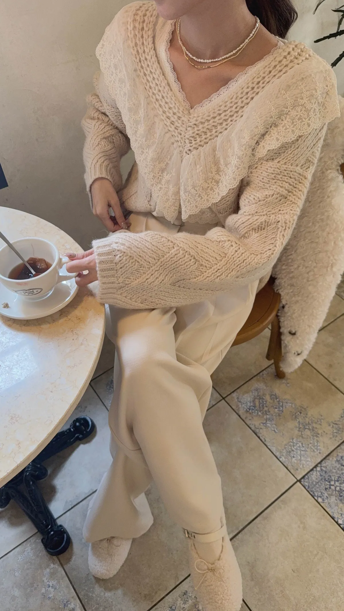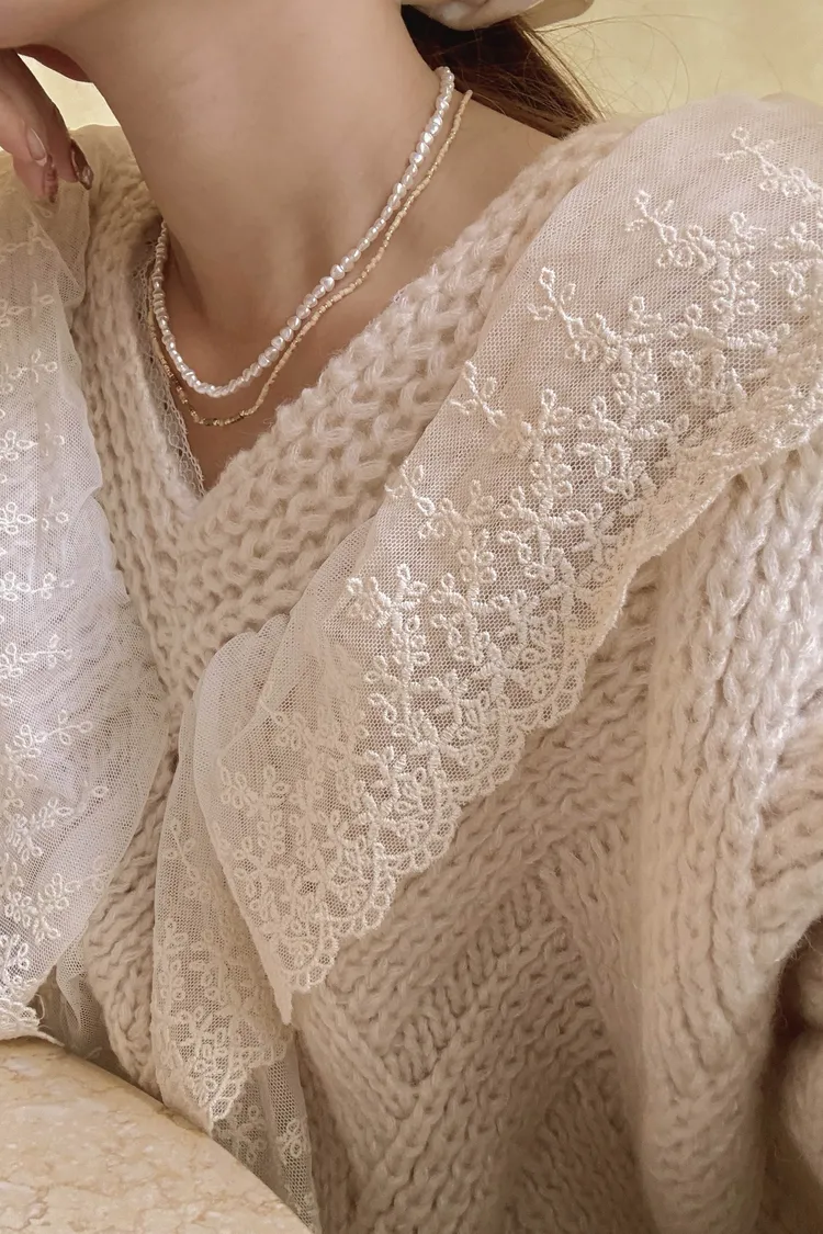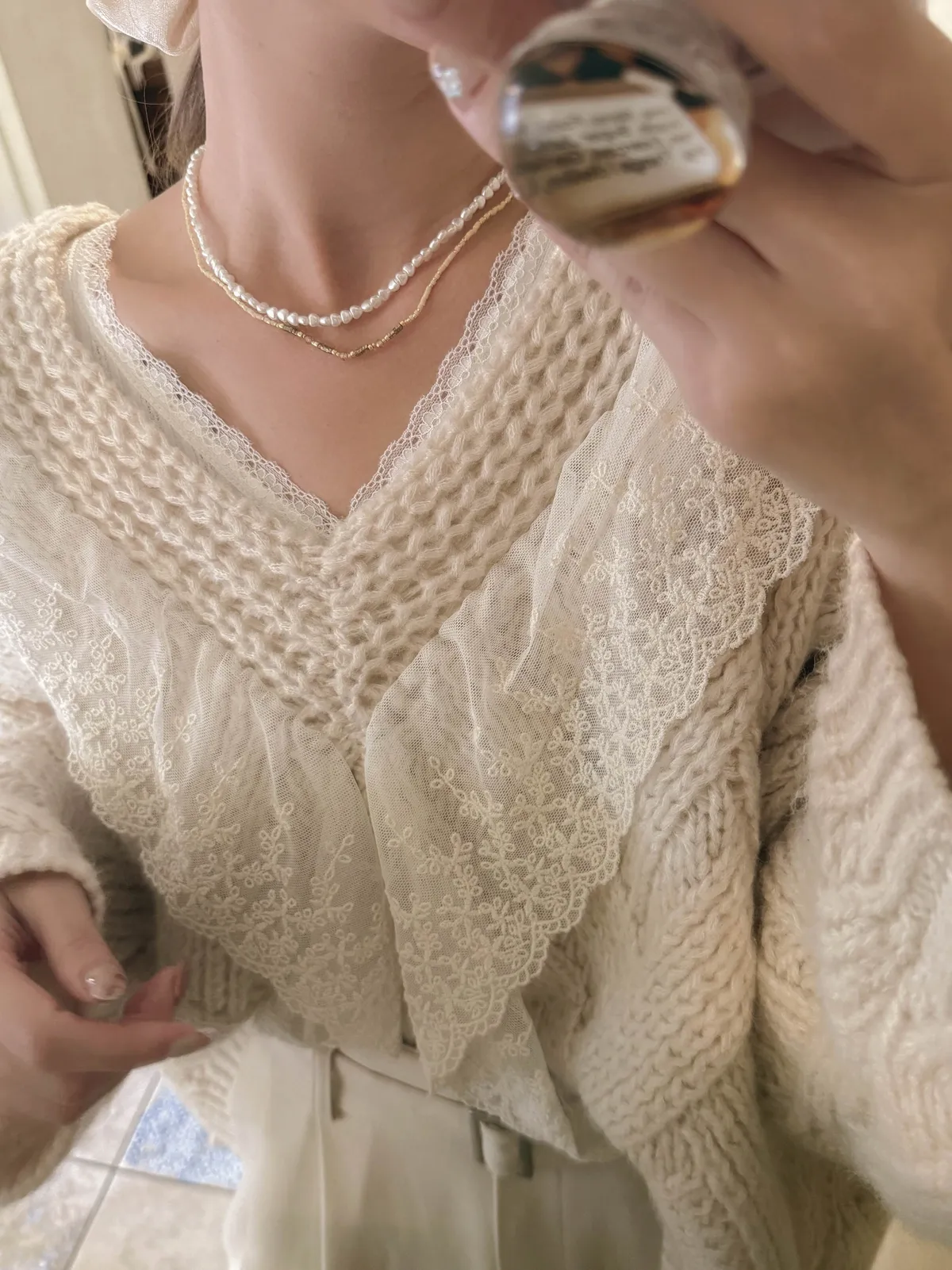 🇰🇷氣質公主麻花蕾絲拼接針織上衣---米