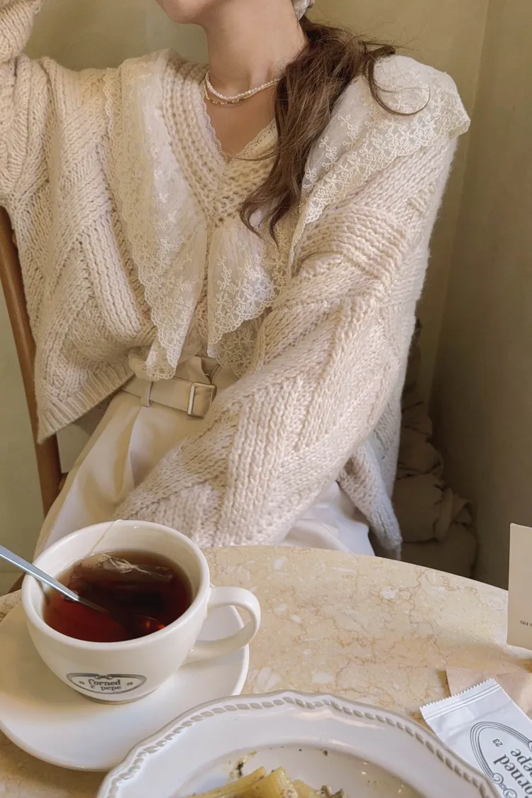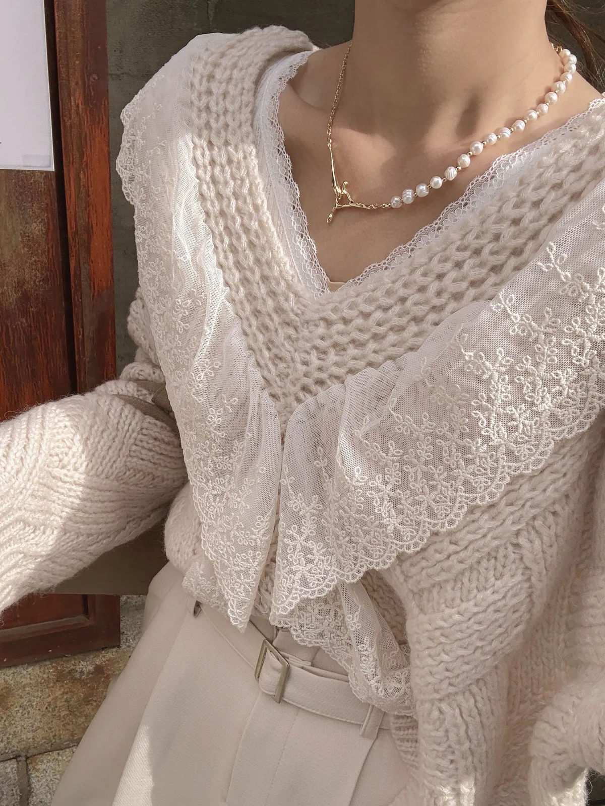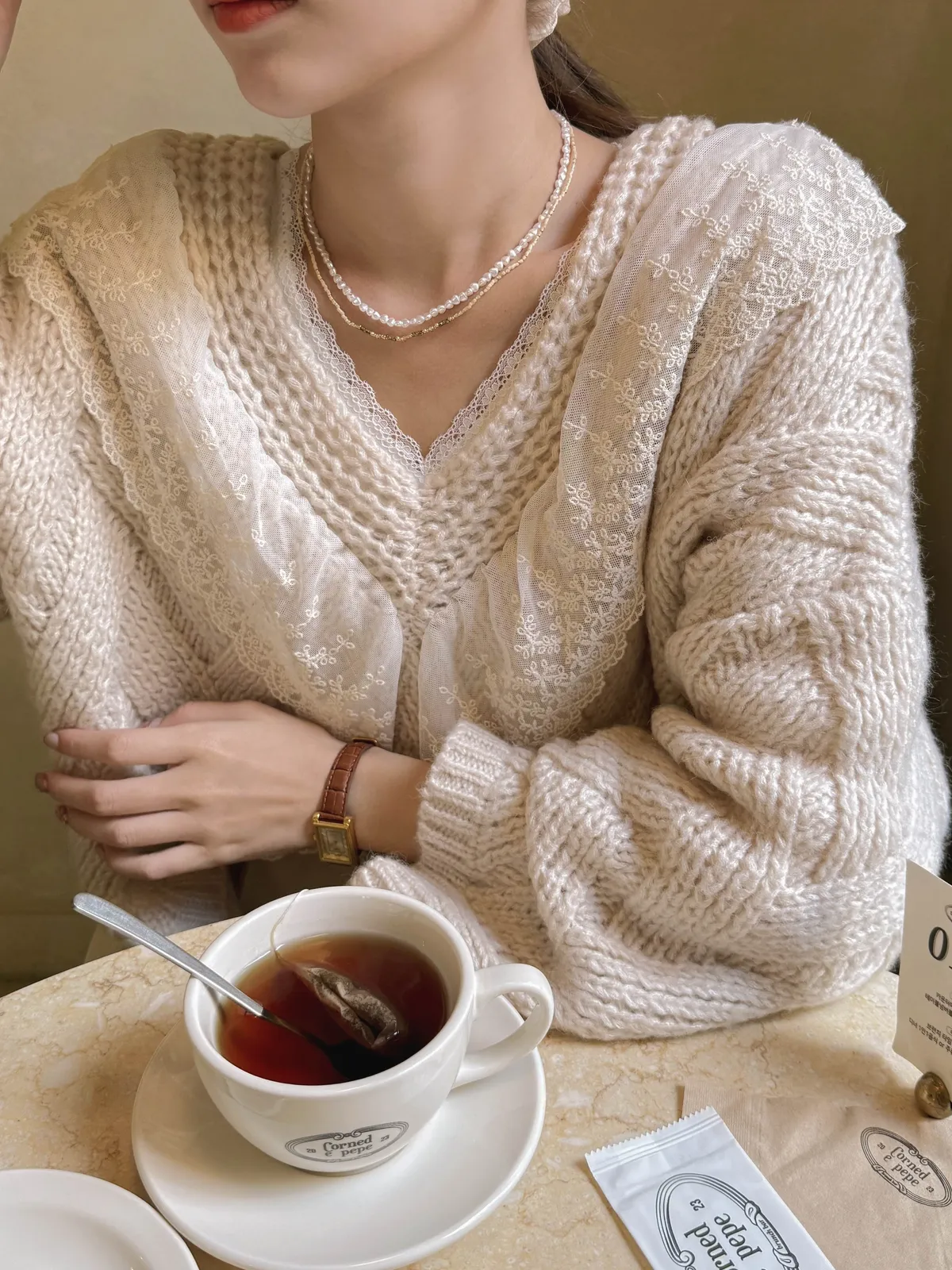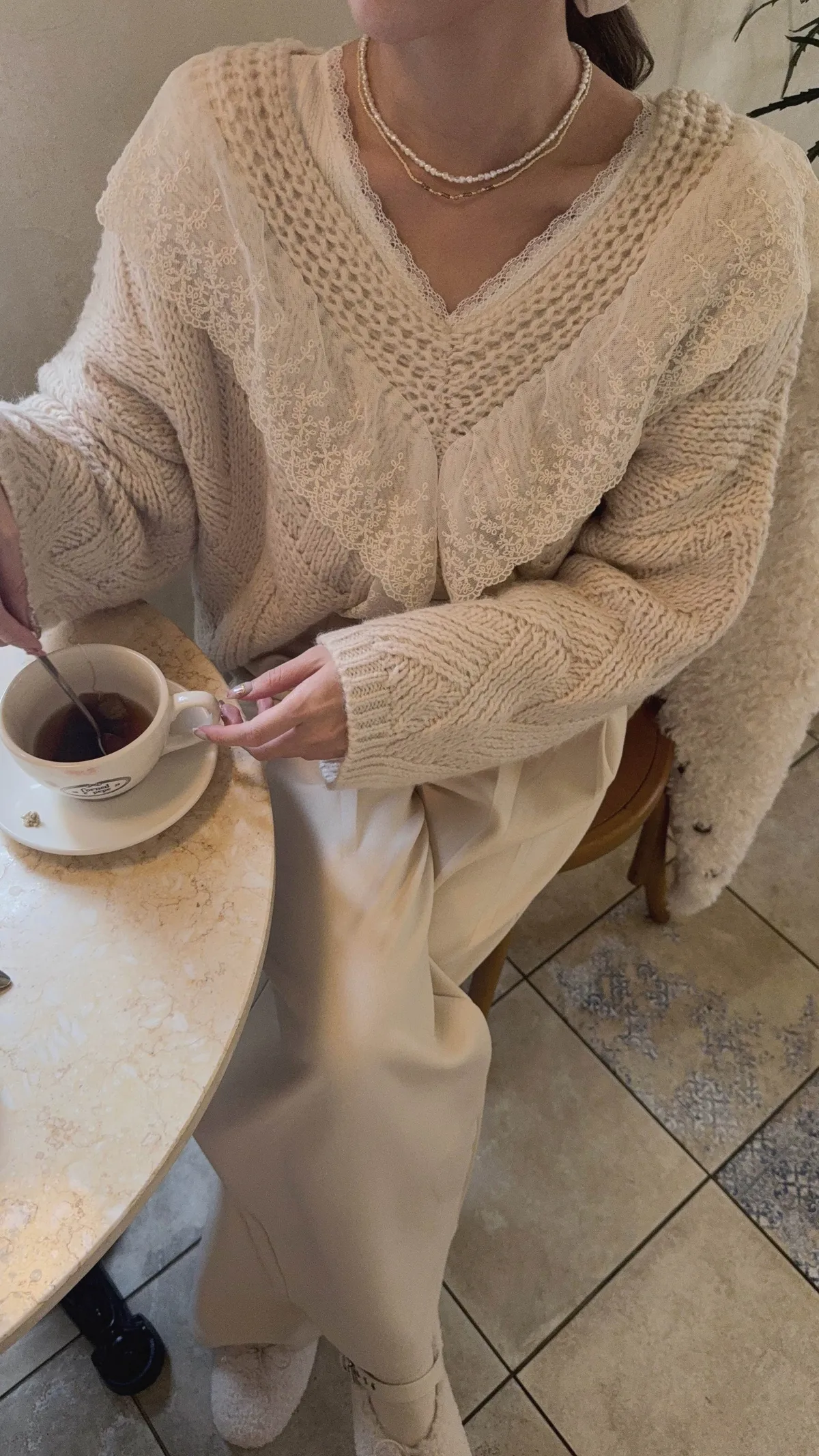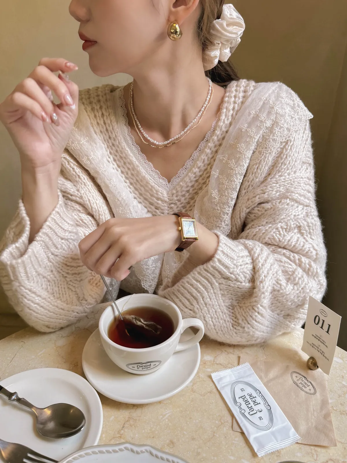 🇰🇷氣質公主麻花蕾絲拼接針織上衣---米