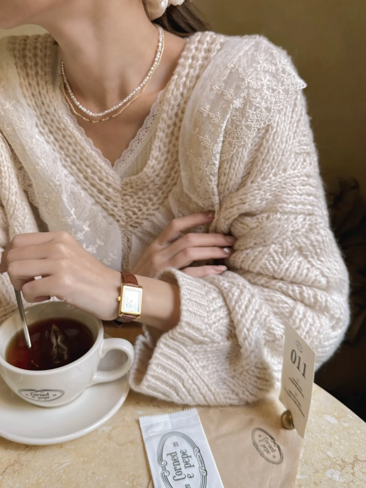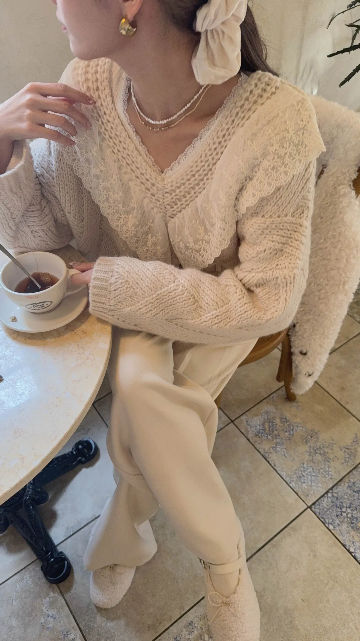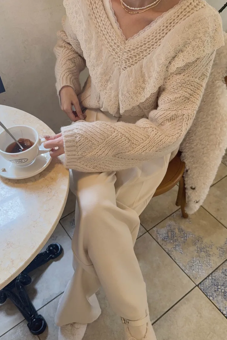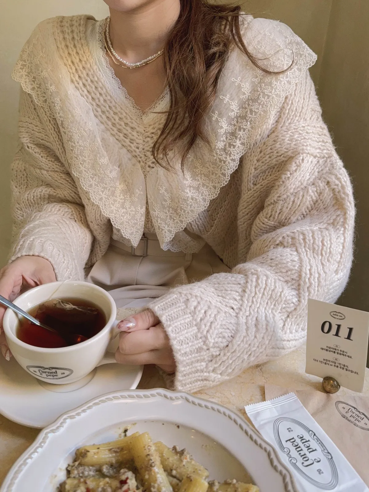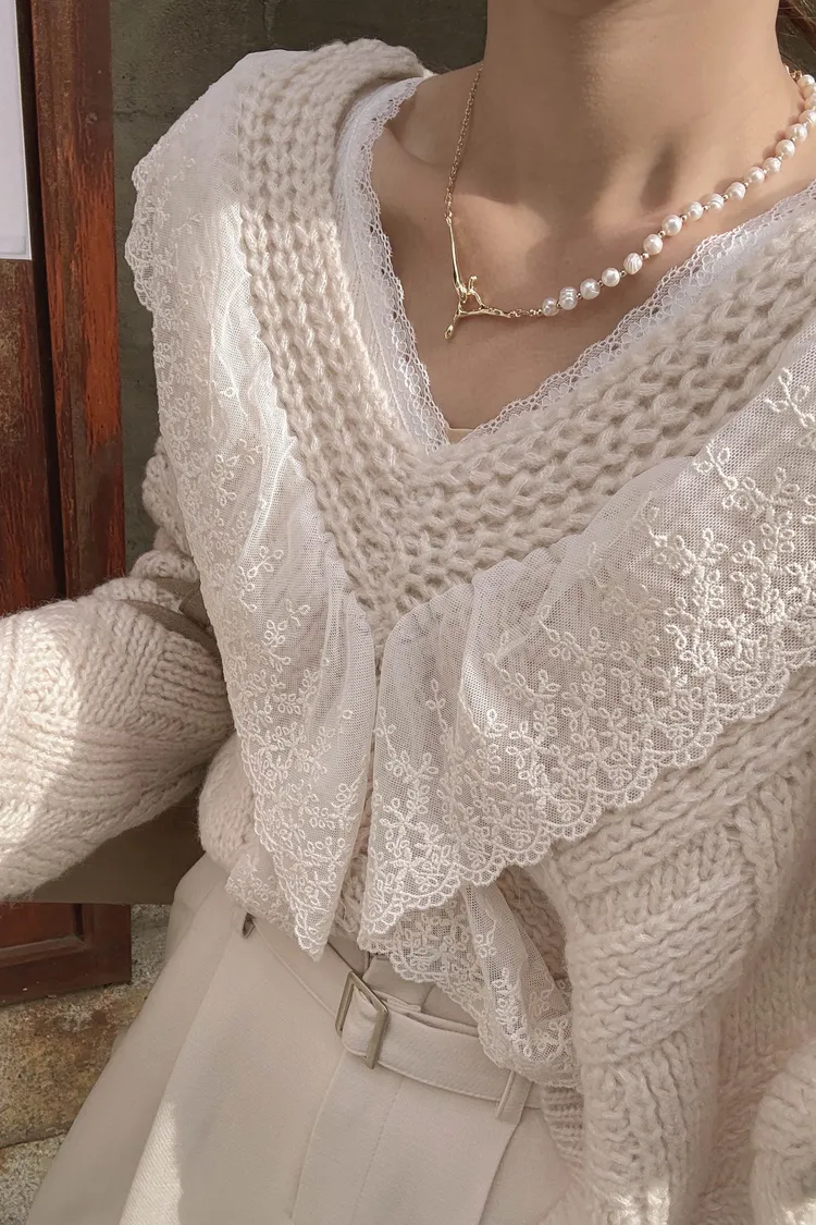 🇰🇷氣質公主麻花蕾絲拼接針織上衣---米
