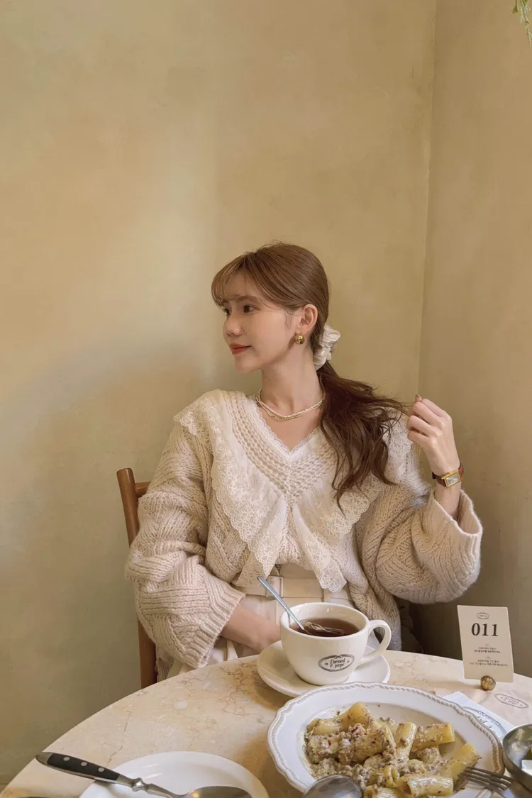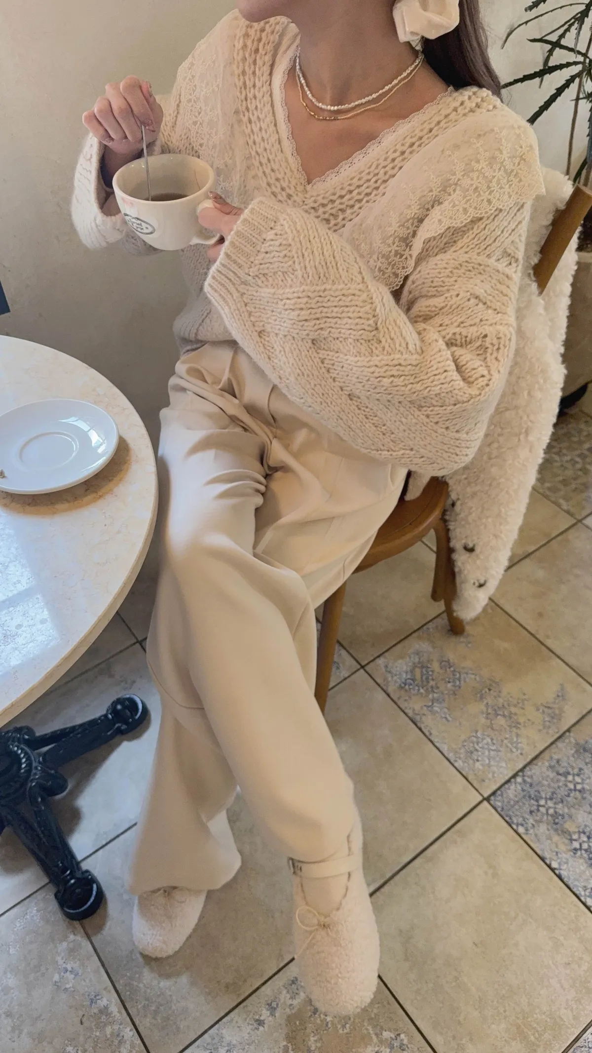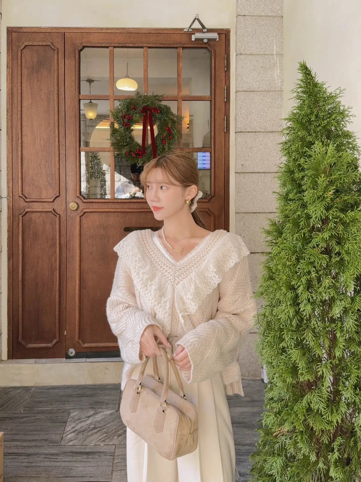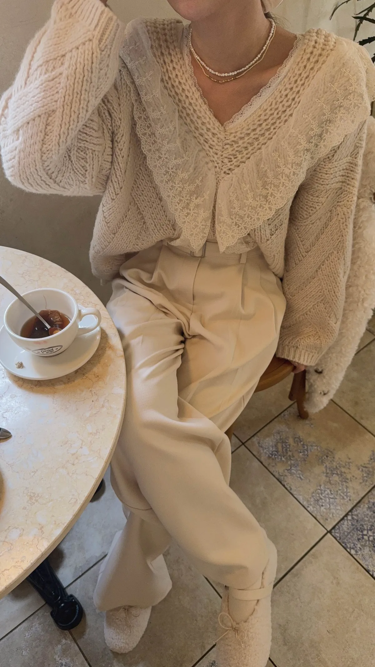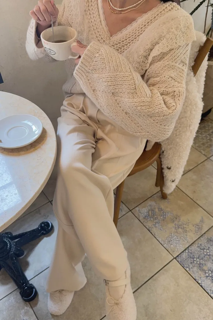 🇰🇷氣質公主麻花蕾絲拼接針織上衣---米