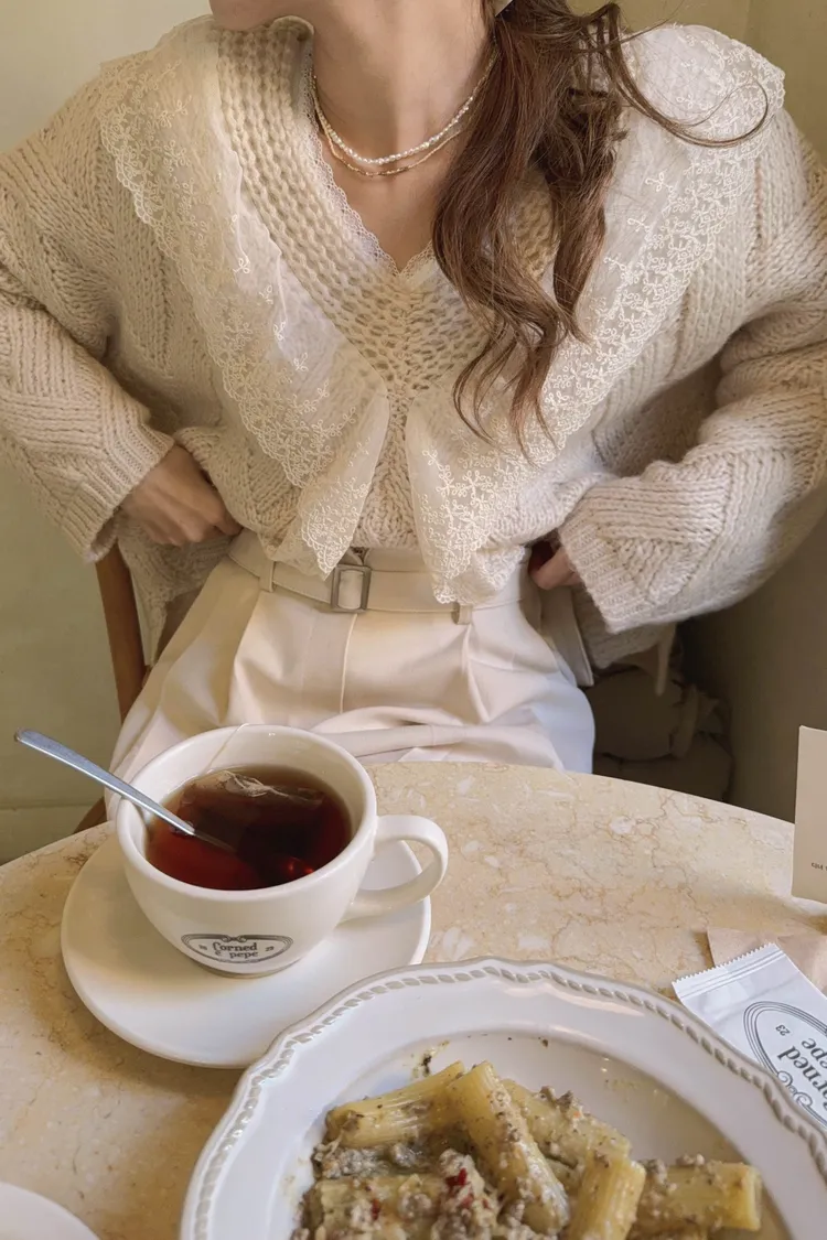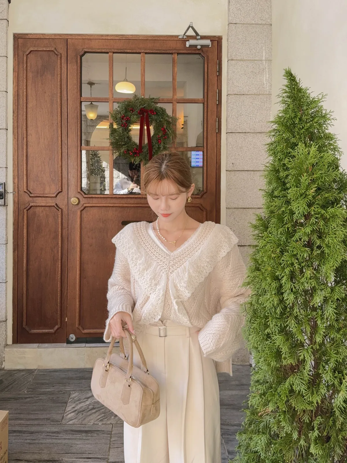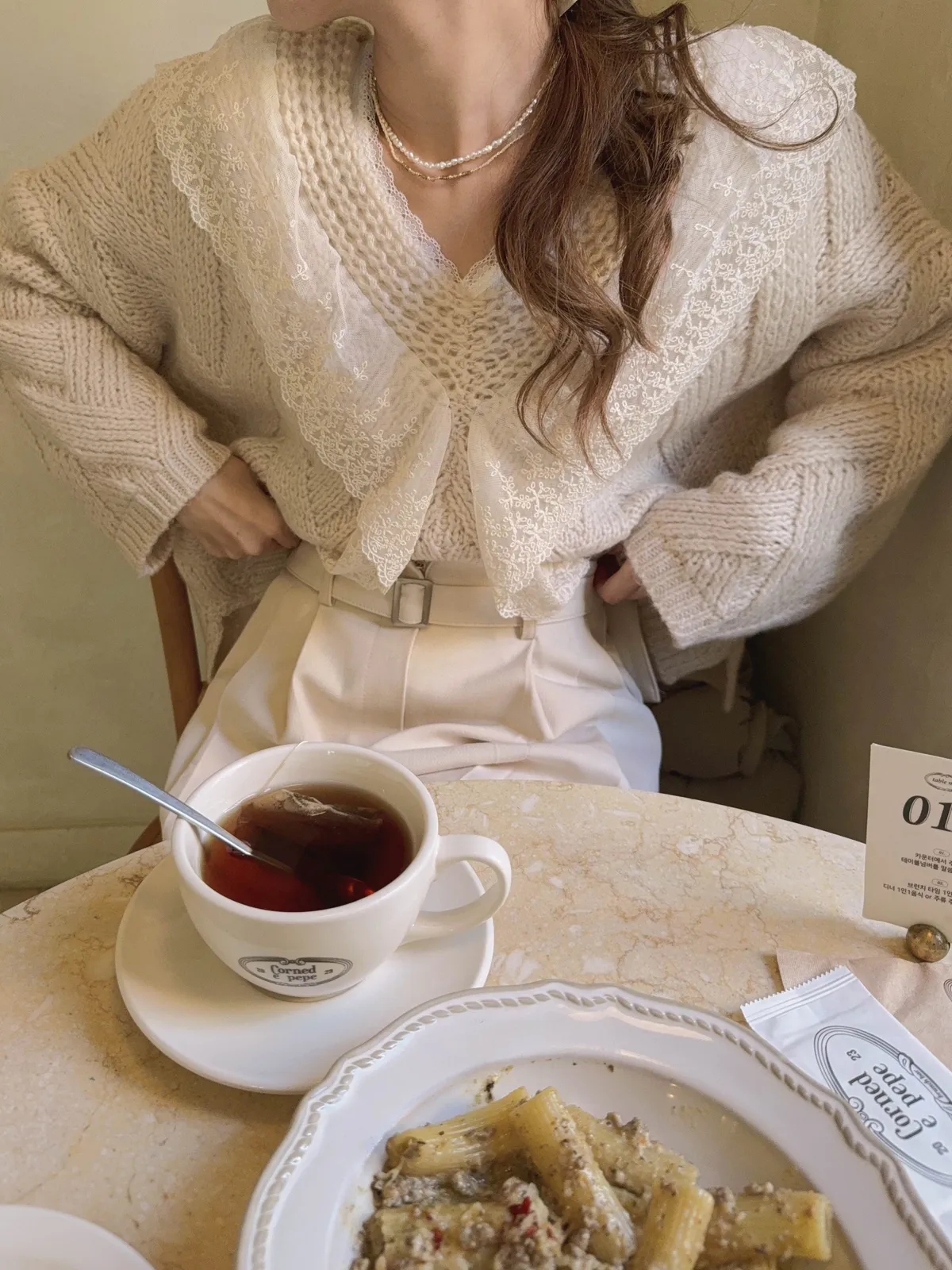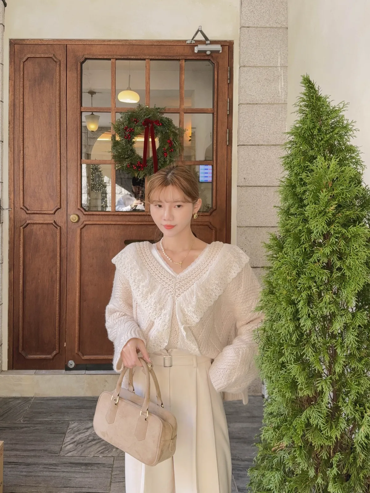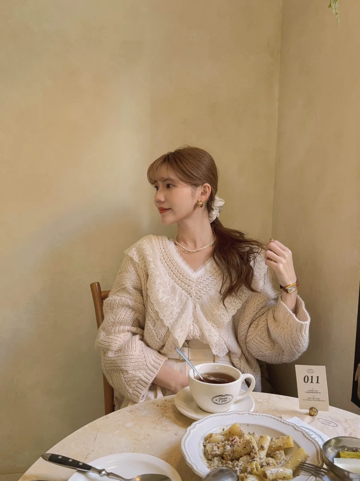 🇰🇷氣質公主麻花蕾絲拼接針織上衣---米