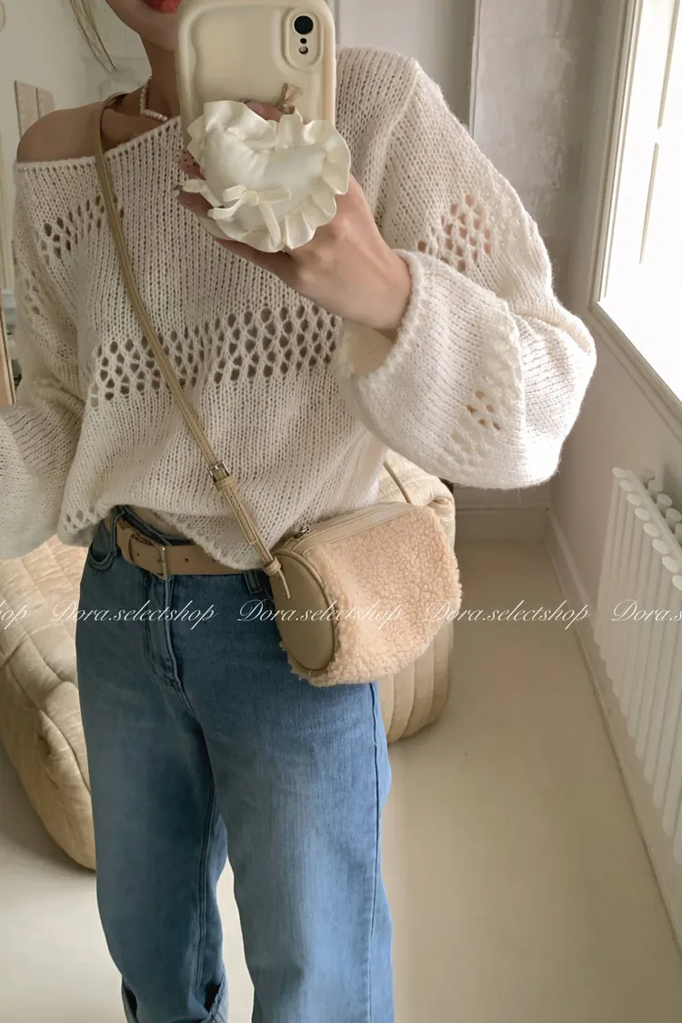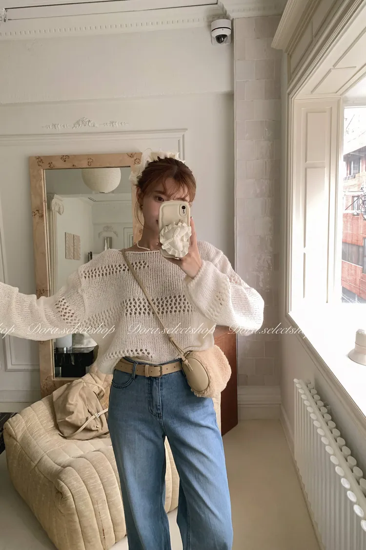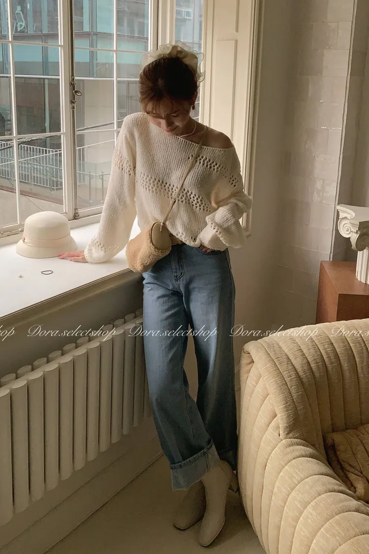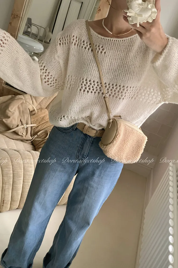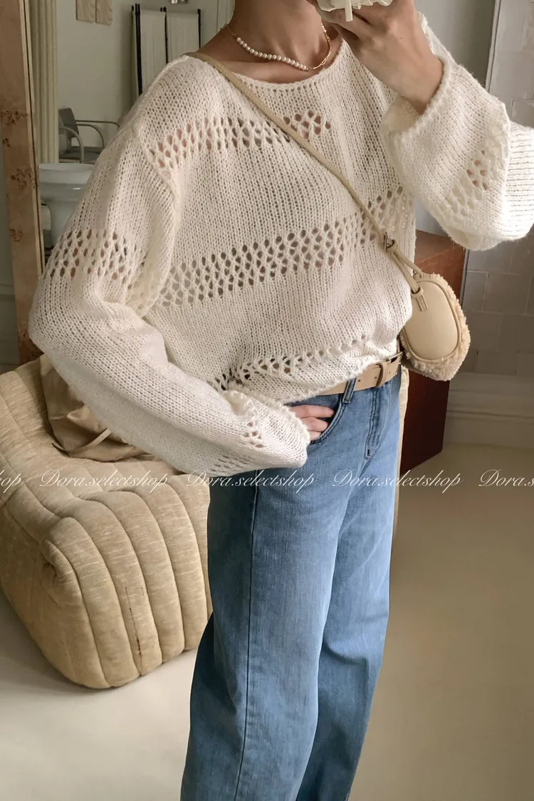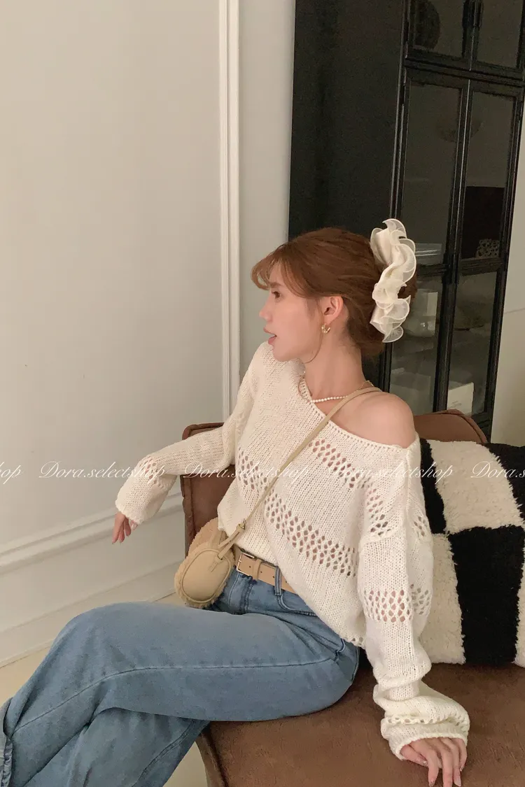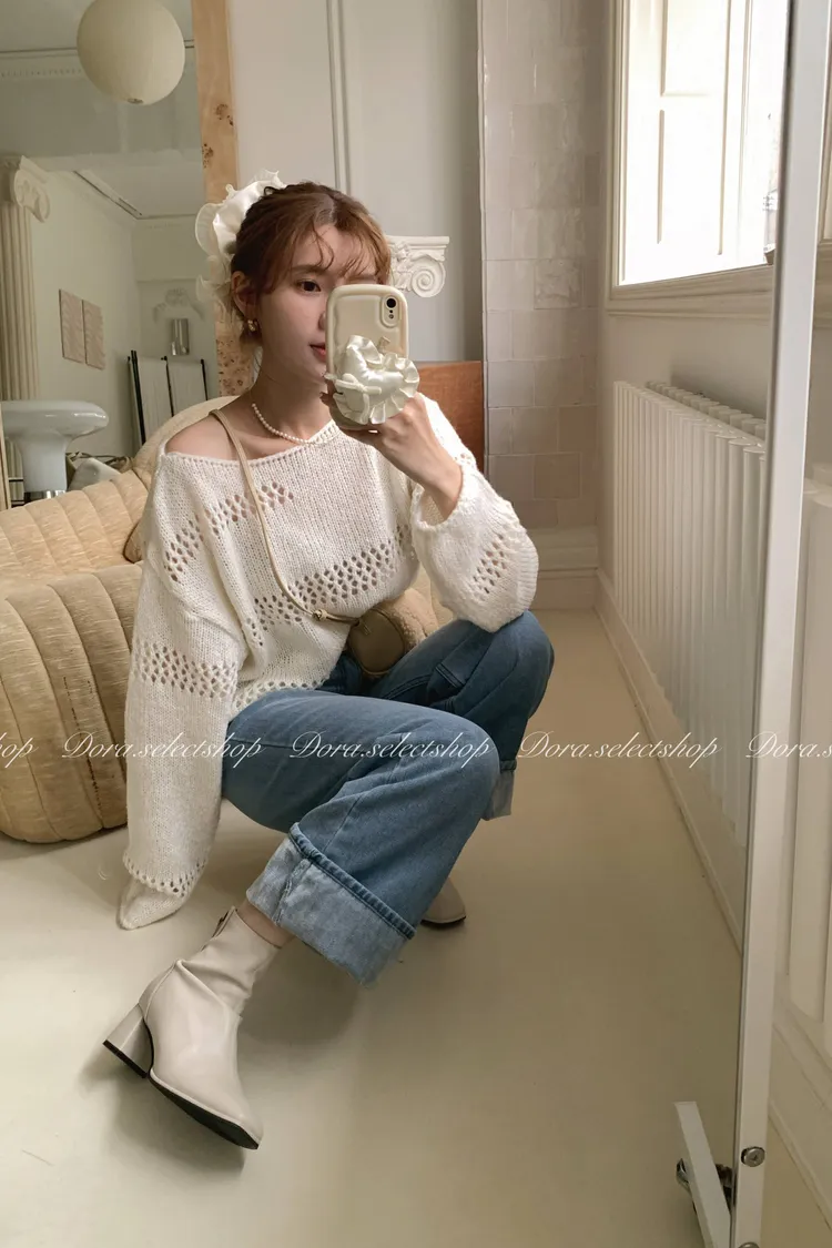 🇰🇷船領不規則簍空寬鬆短版針織上衣---白