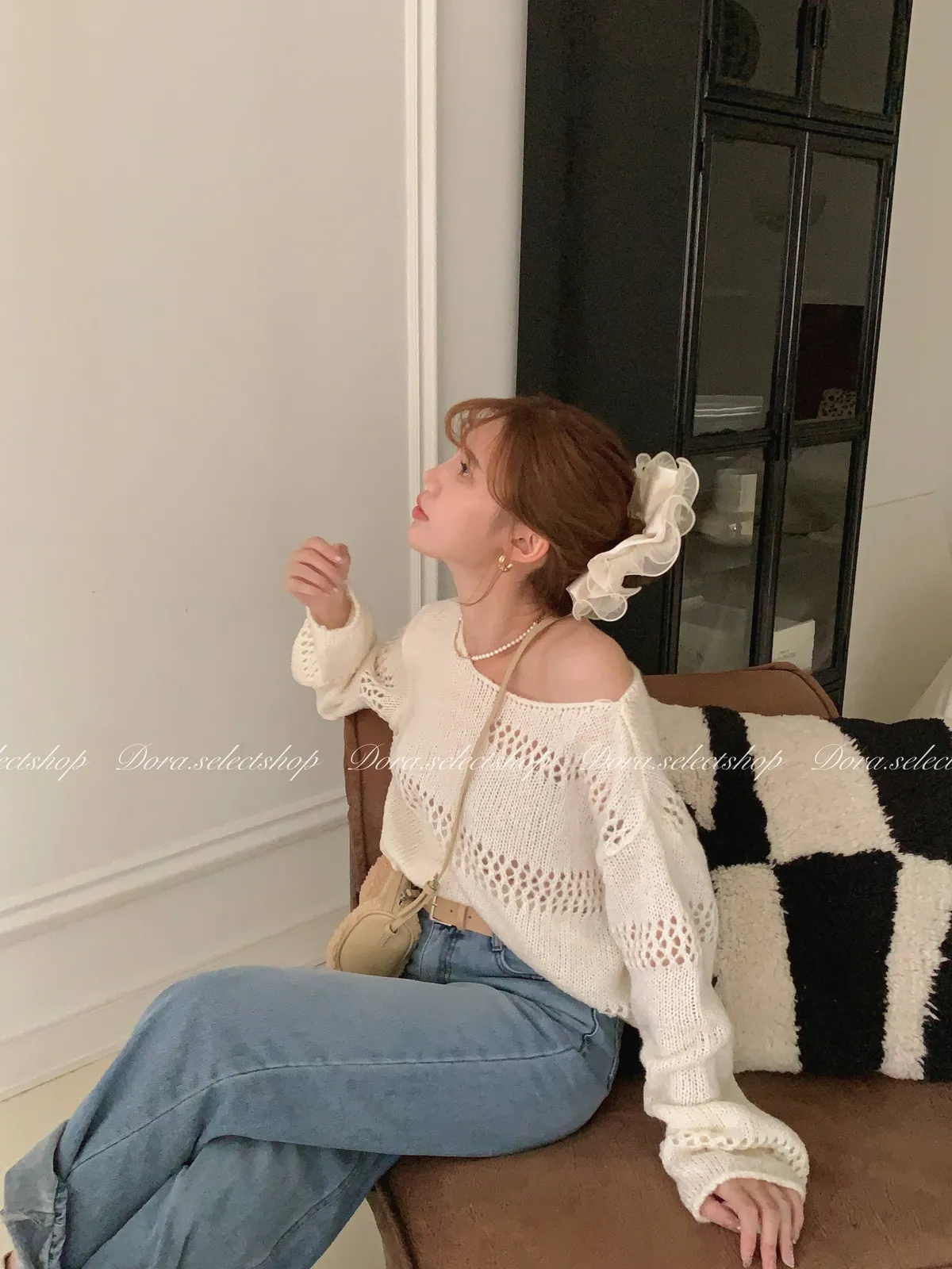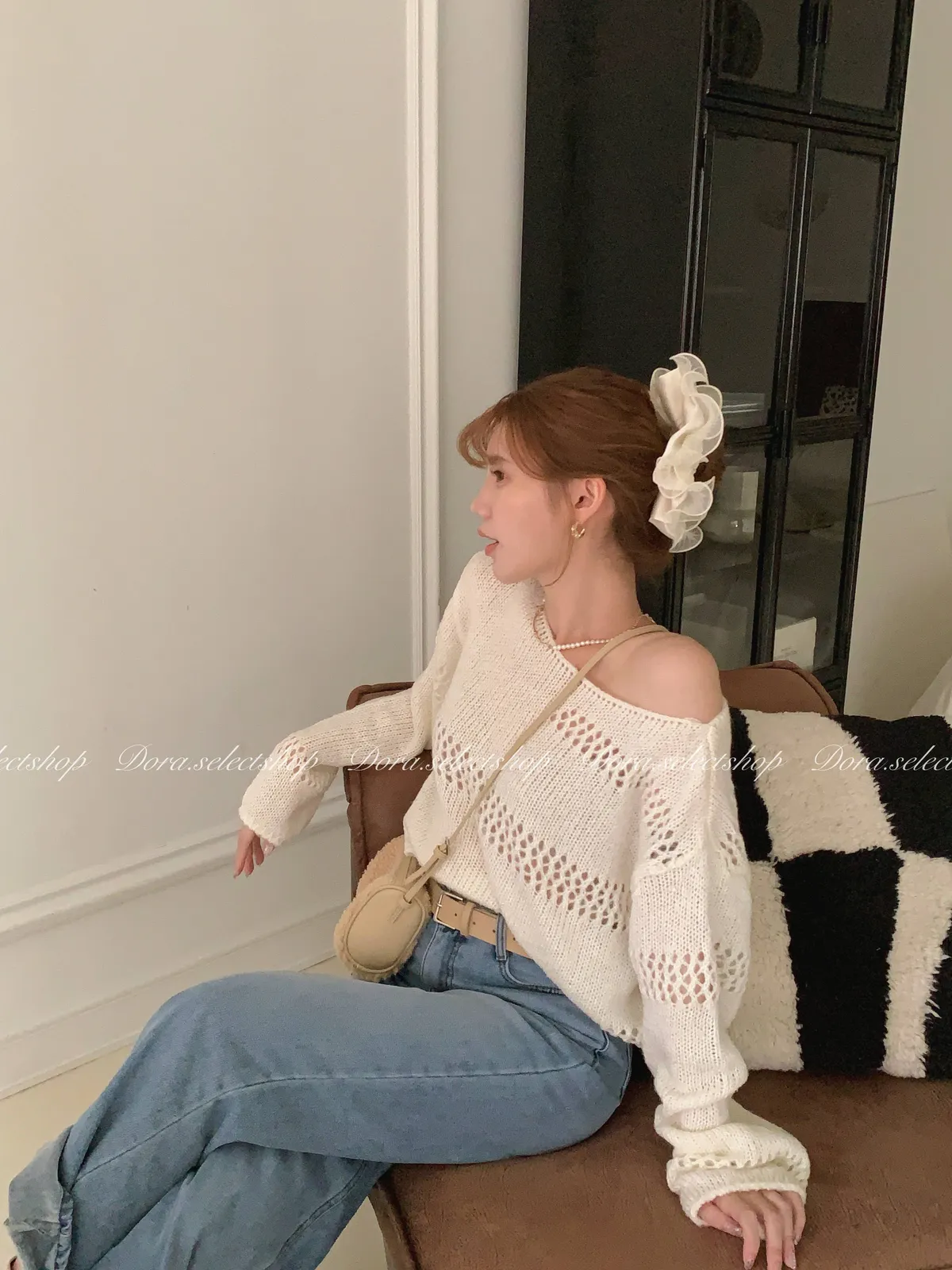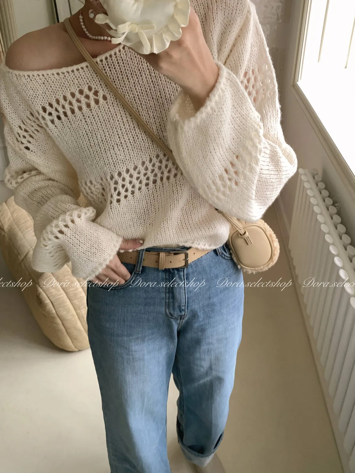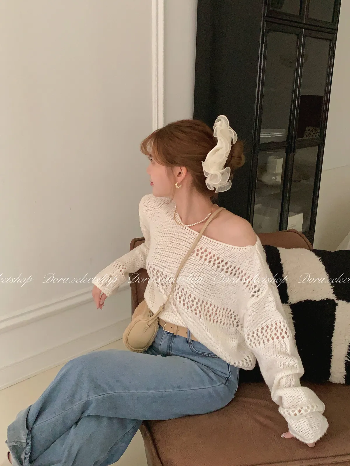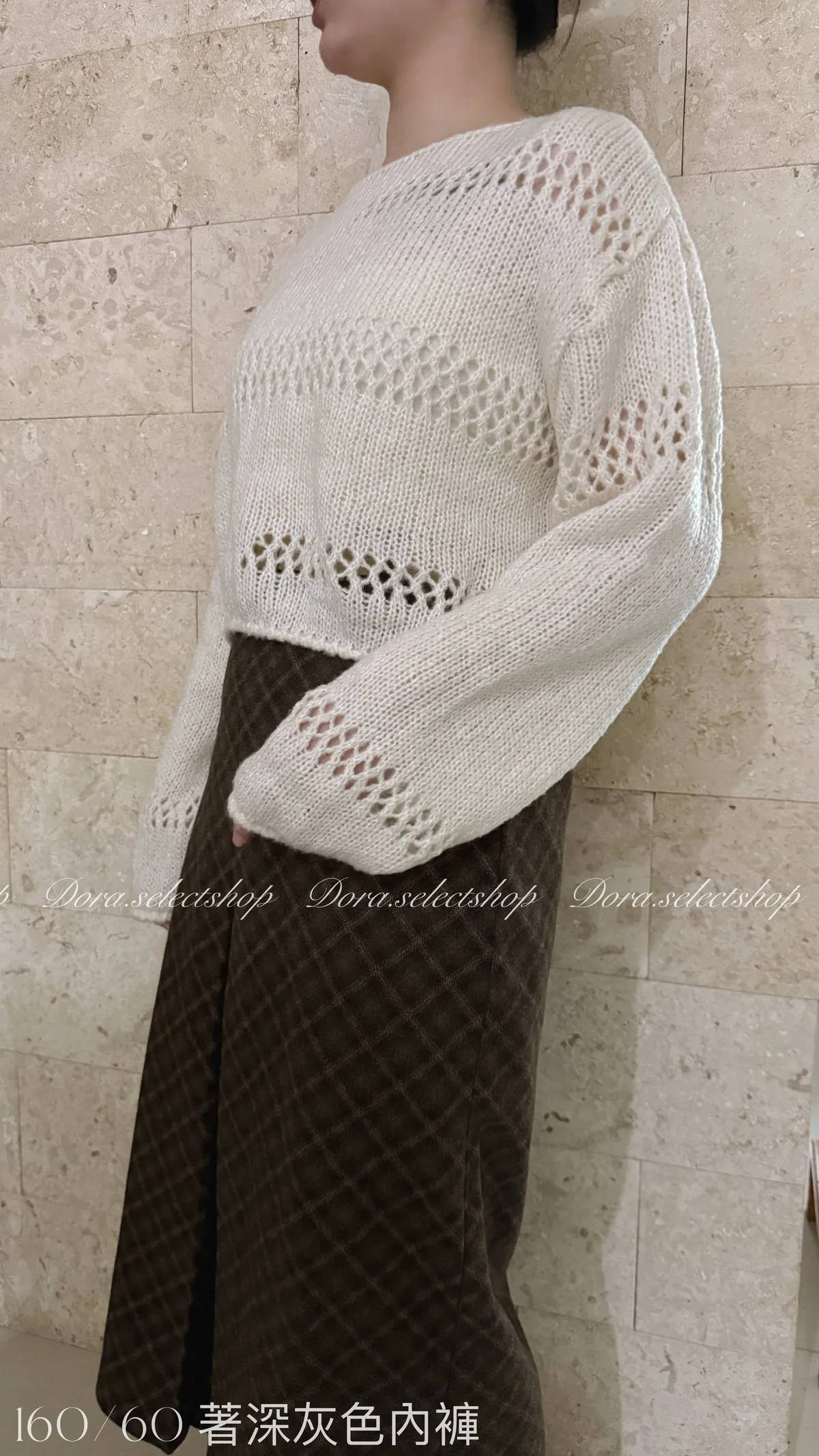🇰🇷船領不規則簍空寬鬆短版針織上衣---白