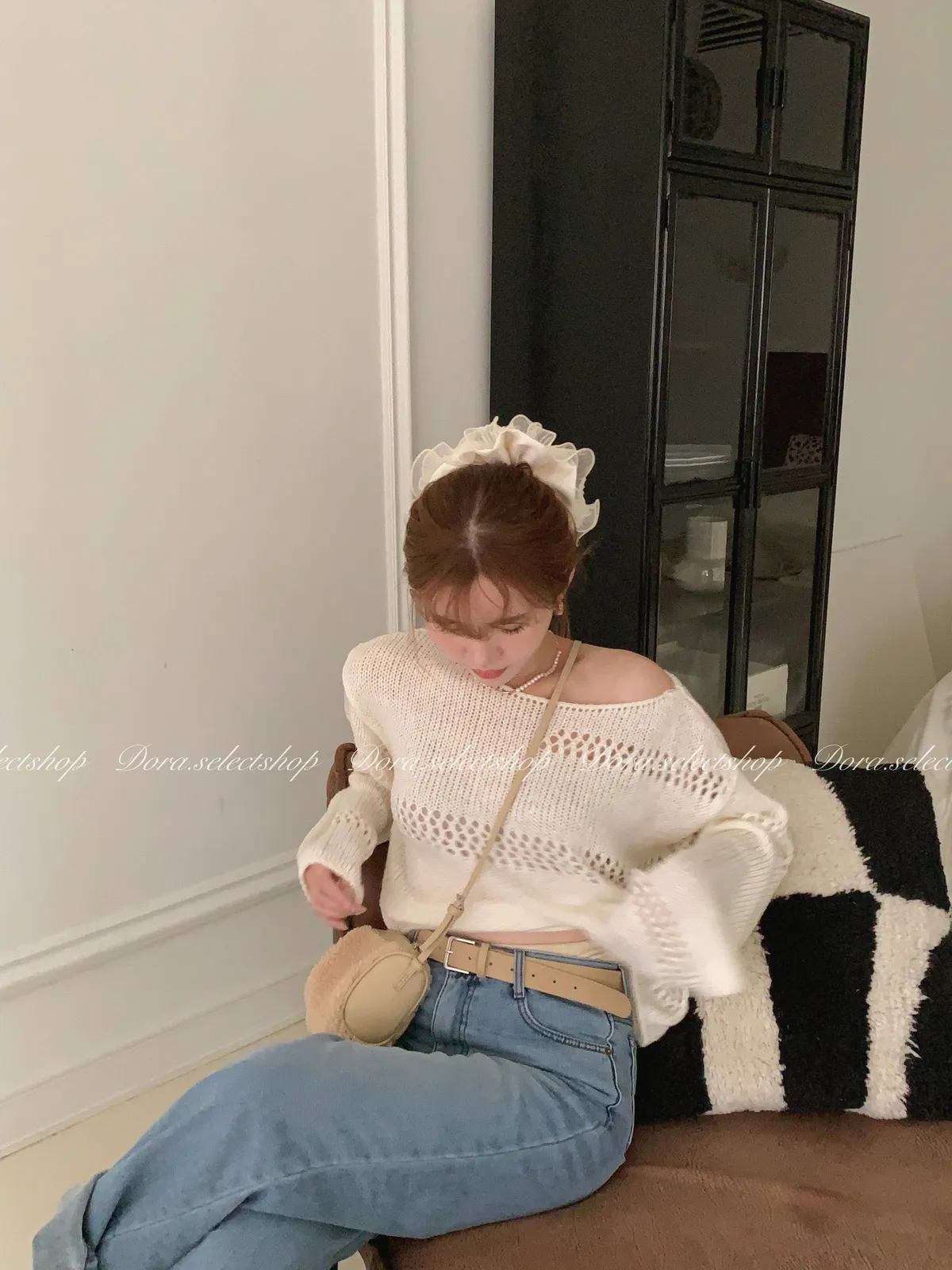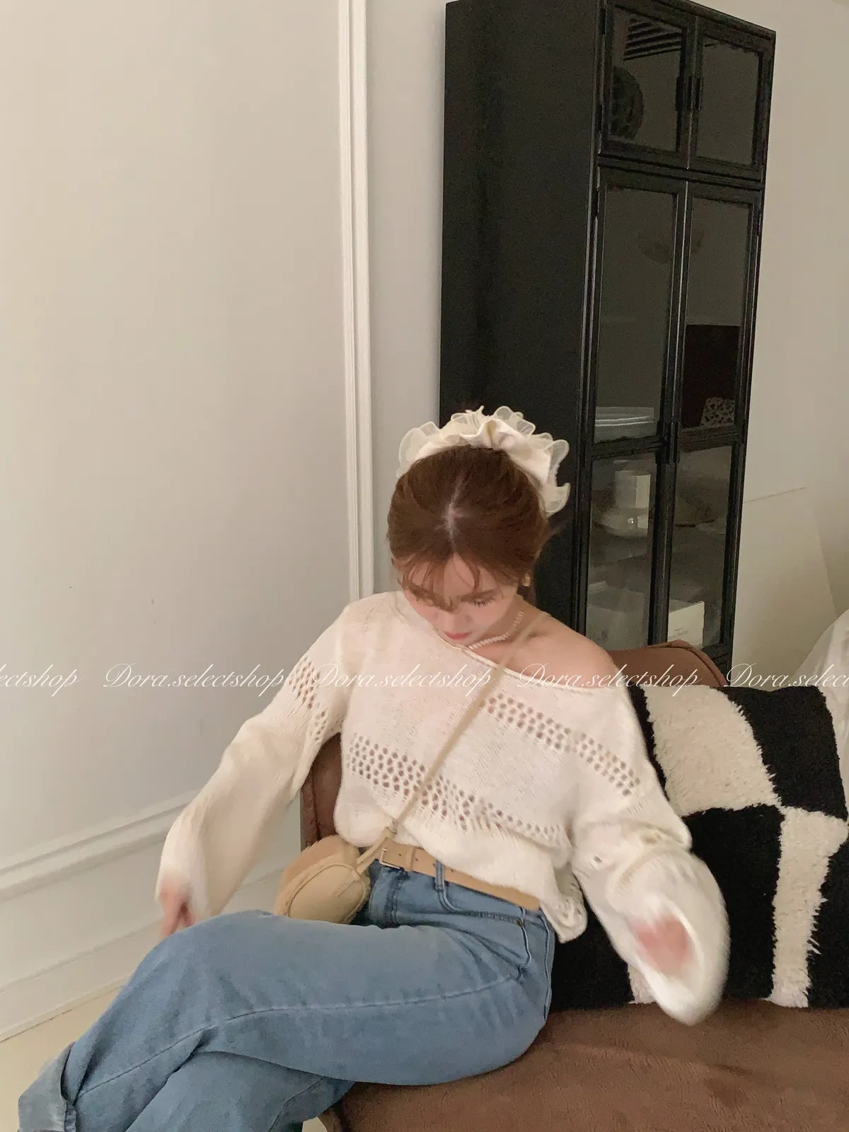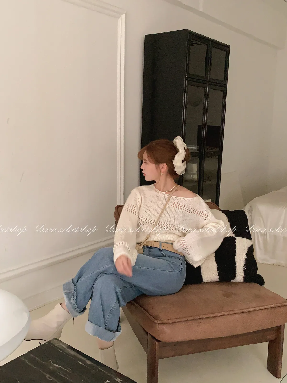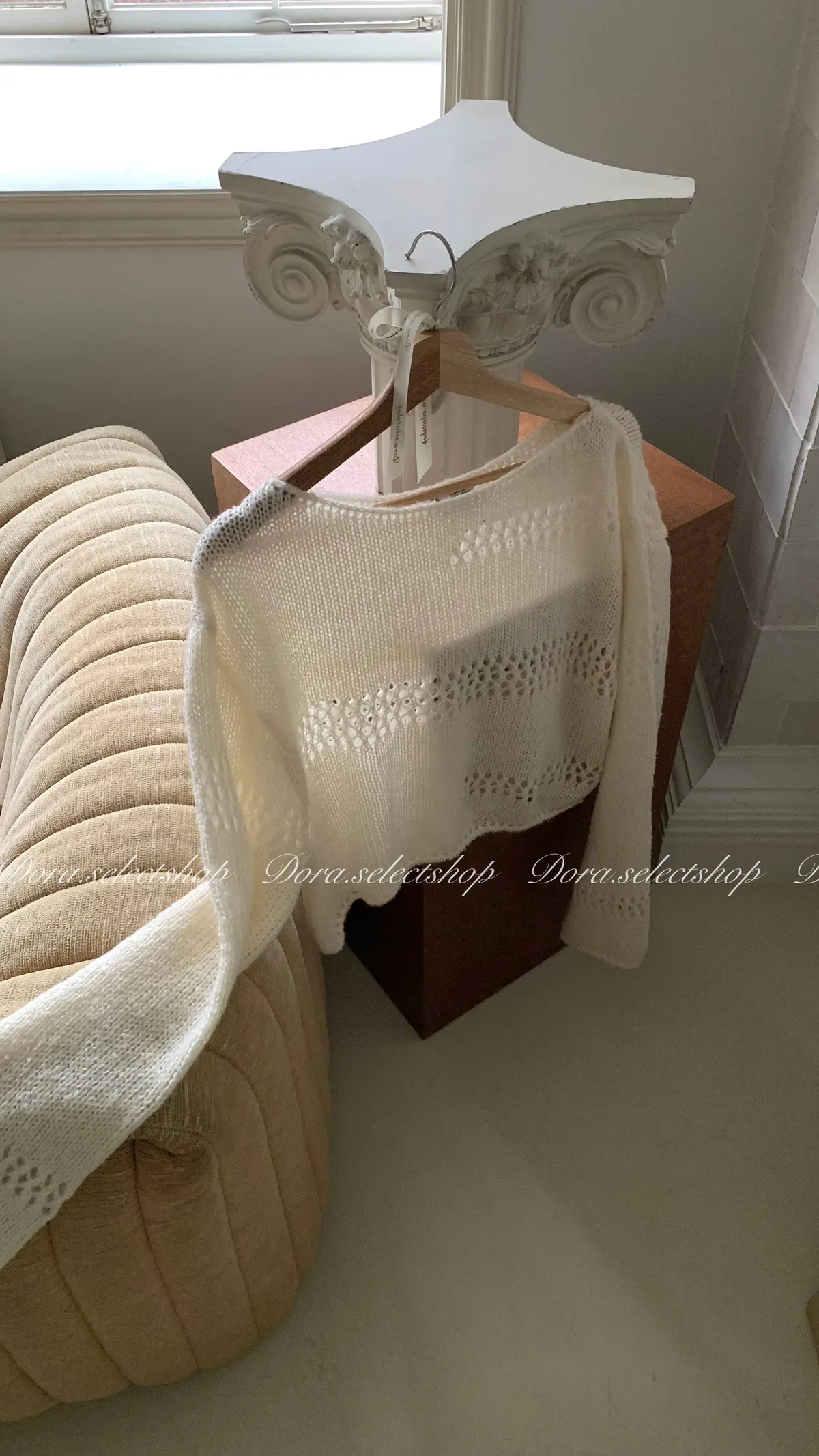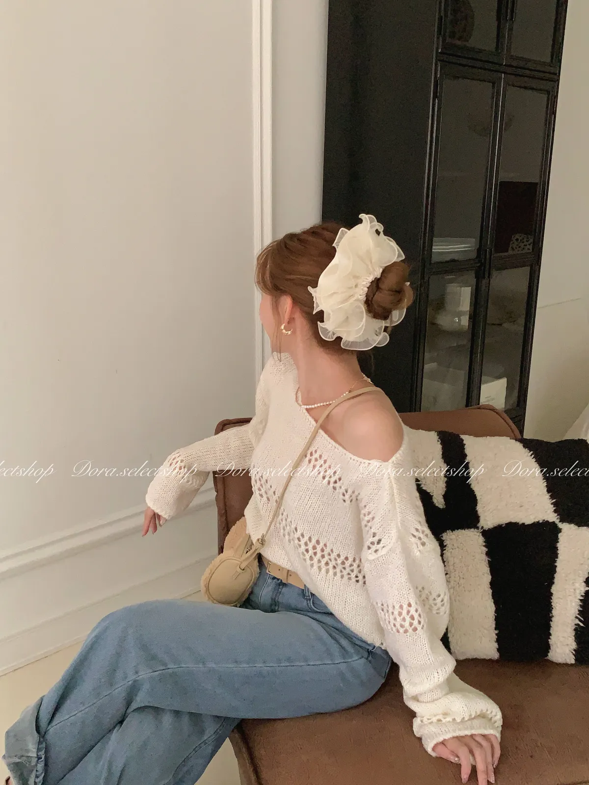 🇰🇷船領不規則簍空寬鬆短版針織上衣---白