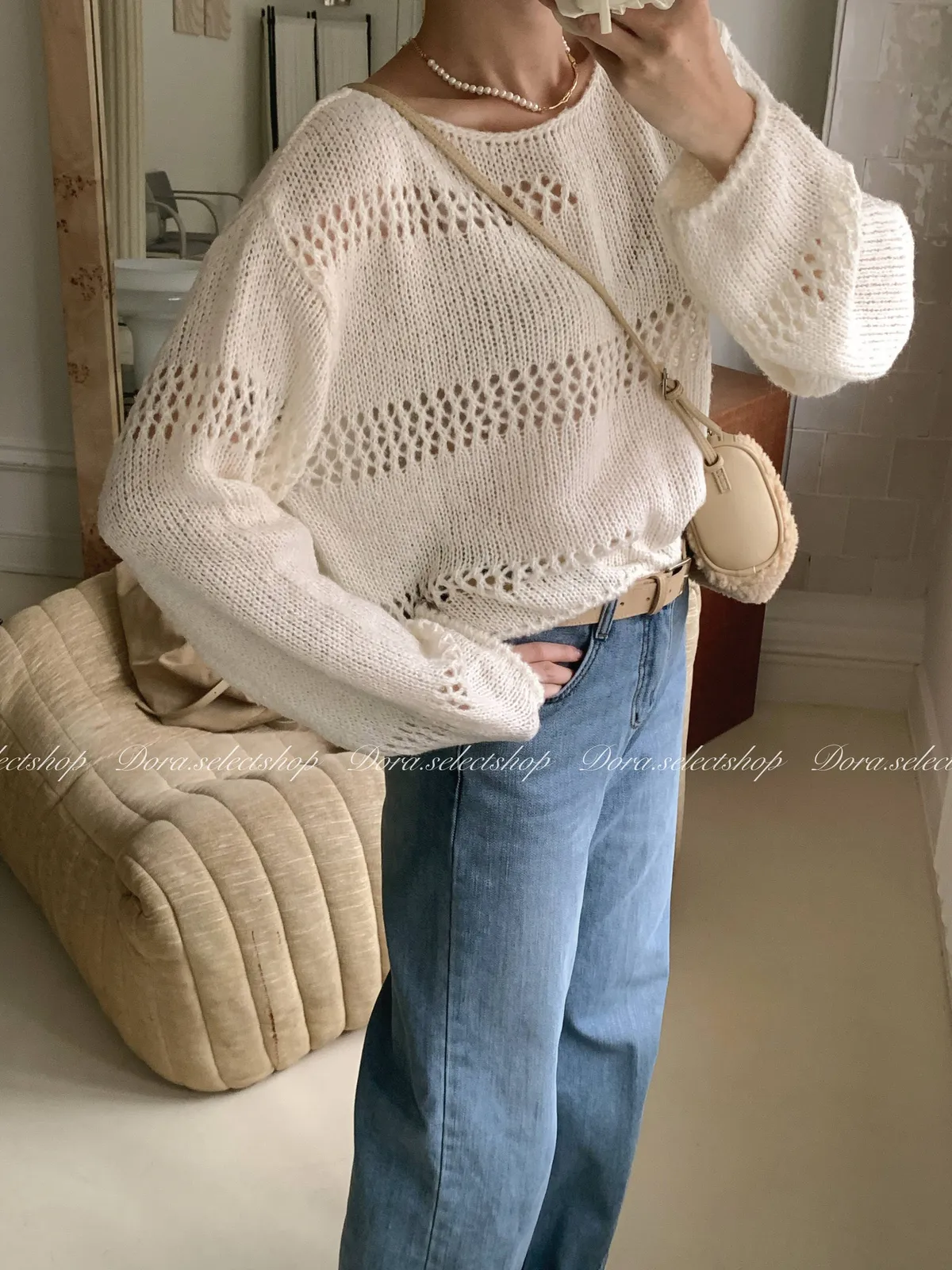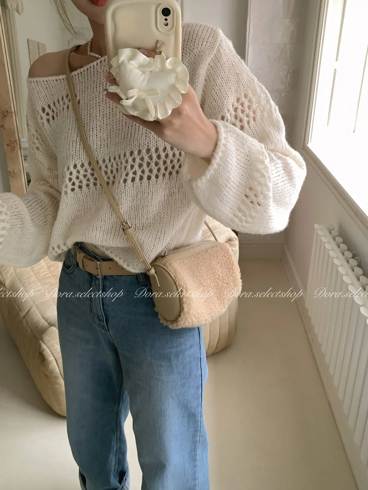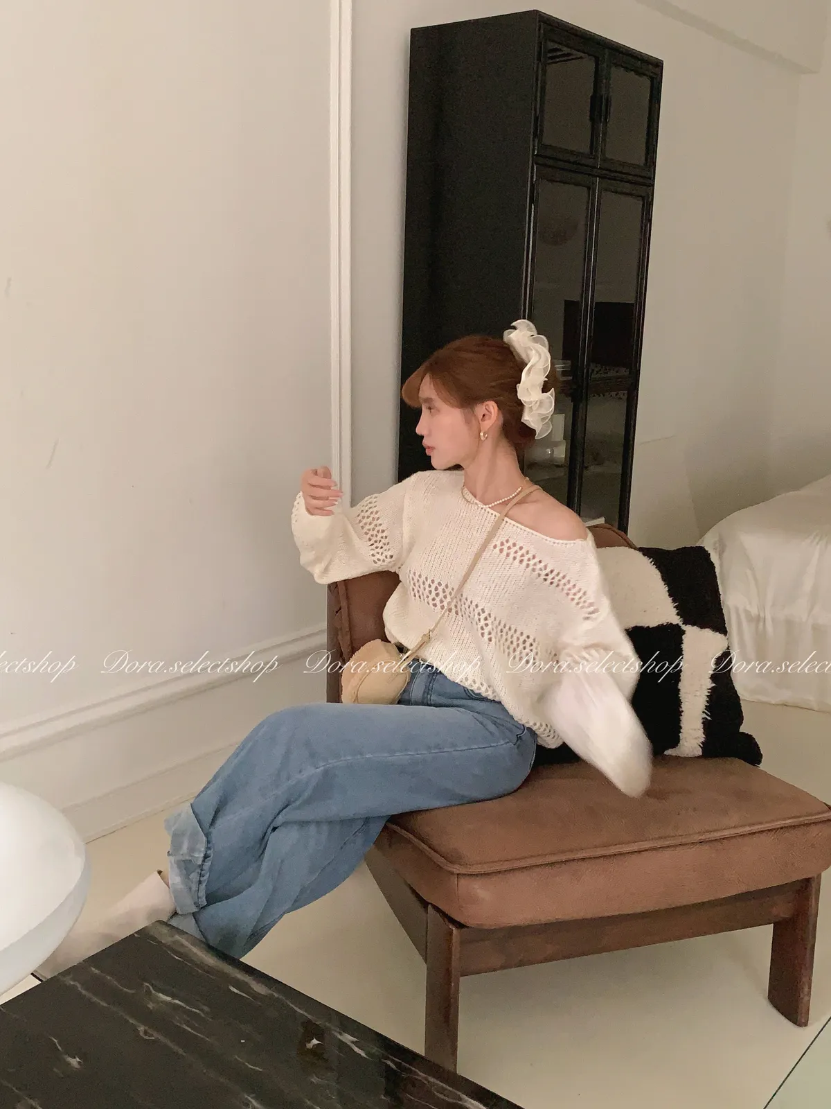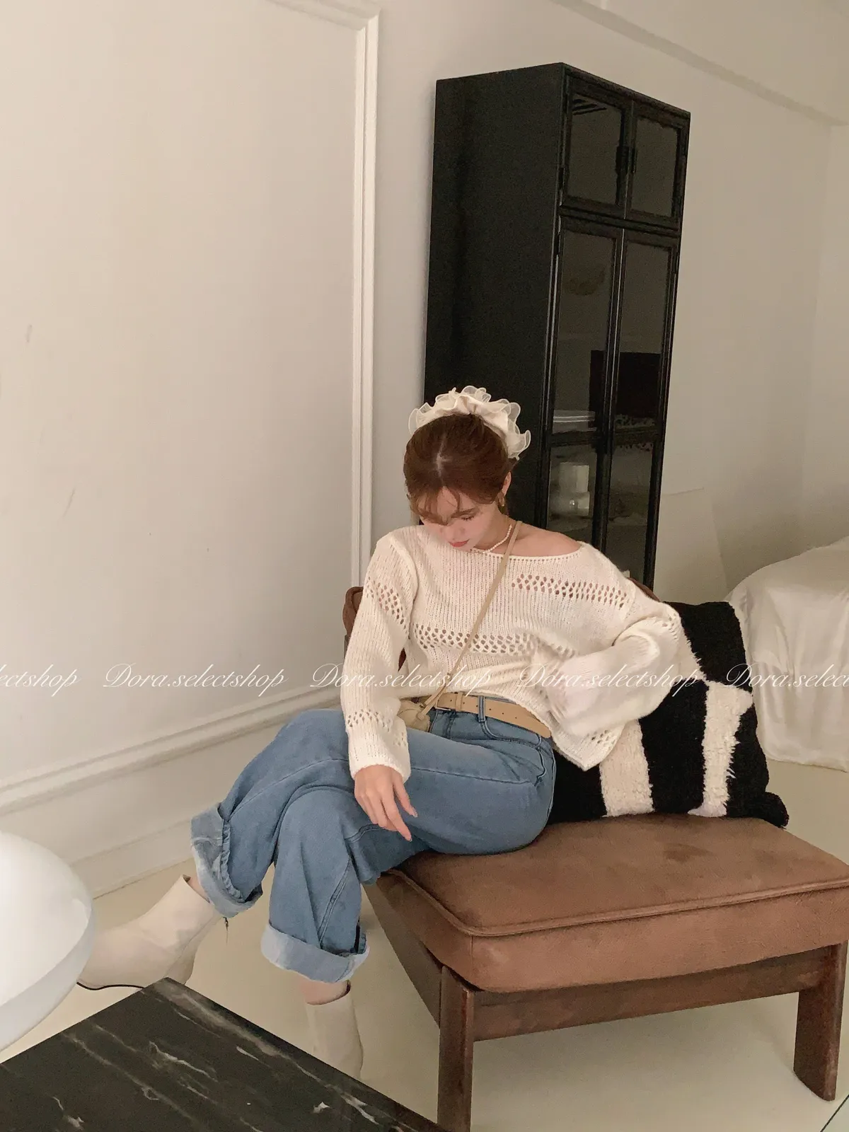 🇰🇷船領不規則簍空寬鬆短版針織上衣---白