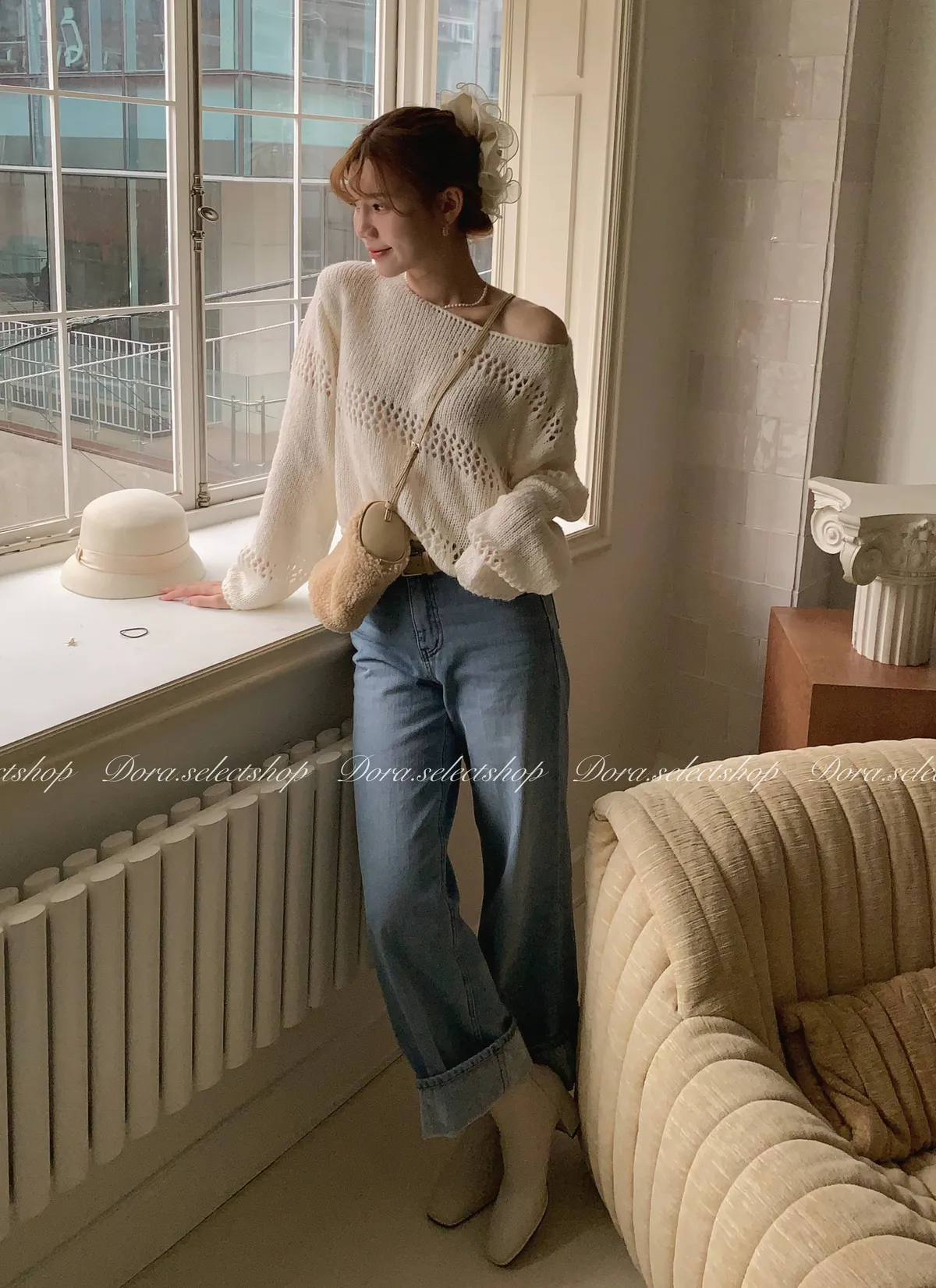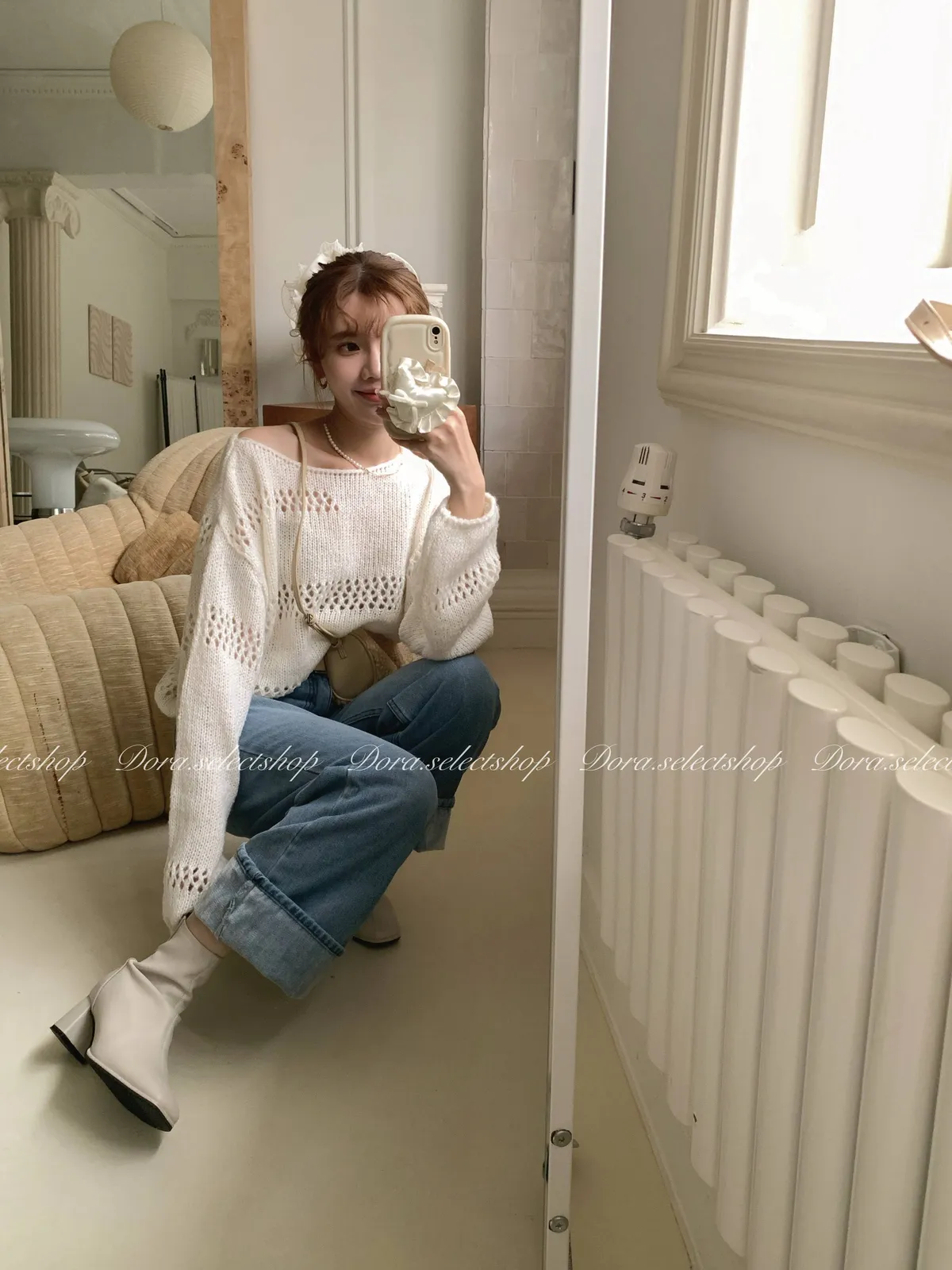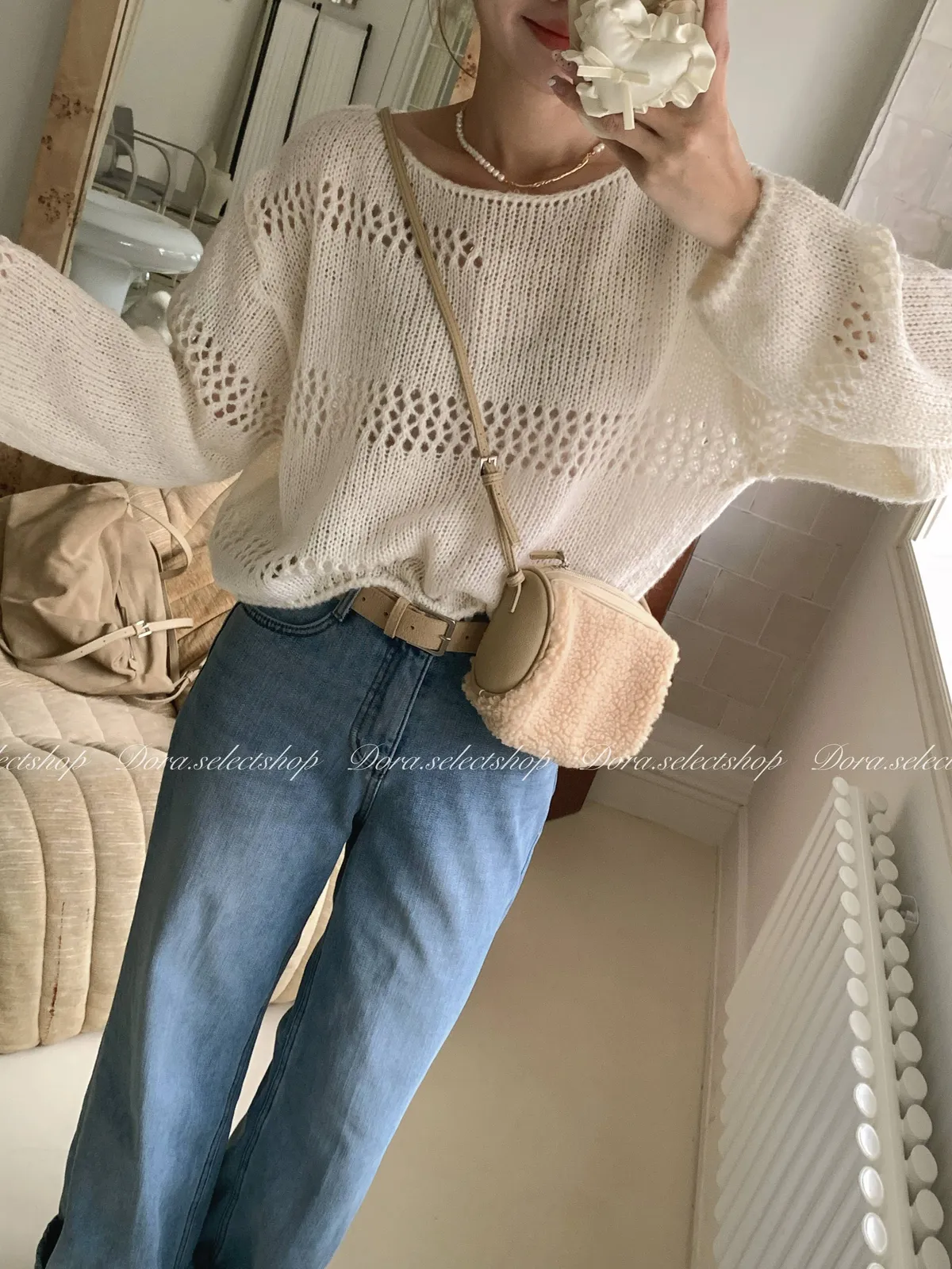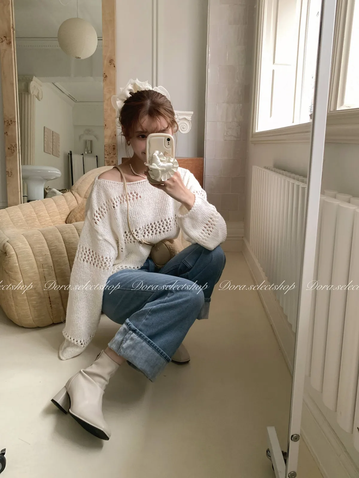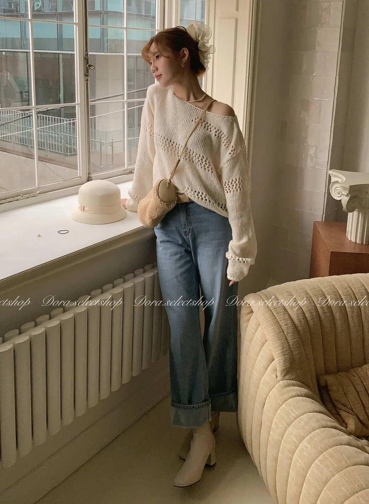 🇰🇷船領不規則簍空寬鬆短版針織上衣---白