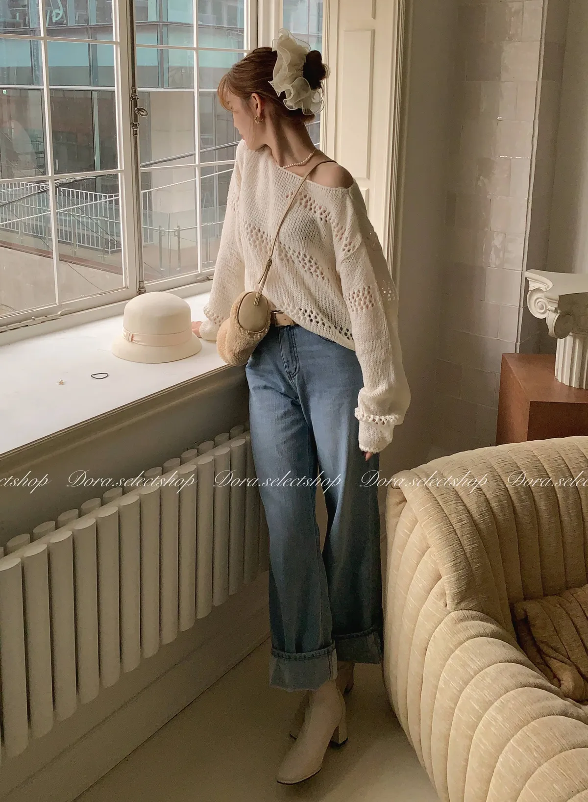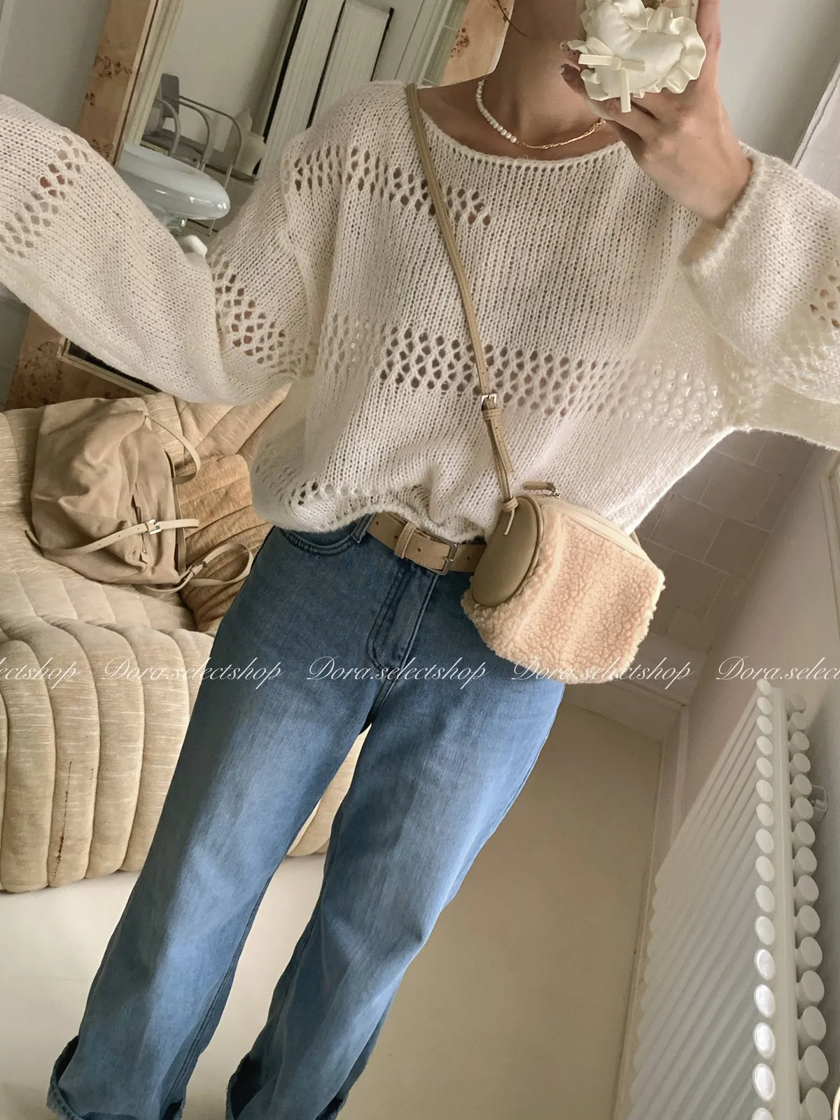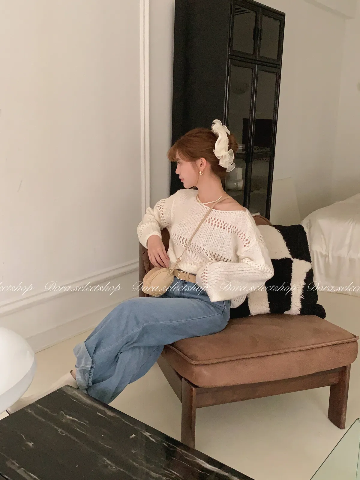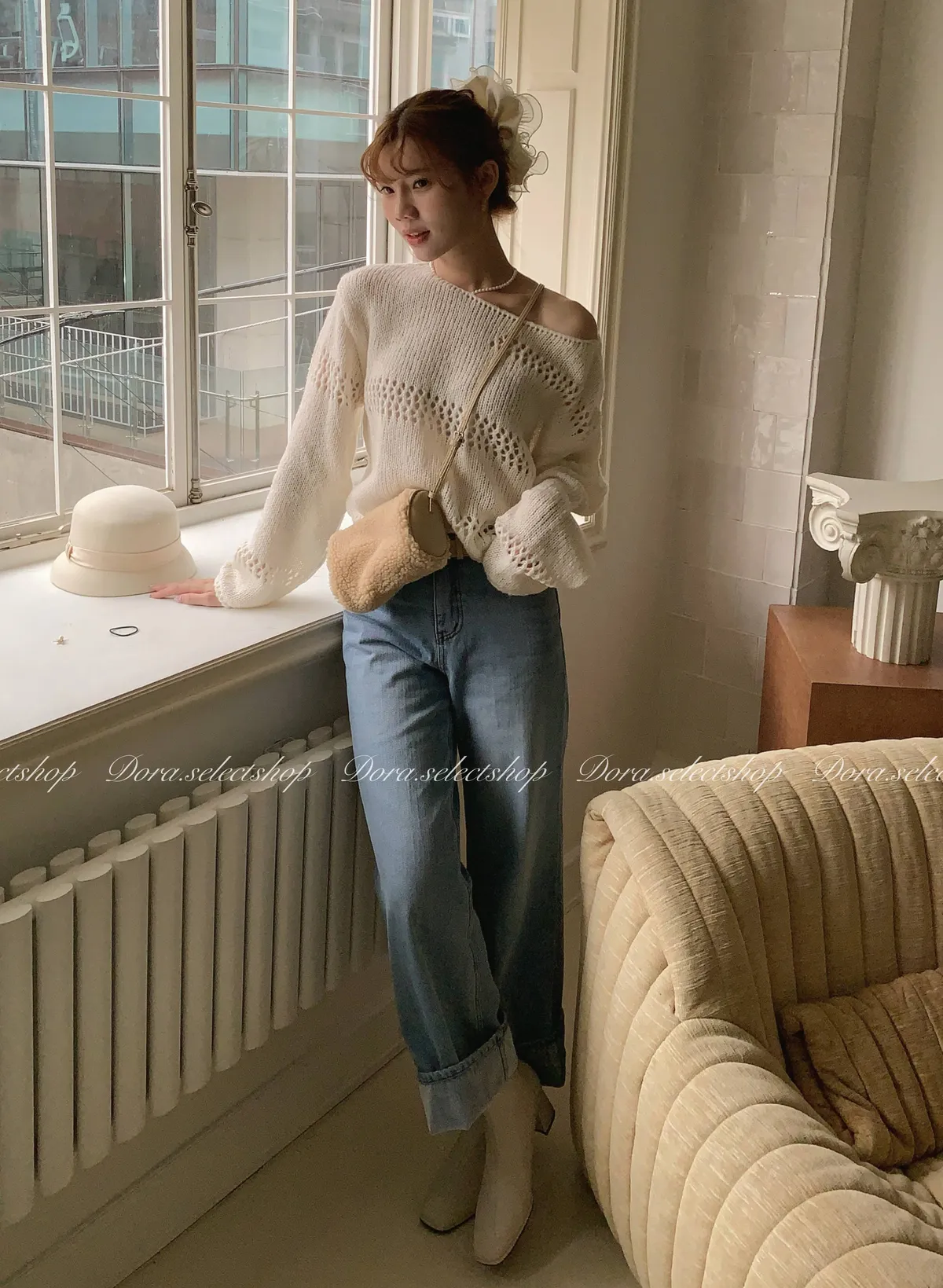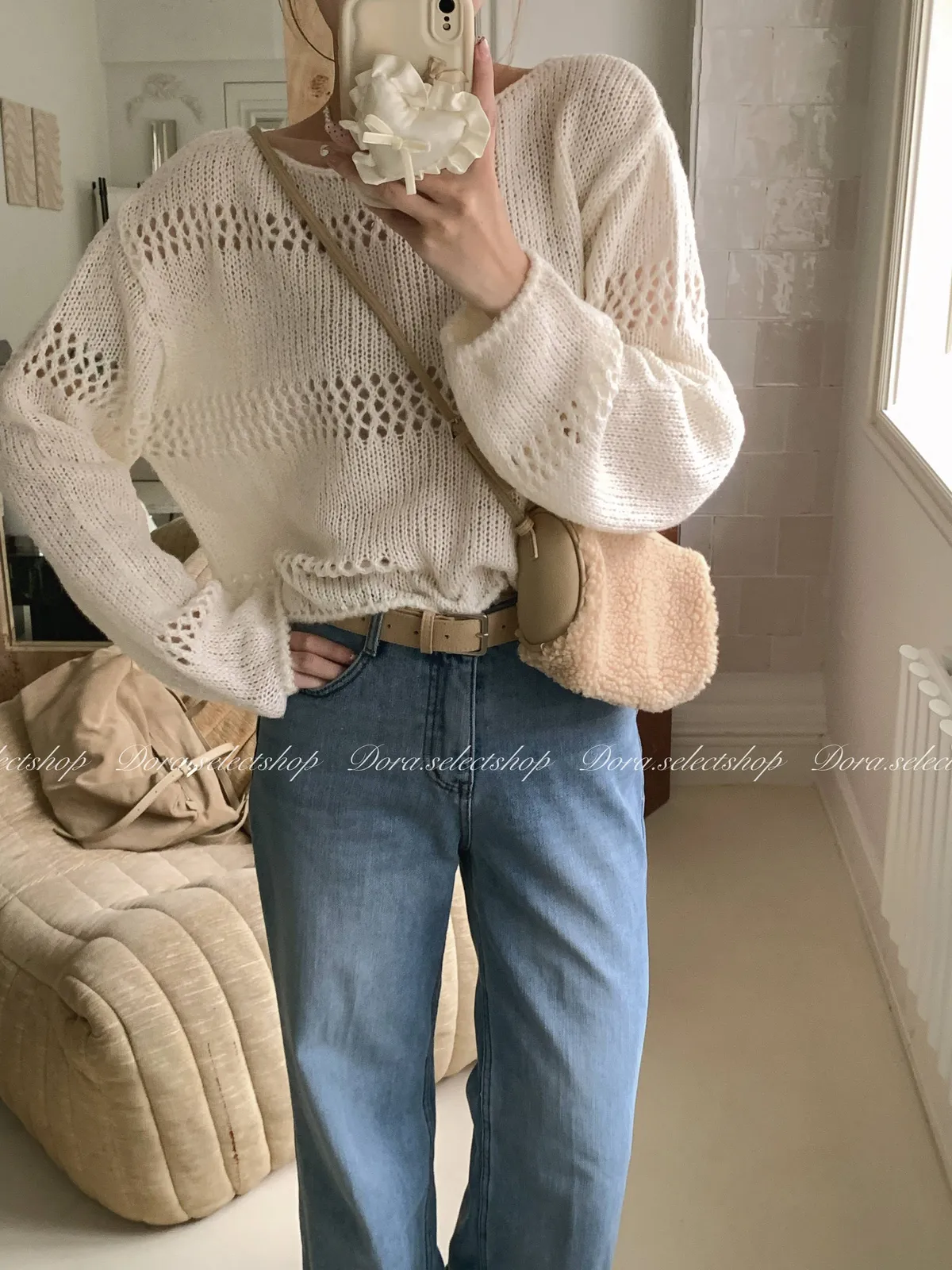 🇰🇷船領不規則簍空寬鬆短版針織上衣---白