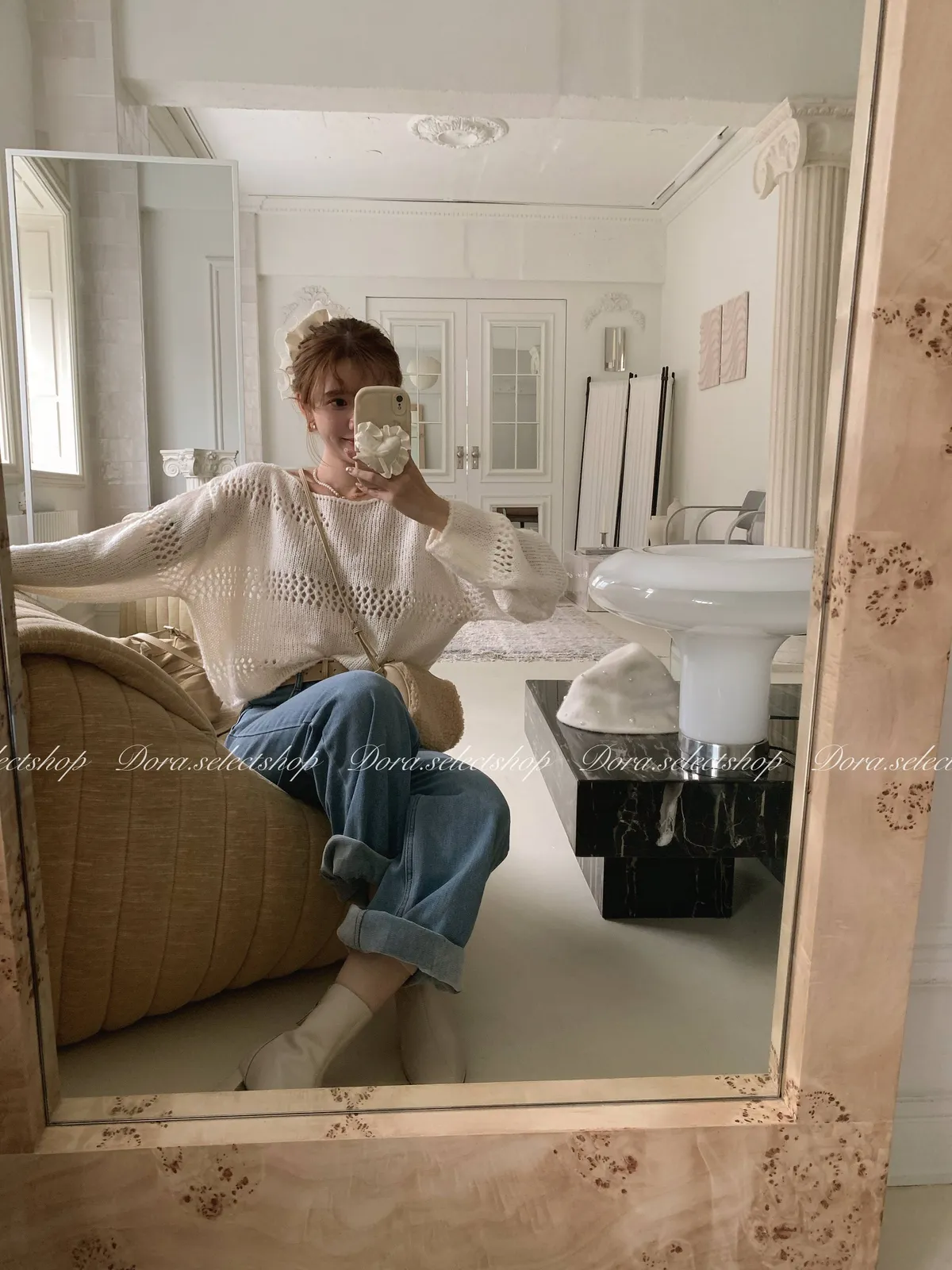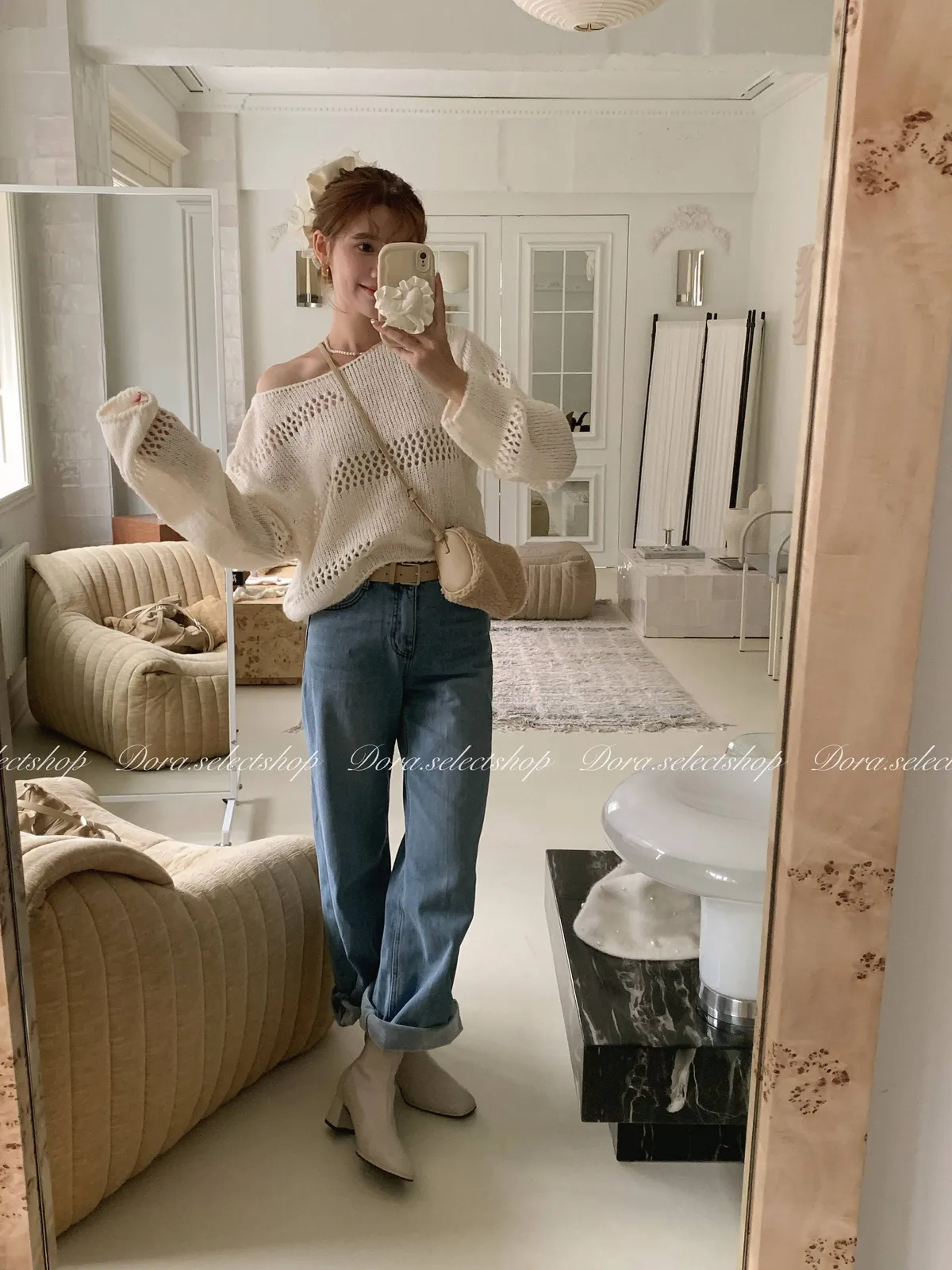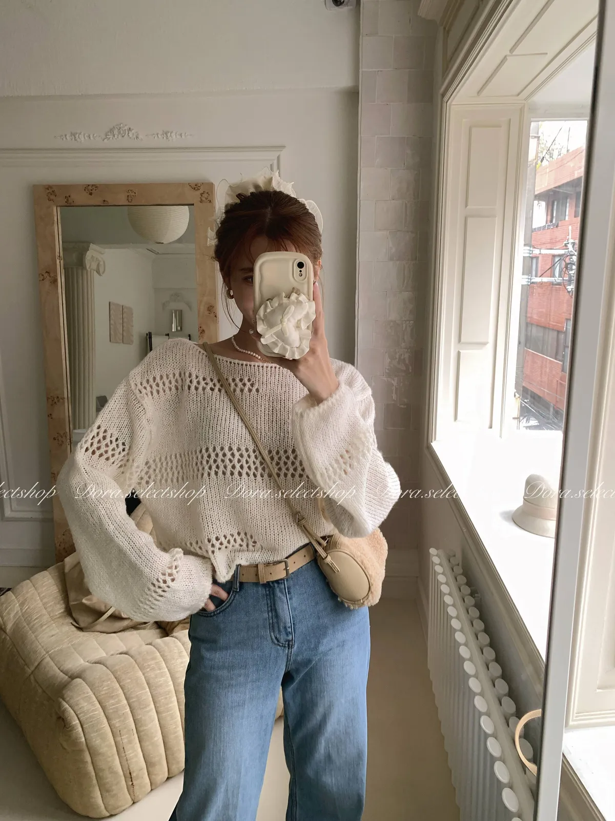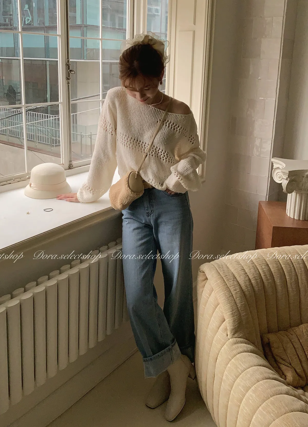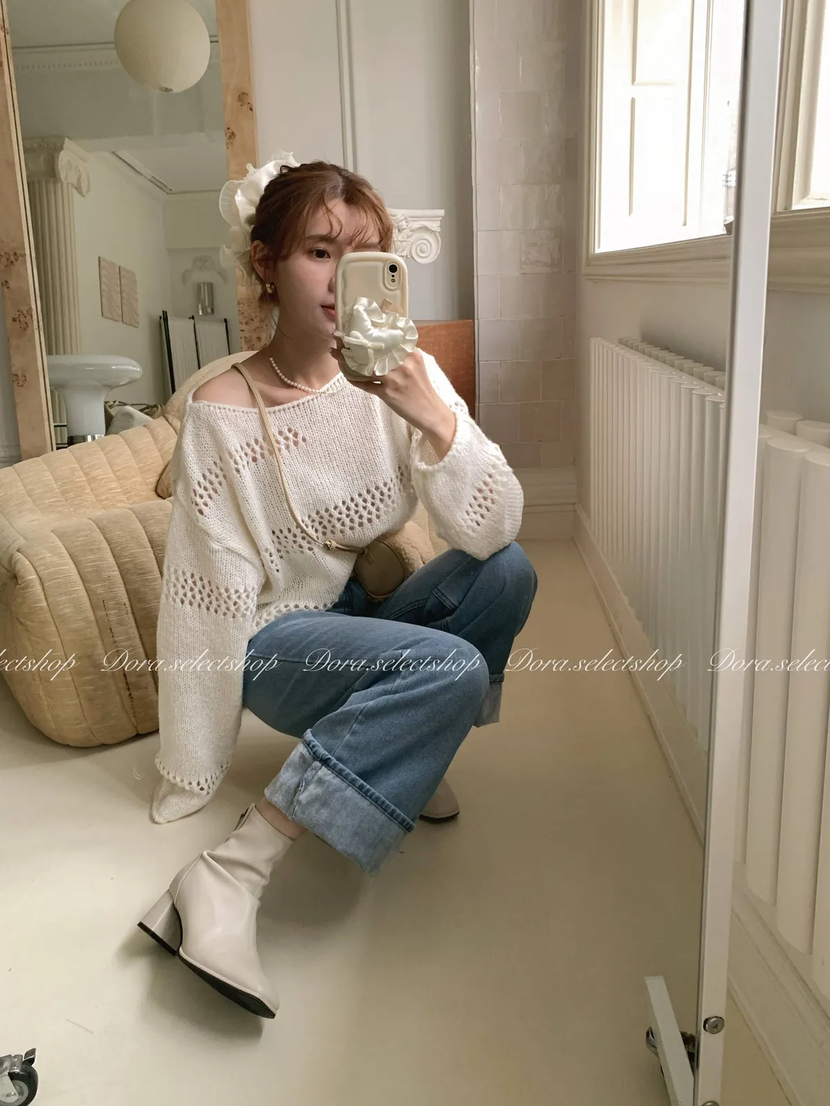 🇰🇷船領不規則簍空寬鬆短版針織上衣---白