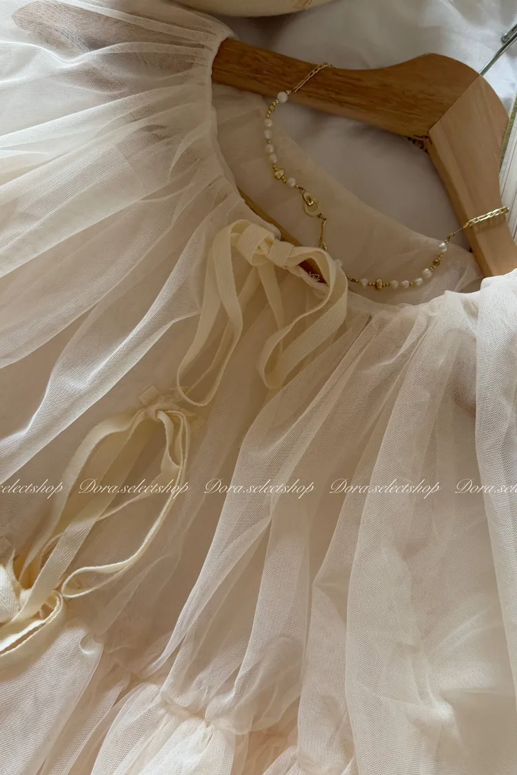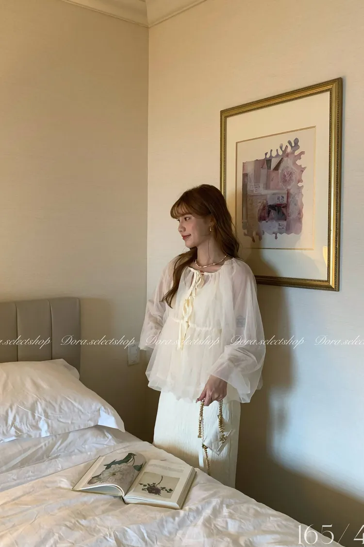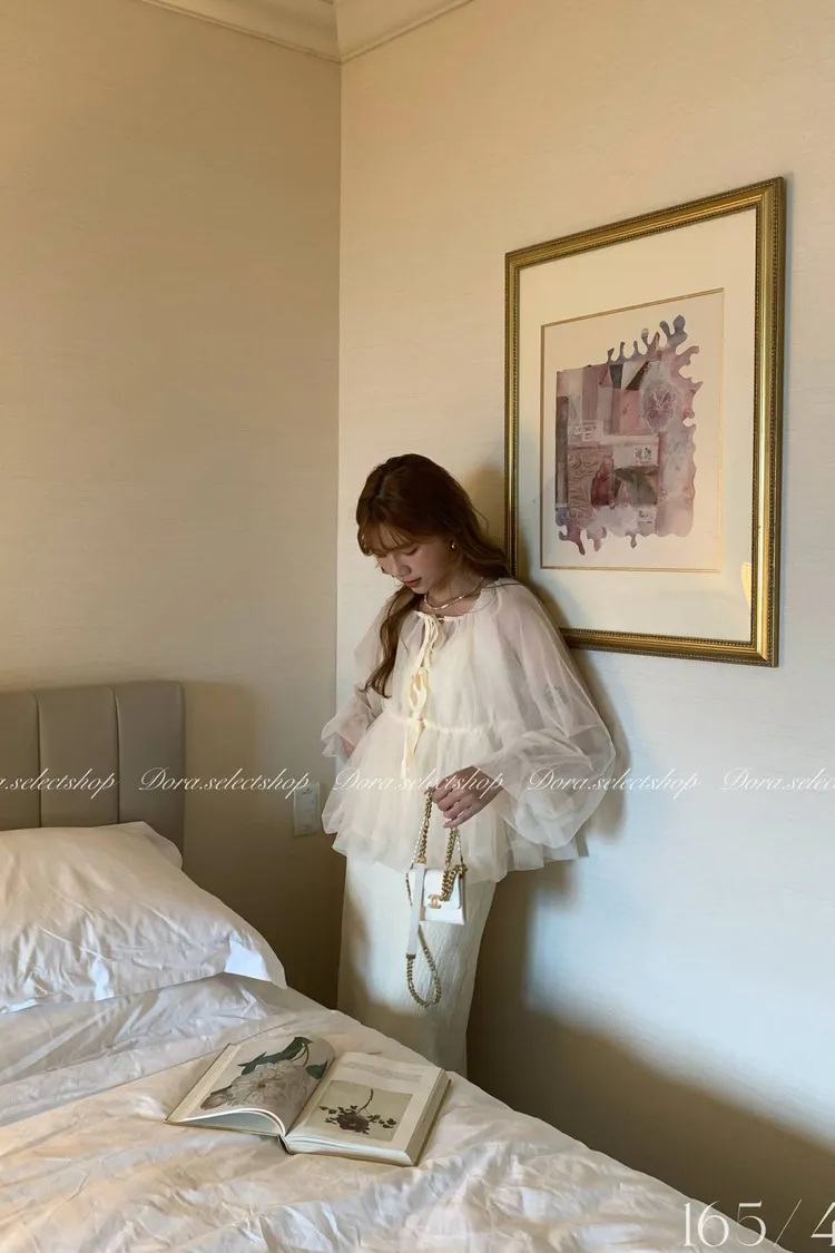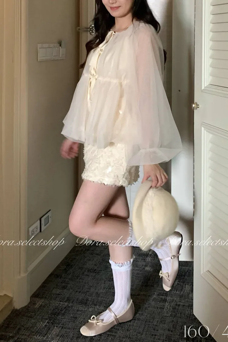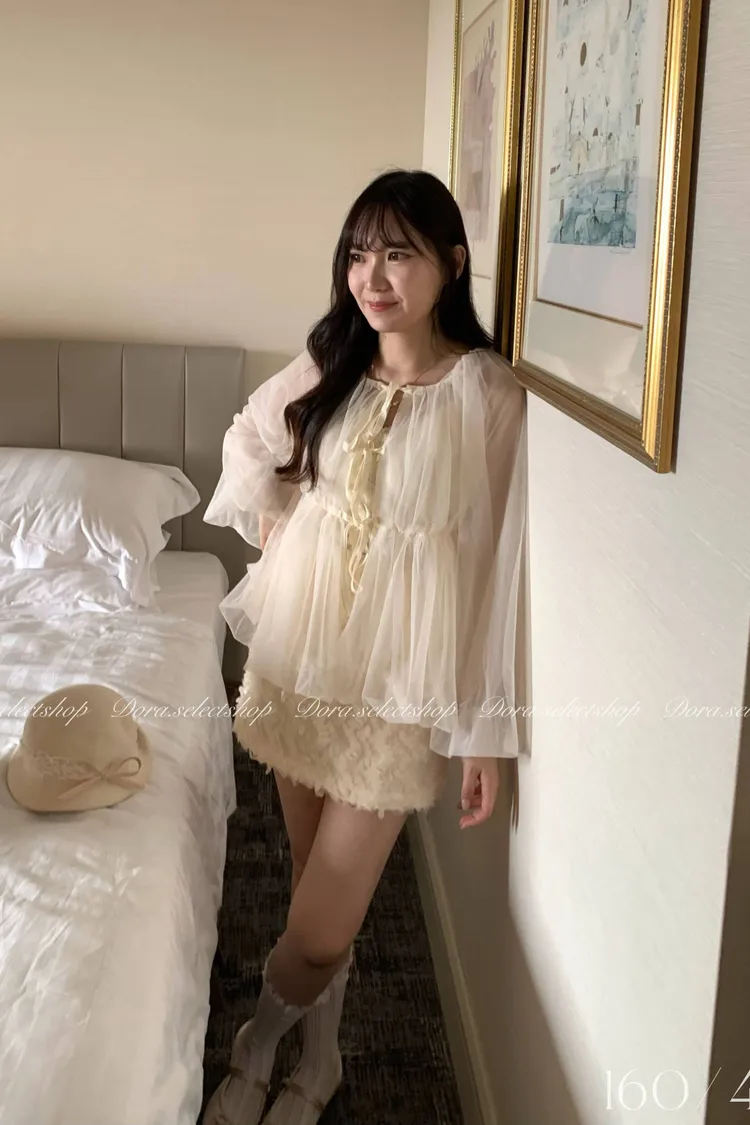 浪漫仙子透紗澎袖綁帶花苞上衣---米