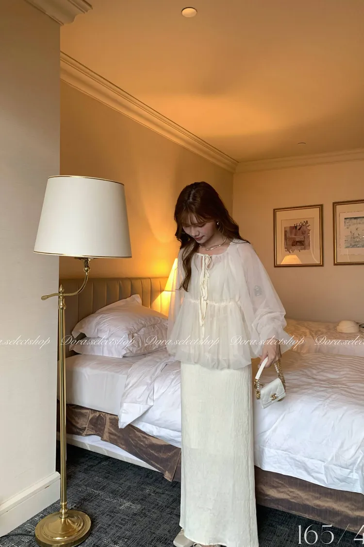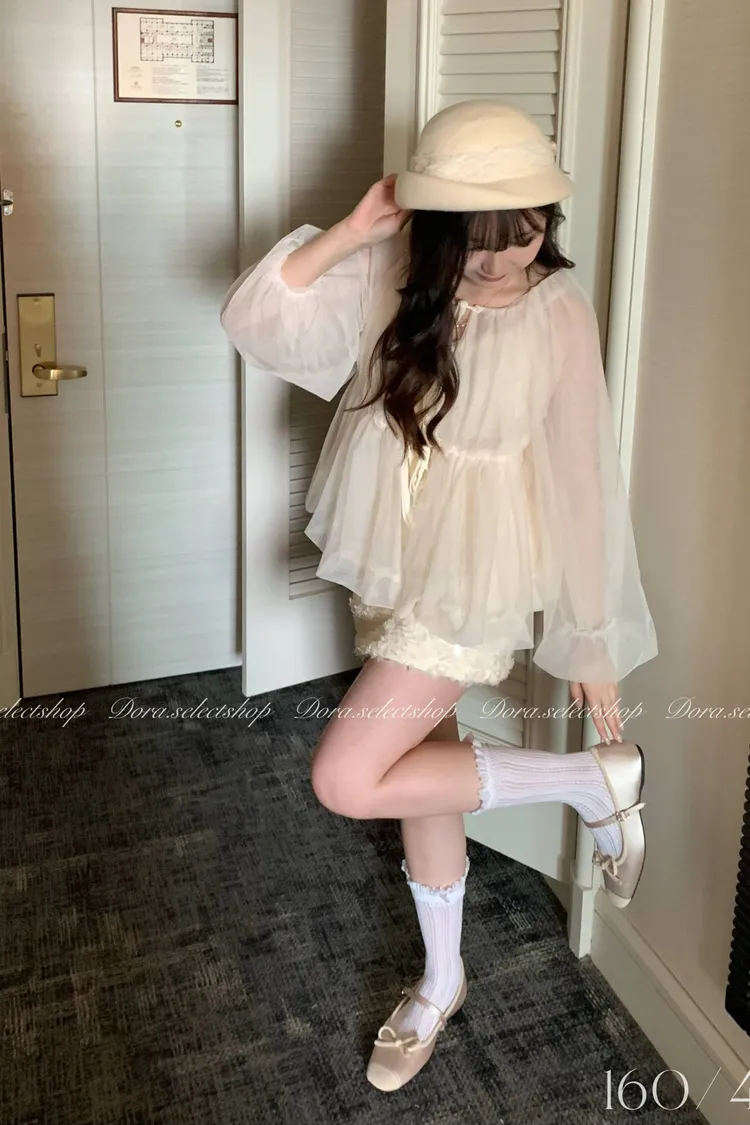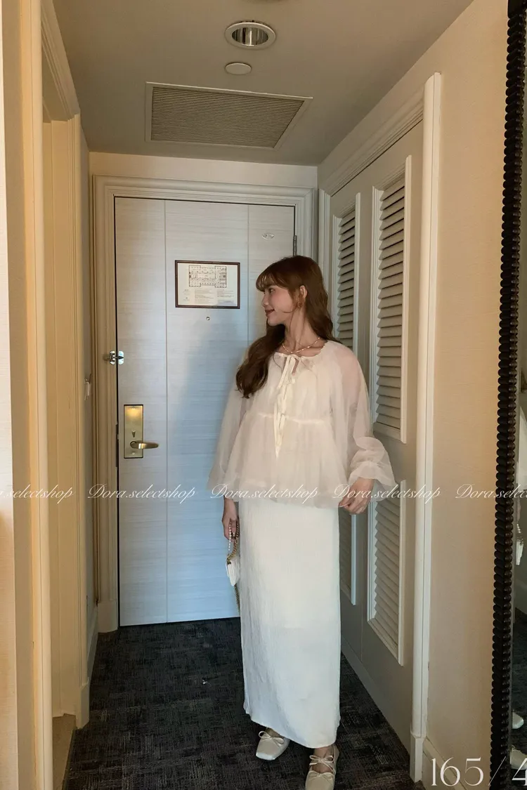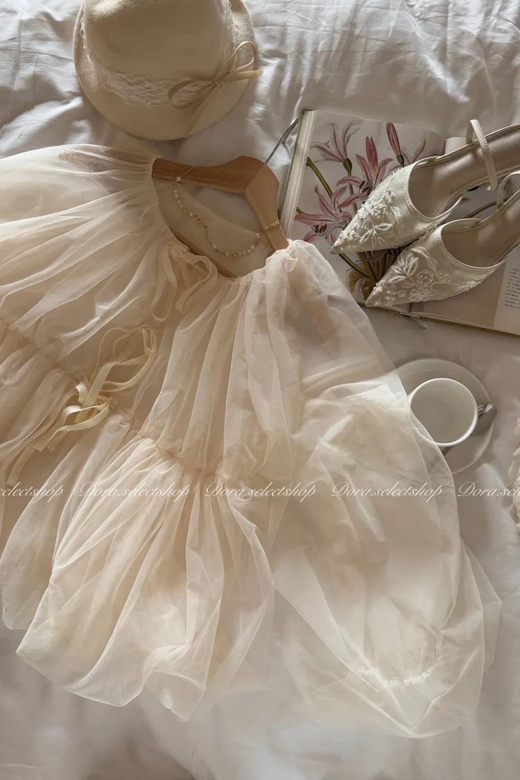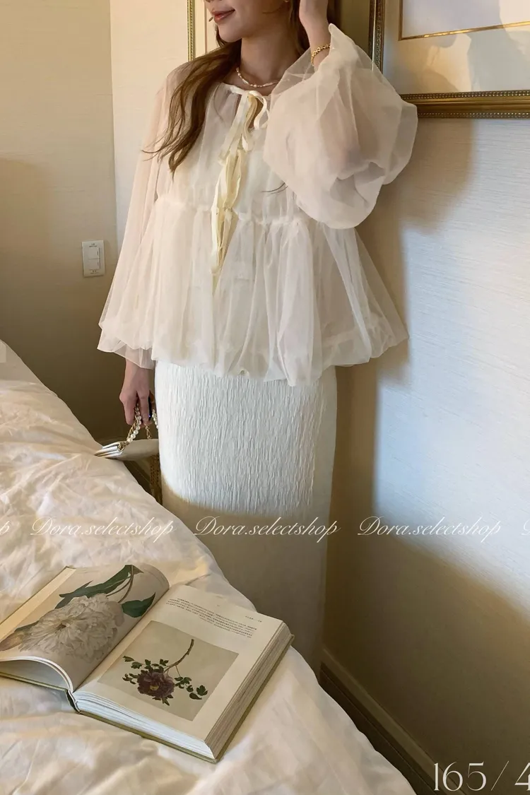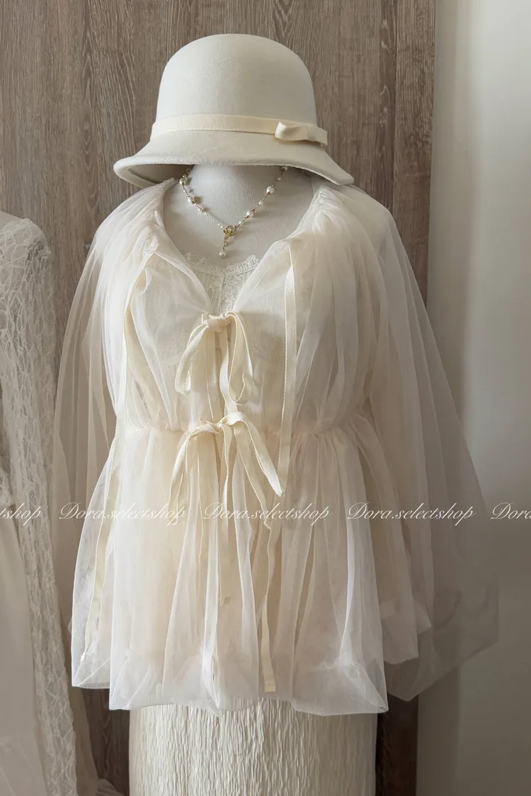 浪漫仙子透紗澎袖綁帶花苞上衣---米