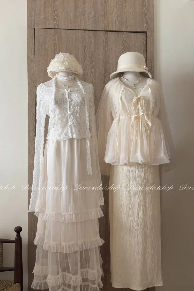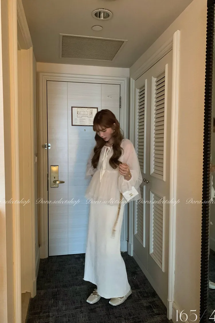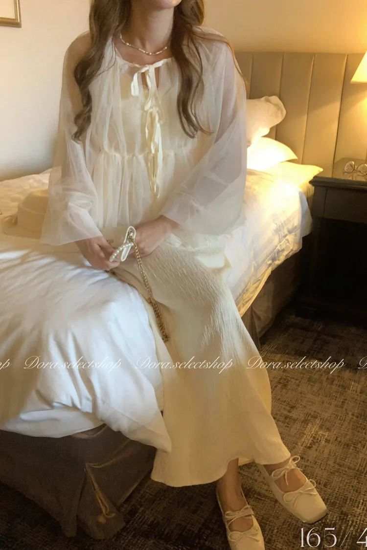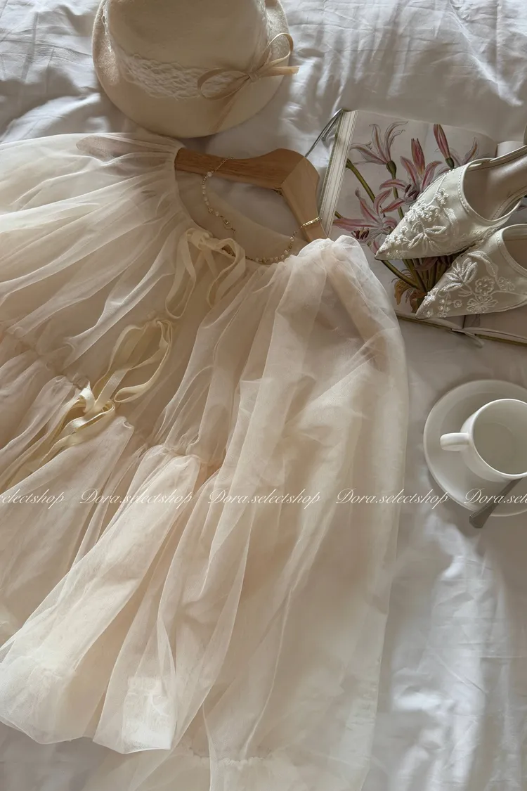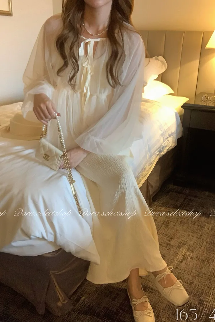 浪漫仙子透紗澎袖綁帶花苞上衣---米
