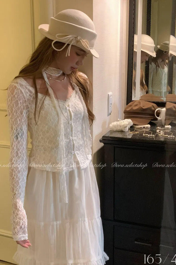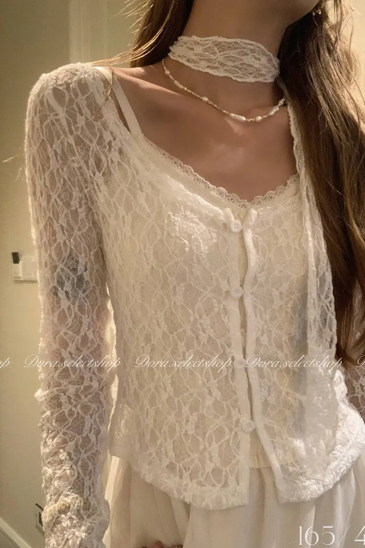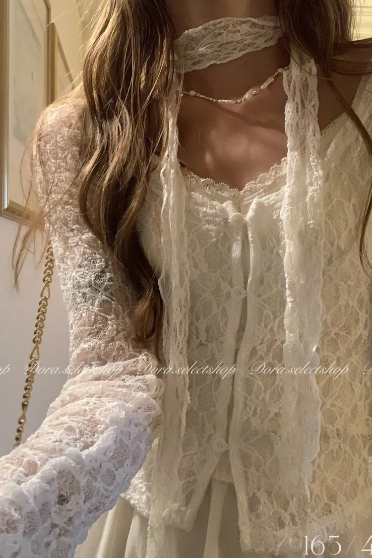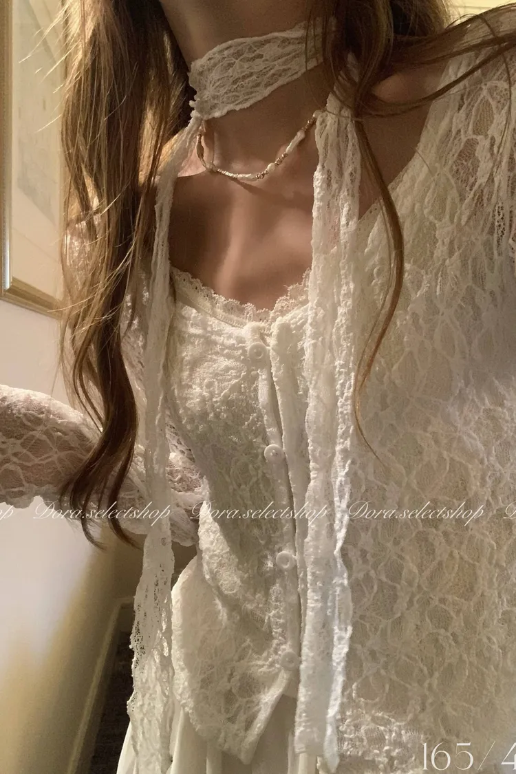 浪漫蕾絲鏤空排扣上衣(附綁繩)---白
