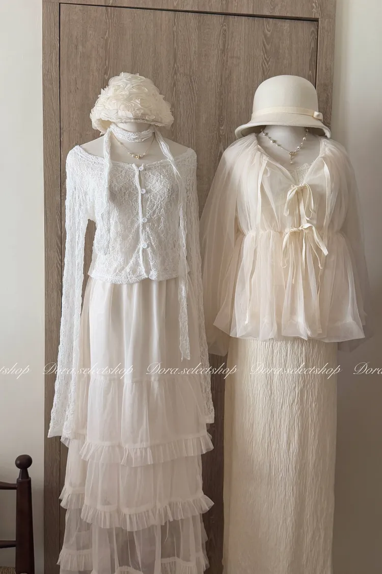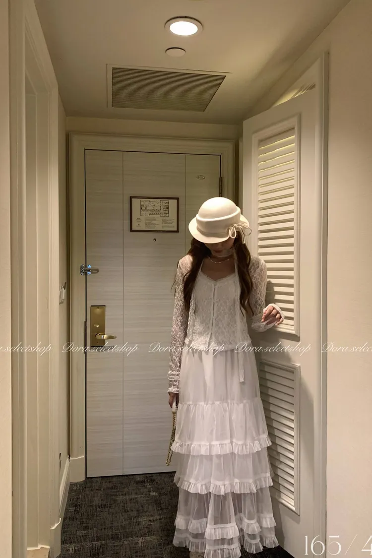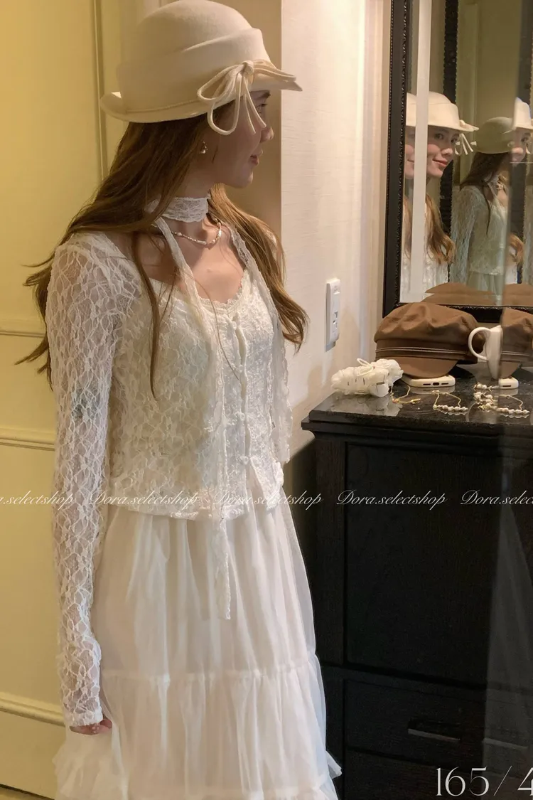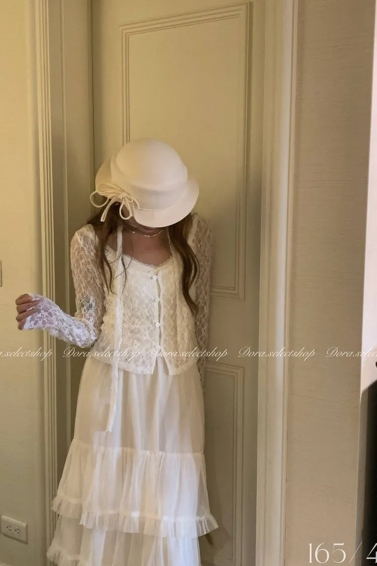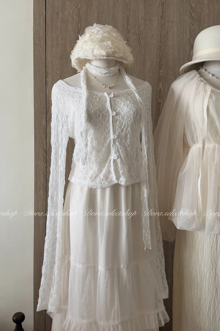浪漫蕾絲鏤空排扣上衣(附綁繩)---白