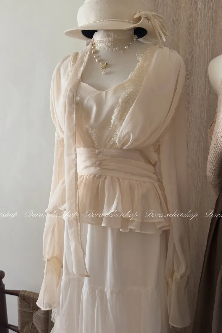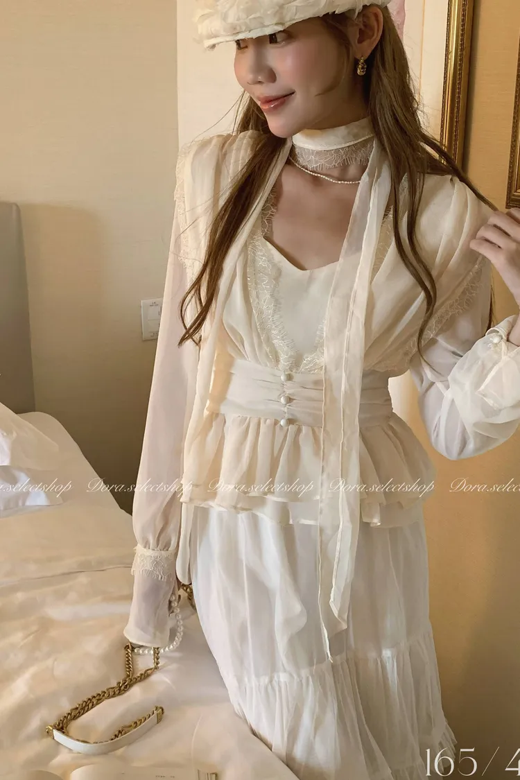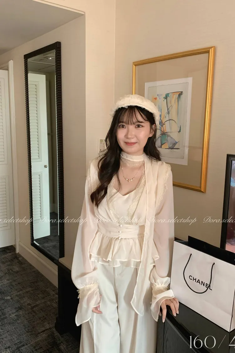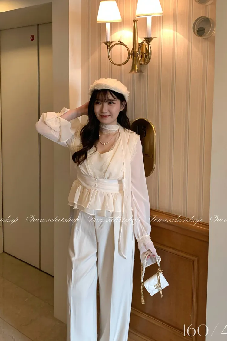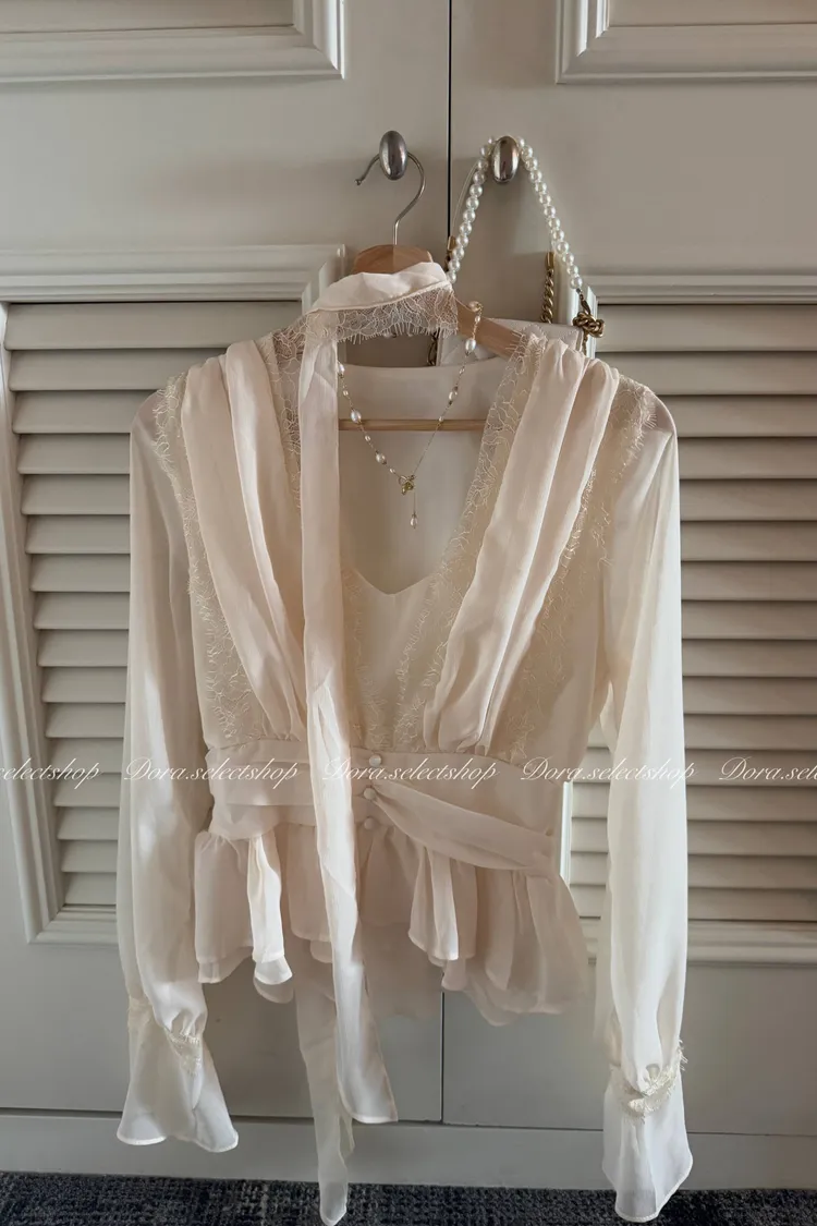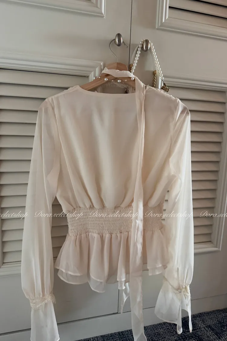 知性優雅縮腰蕾絲拼接V領上衣(附綁繩)---米