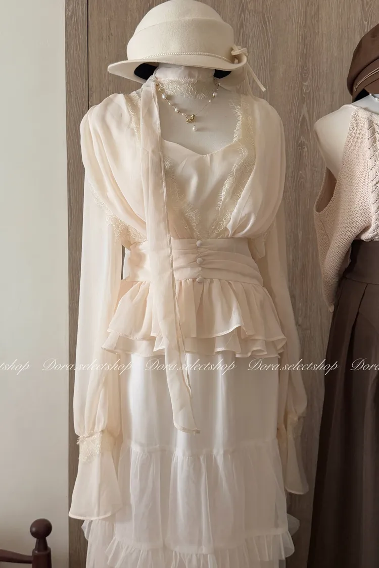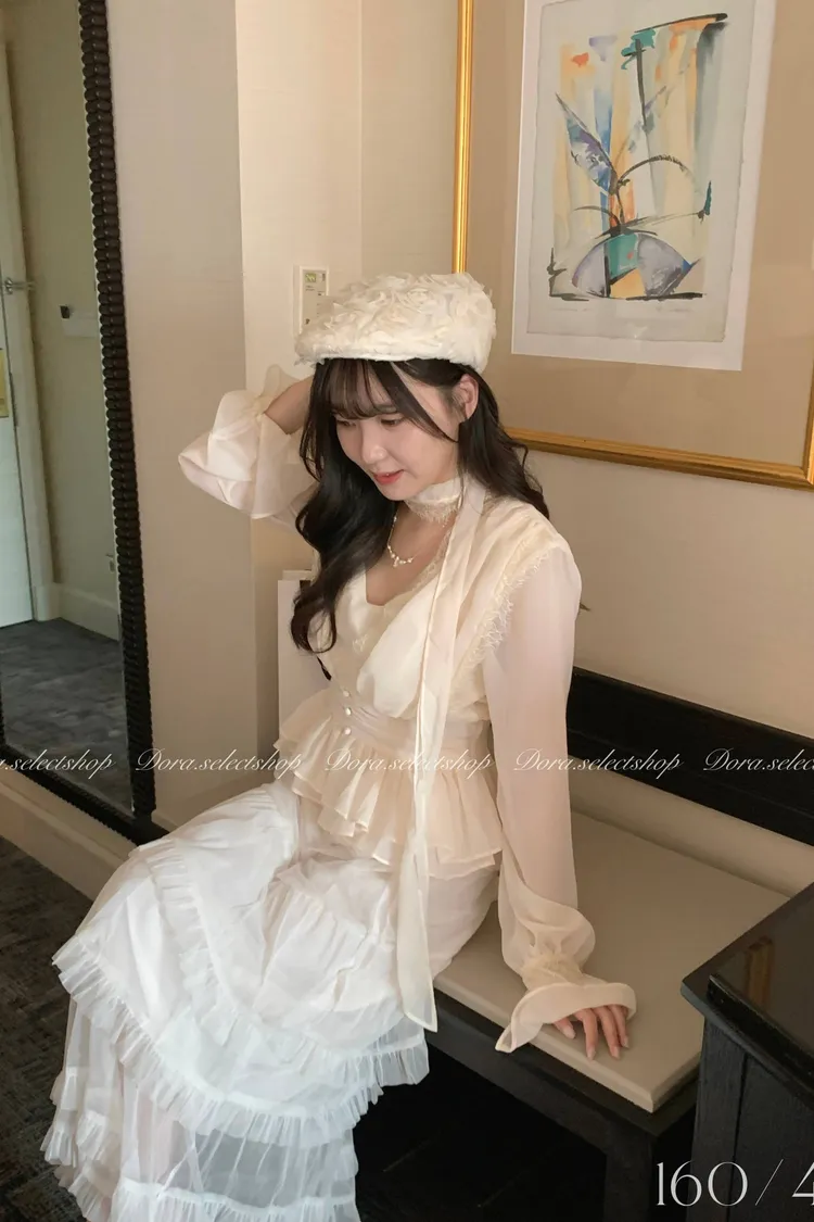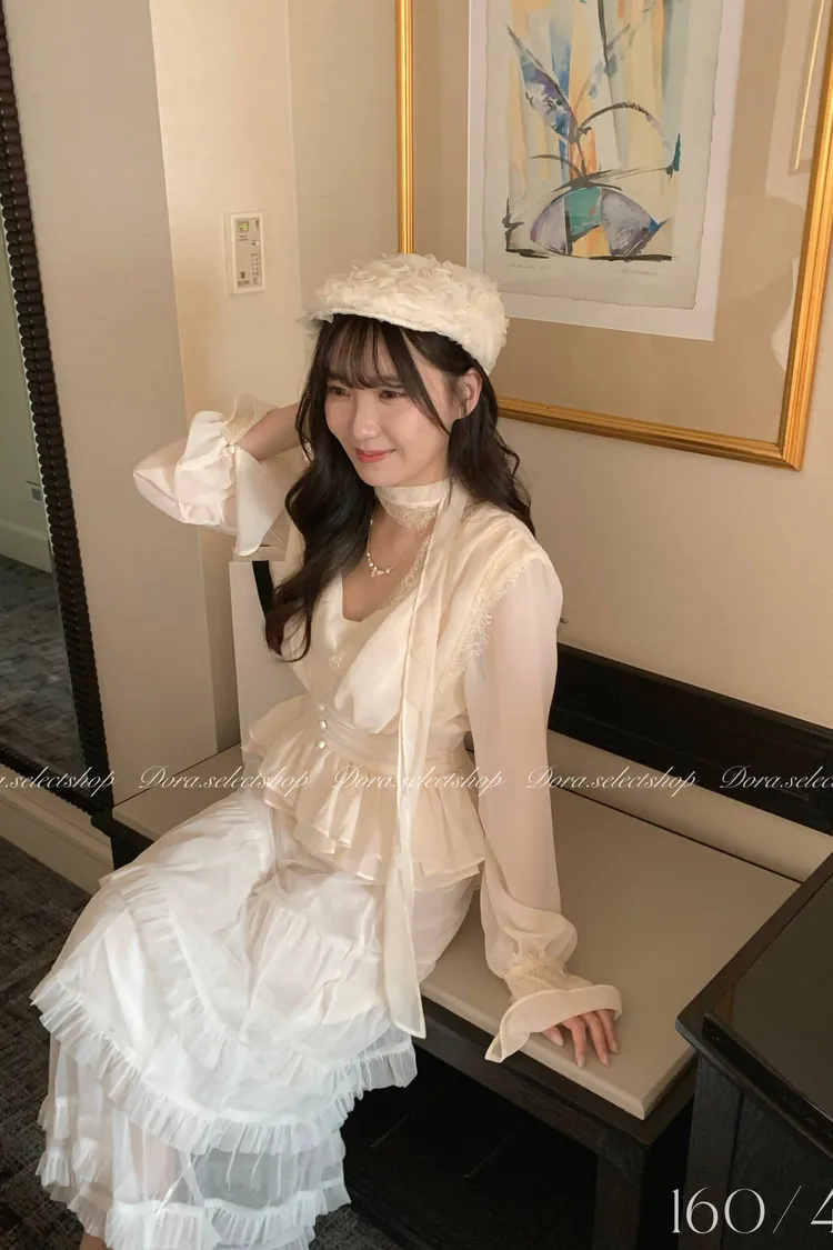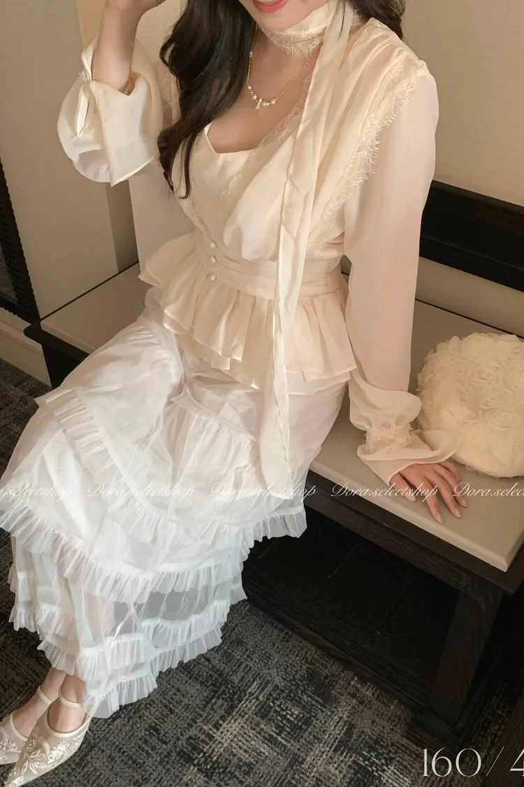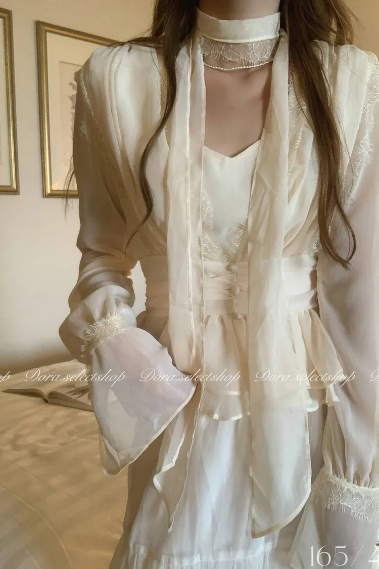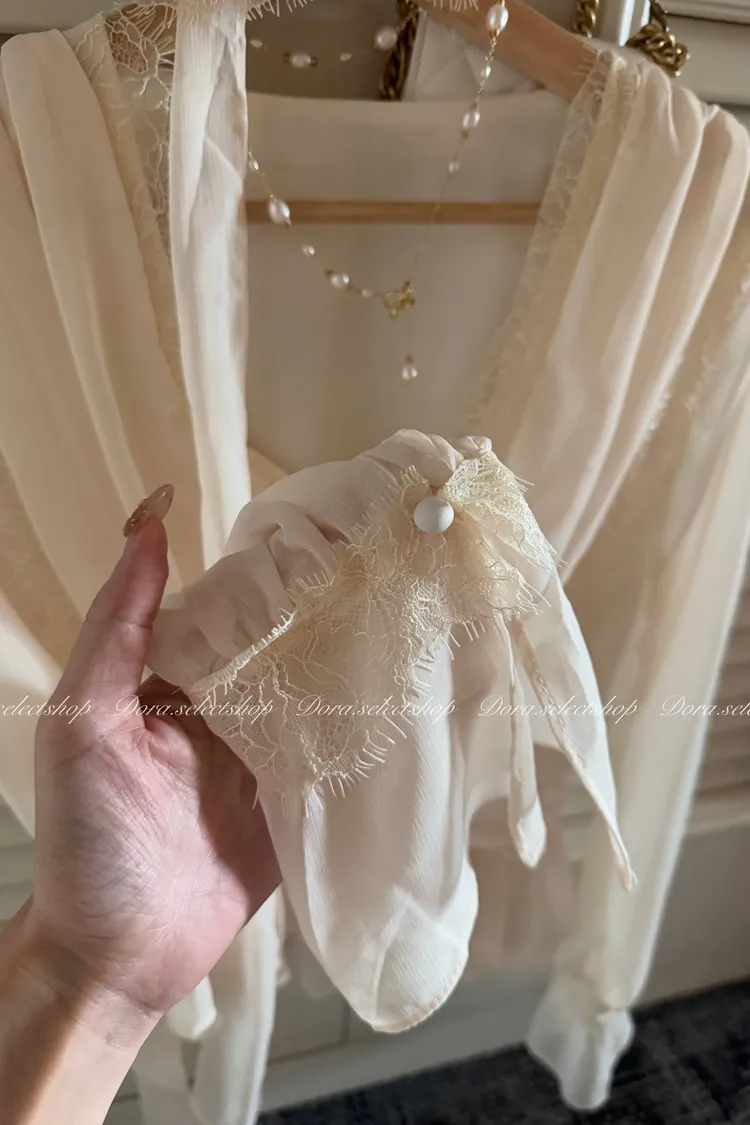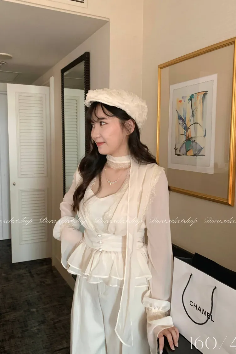 知性優雅縮腰蕾絲拼接V領上衣(附綁繩)---米