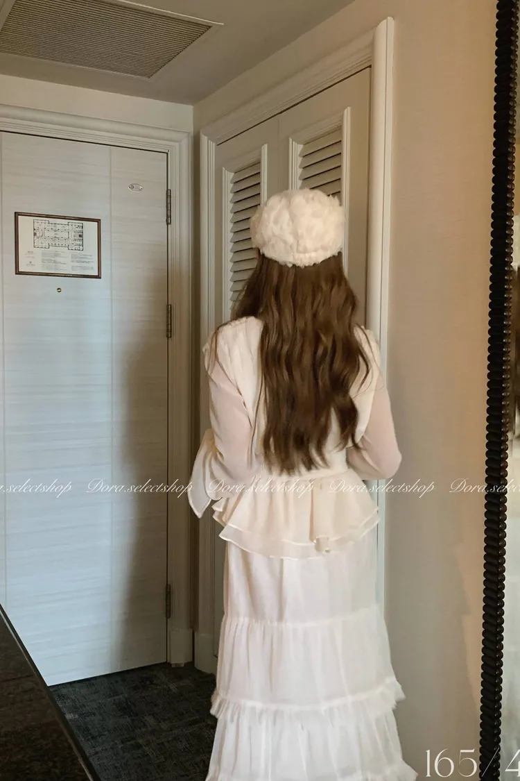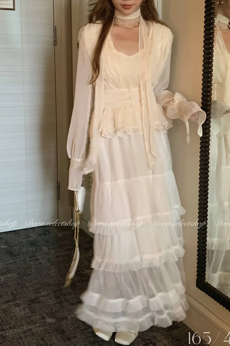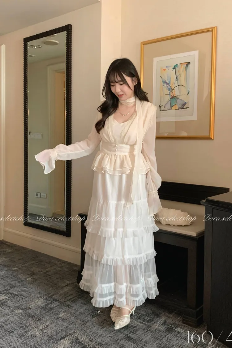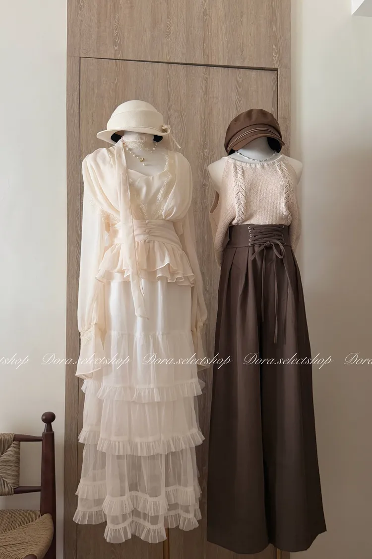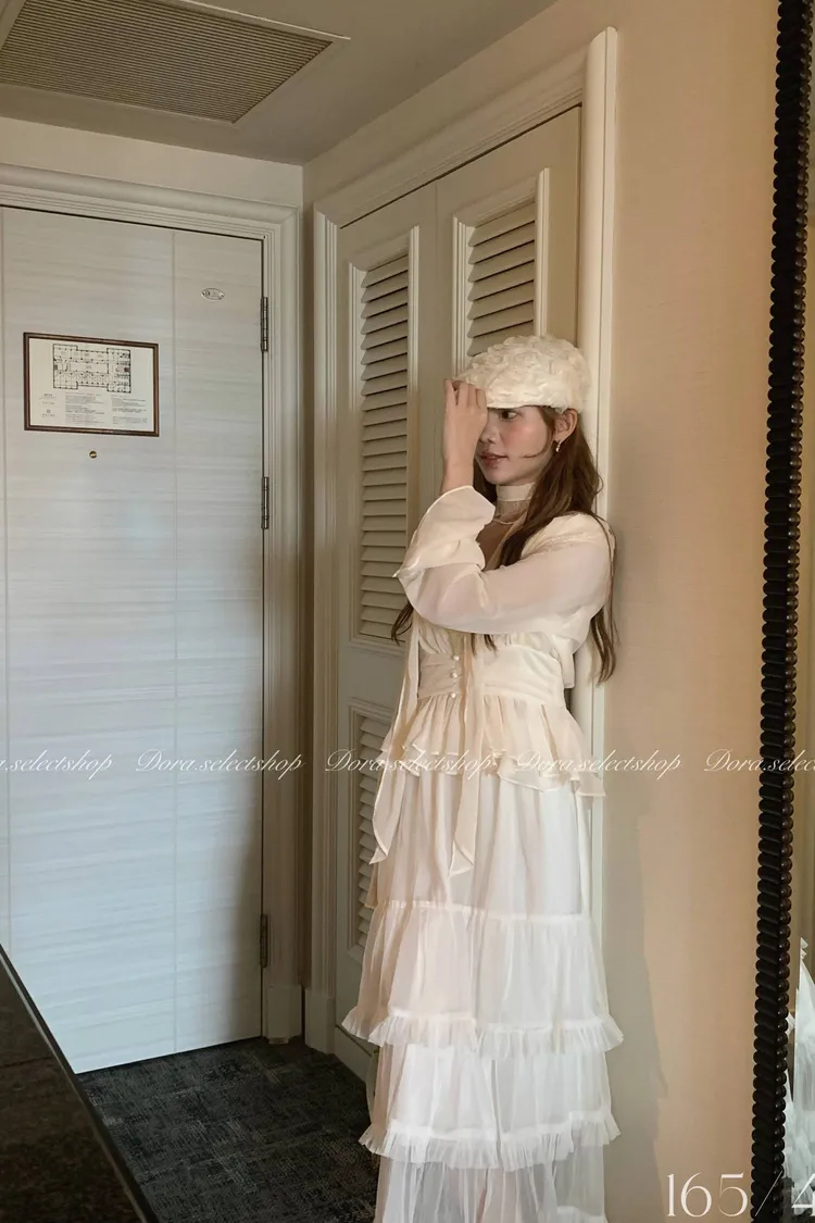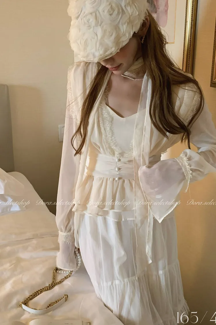 知性優雅縮腰蕾絲拼接V領上衣(附綁繩)---米