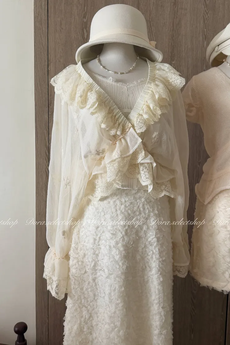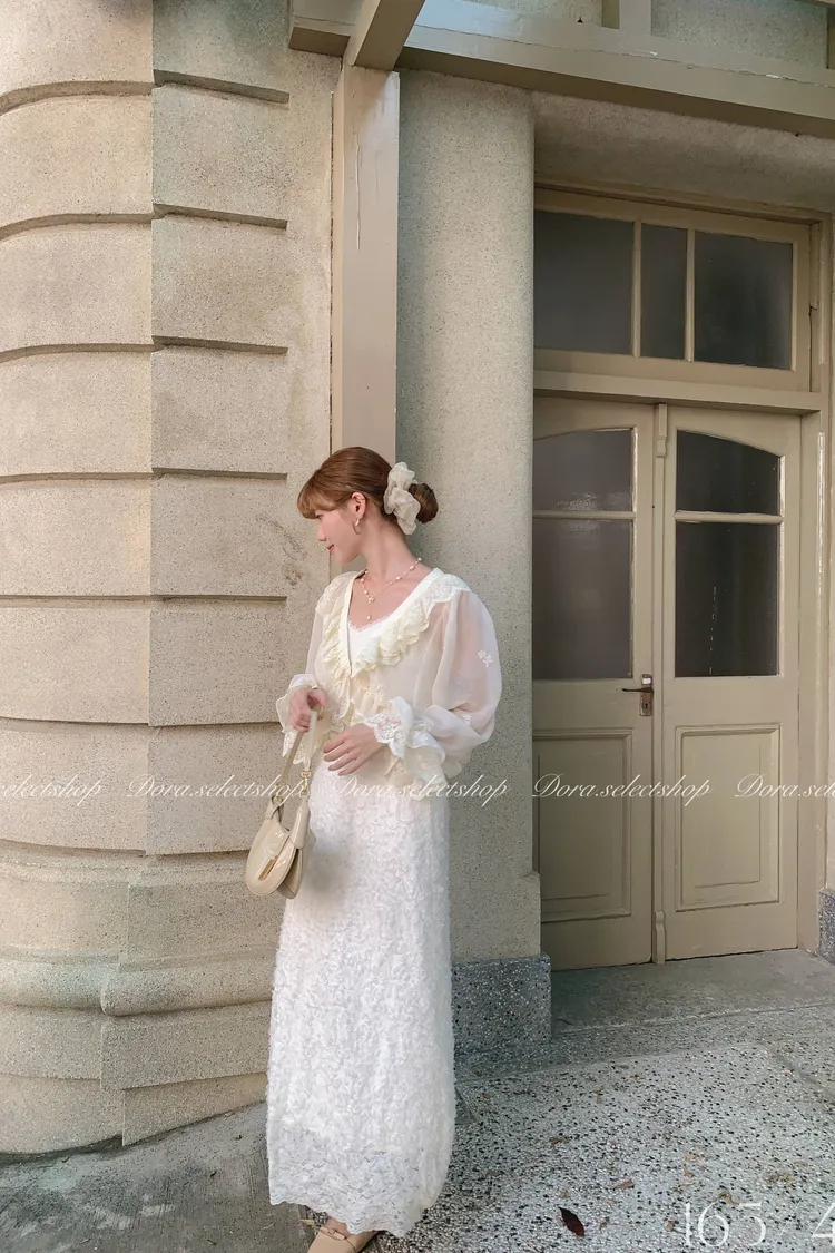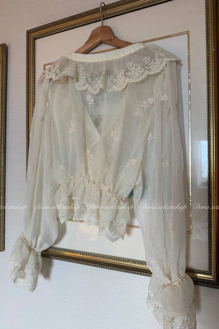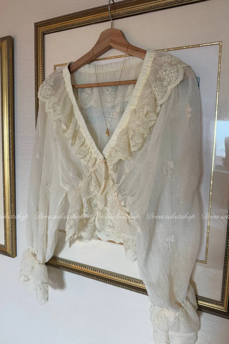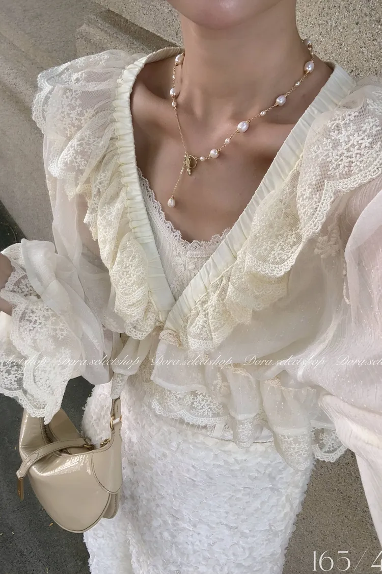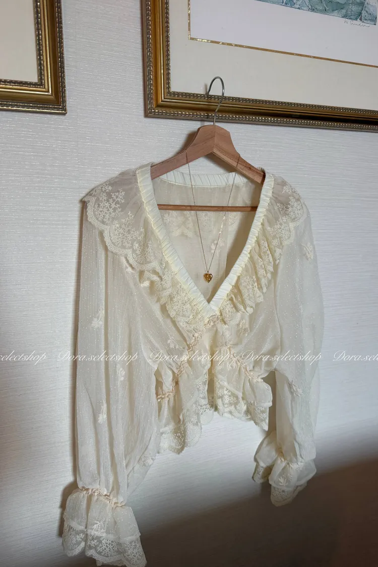 法式V領蕾絲繡花短版荷葉上衣---淺米鵝黃