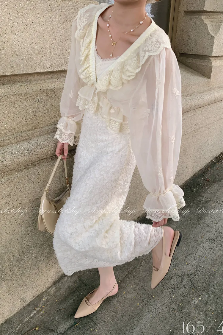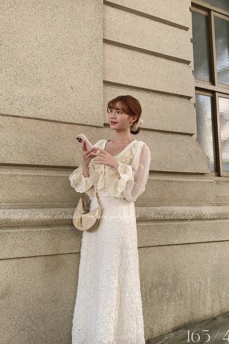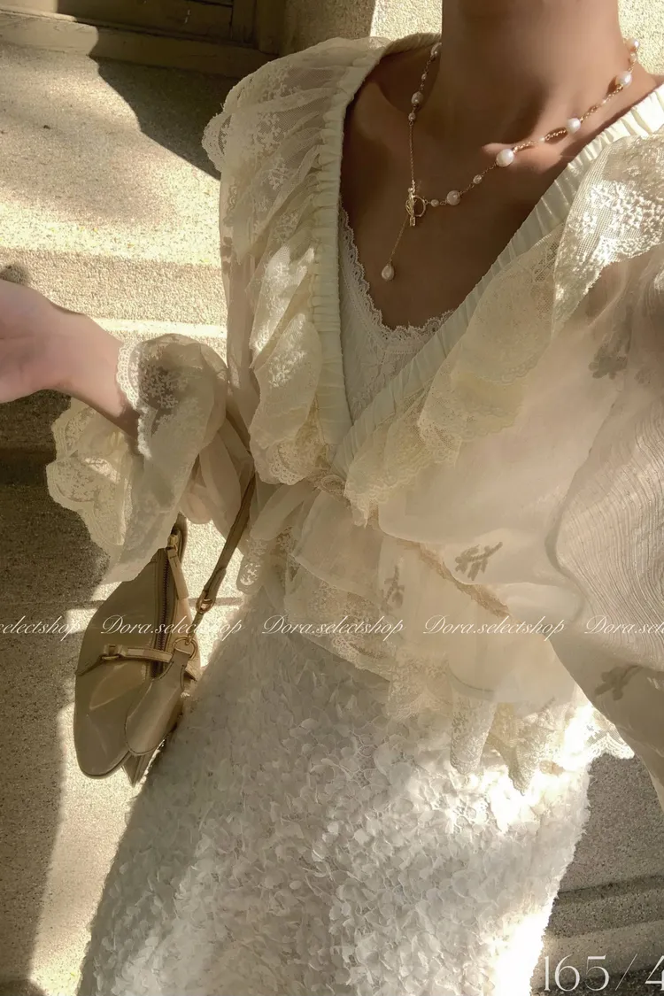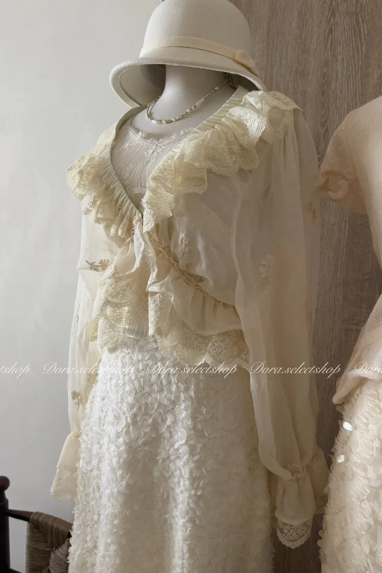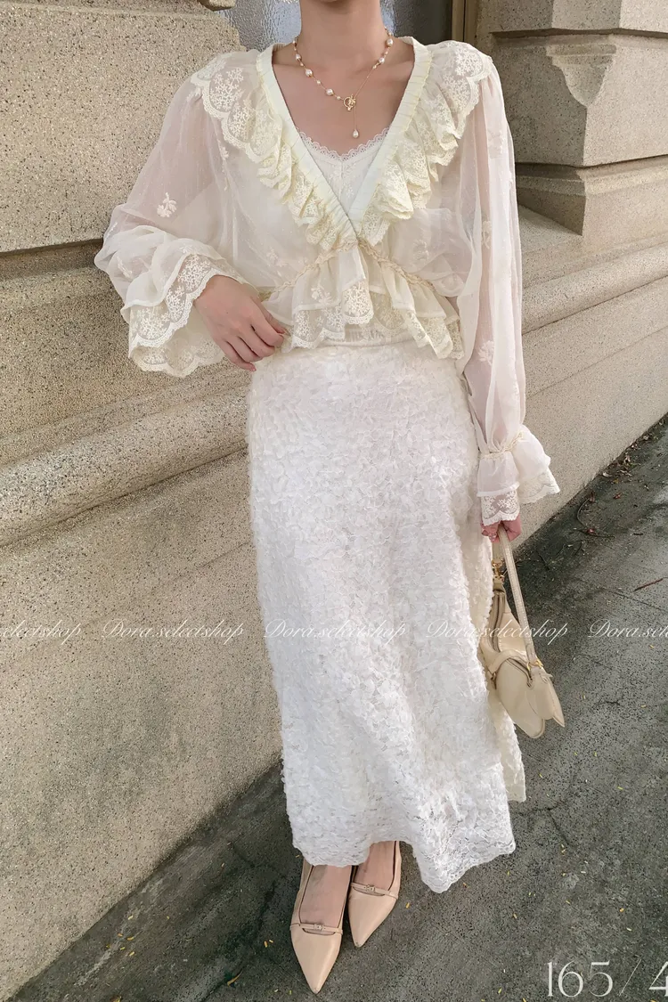 法式V領蕾絲繡花短版荷葉上衣---淺米鵝黃