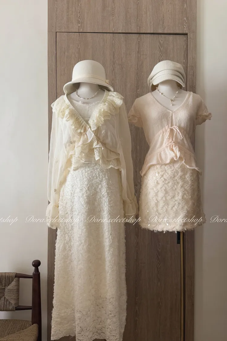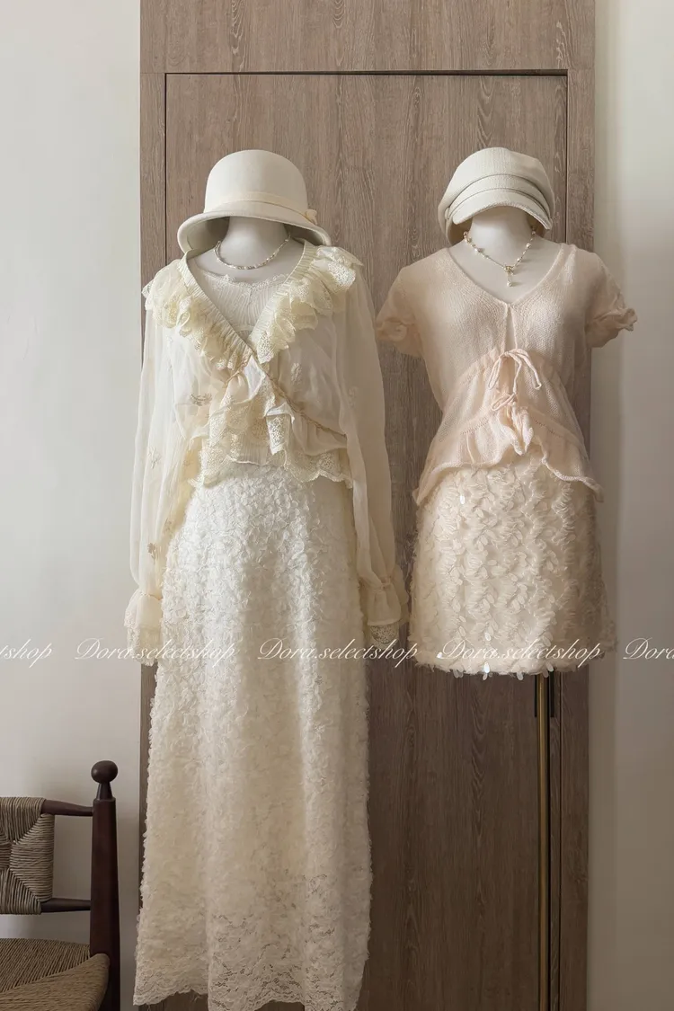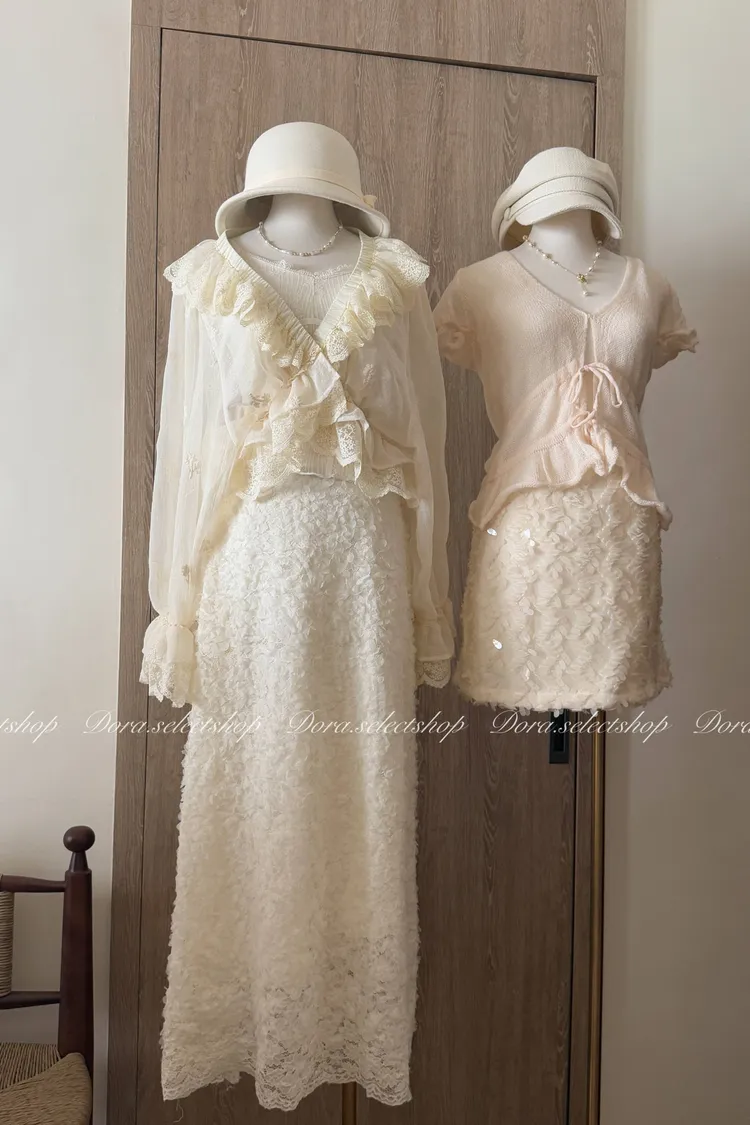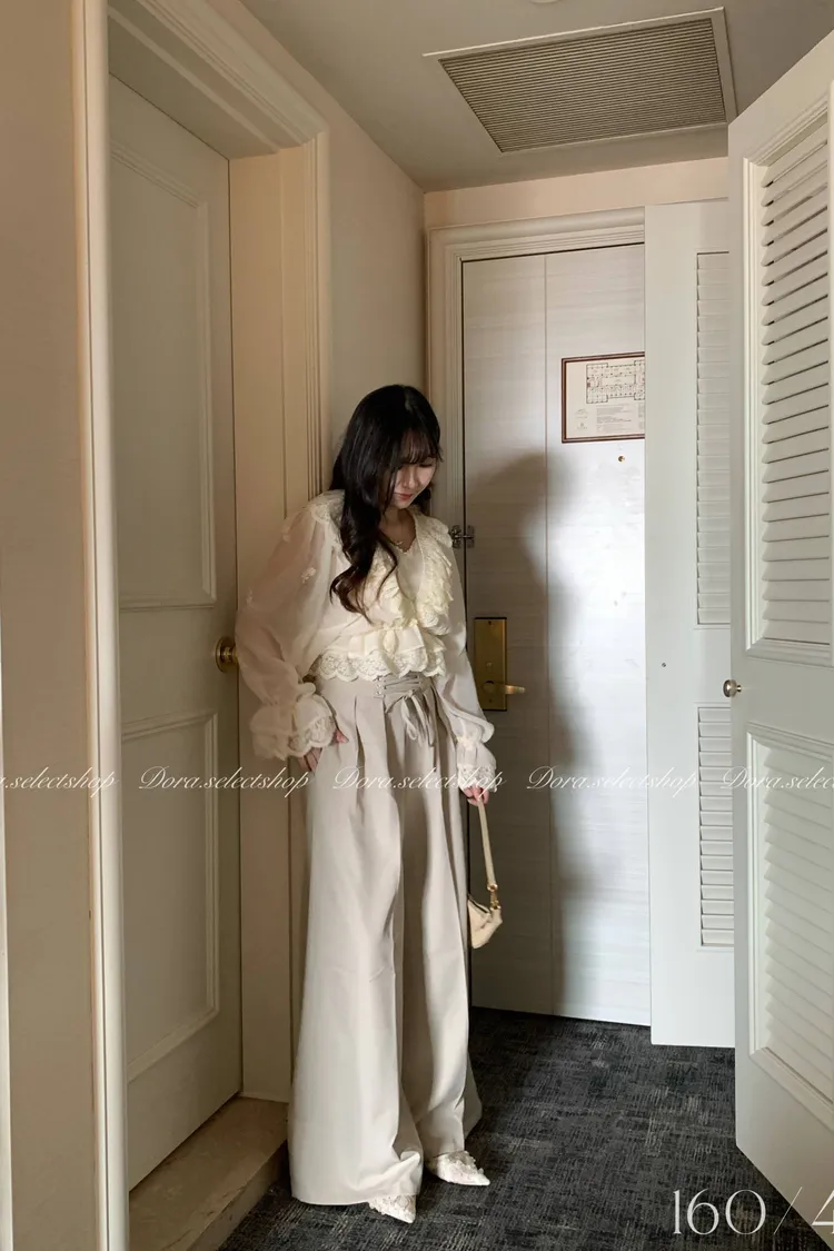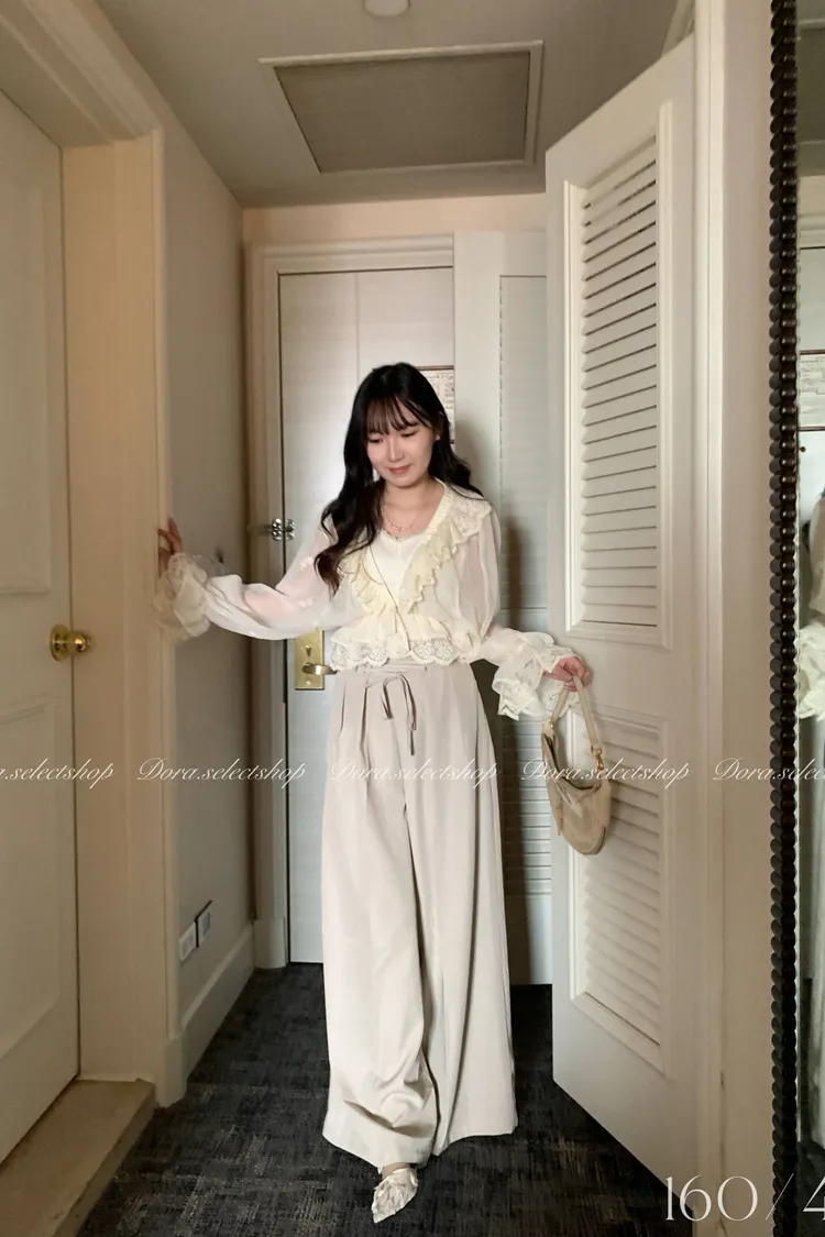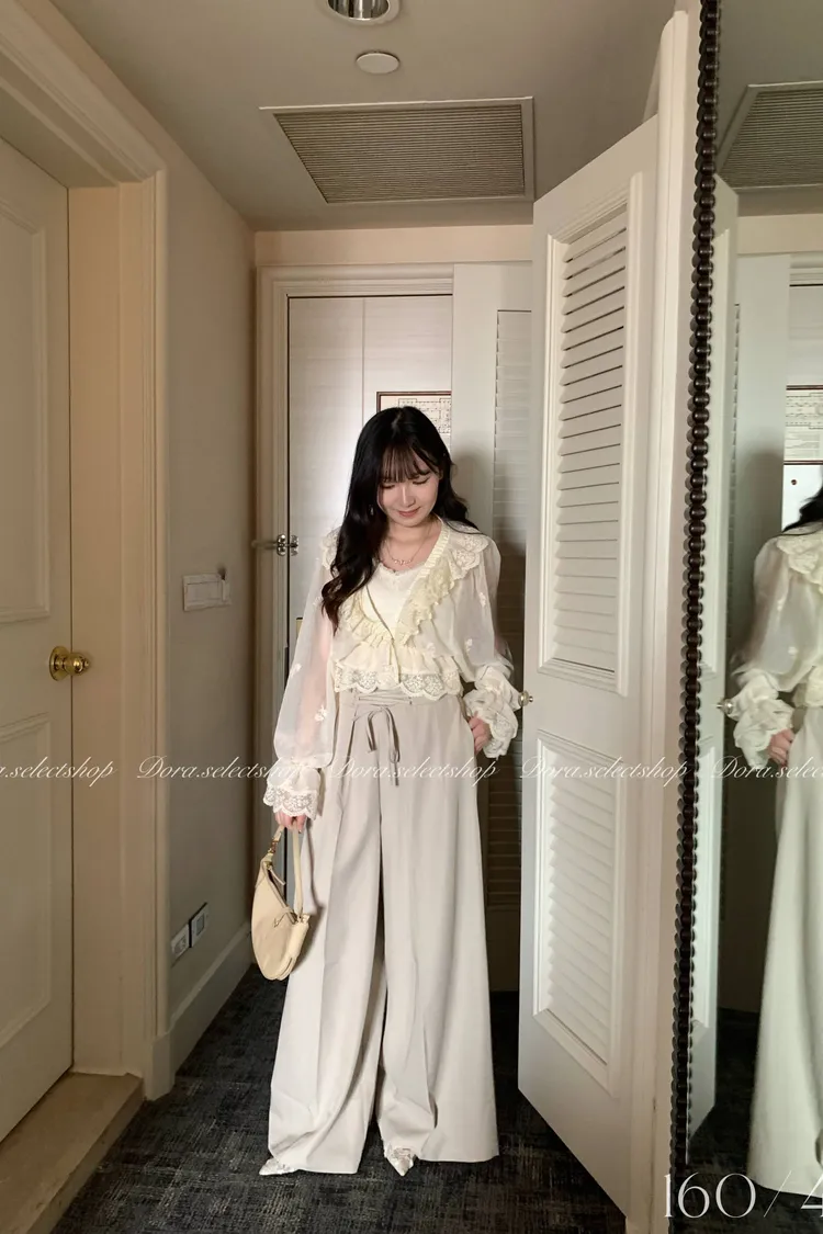 法式V領蕾絲繡花短版荷葉上衣---淺米鵝黃