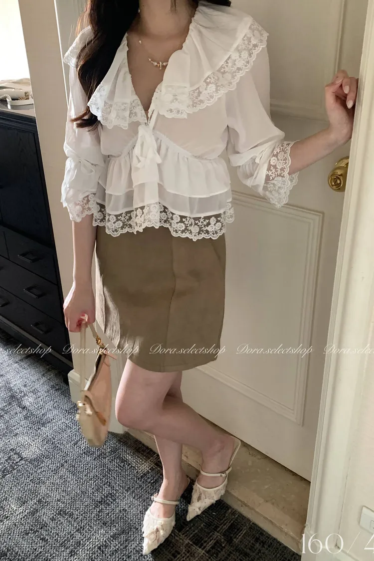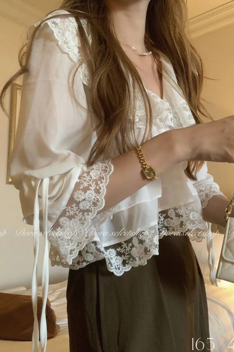 歐洲宮廷蕾絲喇叭袖短版上衣---白