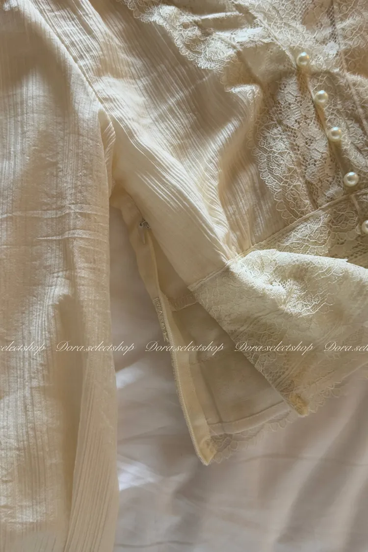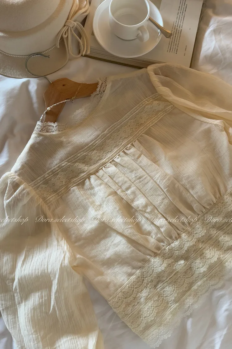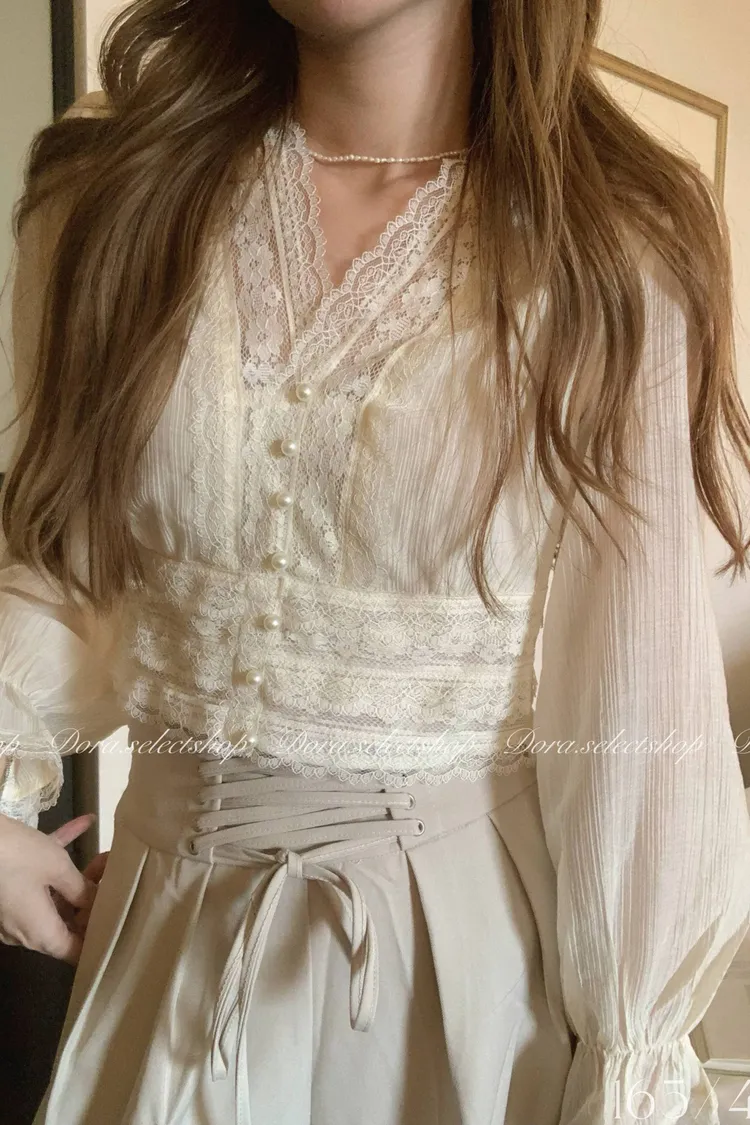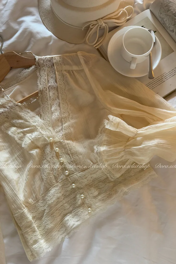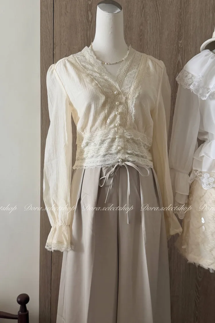 典雅蕾絲邊珍珠釦點綴上衣---米