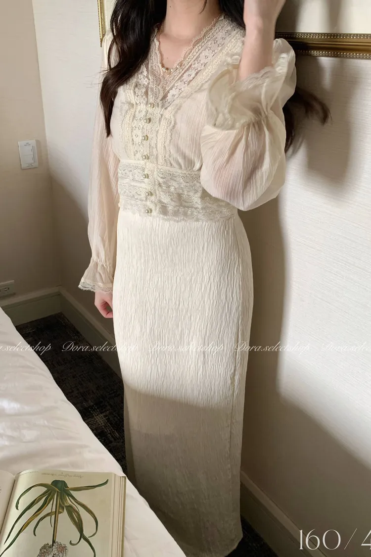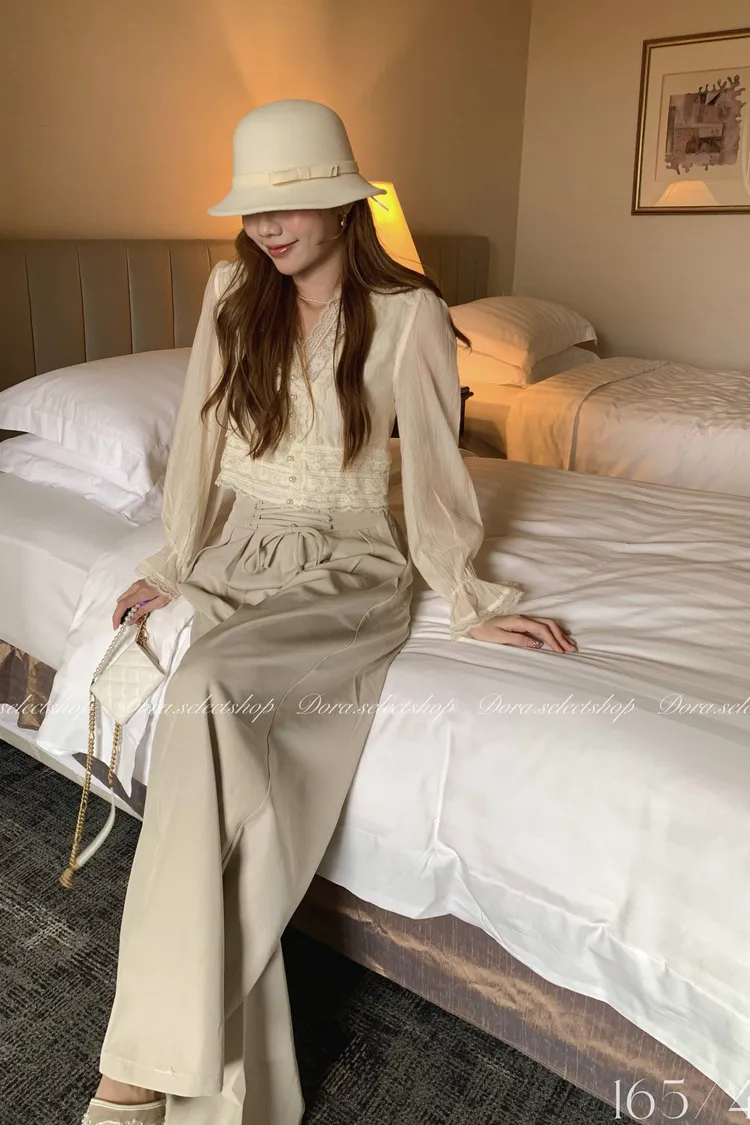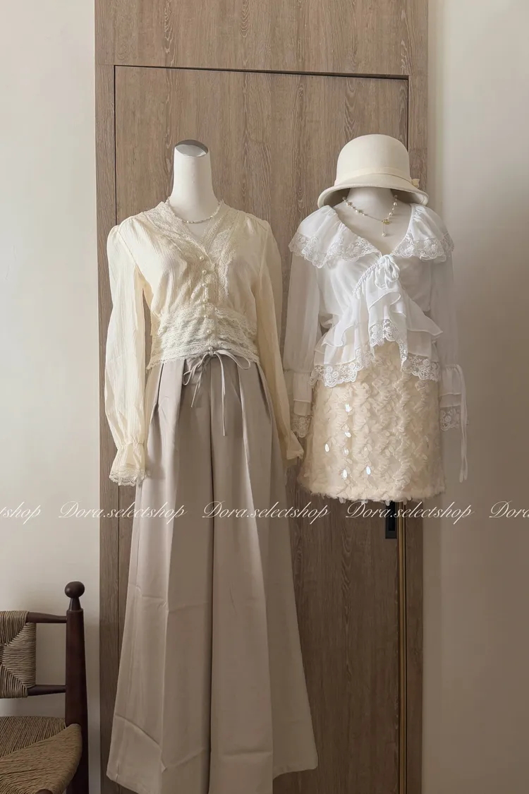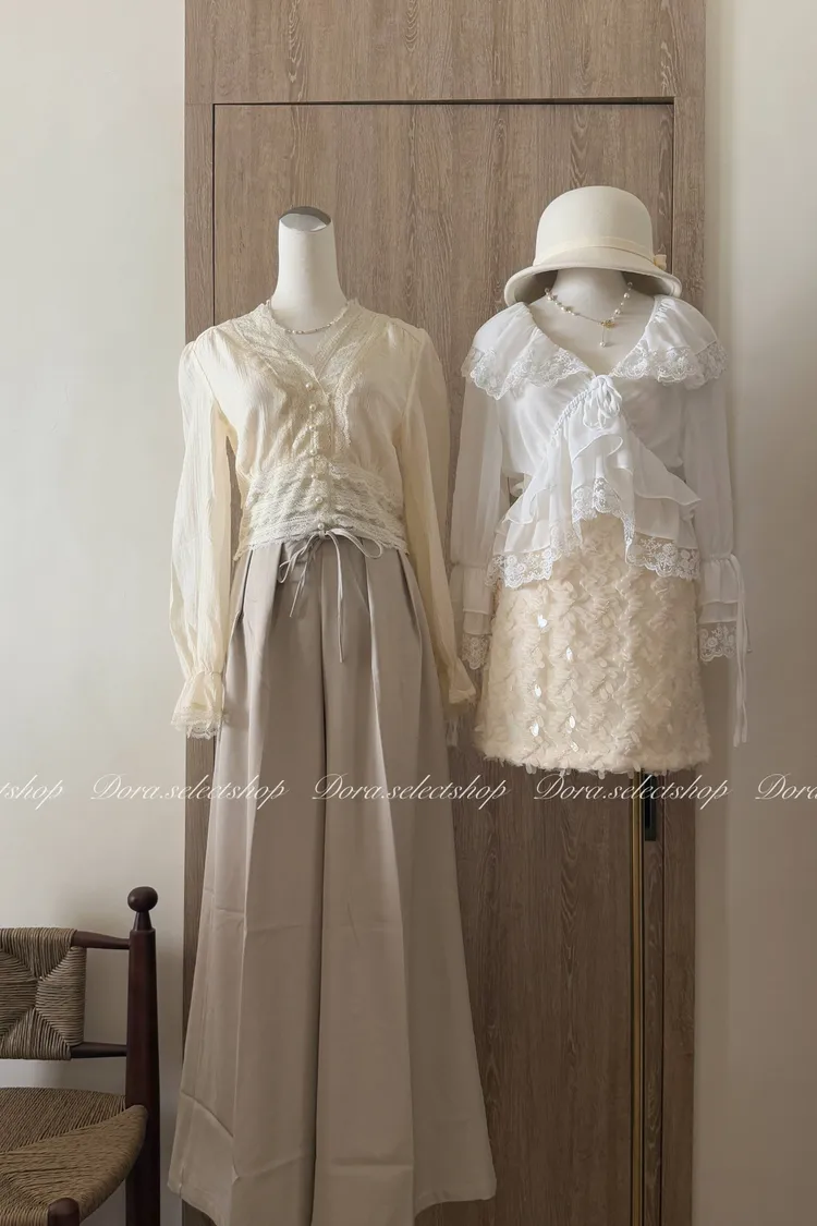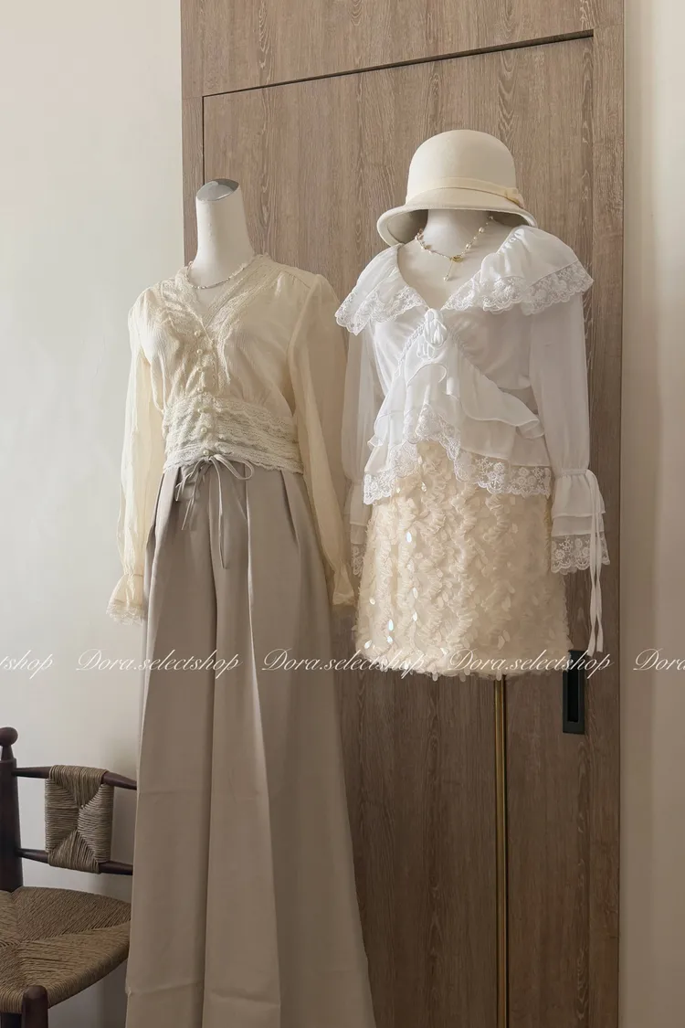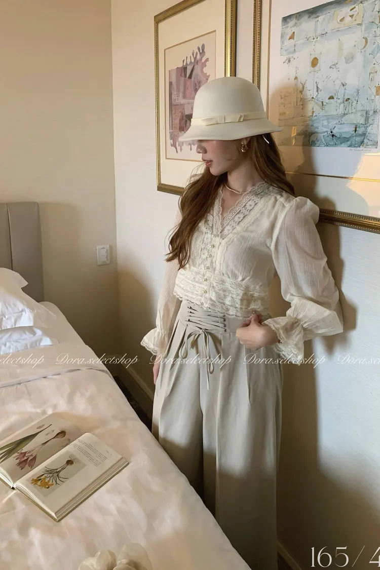 典雅蕾絲邊珍珠釦點綴上衣---米