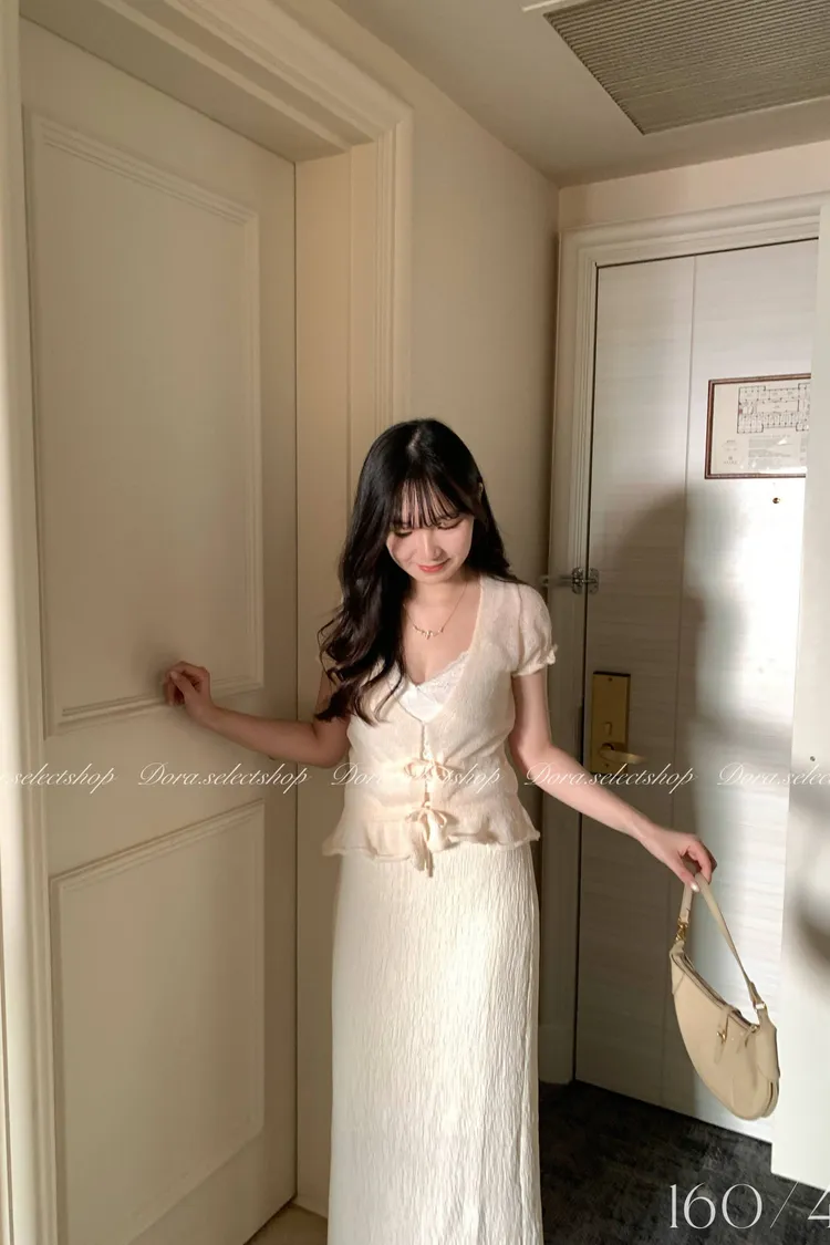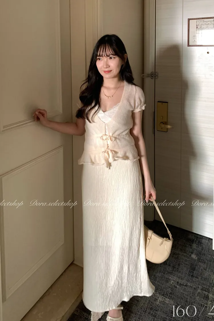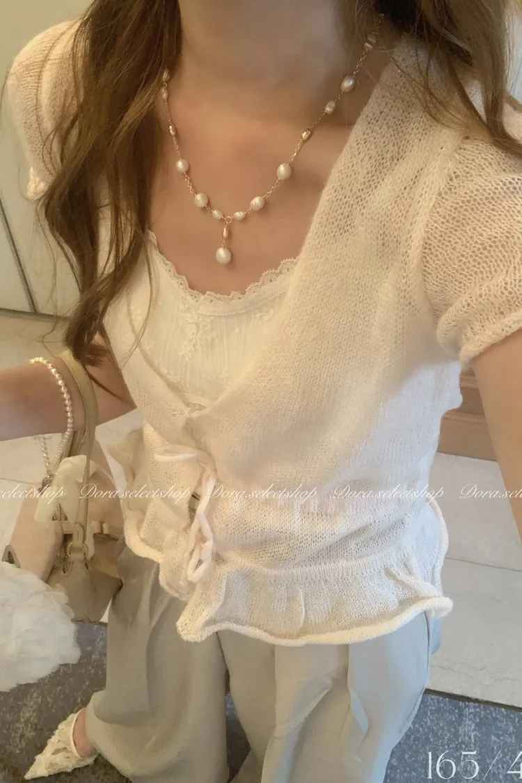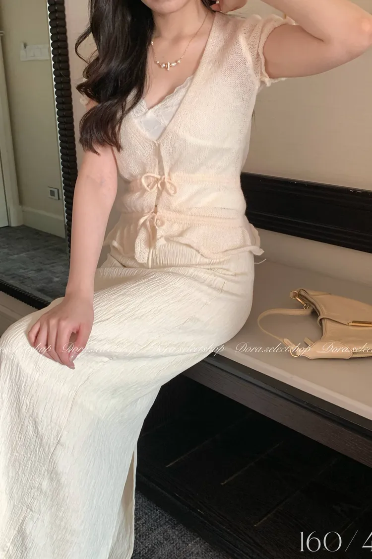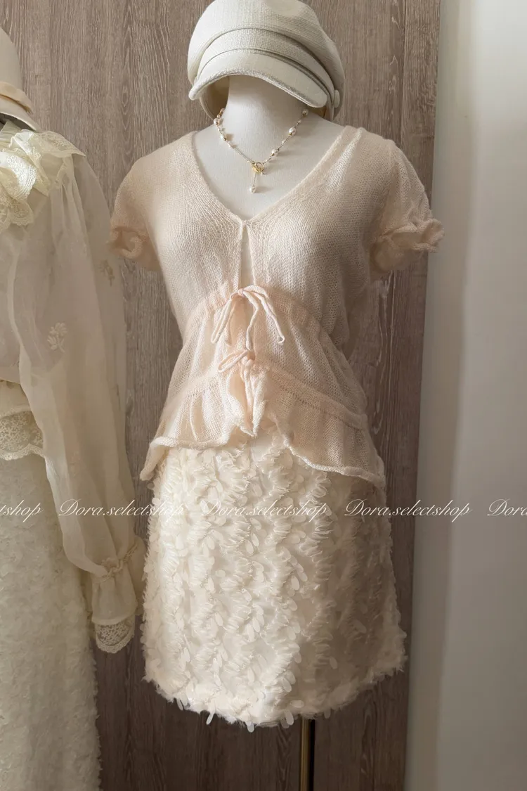 花苞袖薄針織V領綁帶縮腰上衣---米