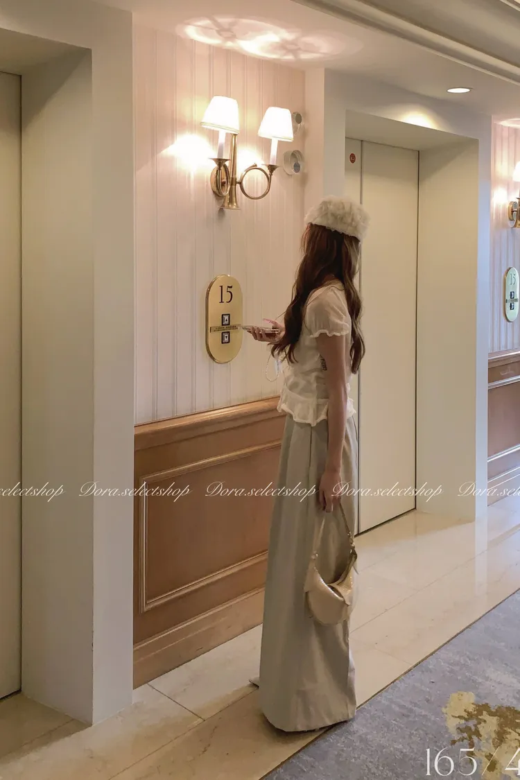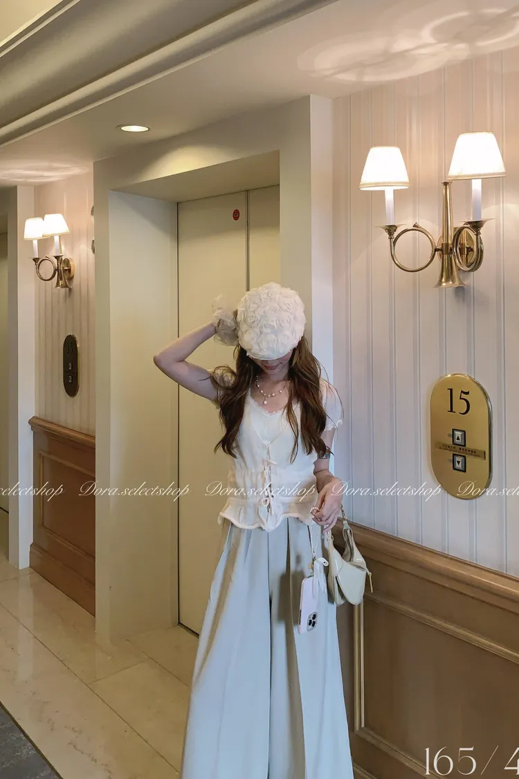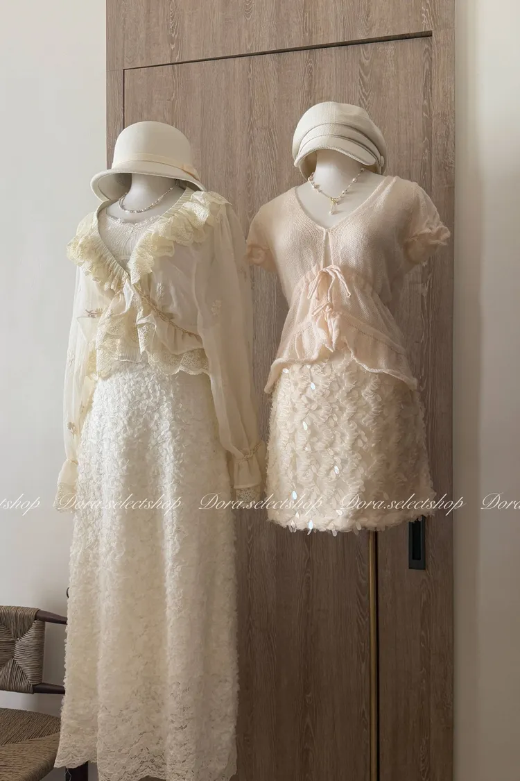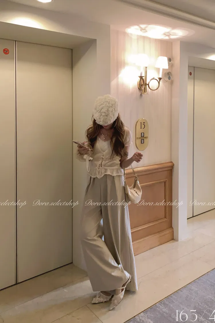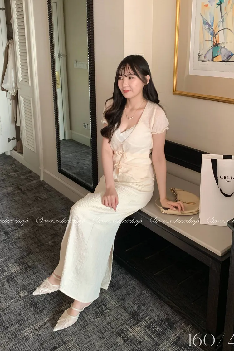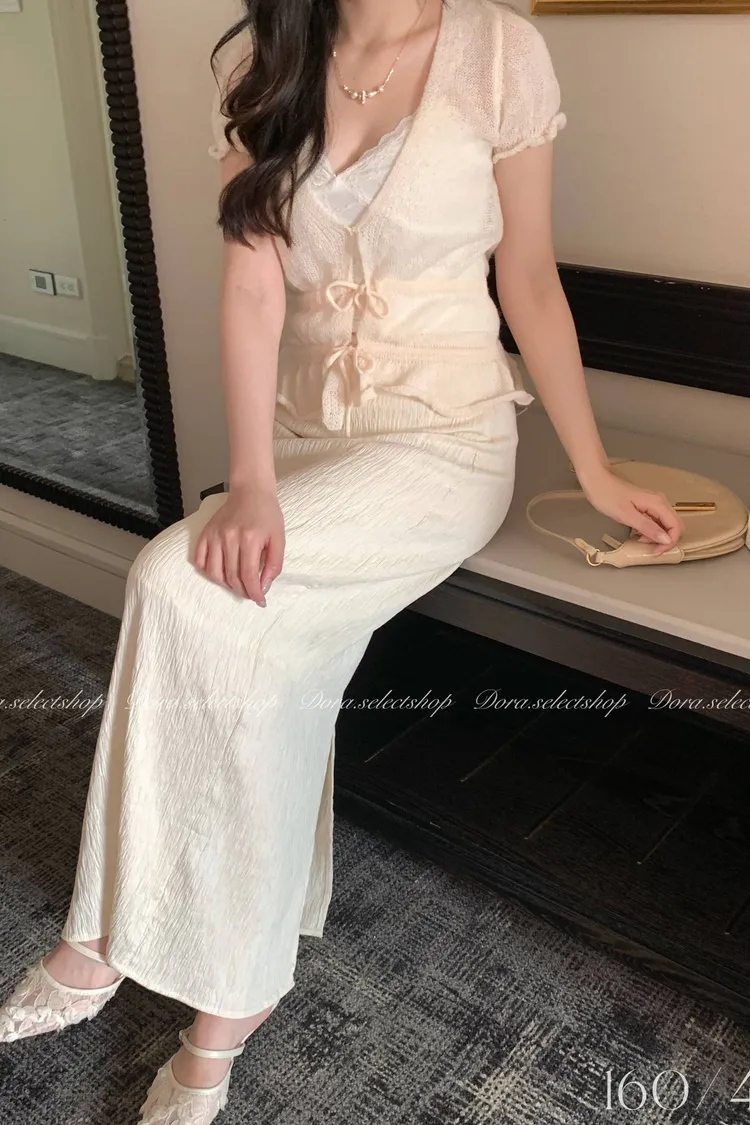 花苞袖薄針織V領綁帶縮腰上衣---米