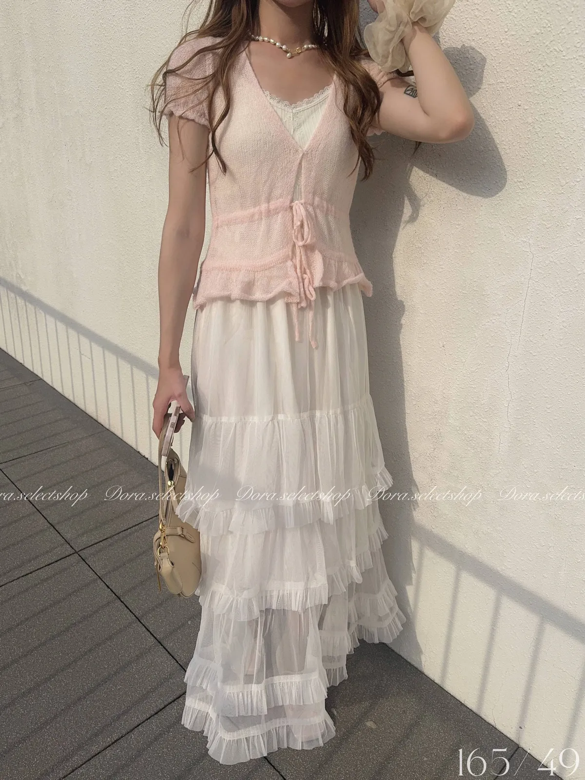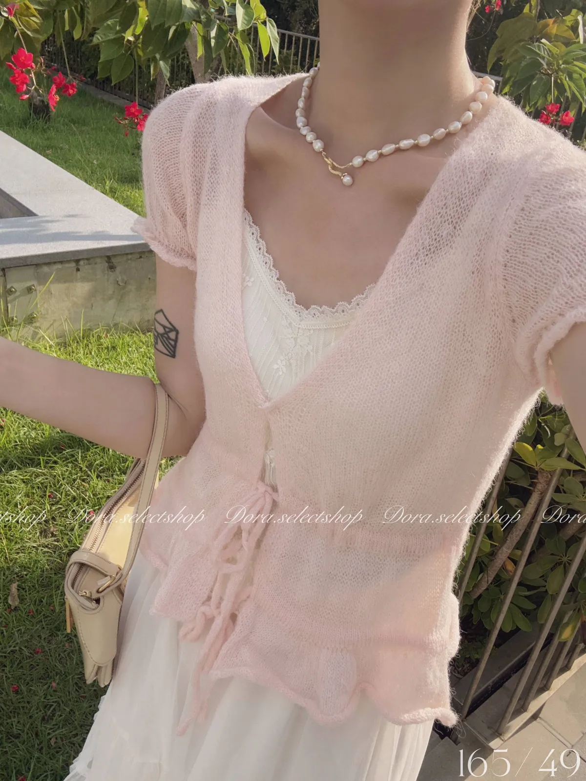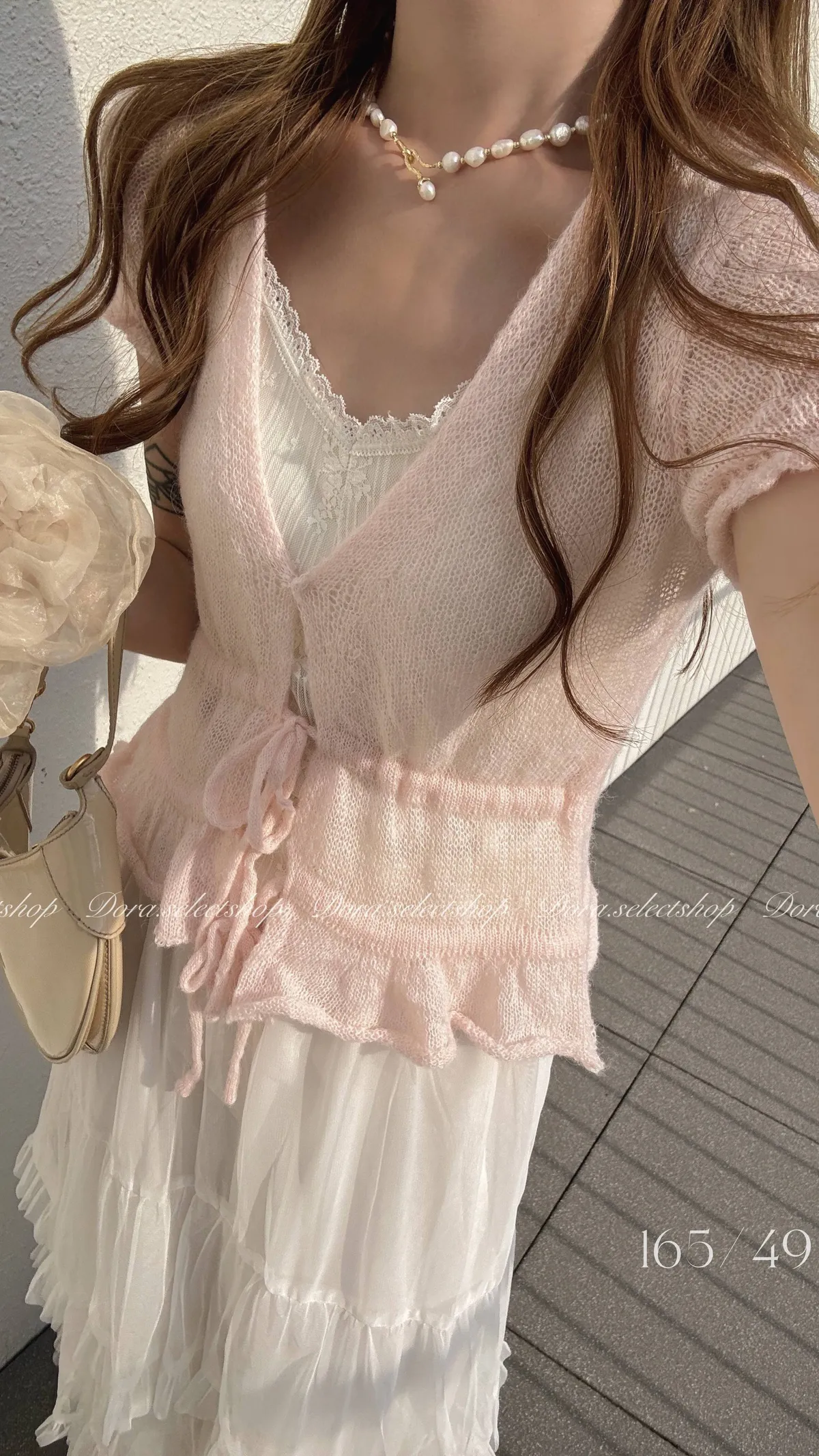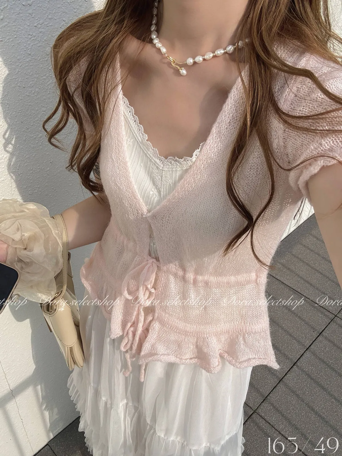 花苞袖薄針織V領綁帶縮腰上衣---淡粉