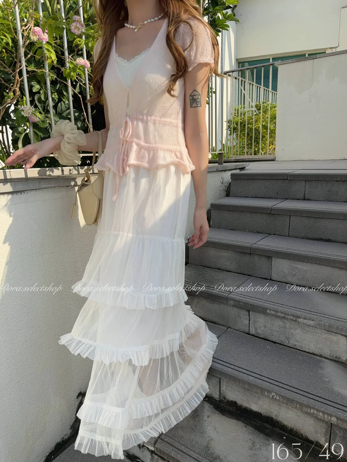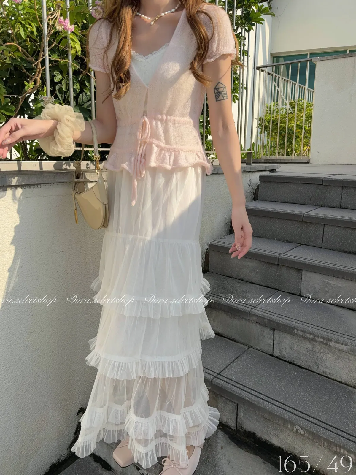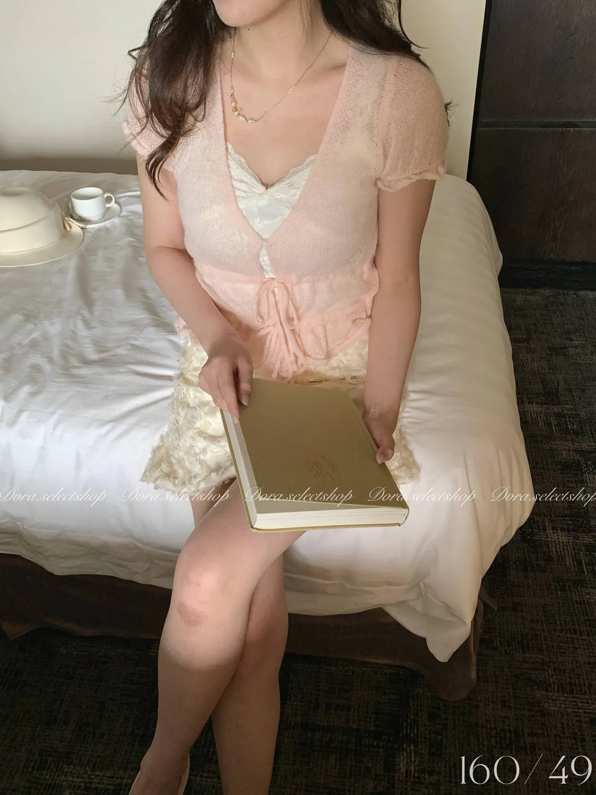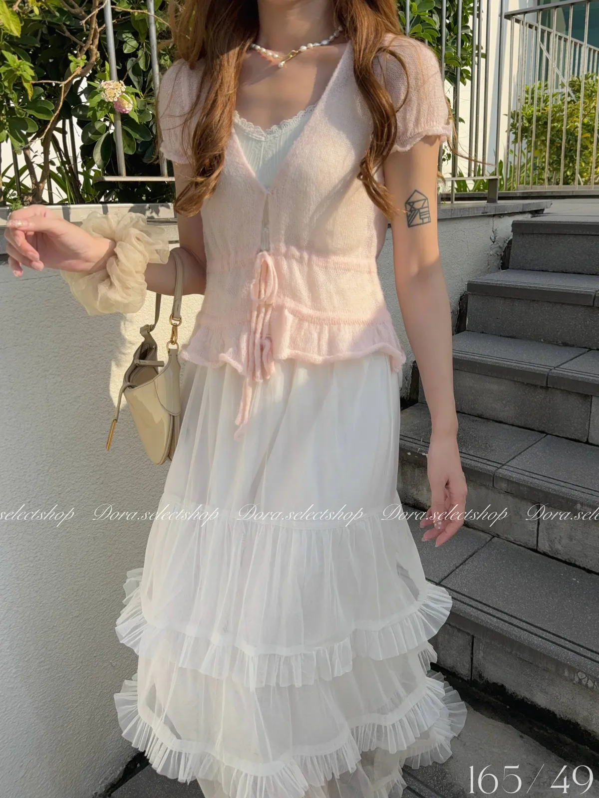 花苞袖薄針織V領綁帶縮腰上衣---淡粉