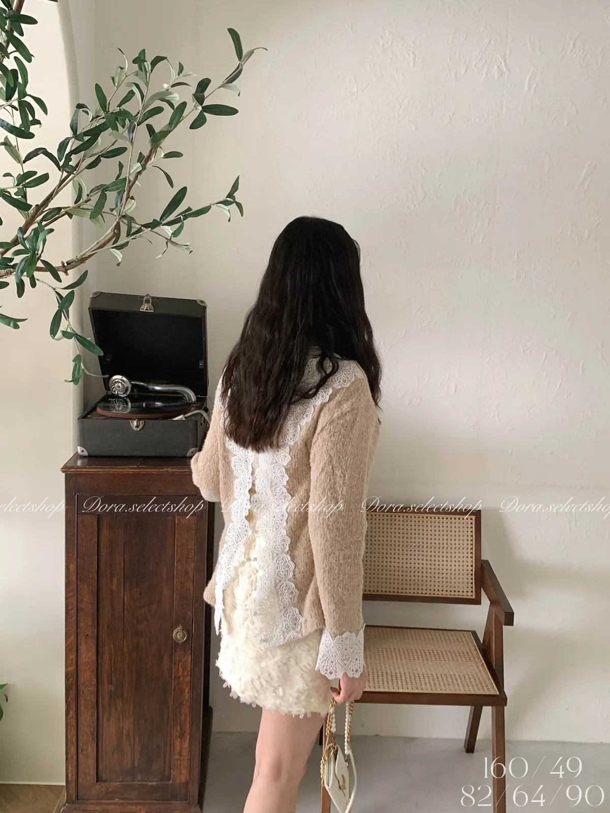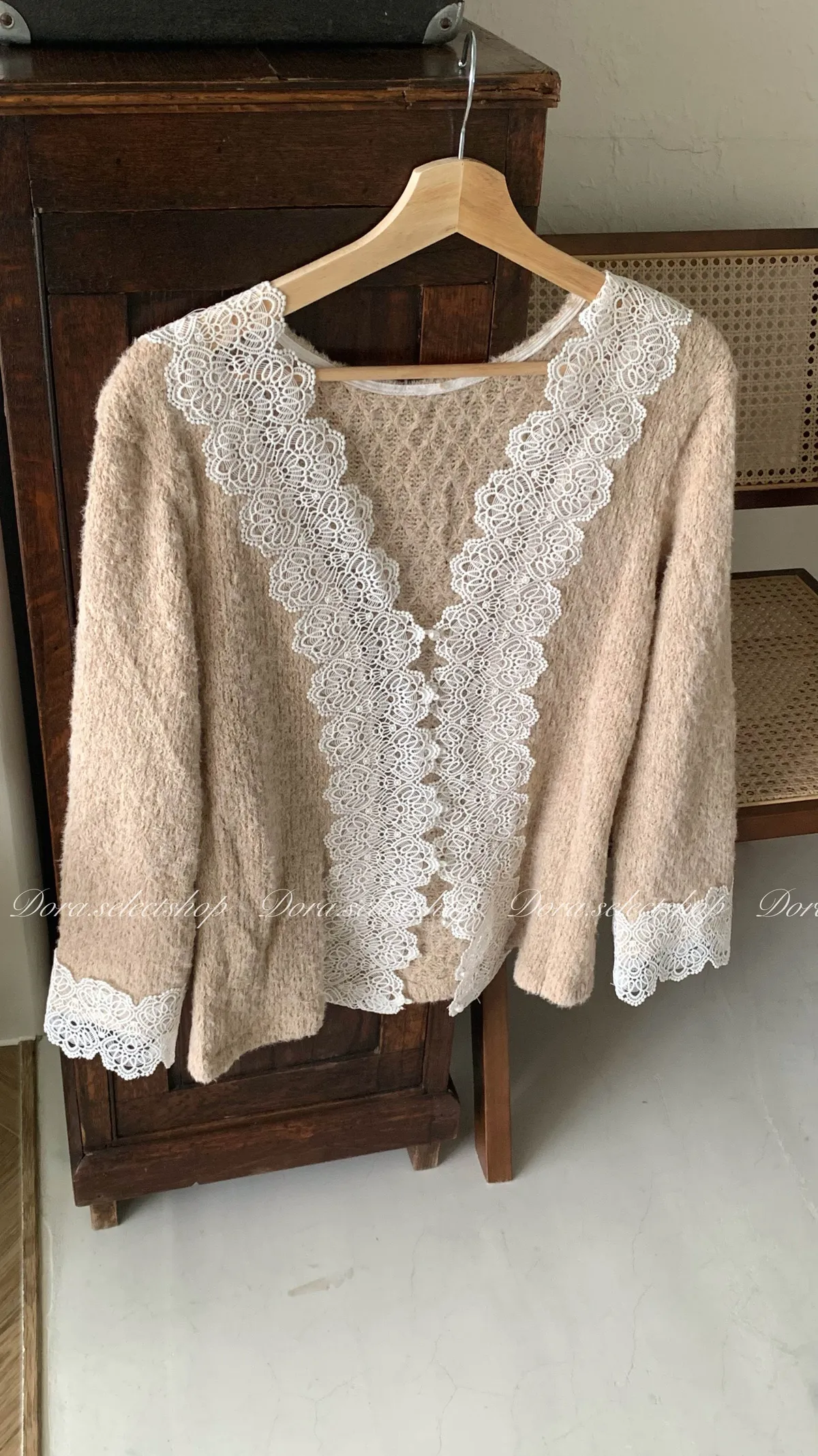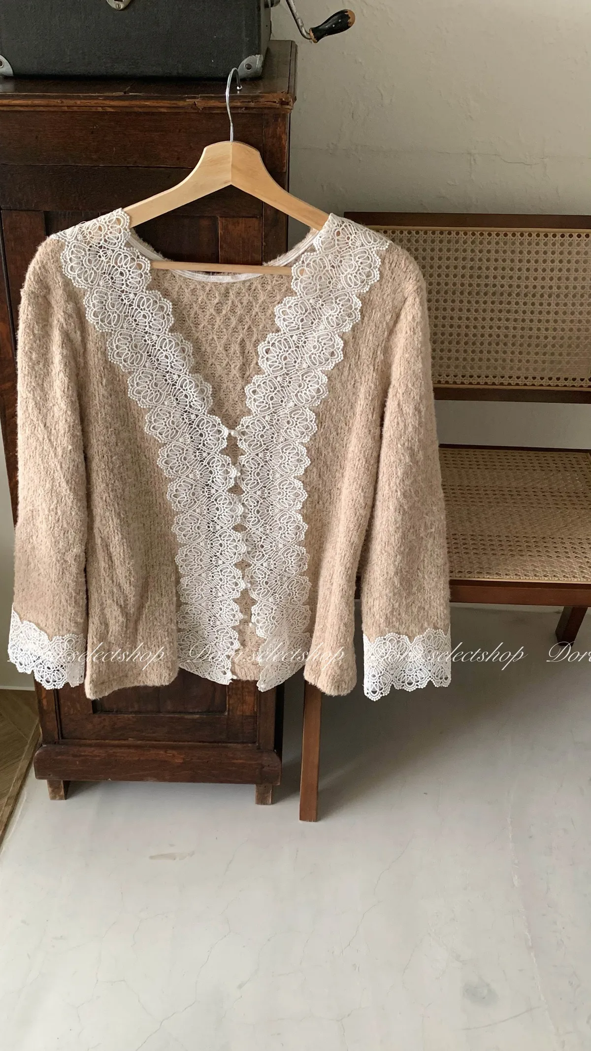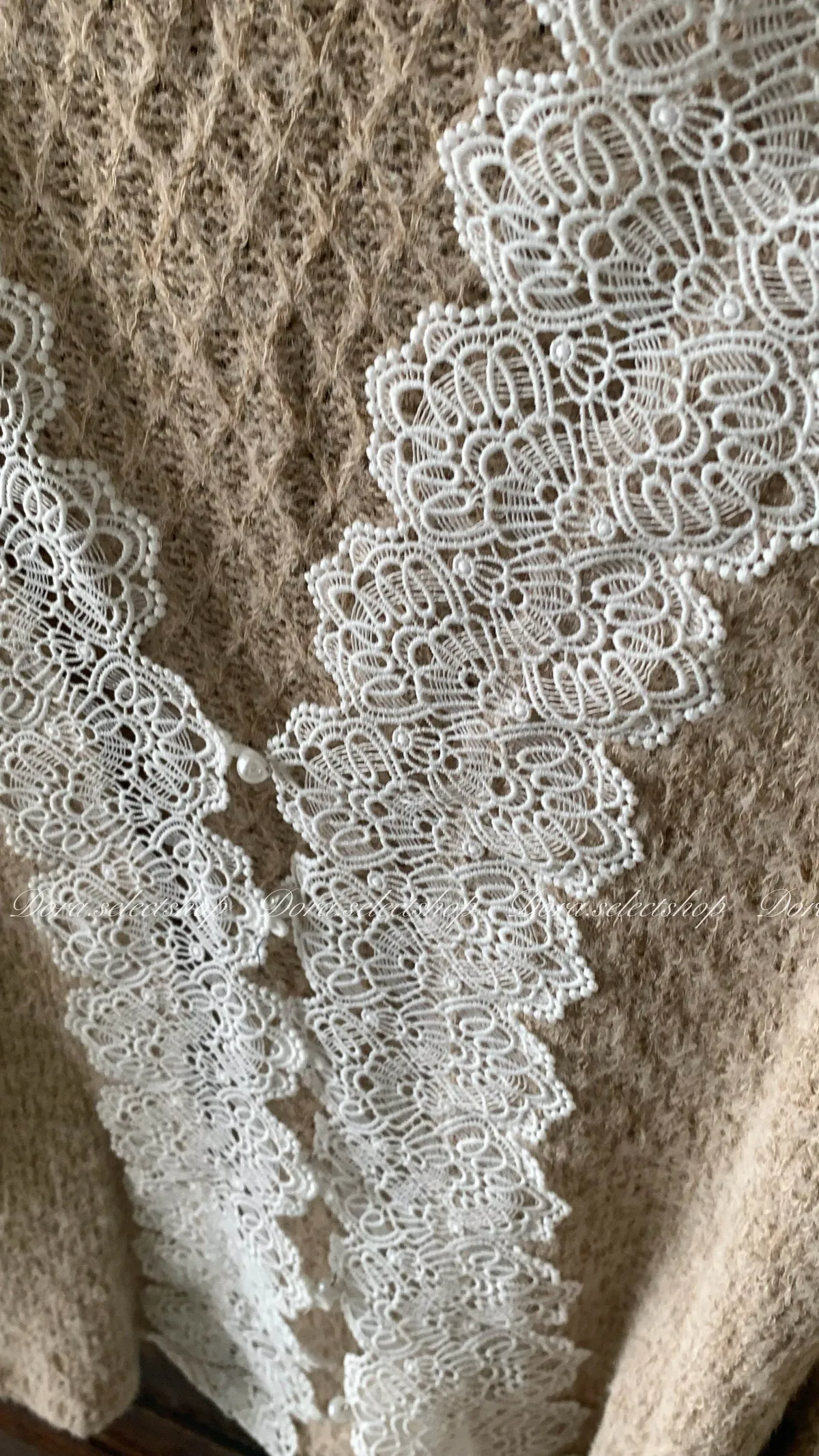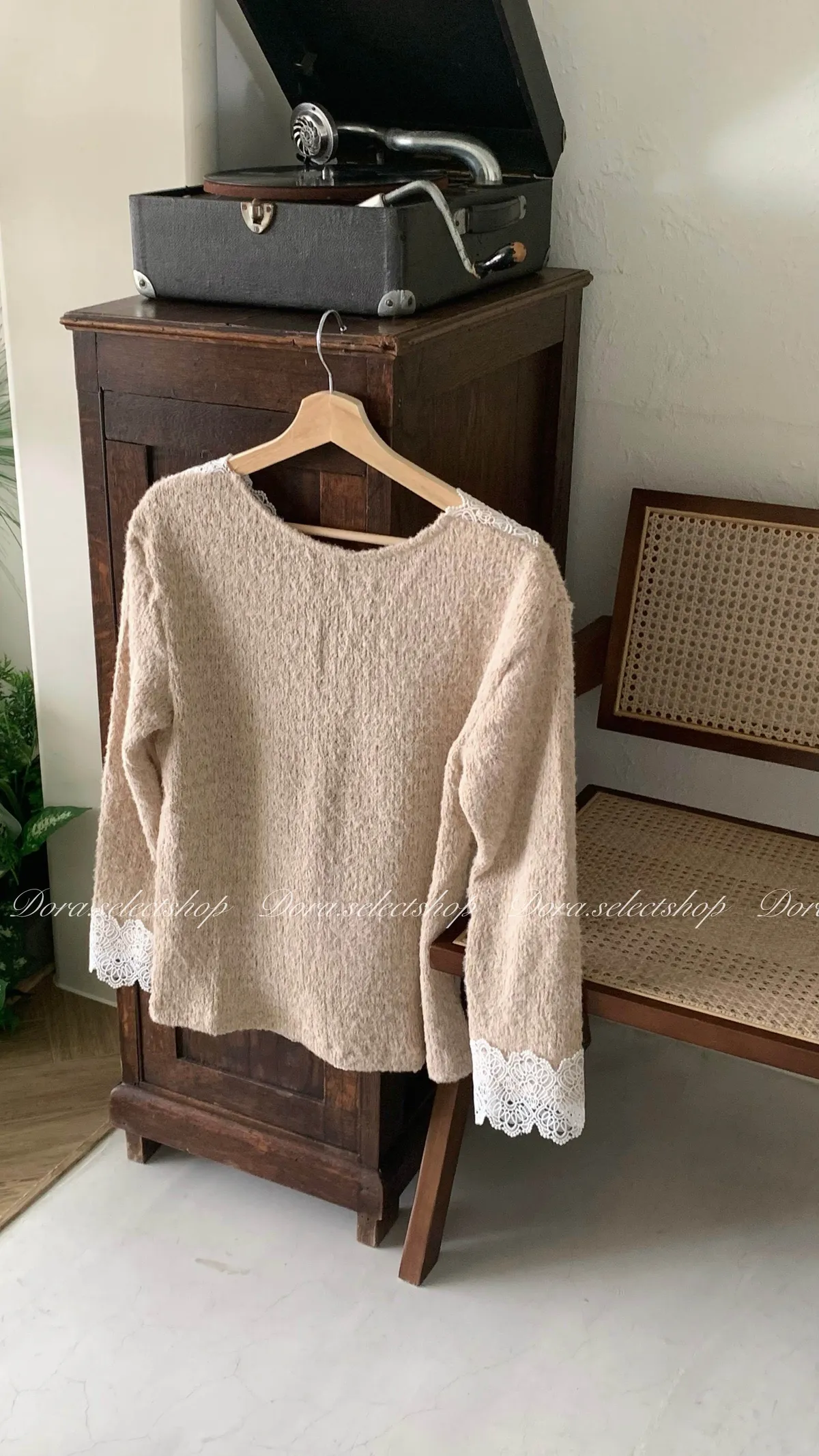 兩面穿珍珠釦蕾絲邊上衣---燕麥