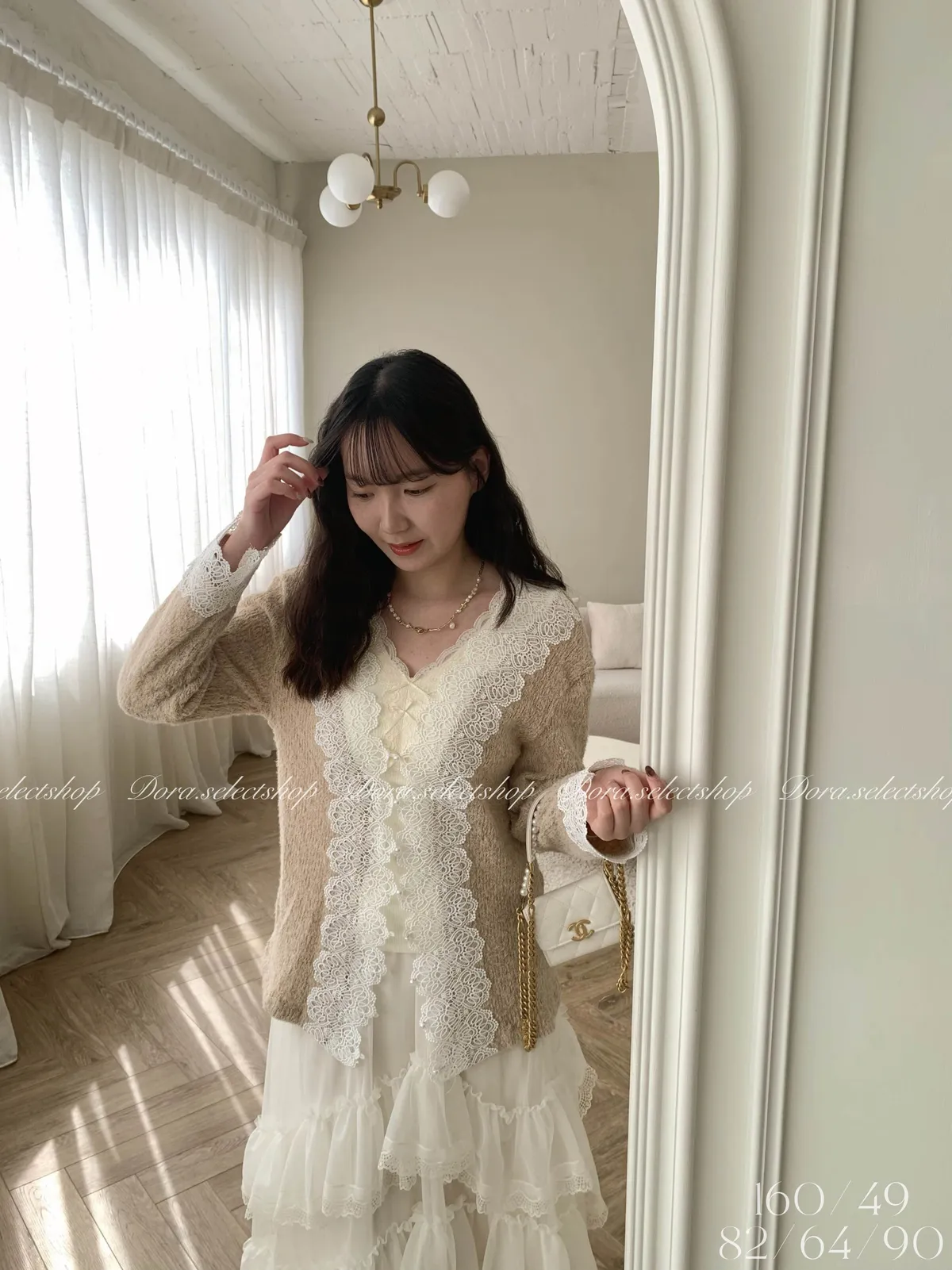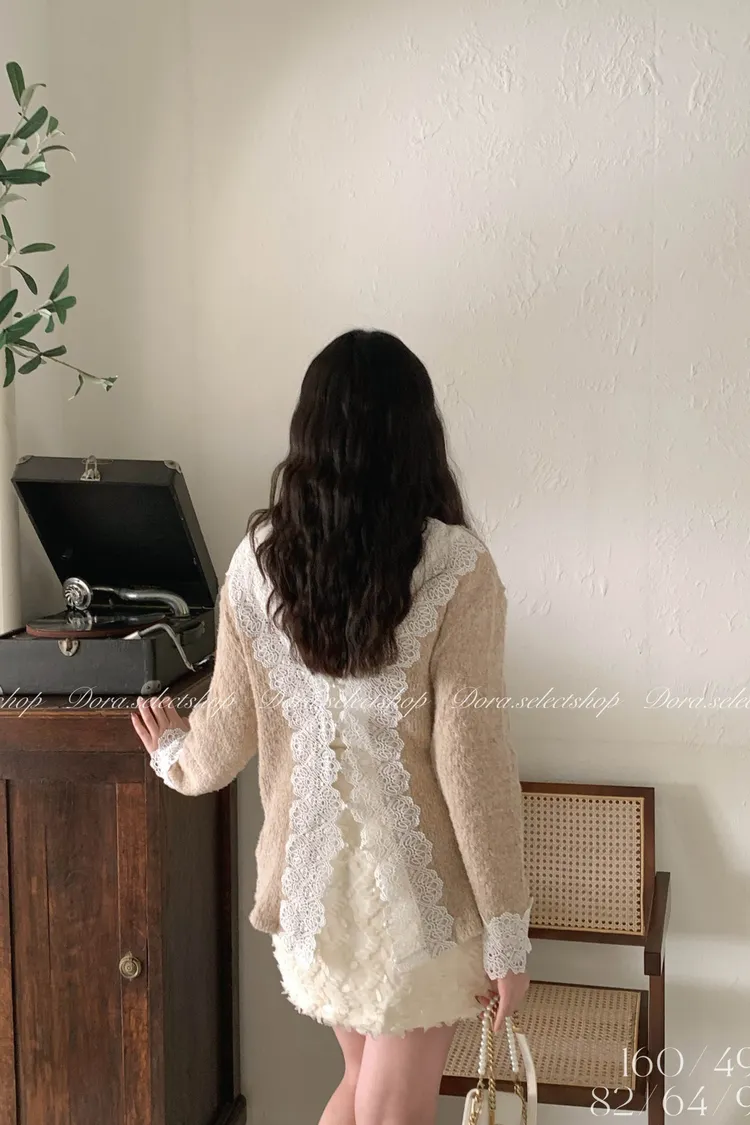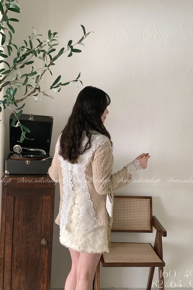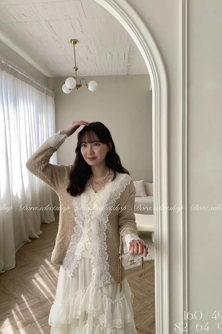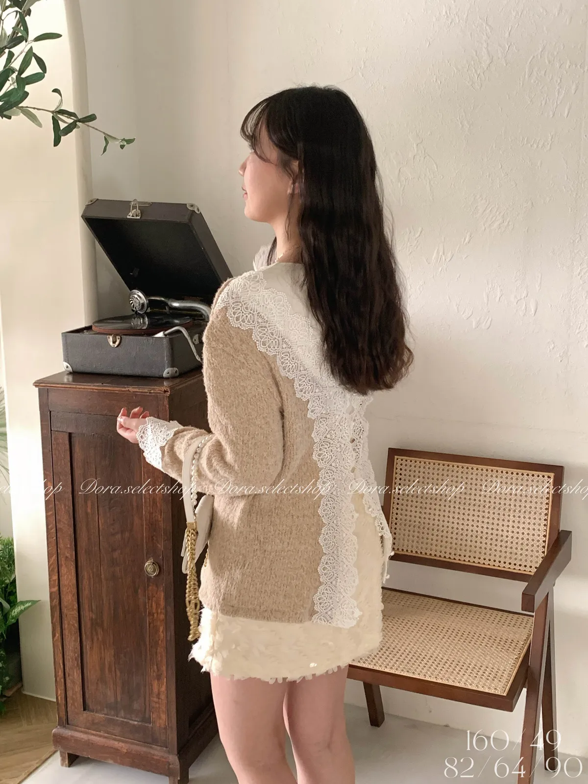 兩面穿珍珠釦蕾絲邊上衣---燕麥