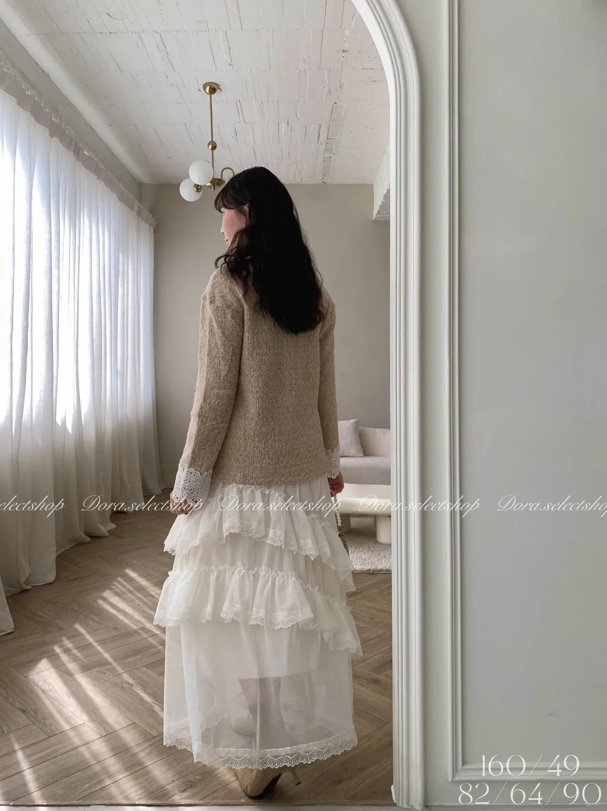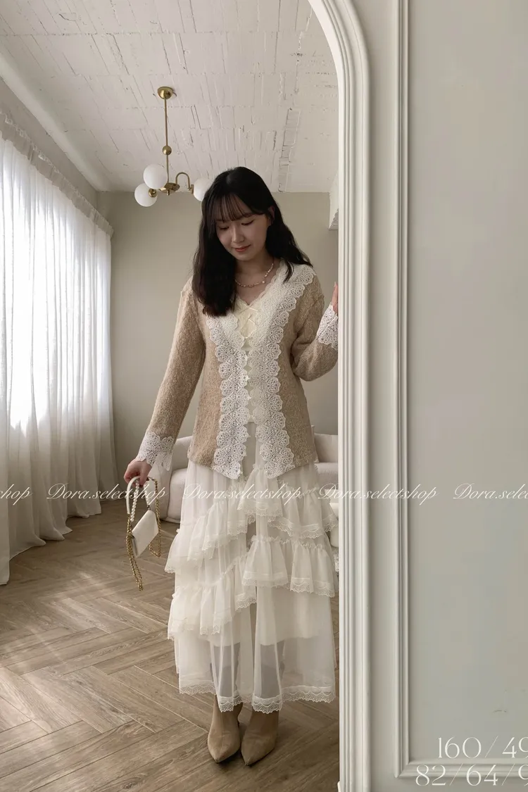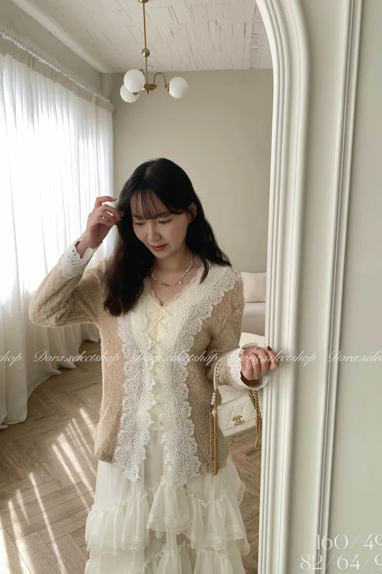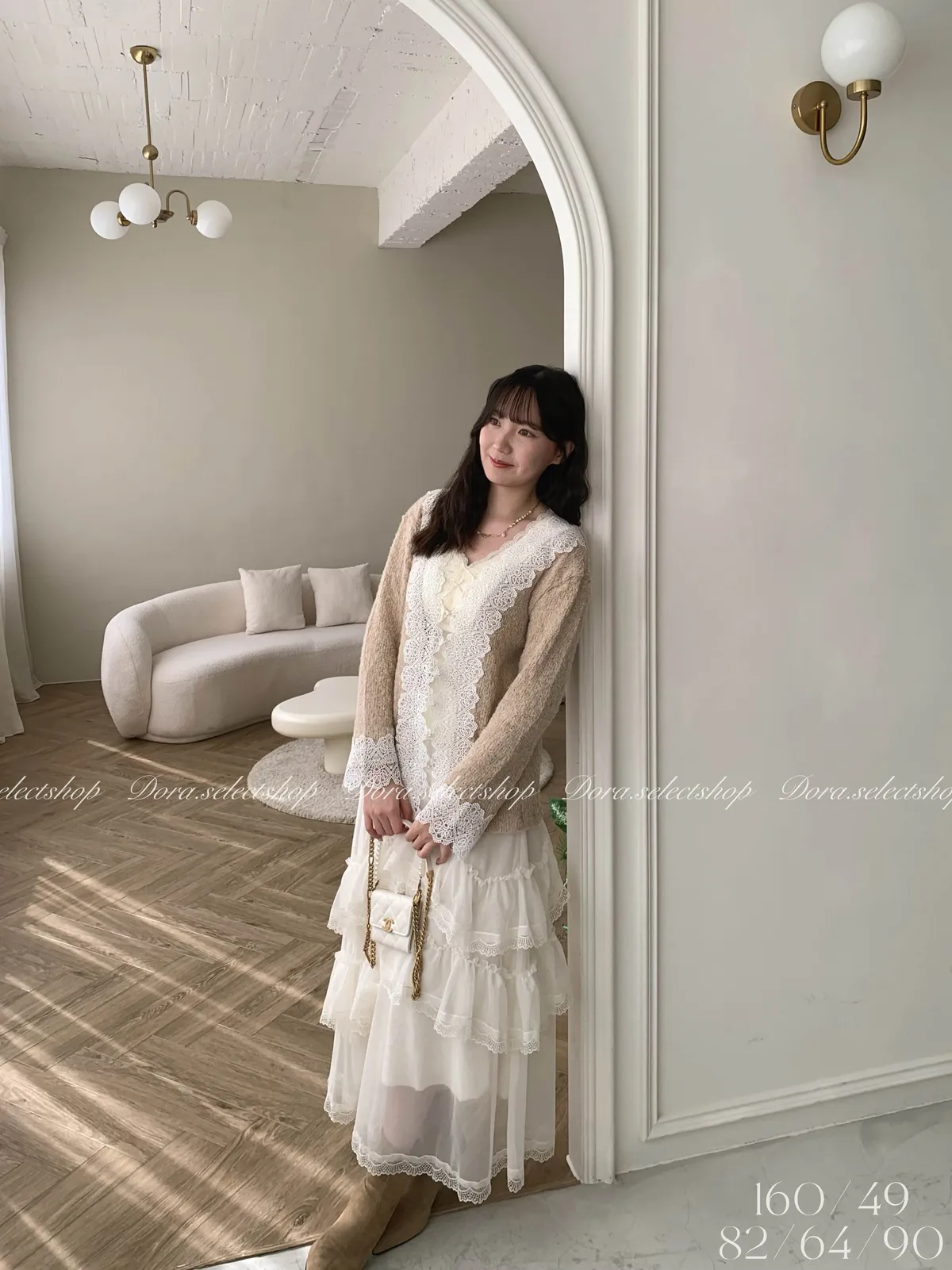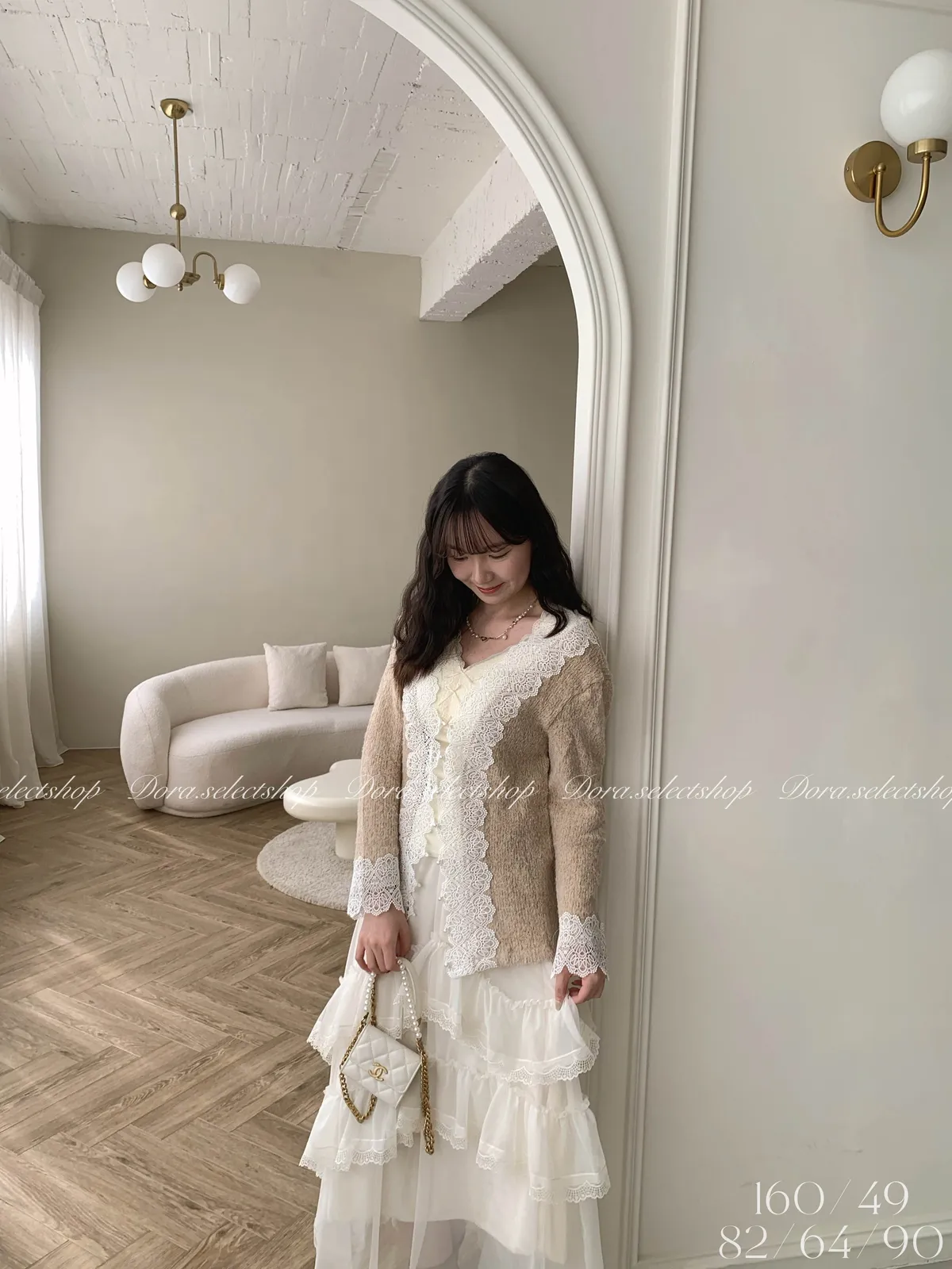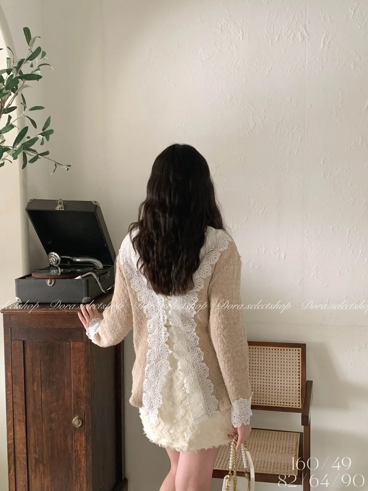 兩面穿珍珠釦蕾絲邊上衣---燕麥