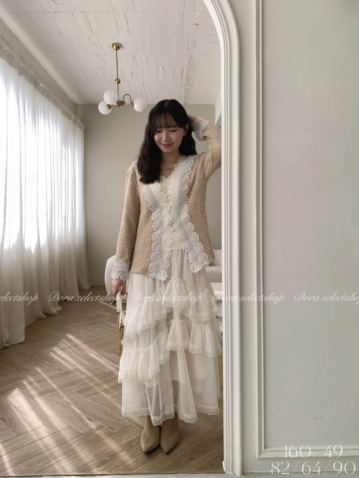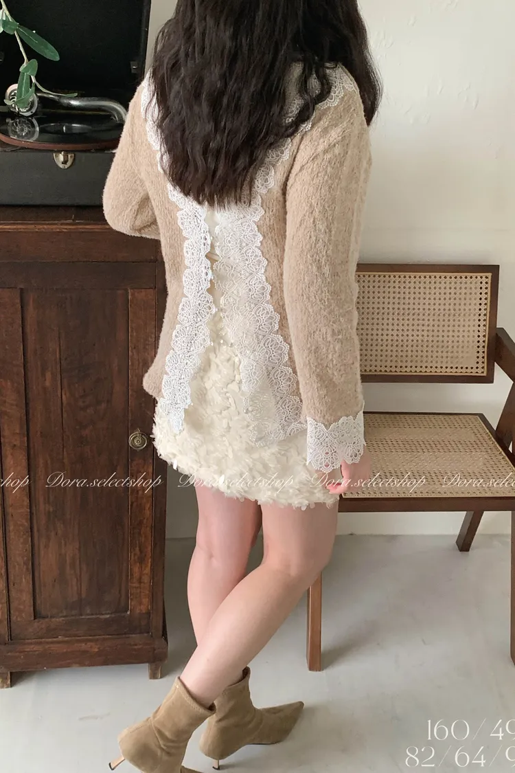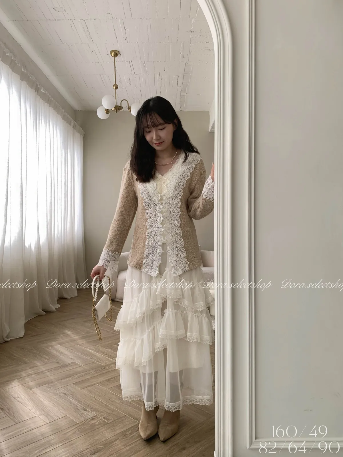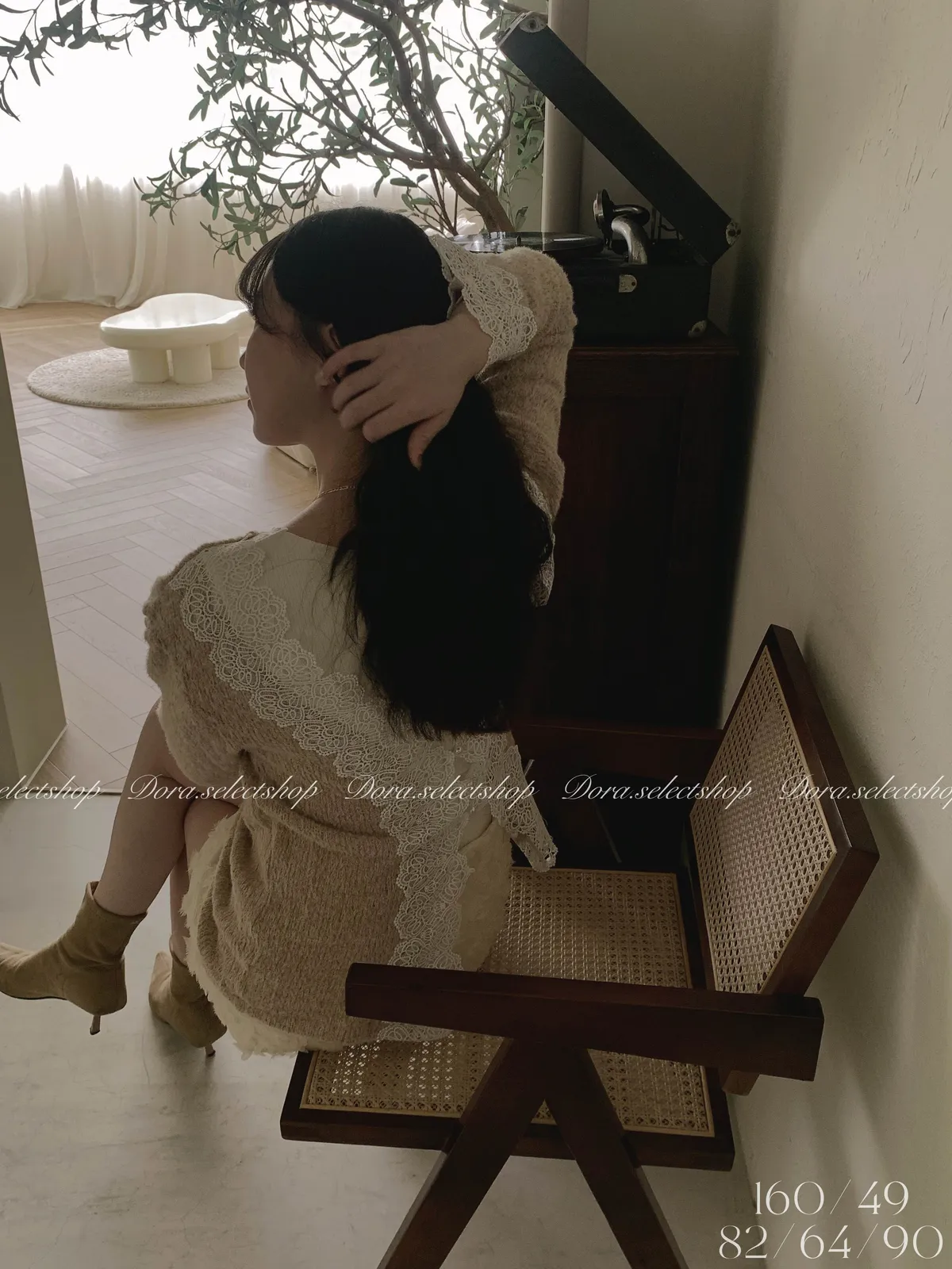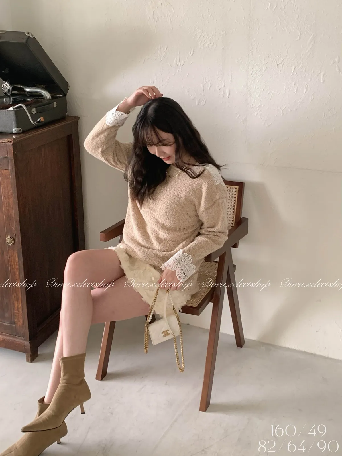 兩面穿珍珠釦蕾絲邊上衣---燕麥