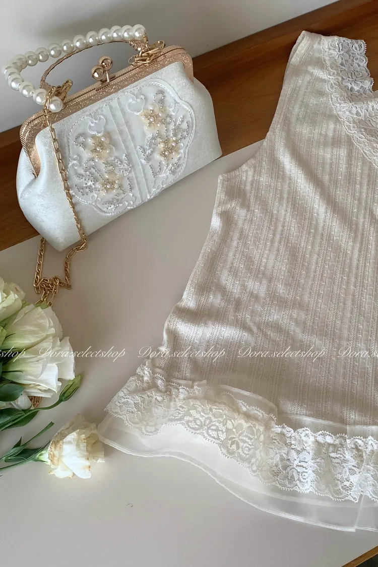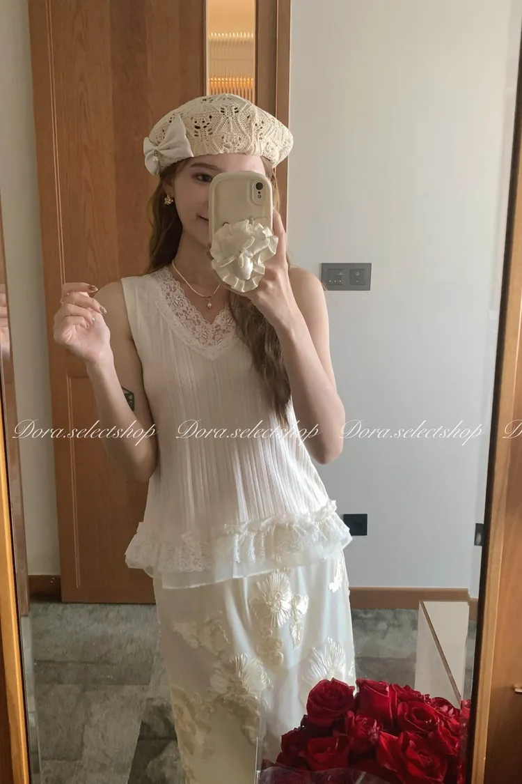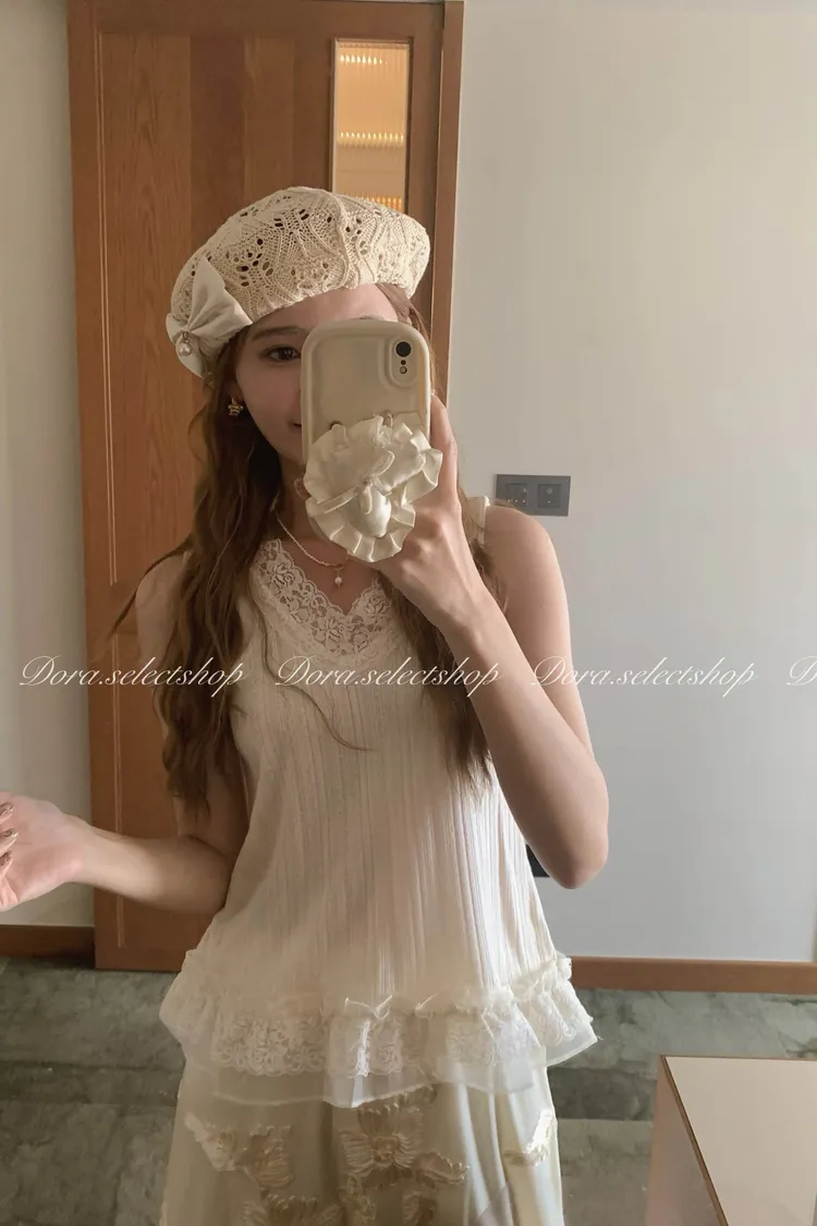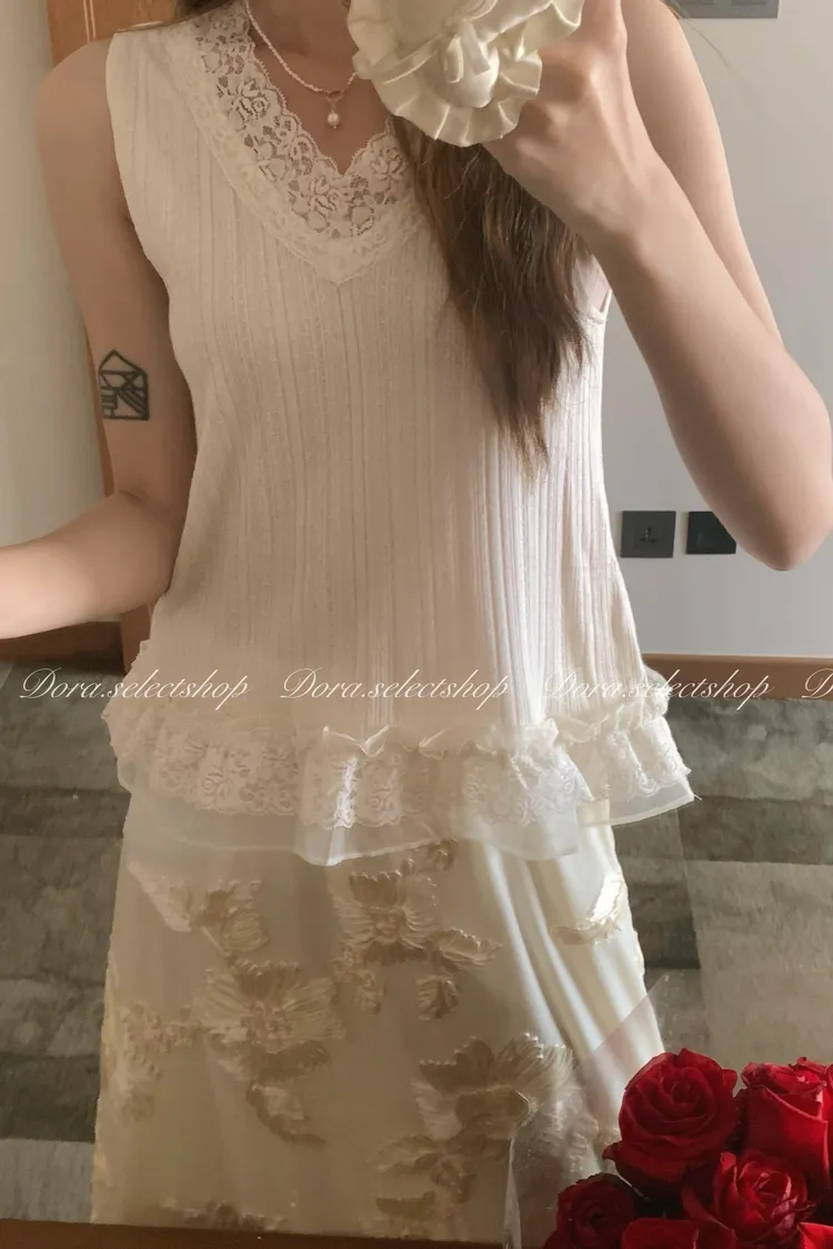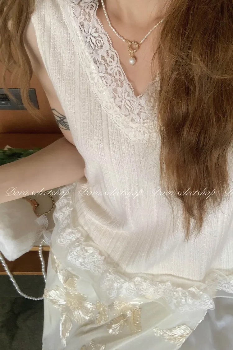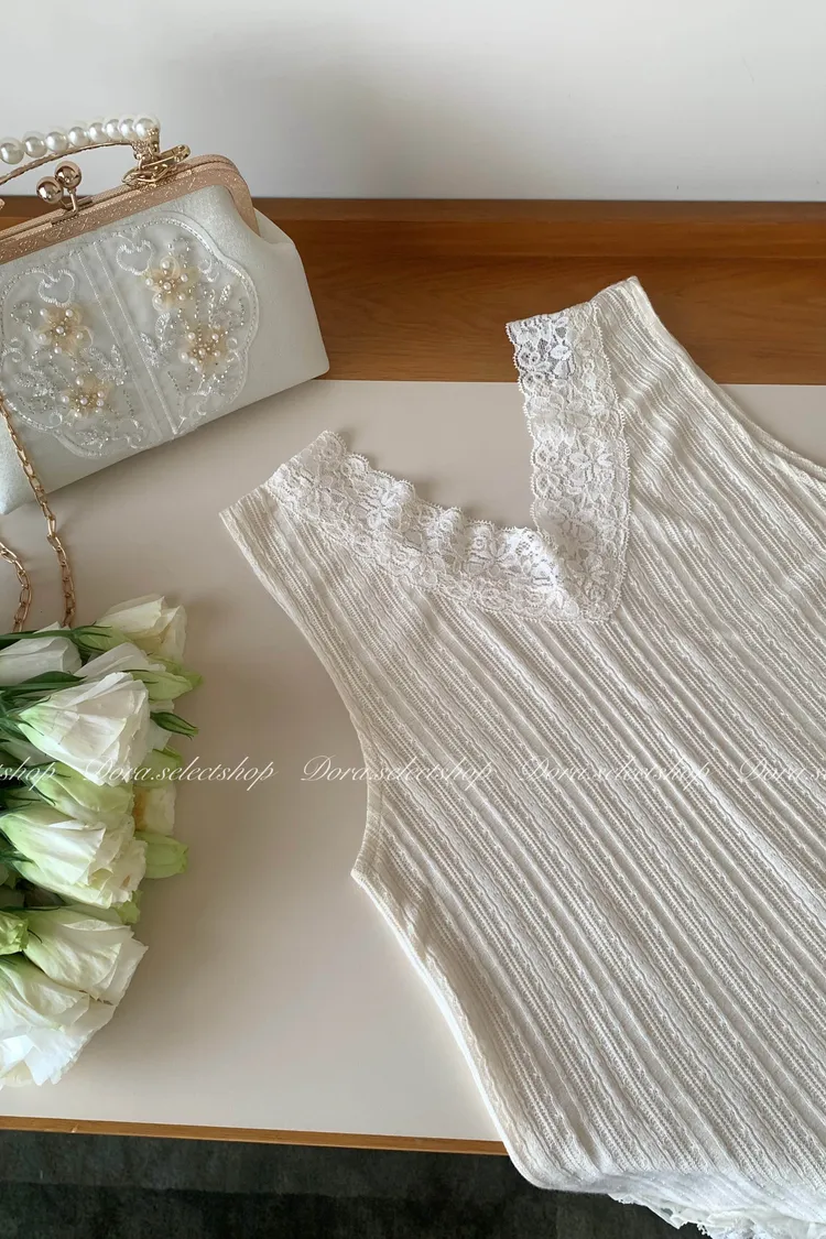 細節優雅蕾絲拼接薄針織背心---米