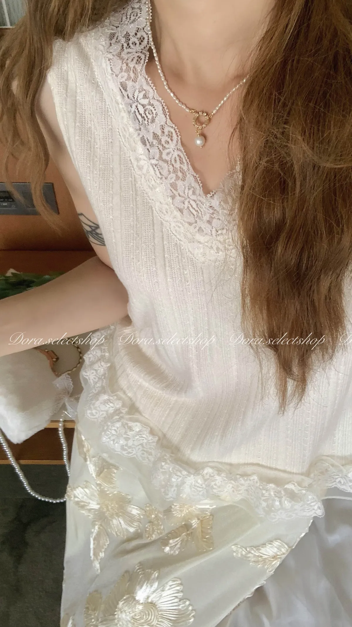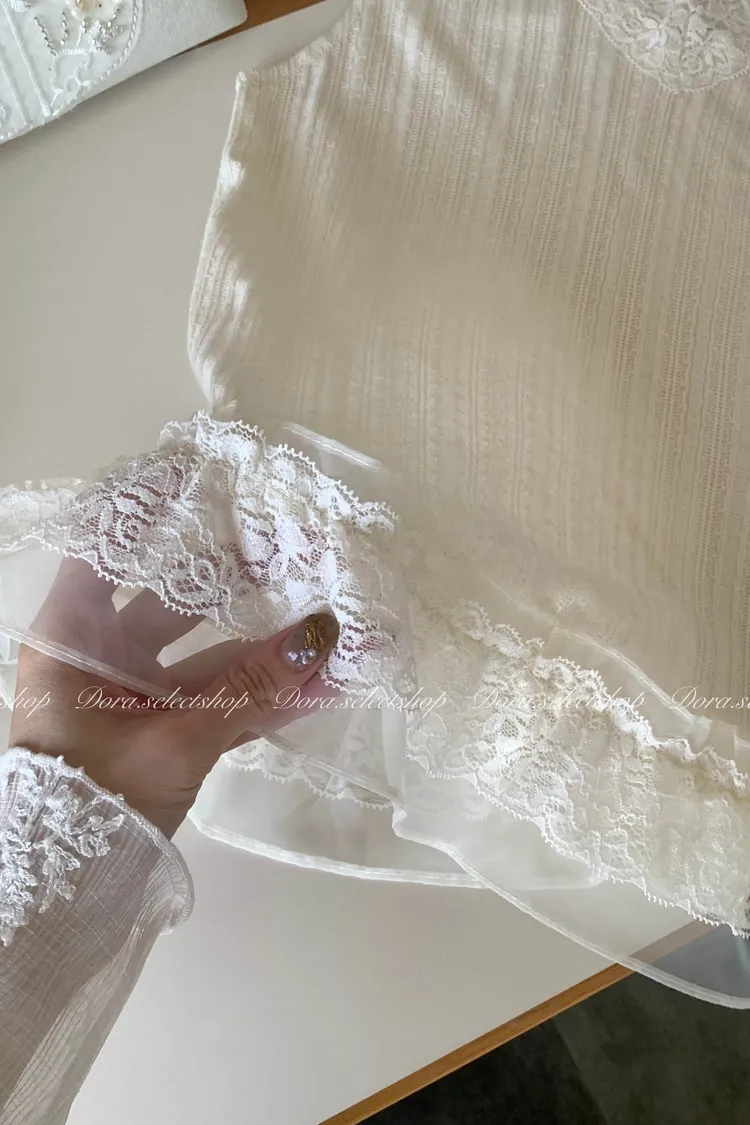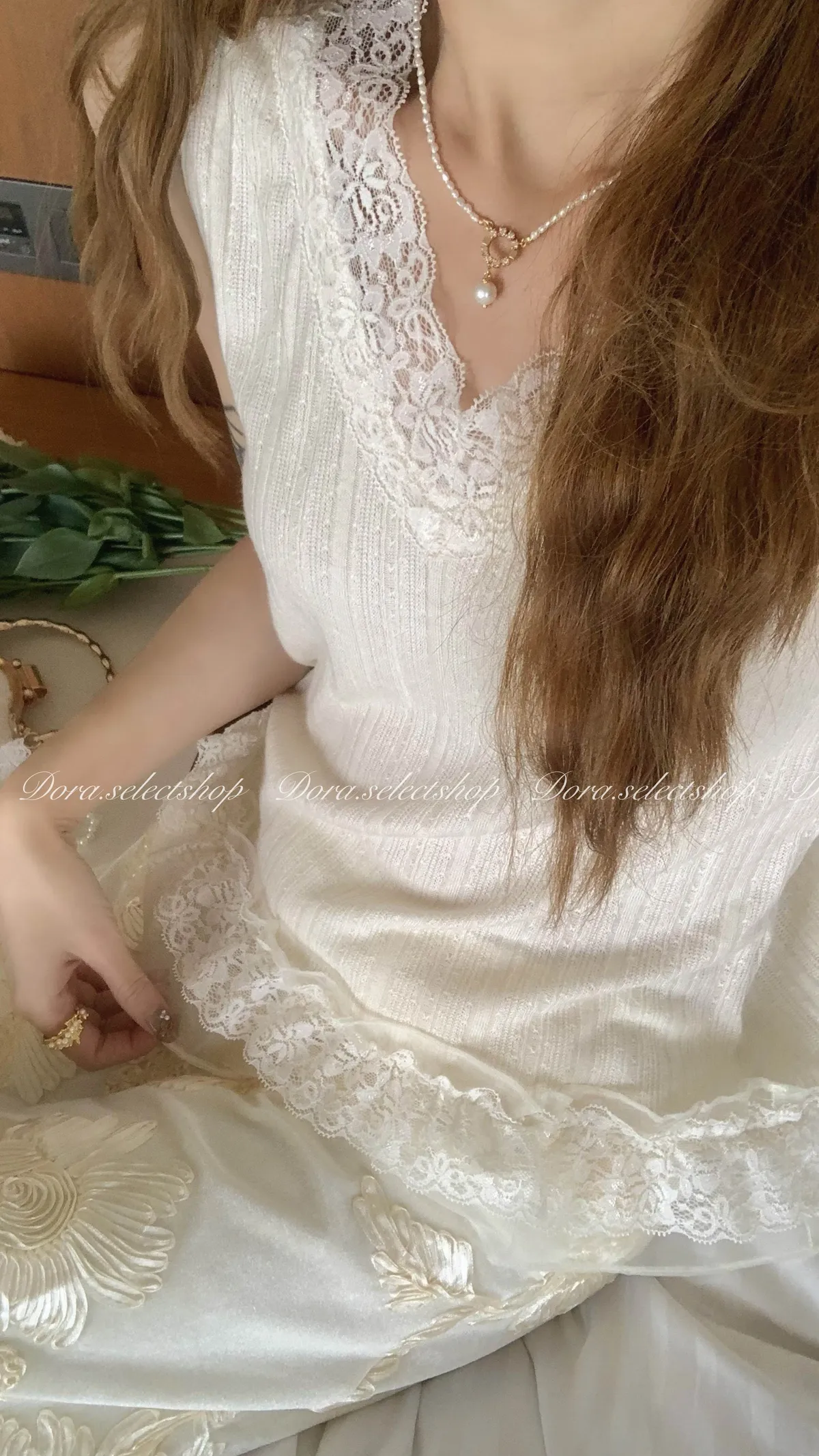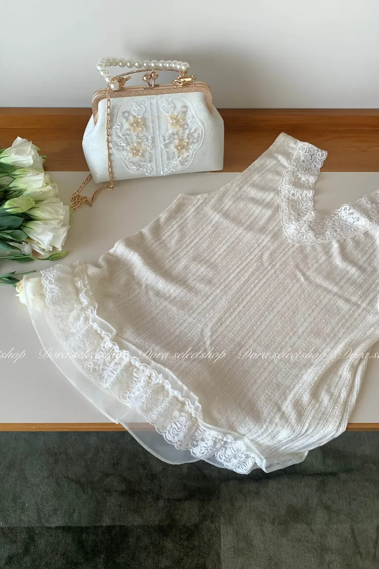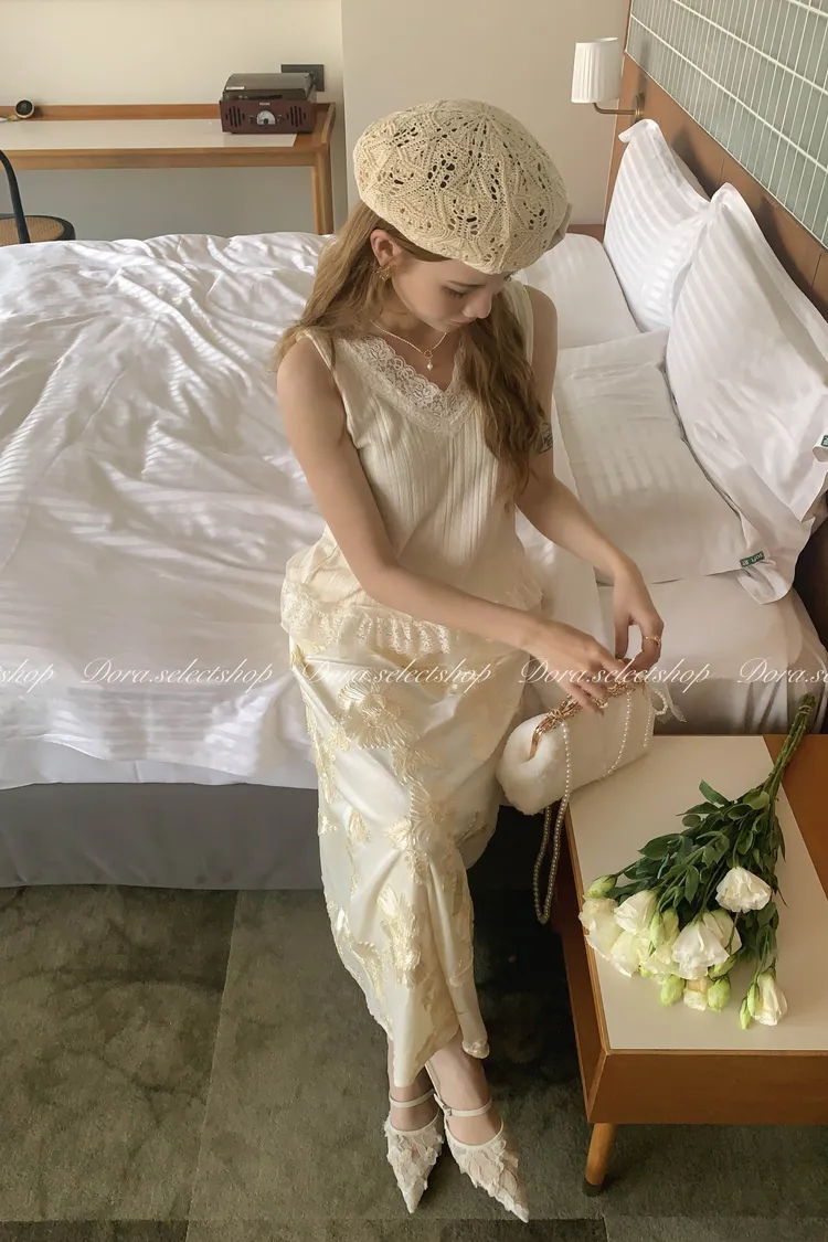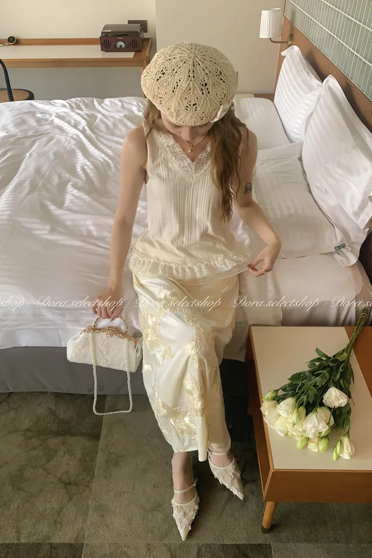 細節優雅蕾絲拼接薄針織背心---米
