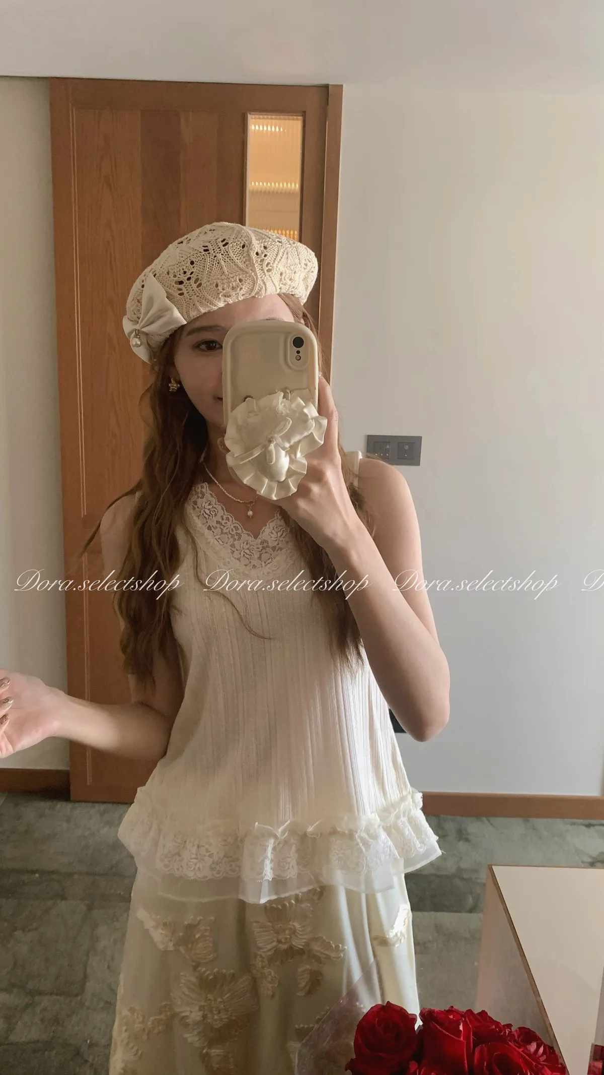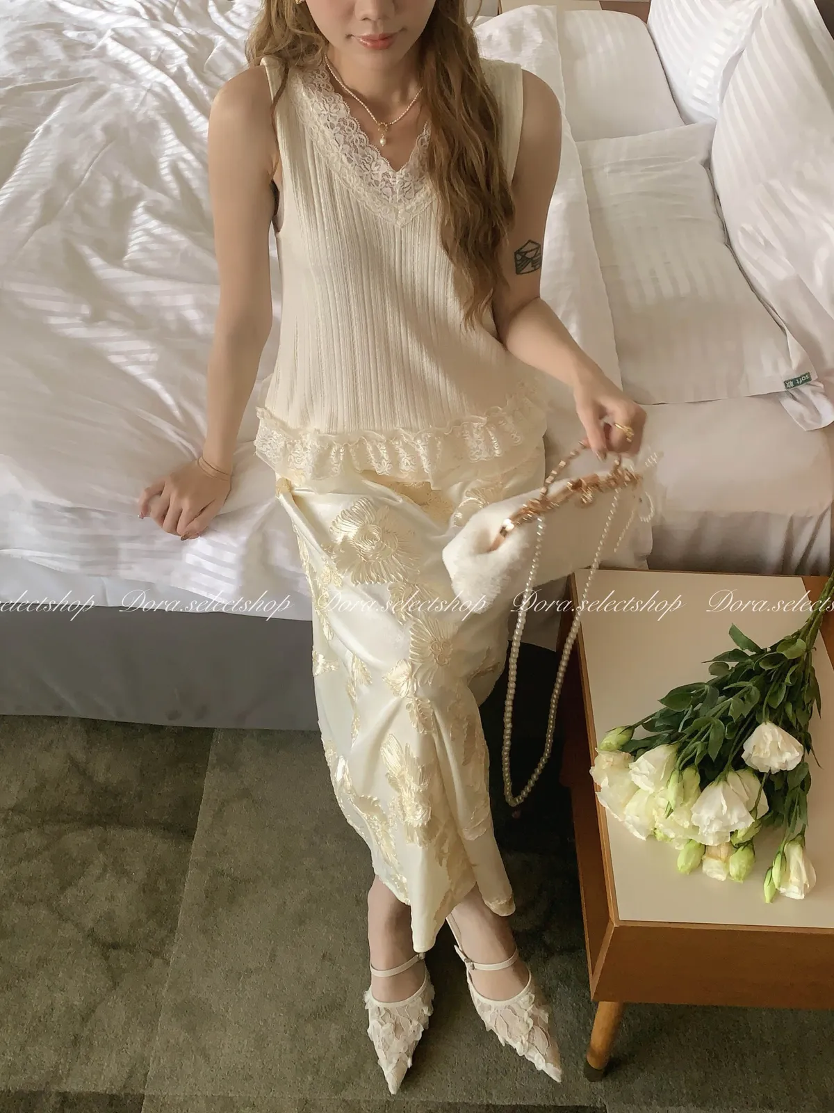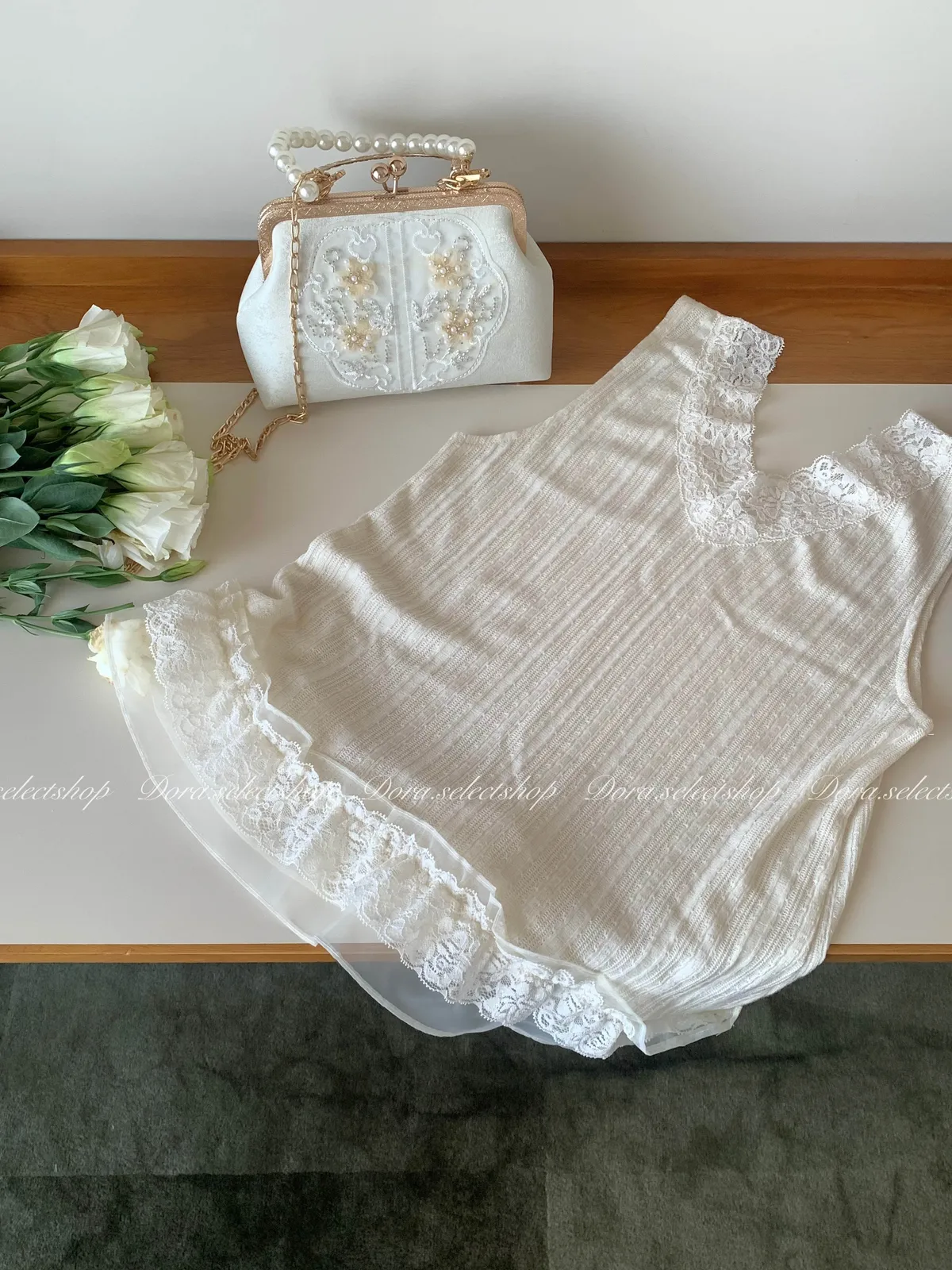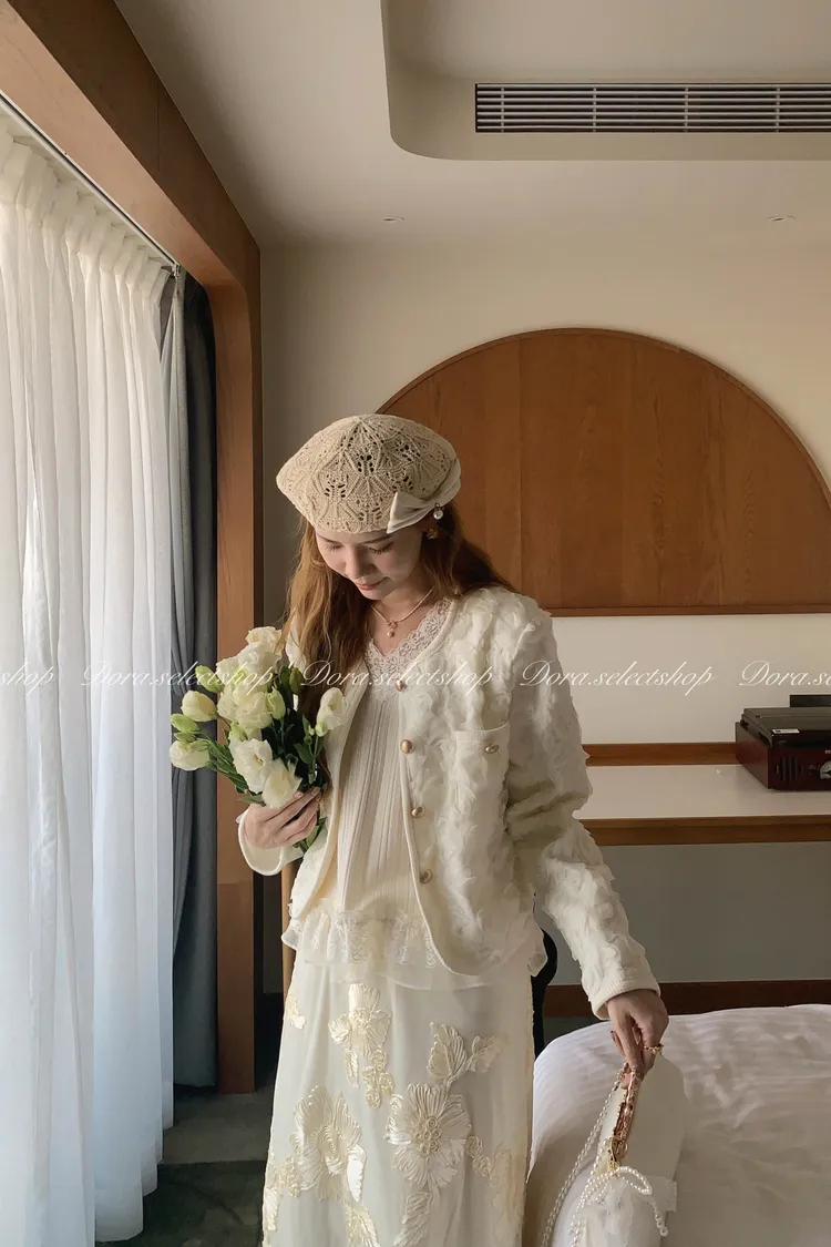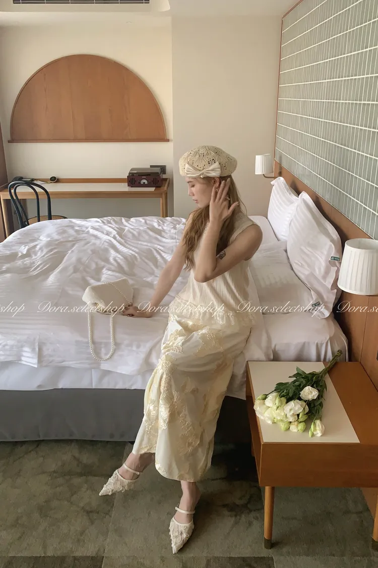 細節優雅蕾絲拼接薄針織背心---米