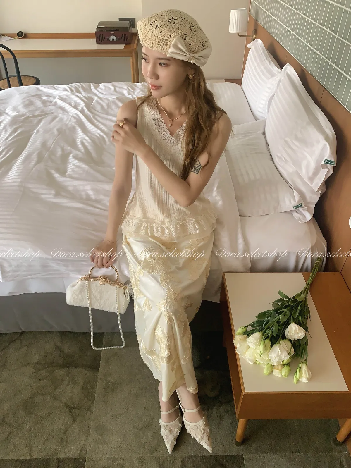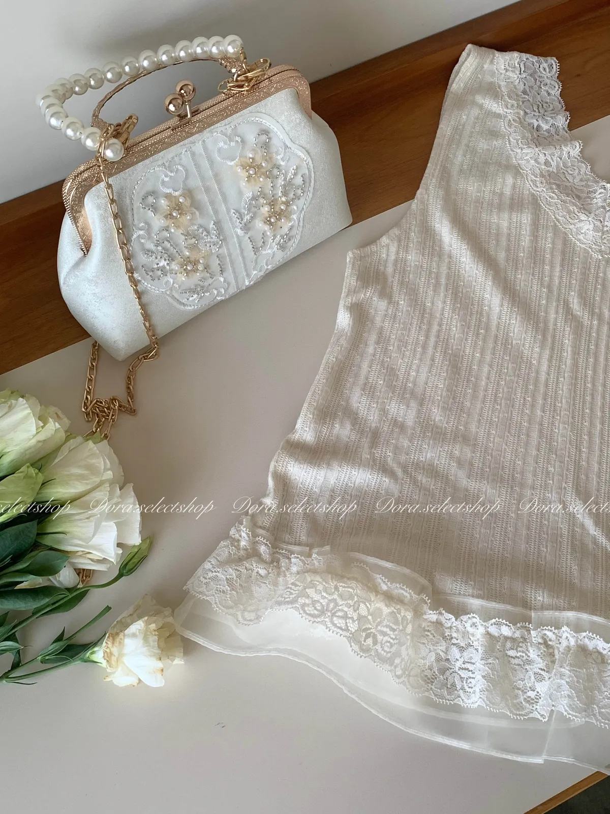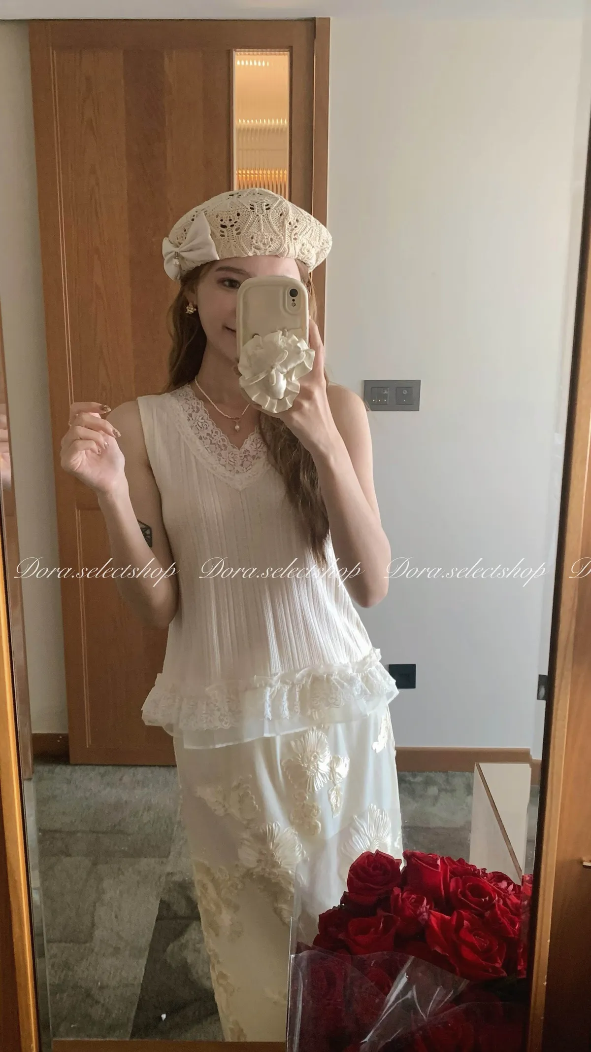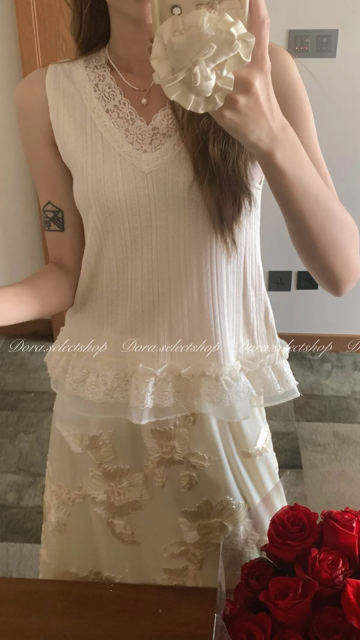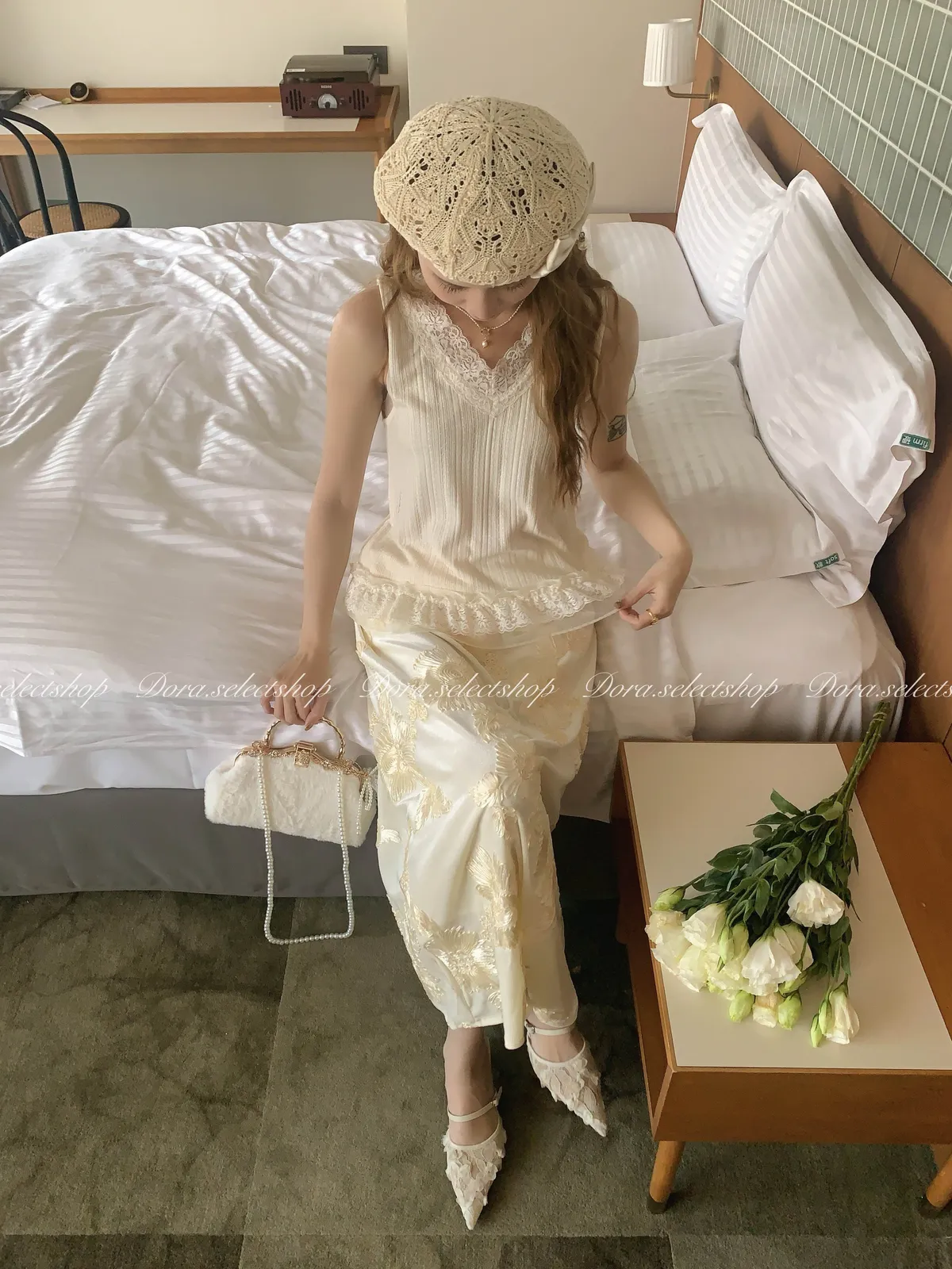 細節優雅蕾絲拼接薄針織背心---米