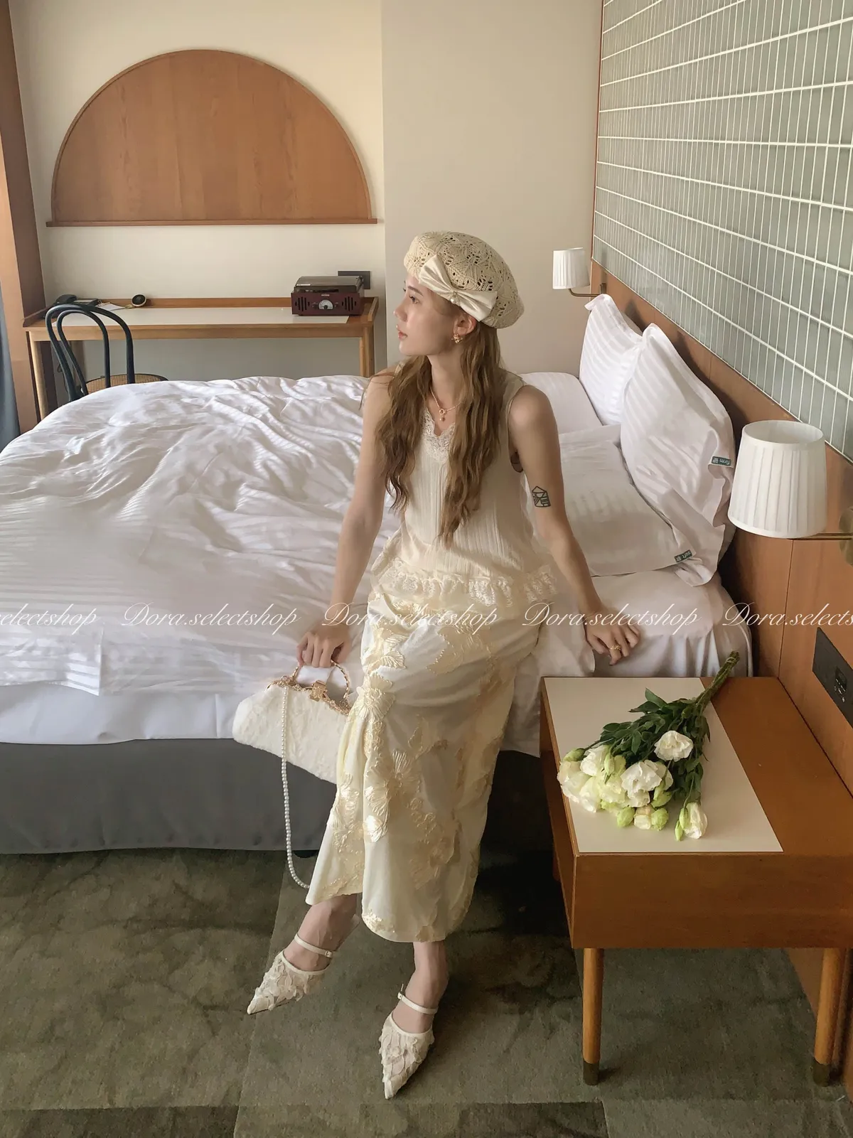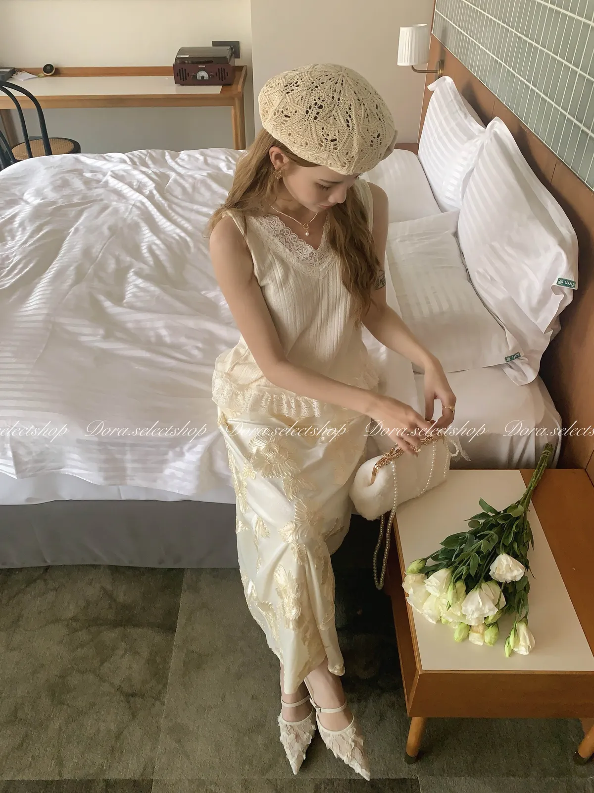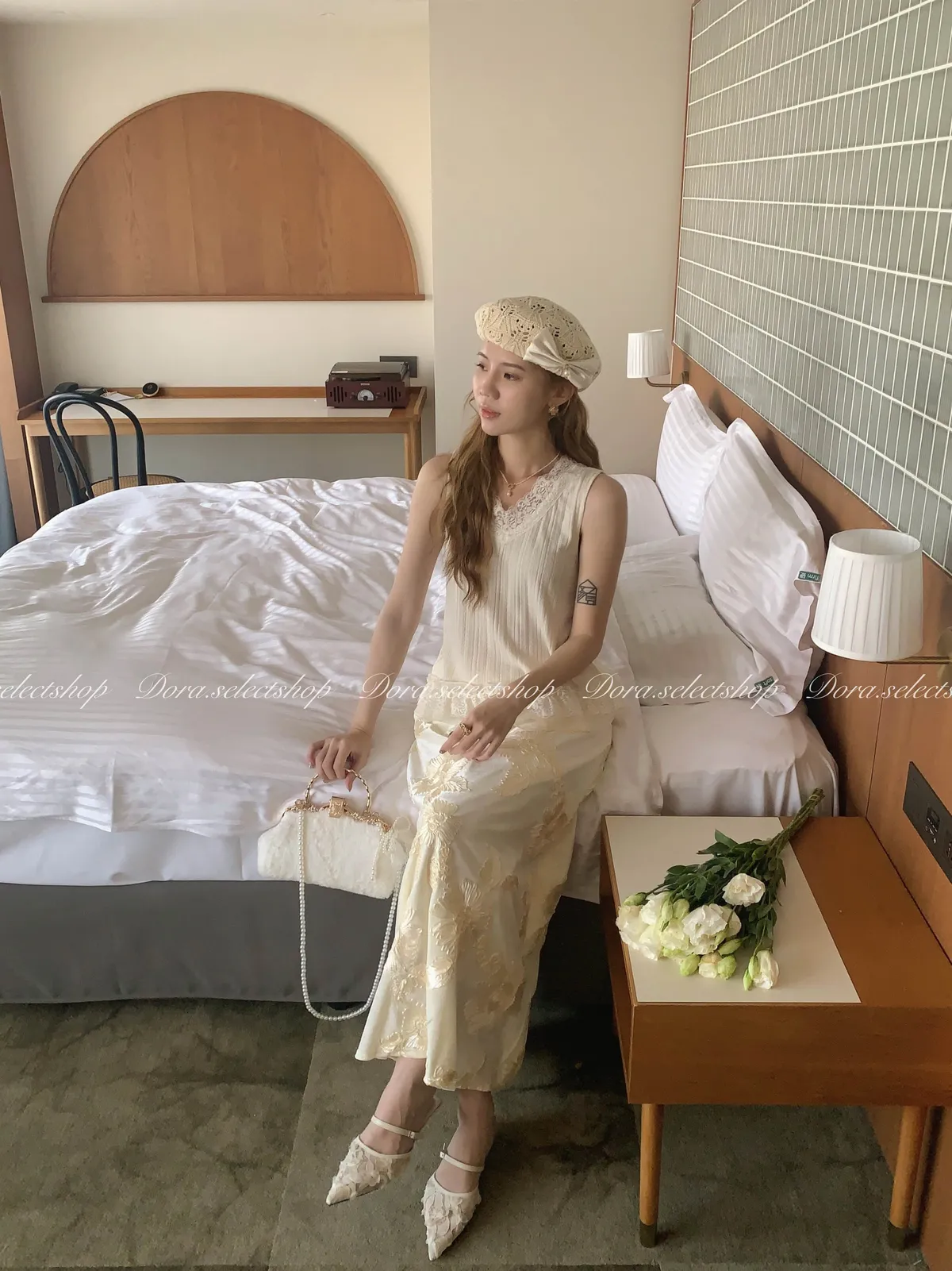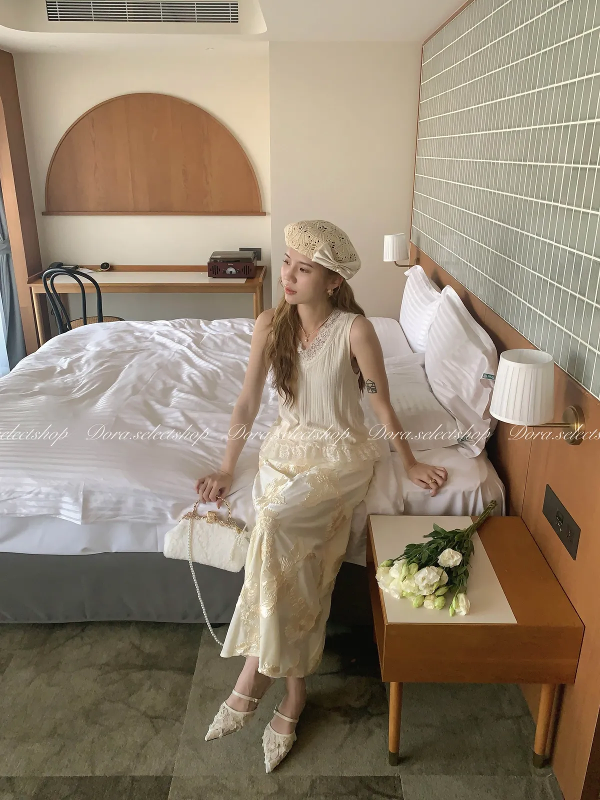 細節優雅蕾絲拼接薄針織背心---米