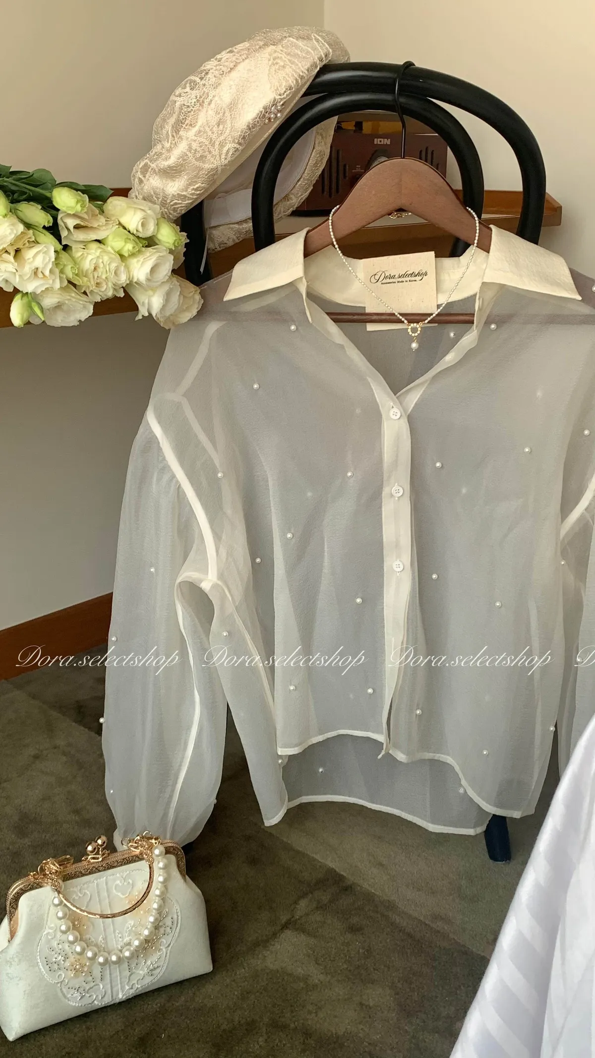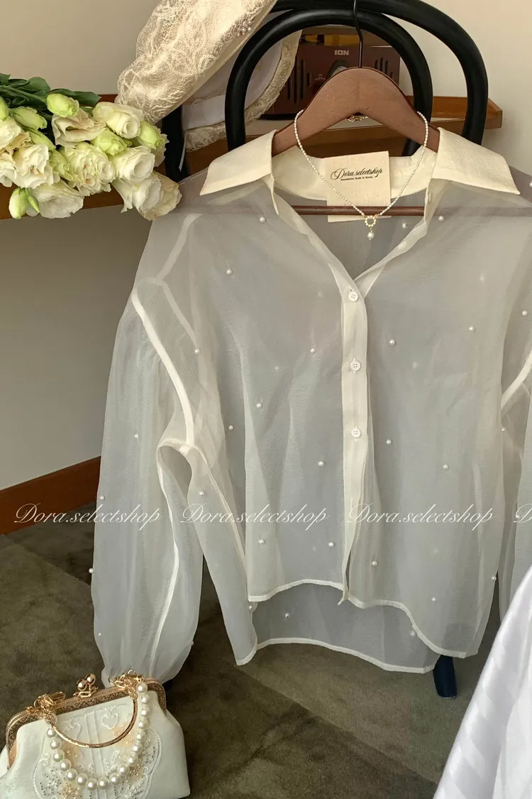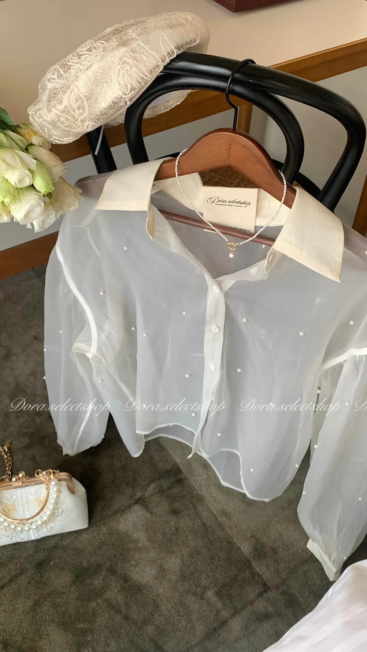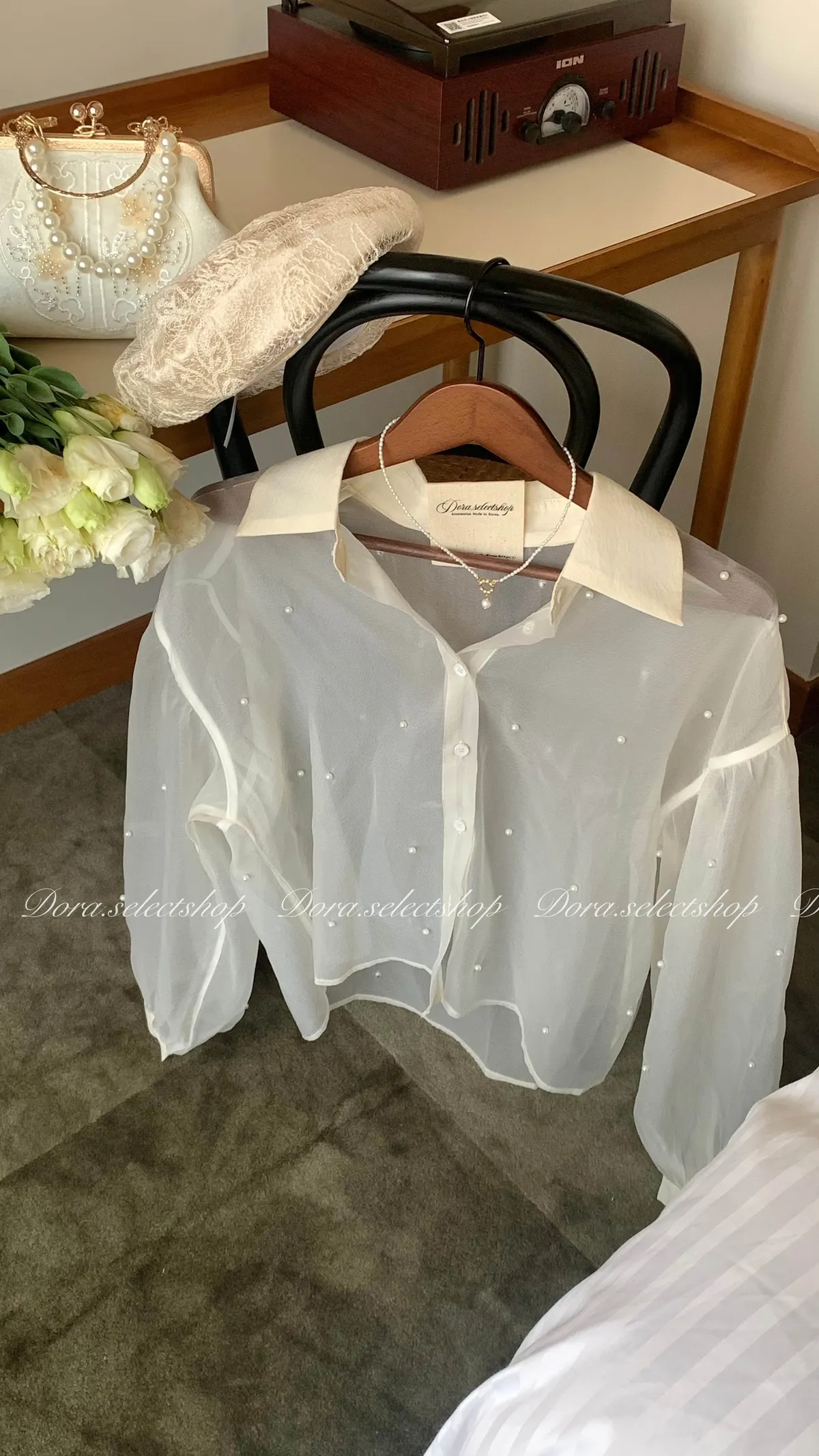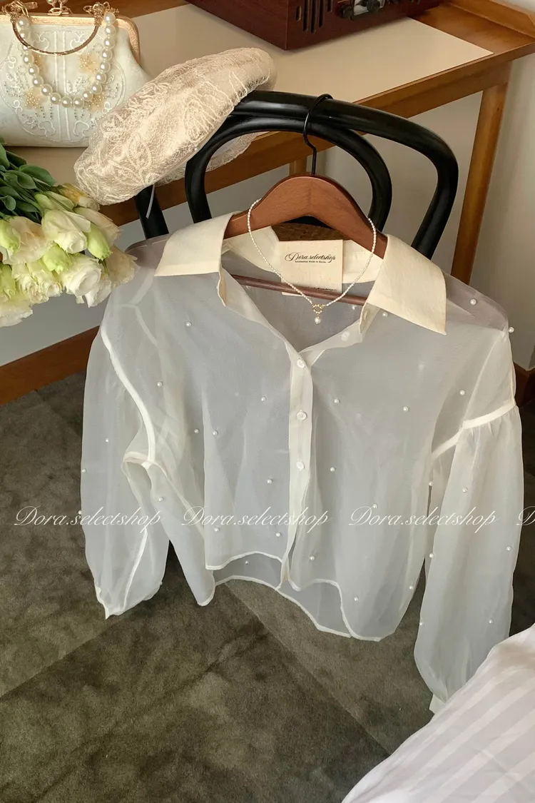 復古仙氣珍珠透肌澎袖襯衫---米白